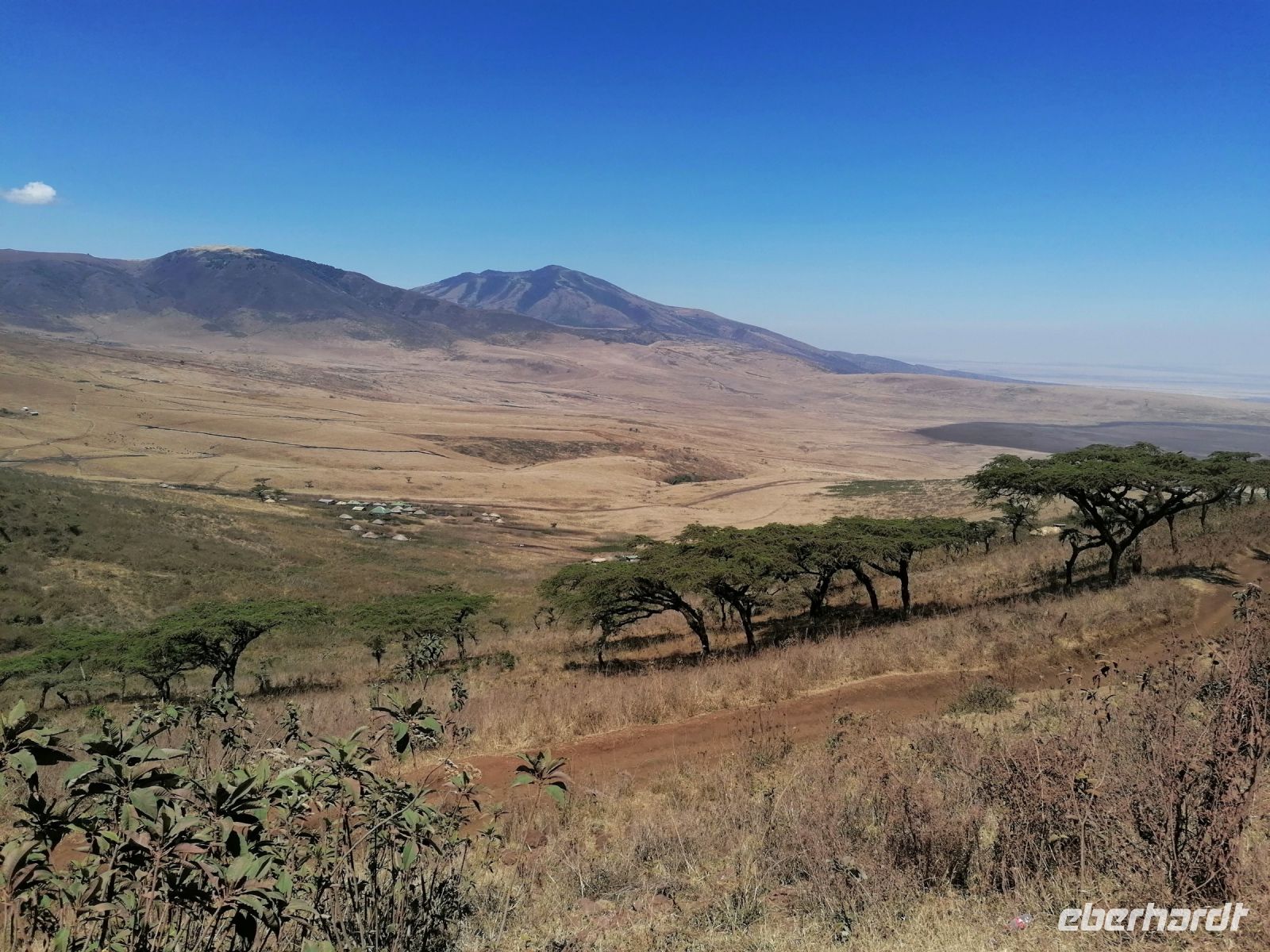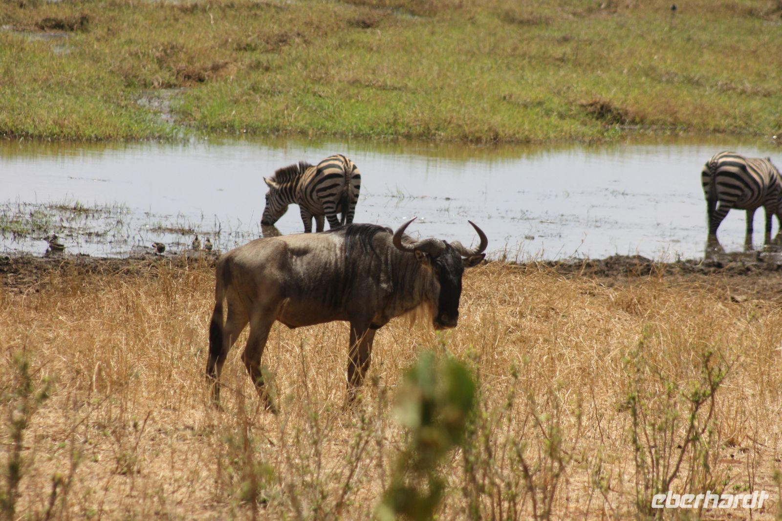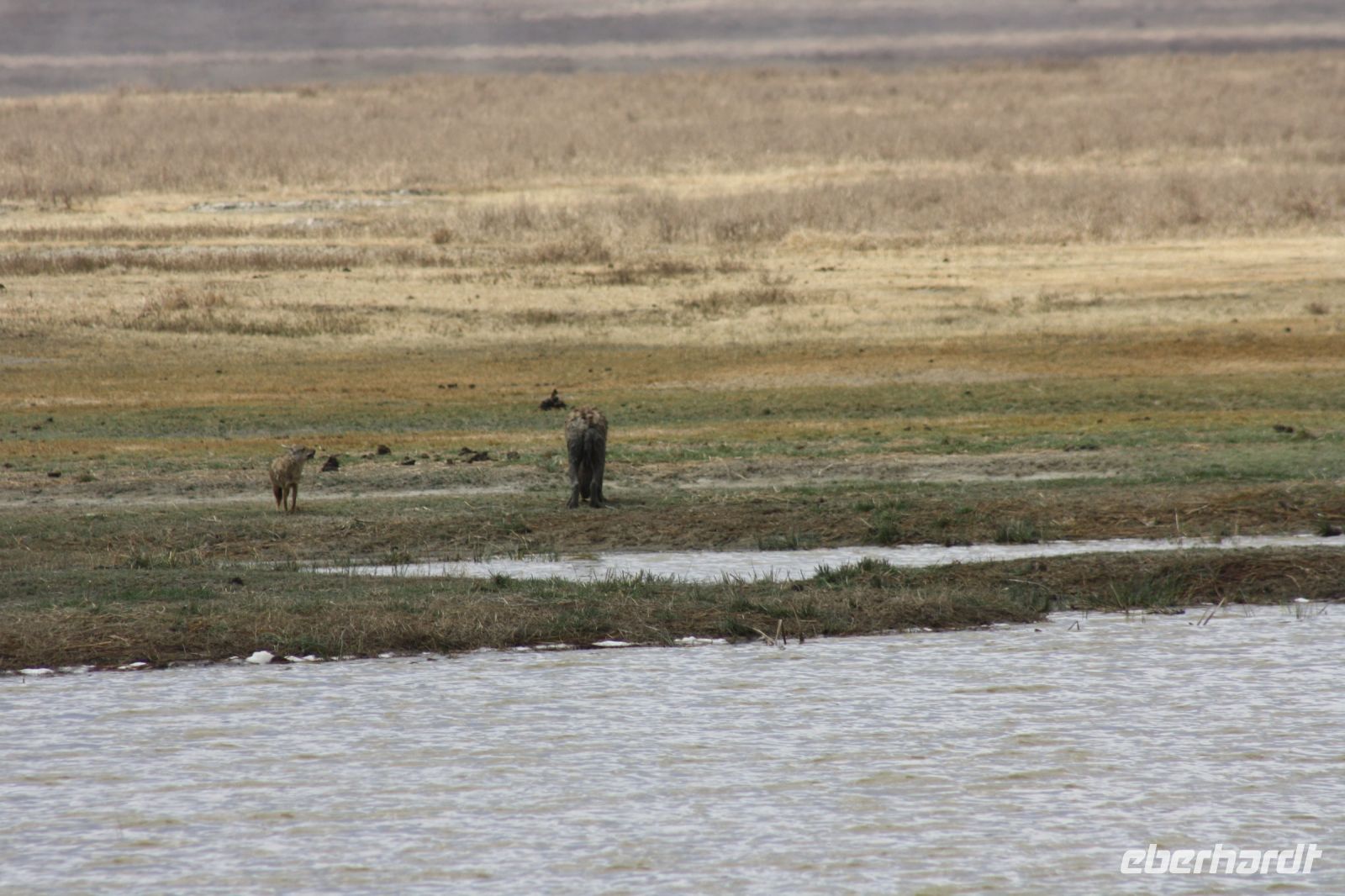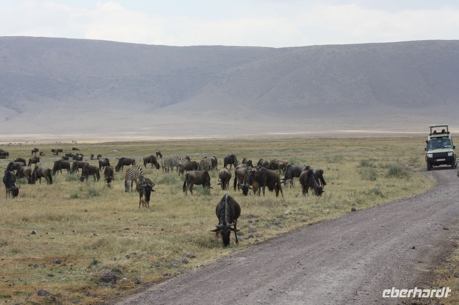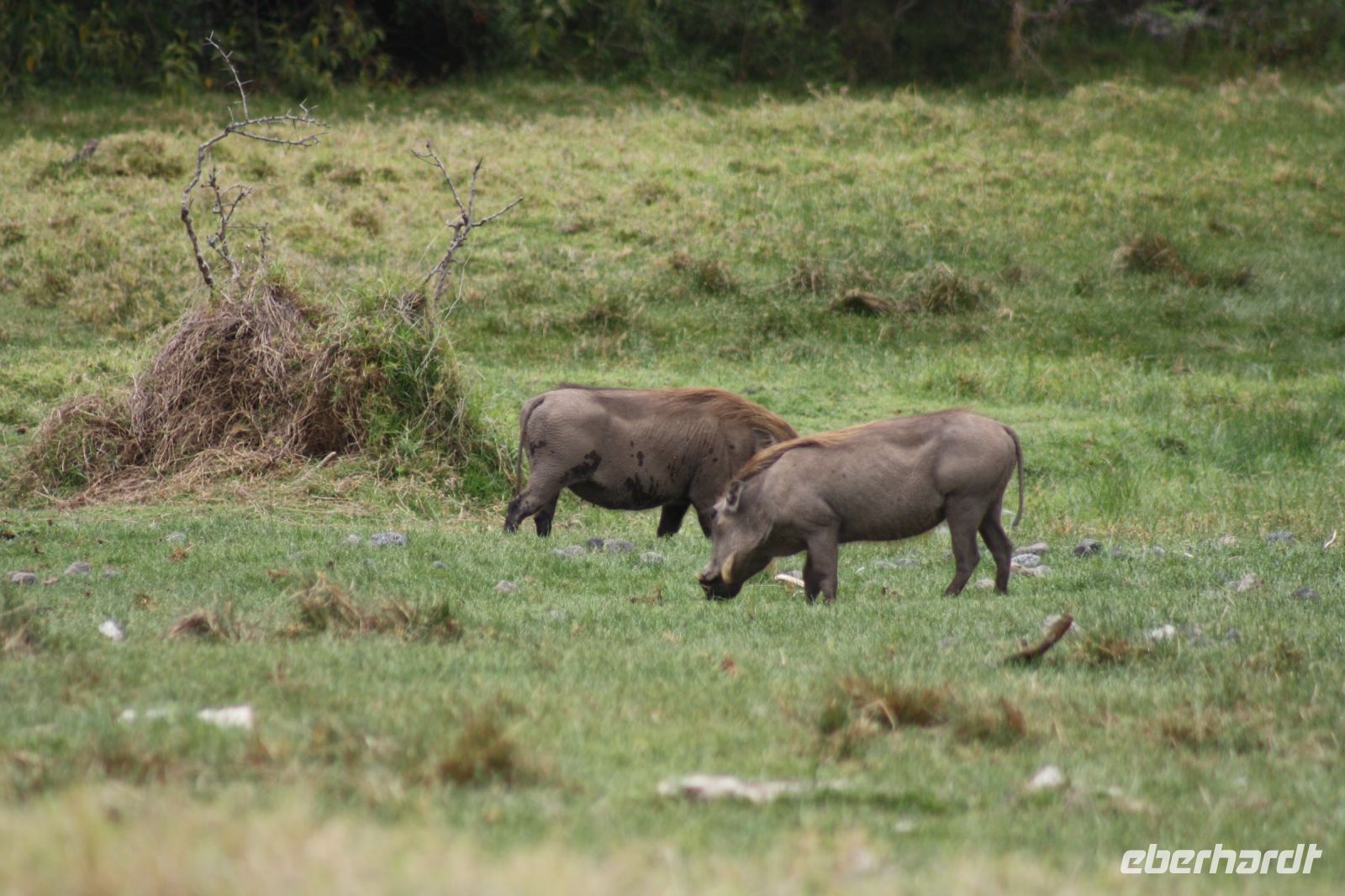 Mit dem Ngorongoro Krater stand heute ein weiteres Highlight auf unserer Agenda. Daher standen wir bereits eine Stunde früher auf und erreichten den Nationalpark bereits um 8 Uhr. Am Gate konnten wir nochmal auf Toilette und uns den Krater in einem kleinen Museum einprägen. Am Gate begrüßte uns bereits eine Paviane Familie und wir fuhren voller Vorfreude auf einer Allwetterpiste den Krater herab. Zwischendurch erhielten wir immer wieder spektakuläre Ausblicke in den Krater hinein. Unsere erste Tierbeobachtung im Krater war dagegen erstmal unspektakulär. Eine Gruppe Perlhühner hieß uns im Krater willkommen. Anschließend liefen allerdings unsere Kameras heiß. Neben einer riesigen Herde Gnu und einer Horde Büffel, konnten wir einen Schakal und Hyänen entdecken. Auch die Vogelwelt ließ sich zahlreich blicken und Bussarde, Kronenkraniche, Flamingos und Stelzenvögel flogen vor unsere Kameras. Am Rand des Lake Magadi konnten wir in eine Herde Hippos entdecken. Nicht weit entfernt fanden wir einen Rudel Hyänen, die sich ganz in der Nähe der Löwen aufhielten. Das Rudel Löwen bestand aus ca. 10 weiblichen Löwen, die bereits gespeist hatten und einen längeren Verdauungsschlaf hielten. Ein weitere Goldschakal huschte an uns vorbei, ehe wir den Hippo-Pool erreichten. In dem dreckigen Nass badeten über 30 Hippos und hielten wir uns ein Konzert ab. Grade als wir einen weiteren Vogelstrauß fotografieren wollten, erhielten wir die Nachricht, dass sich in der Nähe drei weitere Löwinnen aufhielten. Die drei Löwinnen posierten zunächst auf einen kleinen Felsvorsprung, ehe sie sich später auf einen Baum versteckten. Mit dem Fernglas konnten wir in der Ferne sogar 2 Nashörner erblicken. Nach nur wenigen Minuten spazierten eine Löwin direkt an unserem Jeep vorbei. Manchmal muss man einfach Glück haben. Ein männlicher Löwe hingegen schlummerte ganz in der Nähe im Gras und ließ sich von uns nicht stören. Auf dem Weg zum Picknick-Bereich folgte ein weiterer Höhepunkt. Zunächst erspähten wir ein Schakal, der sich eine Schlange erbeutet hatte. Plötzlich folgte ein Angriff eines Adlers und wir konnten einen Kampf um eine Schlange beobachten, welchen der Adler gewann. In der Mittagszeit speisten wir unser Lunchpaket im Jeep und genossen die wunderschöne Natur. Am Nachmittag fuhren wir ins Sumpfgebiet und konnten neben Büffel, auch Elefant beim Baden beobachten. Dann erhielten wir die Nachricht, dass ein Nashorn entdeckt wurden. Leider werden die Nashörner immer schwieriger zu sehen, da sich der Bestand der Nashörner ständig reduziert und die Wilderer ihres dazu beitragen. Unterwegs lichteten wir noch Grants-Gazellen und Thomson Gazelle ab und hielten beim einem Pelikan und Nimmersatt. Allerdings war auch hier das Nashorn nur vom weiten sichtbar, aber wir konnten immerhin ein Gefühl auf seine Größe bekommen. Leider war es nun wieder an der Zeit den Ngorongoro Krater zu verlassen. Unterwegs entdeckten wir noch weitere Hyäne, Pelikane, Hippos und einen Schakal. Am Kraterrand stoppten wir am Denkmal des berühmten Tierfilmer Bernhard Grzimek und genossen nochmal den atemberaubenden Ausblick in den Krater. Auf unserem Nachhauseweg stoppten wir noch kurz bei einem Souvenirladen, ehe wir am frühen Abend unsere Lodge erreichten. Ein atemberaubender Tag neigte sich leider dem Ende entgegen und wir stießen gemeinsam mit einen Amarula auf unseren ersten Teil der Reise an.