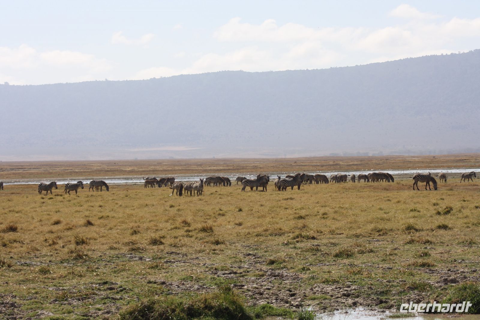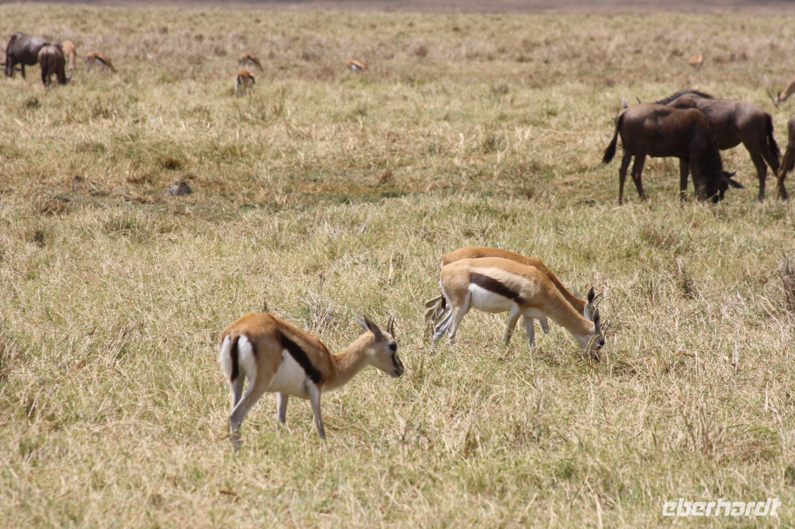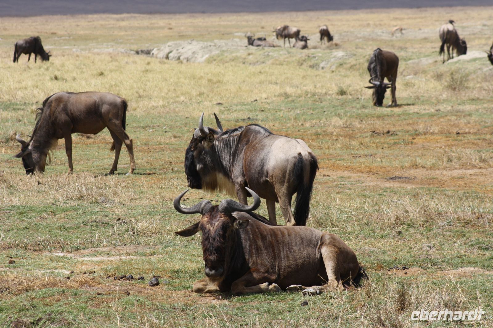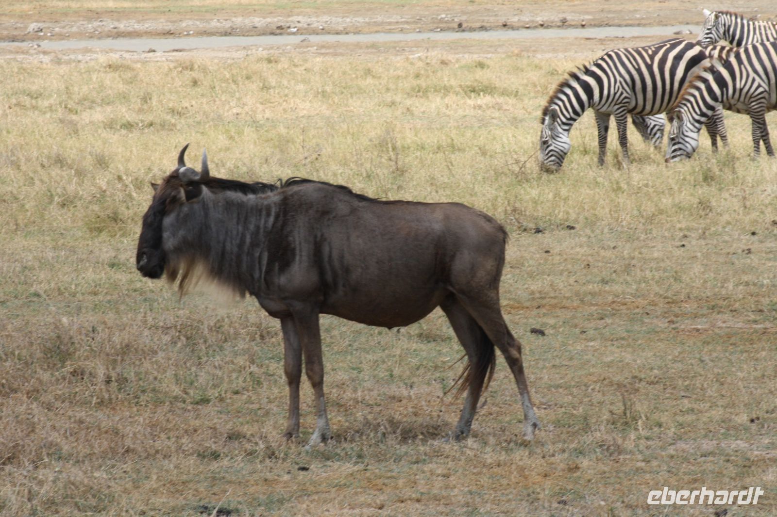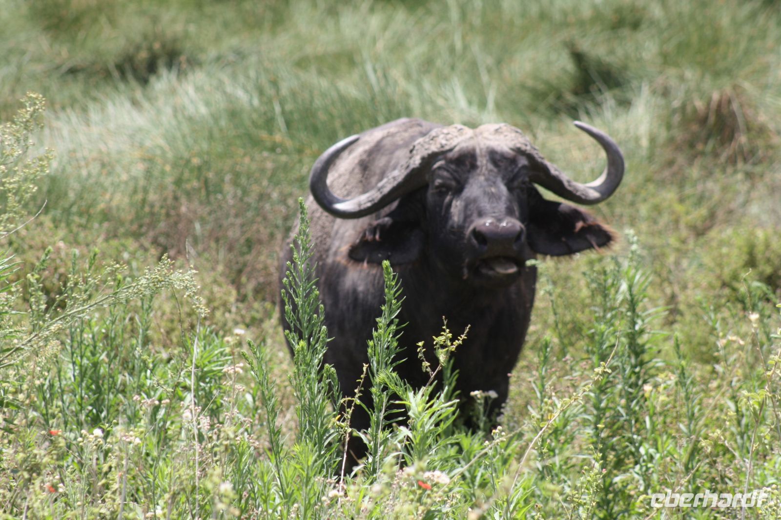 Mit dem Ngorongoro Krater stand heute ein weiteres Highlight auf unserer Agenda. Daher standen wir bereits eine Stunde früher auf und erreichten den Nationalpark bereits um 8 Uhr. Am Gate konnten wir nochmal auf Toilette und uns den Krater in einem kleinen Museum einprägen. Am Gate begrüßte uns bereits eine Paviane Familie und wir fuhren voller Vorfreude auf einer Allwetterpiste den Krater herab. Zwischendurch erhielten wir immer wieder spektakuläre Ausblicke in den Krater hinein. Unsere erste Tierbeobachtung im Krater war dagegen erstmal unspektakulär. Eine Gruppe Perlhühner hieß uns im Krater willkommen. Anschließend liefen allerdings unsere Kameras heiß. Neben einer riesigen Herde Gnu und einer Horde Büffel, konnten wir einen Schakal und Hyänen entdecken. Auch die Vogelwelt ließ sich zahlreich blicken und Bussarde, Kronenkraniche, Flamingos und Stelzenvögel flogen vor unsere Kameras. Am Rand des Lake Magadi konnten wir in eine Herde Hippos entdecken. Nicht weit entfernt fanden wir einen Rudel Hyänen, die sich ganz in der Nähe der Löwen aufhielten. Das Rudel Löwen bestand aus ca. 10 weiblichen Löwen, die bereits gespeist hatten und einen längeren Verdauungsschlaf hielten. Ein weitere Goldschakal huschte an uns vorbei, ehe wir den Hippo-Pool erreichten. In dem dreckigen Nass badeten über 30 Hippos und hielten wir uns ein Konzert ab. Grade als wir einen weiteren Vogelstrauß fotografieren wollten, erhielten wir die Nachricht, dass sich in der Nähe drei weitere Löwinnen aufhielten. Die drei Löwinnen posierten zunächst auf einen kleinen Felsvorsprung, ehe sie sich später auf einen Baum versteckten. Mit dem Fernglas konnten wir in der Ferne sogar 2 Nashörner erblicken. Nach nur wenigen Minuten spazierten eine Löwin direkt an unserem Jeep vorbei. Manchmal muss man einfach Glück haben. Ein männlicher Löwe hingegen schlummerte ganz in der Nähe im Gras und ließ sich von uns nicht stören. Auf dem Weg zum Picknick-Bereich folgte ein weiterer Höhepunkt. Zunächst erspähten wir ein Schakal, der sich eine Schlange erbeutet hatte. Plötzlich folgte ein Angriff eines Adlers und wir konnten einen Kampf um eine Schlange beobachten, welchen der Adler gewann. In der Mittagszeit speisten wir unser Lunchpaket im Jeep und genossen die wunderschöne Natur. Am Nachmittag fuhren wir ins Sumpfgebiet und konnten neben Büffel, auch Elefant beim Baden beobachten. Dann erhielten wir die Nachricht, dass ein Nashorn entdeckt wurden. Leider werden die Nashörner immer schwieriger zu sehen, da sich der Bestand der Nashörner ständig reduziert und die Wilderer ihres dazu beitragen. Unterwegs lichteten wir noch Grants-Gazellen und Thomson Gazelle ab und hielten beim einem Pelikan und Nimmersatt. Allerdings war auch hier das Nashorn nur vom weiten sichtbar, aber wir konnten immerhin ein Gefühl auf seine Größe bekommen. Leider war es nun wieder an der Zeit den Ngorongoro Krater zu verlassen. Unterwegs entdeckten wir noch weitere Hyäne, Pelikane, Hippos und einen Schakal. Am Kraterrand stoppten wir am Denkmal des berühmten Tierfilmer Bernhard Grzimek und genossen nochmal den atemberaubenden Ausblick in den Krater. Auf unserem Nachhauseweg stoppten wir noch kurz bei einem Souvenirladen, ehe wir am frühen Abend unsere Lodge erreichten. Ein atemberaubender Tag neigte sich leider dem Ende entgegen und wir stießen gemeinsam mit einen Amarula auf unseren ersten Teil der Reise an.