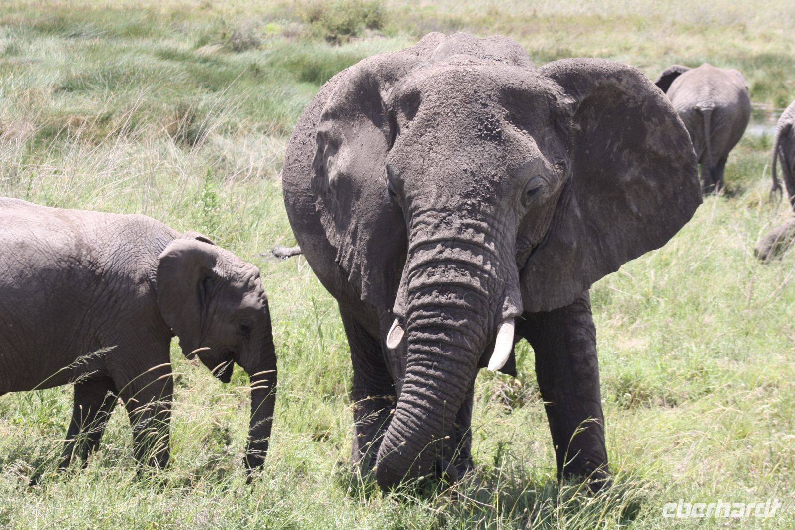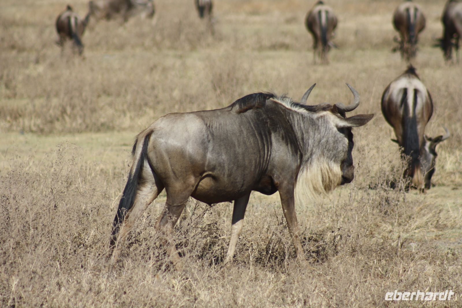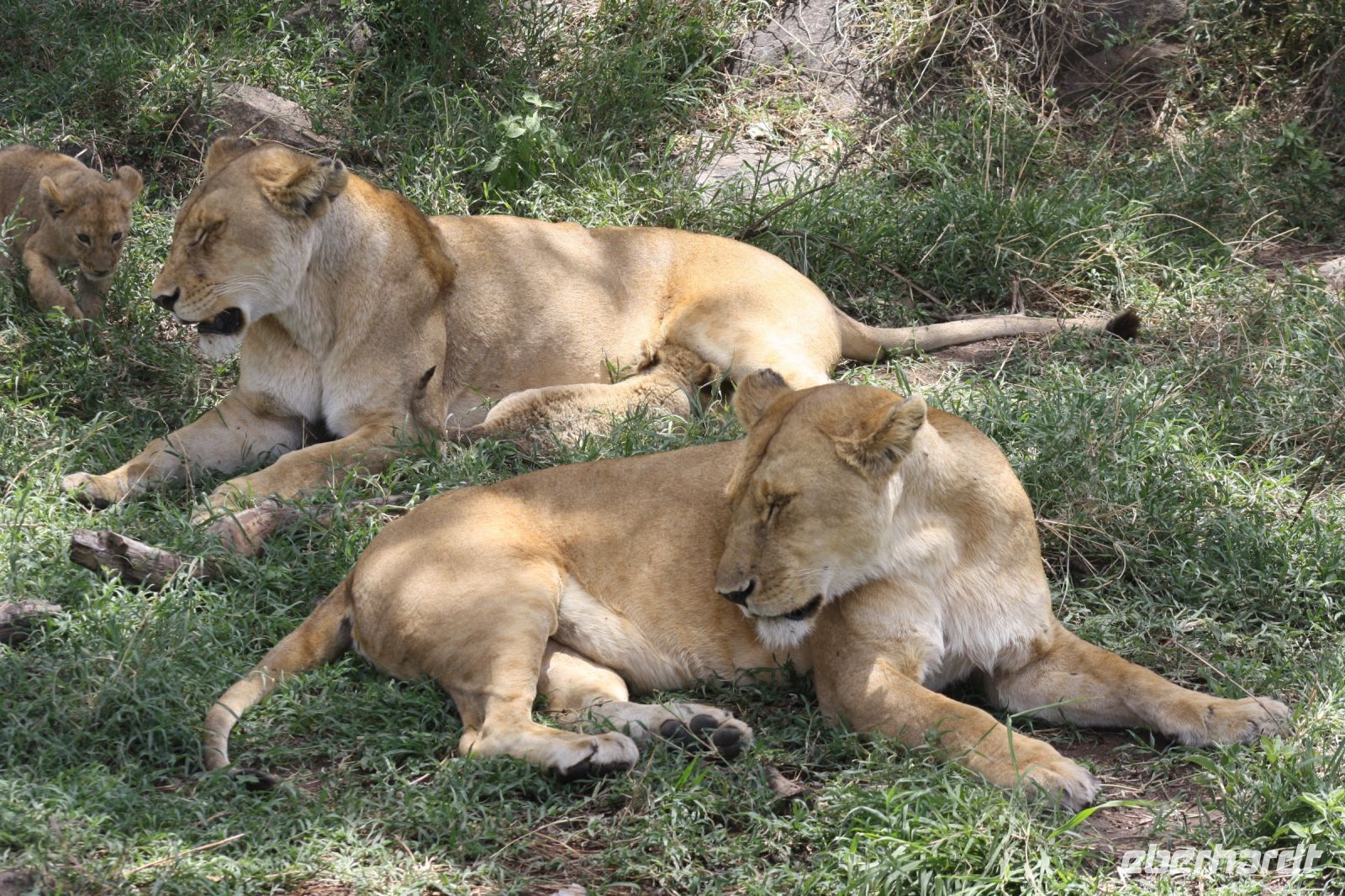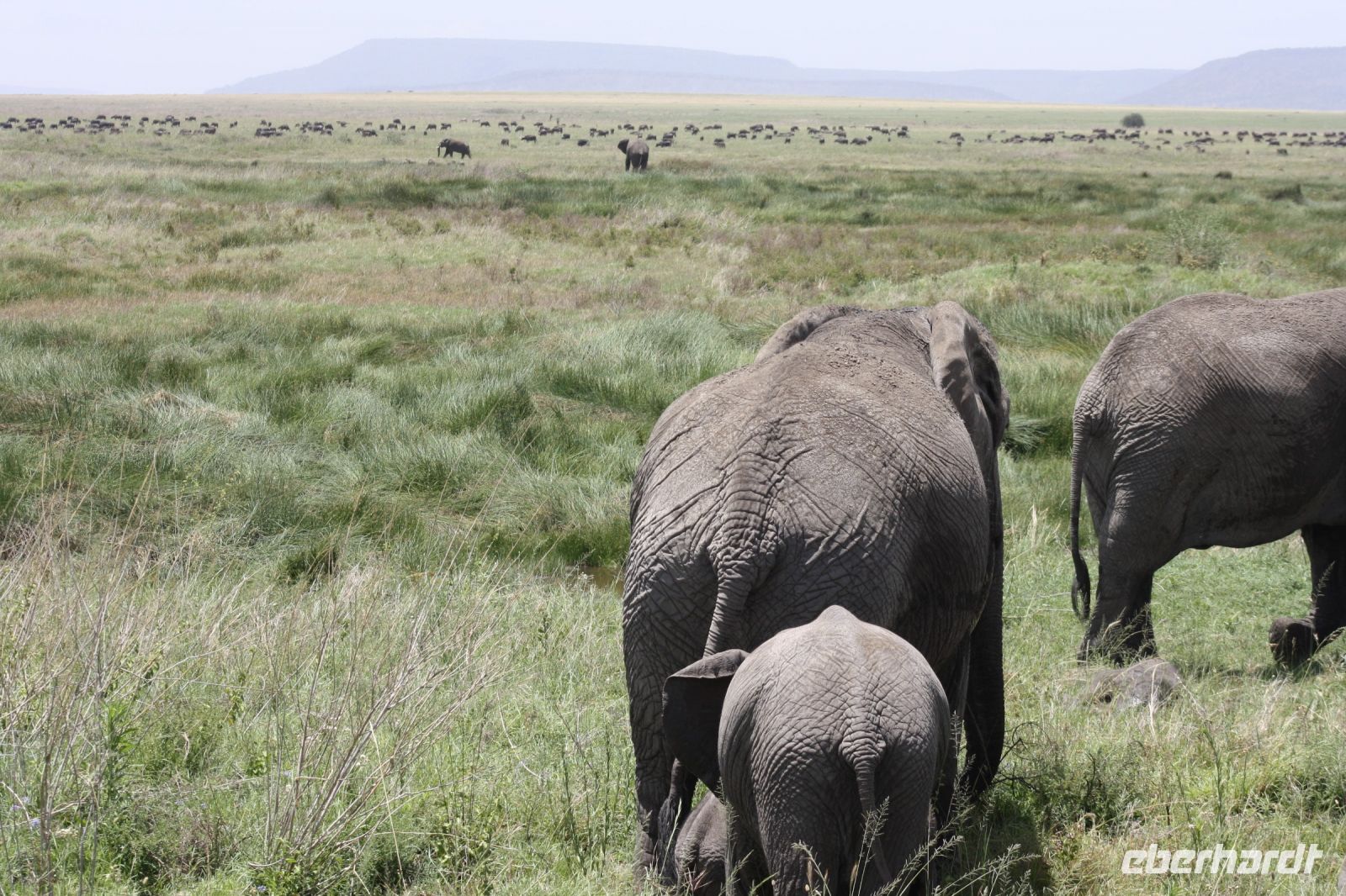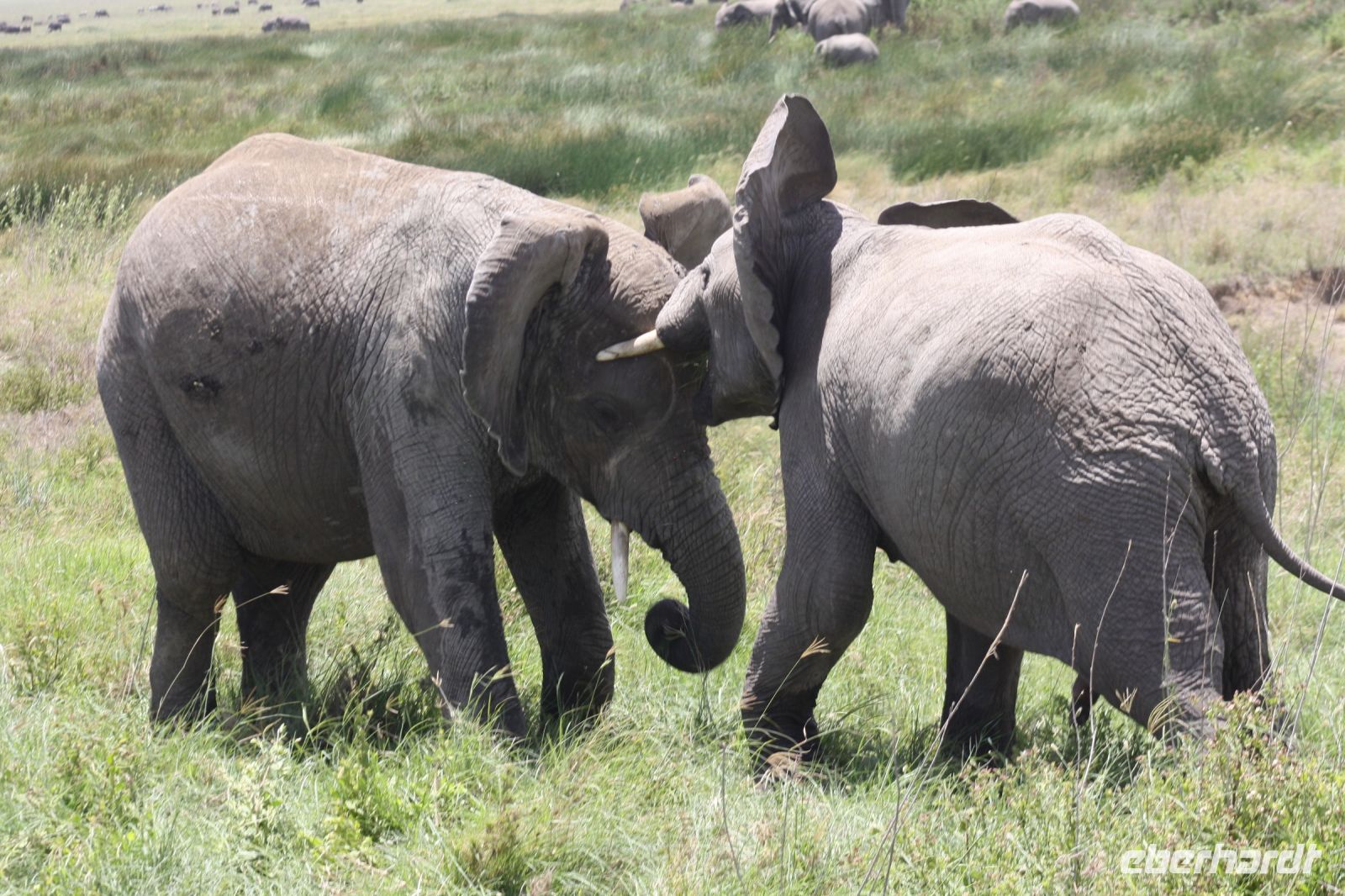 Mit dem Ngorongoro Krater stand heute ein weiteres Highlight auf unserer Agenda. Daher standen wir bereits eine Stunde früher auf und erreichten den Nationalpark bereits um 8 Uhr. Am Gate konnten wir nochmal auf Toilette und uns den Krater in einem kleinen Museum einprägen. Am Gate begrüßte uns bereits eine Paviane Familie und wir fuhren voller Vorfreude auf einer Allwetterpiste den Krater herab. Zwischendurch erhielten wir immer wieder spektakuläre Ausblicke in den Krater hinein. Unsere erste Tierbeobachtung im Krater war dagegen erstmal unspektakulär. Eine Gruppe Perlhühner hieß uns im Krater willkommen. Anschließend liefen allerdings unsere Kameras heiß. Neben einer riesigen Herde Gnu und einer Horde Büffel, konnten wir einen Schakal und Hyänen entdecken. Auch die Vogelwelt ließ sich zahlreich blicken und Bussarde, Kronenkraniche, Flamingos und Stelzenvögel flogen vor unsere Kameras. Am Rand des Lake Magadi konnten wir in eine Herde Hippos entdecken. Nicht weit entfernt fanden wir einen Rudel Hyänen, die sich ganz in der Nähe der Löwen aufhielten. Das Rudel Löwen bestand aus ca. 10 weiblichen Löwen, die bereits gespeist hatten und einen längeren Verdauungsschlaf hielten. Ein weitere Goldschakal huschte an uns vorbei, ehe wir den Hippo-Pool erreichten. In dem dreckigen Nass badeten über 30 Hippos und hielten wir uns ein Konzert ab. Grade als wir einen weiteren Vogelstrauß fotografieren wollten, erhielten wir die Nachricht, dass sich in der Nähe drei weitere Löwinnen aufhielten. Die drei Löwinnen posierten zunächst auf einen kleinen Felsvorsprung, ehe sie sich später auf einen Baum versteckten. Mit dem Fernglas konnten wir in der Ferne sogar 2 Nashörner erblicken. Nach nur wenigen Minuten spazierten eine Löwin direkt an unserem Jeep vorbei. Manchmal muss man einfach Glück haben. Ein männlicher Löwe hingegen schlummerte ganz in der Nähe im Gras und ließ sich von uns nicht stören. Auf dem Weg zum Picknick-Bereich folgte ein weiterer Höhepunkt. Zunächst erspähten wir ein Schakal, der sich eine Schlange erbeutet hatte. Plötzlich folgte ein Angriff eines Adlers und wir konnten einen Kampf um eine Schlange beobachten, welchen der Adler gewann. In der Mittagszeit speisten wir unser Lunchpaket im Jeep und genossen die wunderschöne Natur. Am Nachmittag fuhren wir ins Sumpfgebiet und konnten neben Büffel, auch Elefant beim Baden beobachten. Dann erhielten wir die Nachricht, dass ein Nashorn entdeckt wurden. Leider werden die Nashörner immer schwieriger zu sehen, da sich der Bestand der Nashörner ständig reduziert und die Wilderer ihres dazu beitragen. Unterwegs lichteten wir noch Grants-Gazellen und Thomson Gazelle ab und hielten beim einem Pelikan und Nimmersatt. Allerdings war auch hier das Nashorn nur vom weiten sichtbar, aber wir konnten immerhin ein Gefühl auf seine Größe bekommen. Leider war es nun wieder an der Zeit den Ngorongoro Krater zu verlassen. Unterwegs entdeckten wir noch weitere Hyäne, Pelikane, Hippos und einen Schakal. Am Kraterrand stoppten wir am Denkmal des berühmten Tierfilmer Bernhard Grzimek und genossen nochmal den atemberaubenden Ausblick in den Krater. Auf unserem Nachhauseweg stoppten wir noch kurz bei einem Souvenirladen, ehe wir am frühen Abend unsere Lodge erreichten. Ein atemberaubender Tag neigte sich leider dem Ende entgegen und wir stießen gemeinsam mit einen Amarula auf unseren ersten Teil der Reise an.