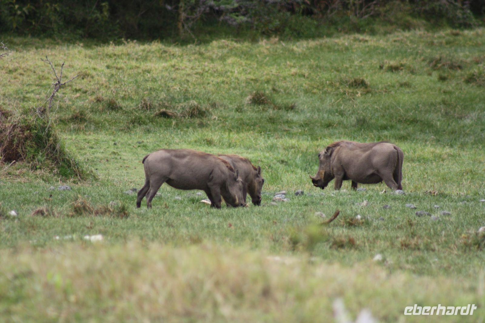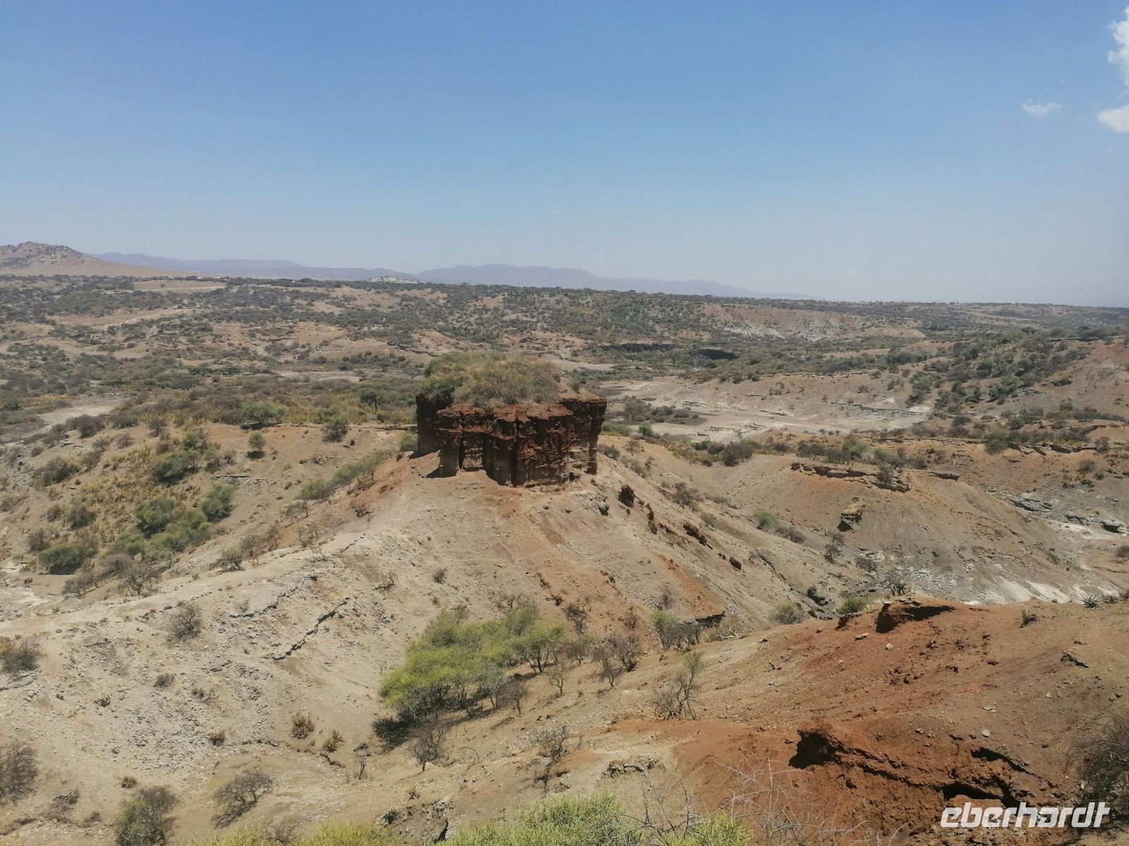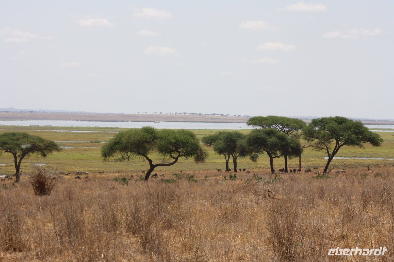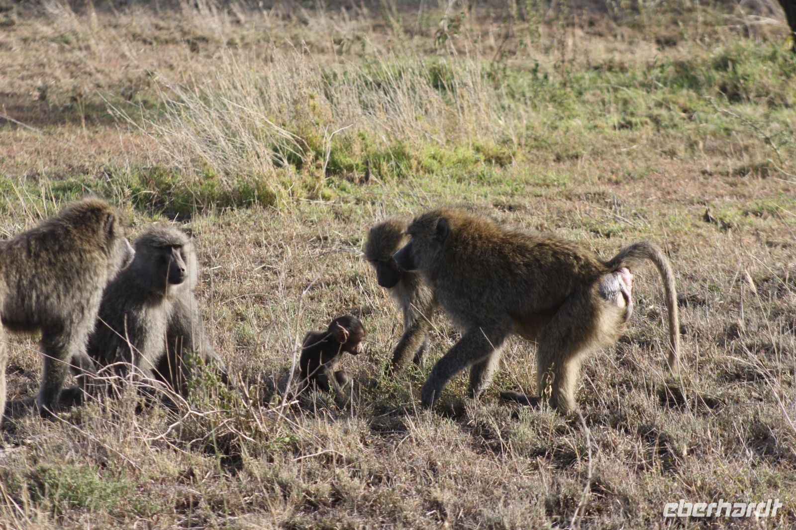 Heute verschob sich unsere Pirschfahrt ein wenig nach hinten. Bereits beim Frühstück konnten wir eine Gruppe von Elenantilopen, Zebras und Perlhuhn entdecken. Bereits in der Nacht wurden wir von Zebras und auch Elefanten besucht. Das ist der Vorteil, wenn man im Nationalpark übernachtet. Heute ließen wir den wunderschönen Tarangire Nationalpark hinter uns und machten uns auf den Weg zum Lake Manyara. Unsere Route führte uns durch viele kleine Dörfer und vorbei an bearbeiteten Reisfeldern. Immer wieder winkten uns Kinder zu und wir beobachteten die Bewohner und ihre Hütten. Am späten Vormittag erreichen wir den Manyara Nationalpark. Mit seinen 330 KM² kann der Nationalpark in Sachen Größe nicht mit seinen Nachbarn mithalten, allerdings besticht er durch seine botanische Vielfalt. Wir enterten den Park durch das südliche Gate. Ganz in der Nähe des Eingangs stießen wir auf eine Elefantenherde, die die Straße blockierten. Auf der anderen Seite konnten wir Paviane und schwarze Meerkatzen entdecken. Die Straße führte an durch die Wälder und vorbei am See. Auf unserer linken Seite konnten wir den Ostafrikanischen Grabenbruch erkennen, der sich als 500 - 800 Meter hohe Felsformation auftürmte. Immer wieder suchten wir die Bäume nach den heimischen Baumlöwen ab. Ihr atypisches Verhalten hat die Baumlöwen im Manyara Nationalpark bekannt gemacht. Der Grund des Verhaltens war vermutlich der Schutz vor lästigen Insekten in der Regenzeit und angriffslustige Büffel. Bis in den 70er Jahren gab es hier noch Herden von Büffeln, die jedoch zum Tarangire Nationalpark weitere gezogen sind. Weiter geht unsere Pirsch. Unser nach Stopp erfolgt direkt am See. Hier sehen wir einen toten Büffel mit fünf Geiern. Nur wenige Meter entfernt sonnen sich die Hippos und gucken den Hagedasch Ibisse beim Stolzieren zu. Insgesamt kann man im Nationalpark über 400 verschiedene Vogelarten entdecken. Immer wieder können wir Reiher, Pelikane, Turkane oder schwarze Hornraben erblicken. Am Wegesrand kreuzen Klippspringer unseren Weg. Zum Glück können wir die scheuen Tiere noch mit der Kamera aufnehmen. Im Anschluss können wir die verbliebenen Büffel beobachten. Am Nachmittag überqueren die grauen Dickhäuter wieder unsere Straße, sodass wir die Elefanten von nahen aufnehmen können. Auch eine größere Affengruppe schaut interessiert an diesen Spektakel zu. Unser nächstes Ziel sollte der Hippo Pool sein. Leider ist die Gegend durch die lange Regenzeit überschwemmt, sodass wir keine Chance auf weitere Hippos haben. Nach einen langen Tag verließen wir den Park und erhielten vom Aussichtspunkt mit schönem Blick über den kompletten Nationalpark.