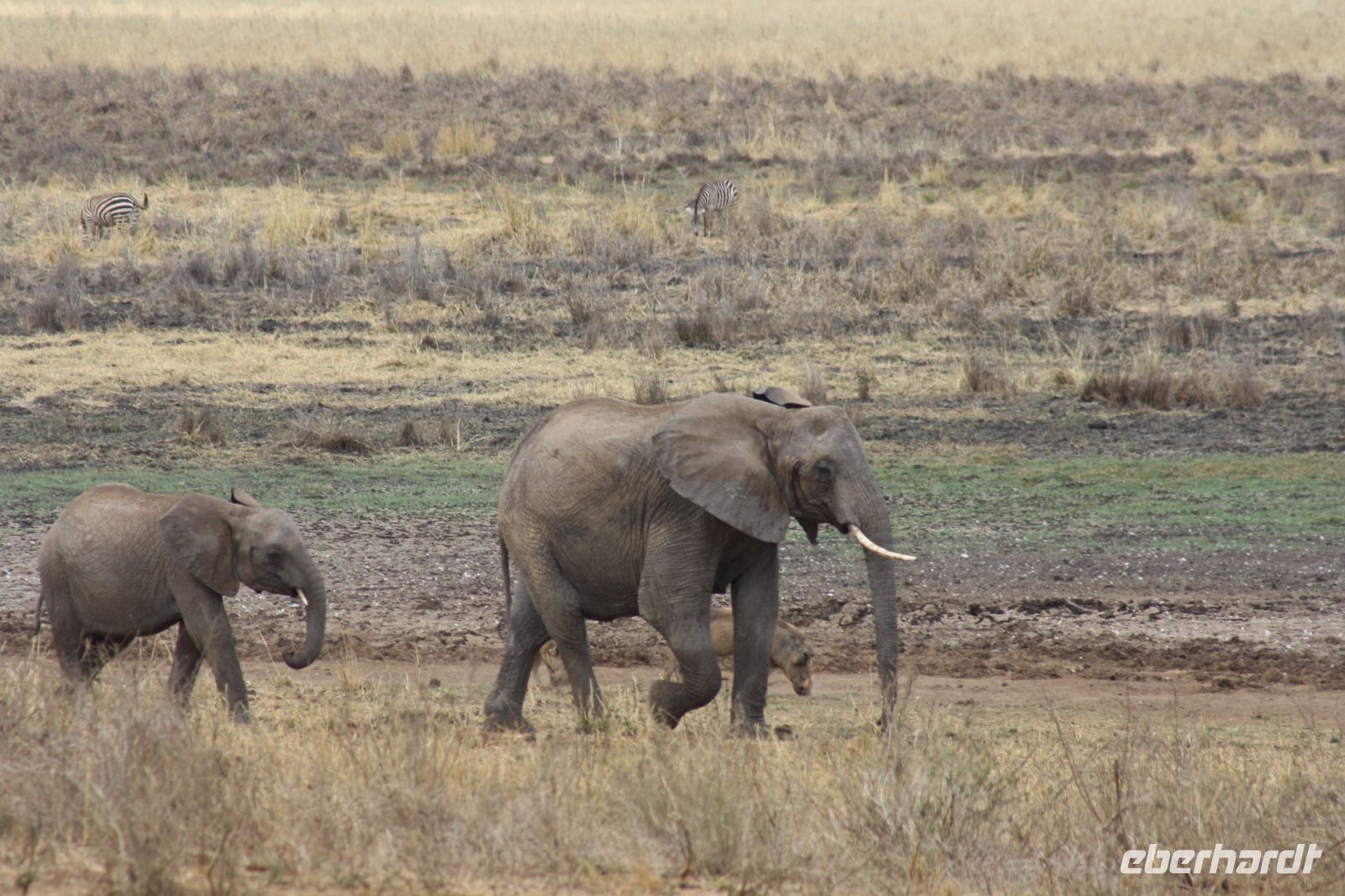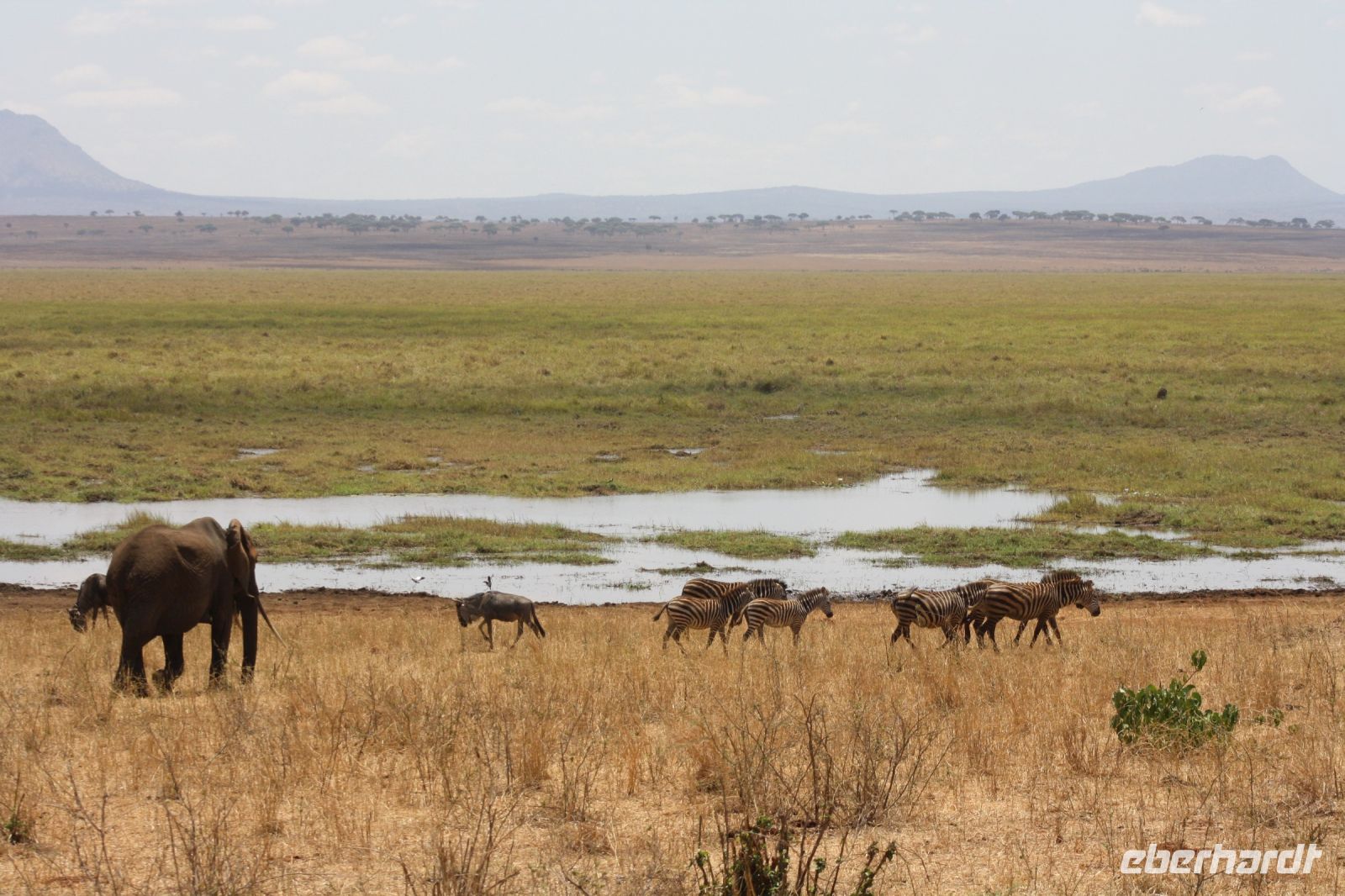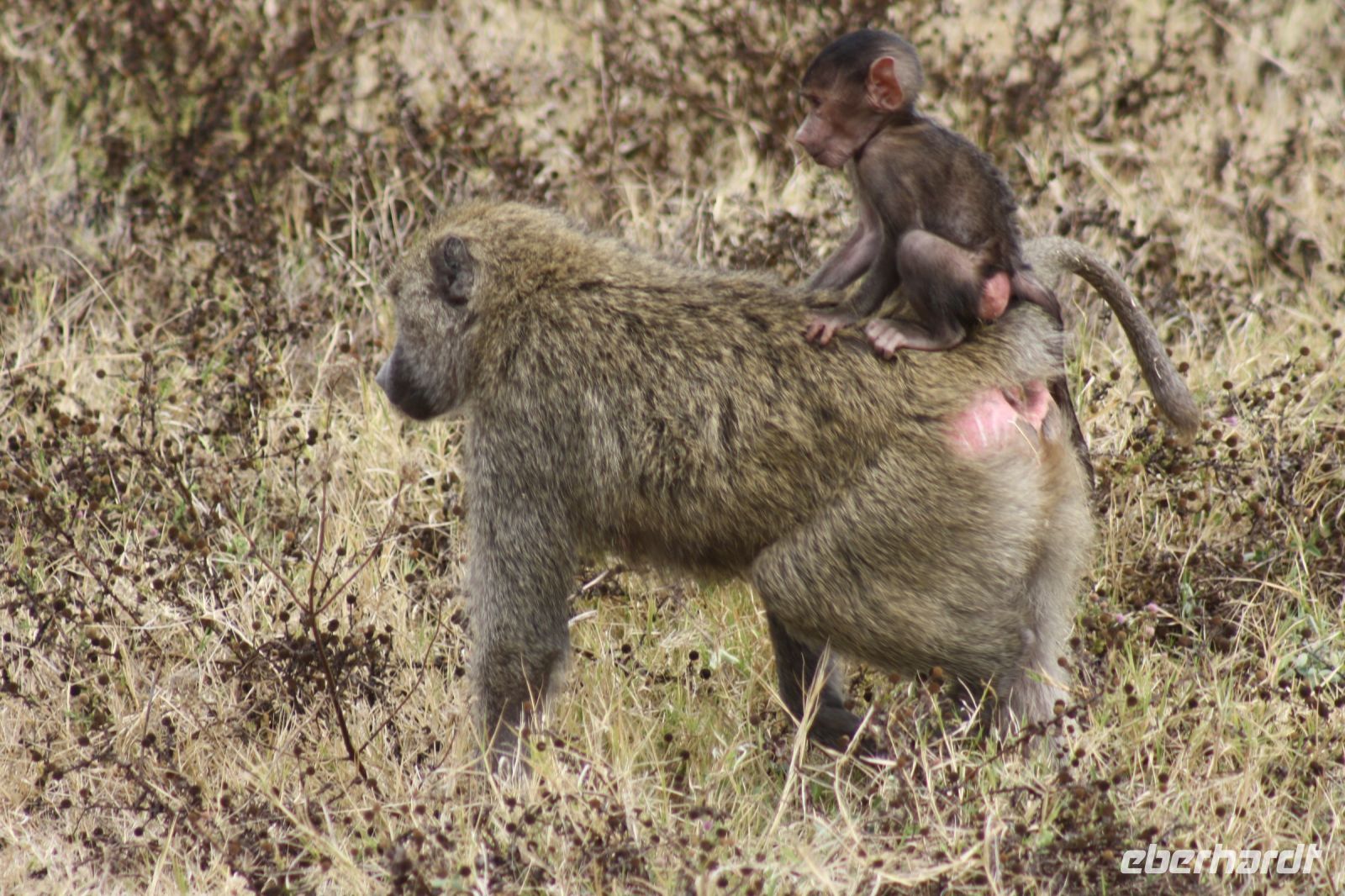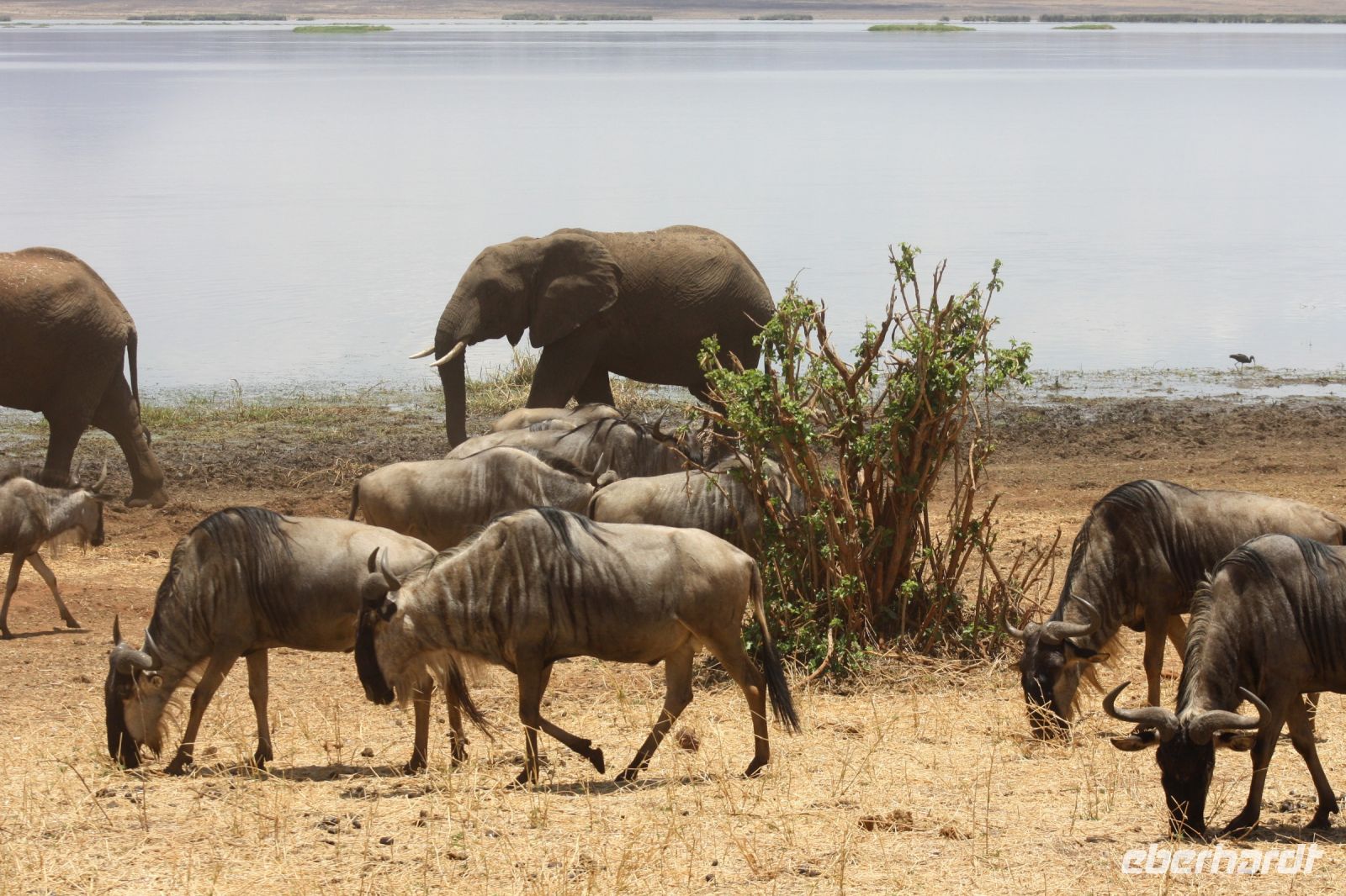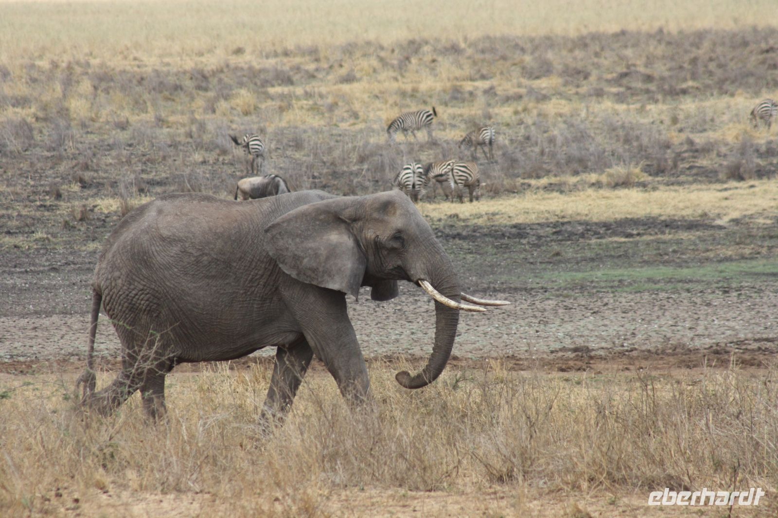 Heute verschob sich unsere Pirschfahrt ein wenig nach hinten. Bereits beim Frühstück konnten wir eine Gruppe von Elenantilopen, Zebras und Perlhuhn entdecken. Bereits in der Nacht wurden wir von Zebras und auch Elefanten besucht. Das ist der Vorteil, wenn man im Nationalpark übernachtet. Heute ließen wir den wunderschönen Tarangire Nationalpark hinter uns und machten uns auf den Weg zum Lake Manyara. Unsere Route führte uns durch viele kleine Dörfer und vorbei an bearbeiteten Reisfeldern. Immer wieder winkten uns Kinder zu und wir beobachteten die Bewohner und ihre Hütten. Am späten Vormittag erreichen wir den Manyara Nationalpark. Mit seinen 330 KM² kann der Nationalpark in Sachen Größe nicht mit seinen Nachbarn mithalten, allerdings besticht er durch seine botanische Vielfalt. Wir enterten den Park durch das südliche Gate. Ganz in der Nähe des Eingangs stießen wir auf eine Elefantenherde, die die Straße blockierten. Auf der anderen Seite konnten wir Paviane und schwarze Meerkatzen entdecken. Die Straße führte an durch die Wälder und vorbei am See. Auf unserer linken Seite konnten wir den Ostafrikanischen Grabenbruch erkennen, der sich als 500 - 800 Meter hohe Felsformation auftürmte. Immer wieder suchten wir die Bäume nach den heimischen Baumlöwen ab. Ihr atypisches Verhalten hat die Baumlöwen im Manyara Nationalpark bekannt gemacht. Der Grund des Verhaltens war vermutlich der Schutz vor lästigen Insekten in der Regenzeit und angriffslustige Büffel. Bis in den 70er Jahren gab es hier noch Herden von Büffeln, die jedoch zum Tarangire Nationalpark weitere gezogen sind. Weiter geht unsere Pirsch. Unser nach Stopp erfolgt direkt am See. Hier sehen wir einen toten Büffel mit fünf Geiern. Nur wenige Meter entfernt sonnen sich die Hippos und gucken den Hagedasch Ibisse beim Stolzieren zu. Insgesamt kann man im Nationalpark über 400 verschiedene Vogelarten entdecken. Immer wieder können wir Reiher, Pelikane, Turkane oder schwarze Hornraben erblicken. Am Wegesrand kreuzen Klippspringer unseren Weg. Zum Glück können wir die scheuen Tiere noch mit der Kamera aufnehmen. Im Anschluss können wir die verbliebenen Büffel beobachten. Am Nachmittag überqueren die grauen Dickhäuter wieder unsere Straße, sodass wir die Elefanten von nahen aufnehmen können. Auch eine größere Affengruppe schaut interessiert an diesen Spektakel zu. Unser nächstes Ziel sollte der Hippo Pool sein. Leider ist die Gegend durch die lange Regenzeit überschwemmt, sodass wir keine Chance auf weitere Hippos haben. Nach einen langen Tag verließen wir den Park und erhielten vom Aussichtspunkt mit schönem Blick über den kompletten Nationalpark.