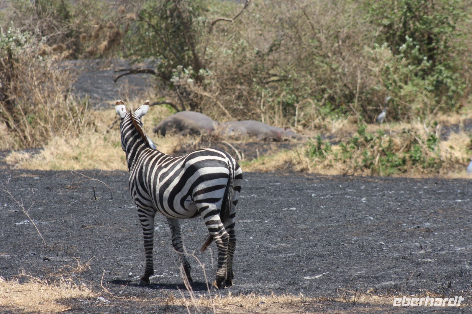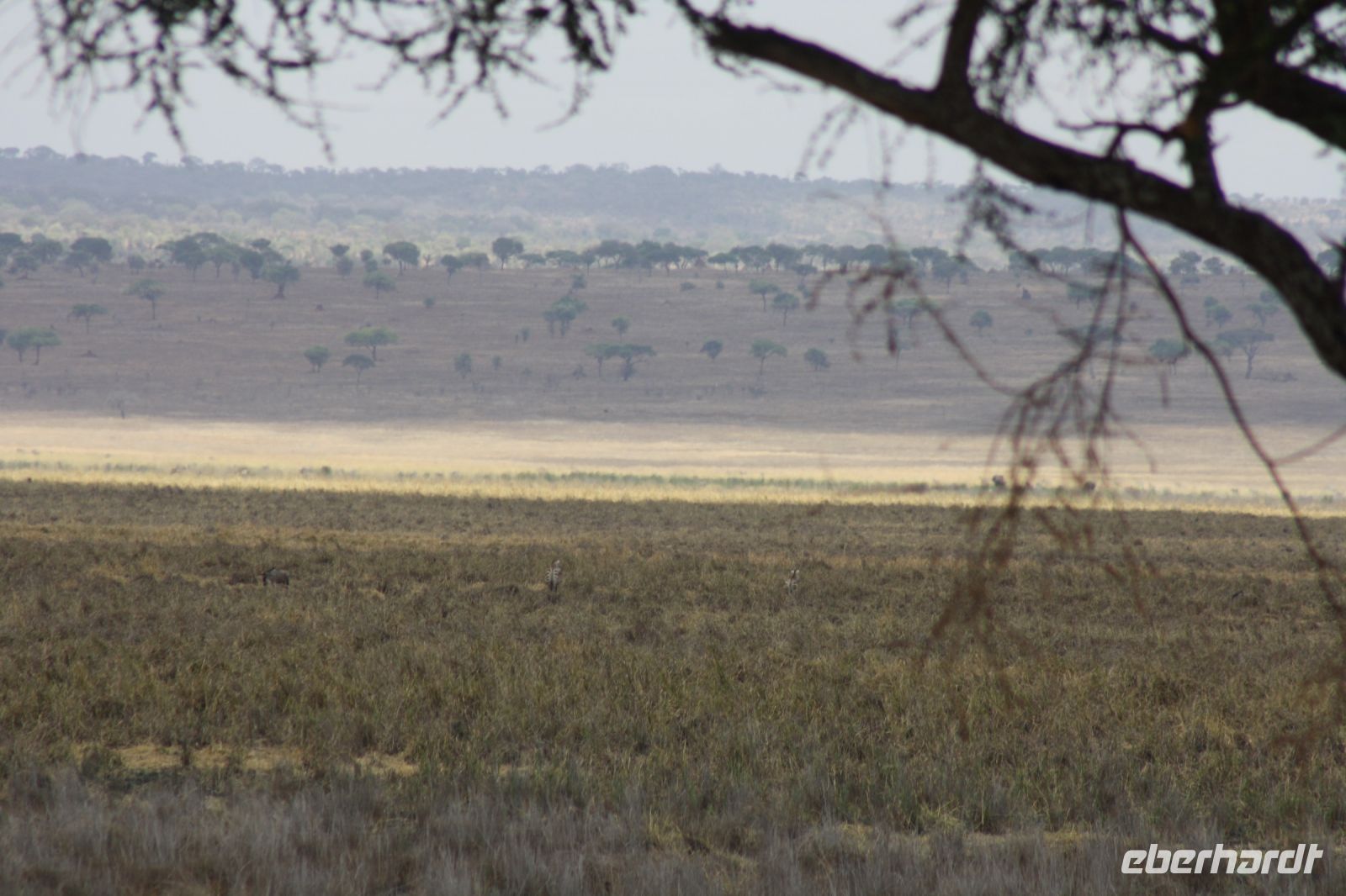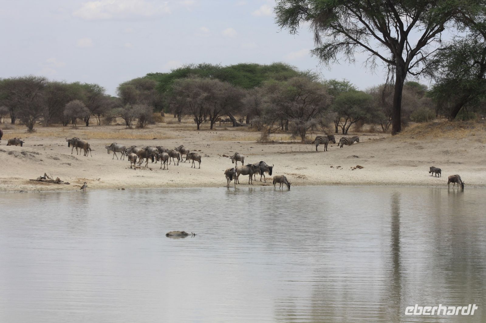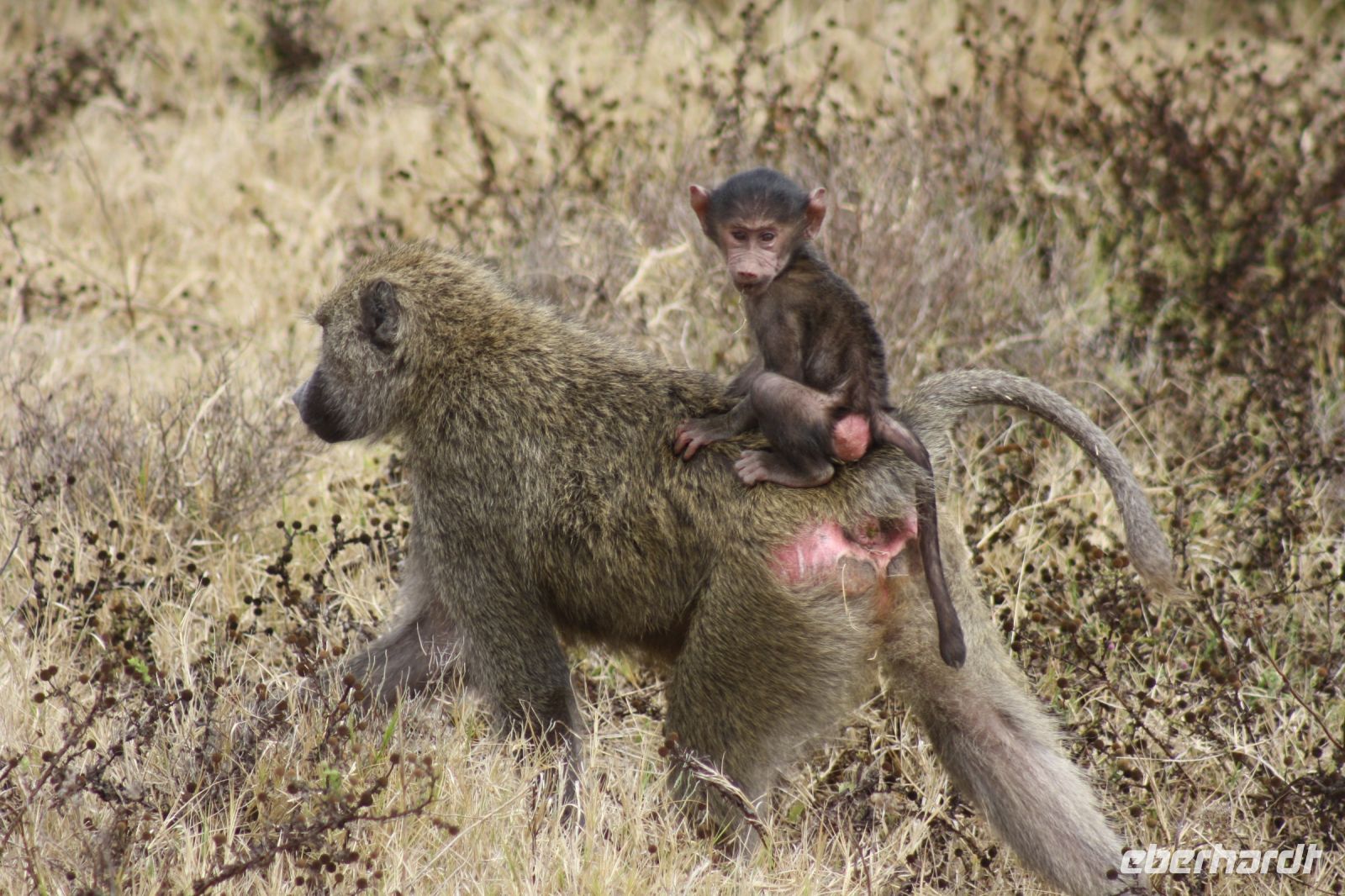 Heute verschob sich unsere Pirschfahrt ein wenig nach hinten. Bereits beim Frühstück konnten wir eine Gruppe von Elenantilopen, Zebras und Perlhuhn entdecken. Bereits in der Nacht wurden wir von Zebras und auch Elefanten besucht. Das ist der Vorteil, wenn man im Nationalpark übernachtet. Heute ließen wir den wunderschönen Tarangire Nationalpark hinter uns und machten uns auf den Weg zum Lake Manyara. Unsere Route führte uns durch viele kleine Dörfer und vorbei an bearbeiteten Reisfeldern. Immer wieder winkten uns Kinder zu und wir beobachteten die Bewohner und ihre Hütten. Am späten Vormittag erreichen wir den Manyara Nationalpark. Mit seinen 330 KM² kann der Nationalpark in Sachen Größe nicht mit seinen Nachbarn mithalten, allerdings besticht er durch seine botanische Vielfalt. Wir enterten den Park durch das südliche Gate. Ganz in der Nähe des Eingangs stießen wir auf eine Elefantenherde, die die Straße blockierten. Auf der anderen Seite konnten wir Paviane und schwarze Meerkatzen entdecken. Die Straße führte an durch die Wälder und vorbei am See. Auf unserer linken Seite konnten wir den Ostafrikanischen Grabenbruch erkennen, der sich als 500 - 800 Meter hohe Felsformation auftürmte. Immer wieder suchten wir die Bäume nach den heimischen Baumlöwen ab. Ihr atypisches Verhalten hat die Baumlöwen im Manyara Nationalpark bekannt gemacht. Der Grund des Verhaltens war vermutlich der Schutz vor lästigen Insekten in der Regenzeit und angriffslustige Büffel. Bis in den 70er Jahren gab es hier noch Herden von Büffeln, die jedoch zum Tarangire Nationalpark weitere gezogen sind. Weiter geht unsere Pirsch. Unser nach Stopp erfolgt direkt am See. Hier sehen wir einen toten Büffel mit fünf Geiern. Nur wenige Meter entfernt sonnen sich die Hippos und gucken den Hagedasch Ibisse beim Stolzieren zu. Insgesamt kann man im Nationalpark über 400 verschiedene Vogelarten entdecken. Immer wieder können wir Reiher, Pelikane, Turkane oder schwarze Hornraben erblicken. Am Wegesrand kreuzen Klippspringer unseren Weg. Zum Glück können wir die scheuen Tiere noch mit der Kamera aufnehmen. Im Anschluss können wir die verbliebenen Büffel beobachten. Am Nachmittag überqueren die grauen Dickhäuter wieder unsere Straße, sodass wir die Elefanten von nahen aufnehmen können. Auch eine größere Affengruppe schaut interessiert an diesen Spektakel zu. Unser nächstes Ziel sollte der Hippo Pool sein. Leider ist die Gegend durch die lange Regenzeit überschwemmt, sodass wir keine Chance auf weitere Hippos haben. Nach einen langen Tag verließen wir den Park und erhielten vom Aussichtspunkt mit schönem Blick über den kompletten Nationalpark.