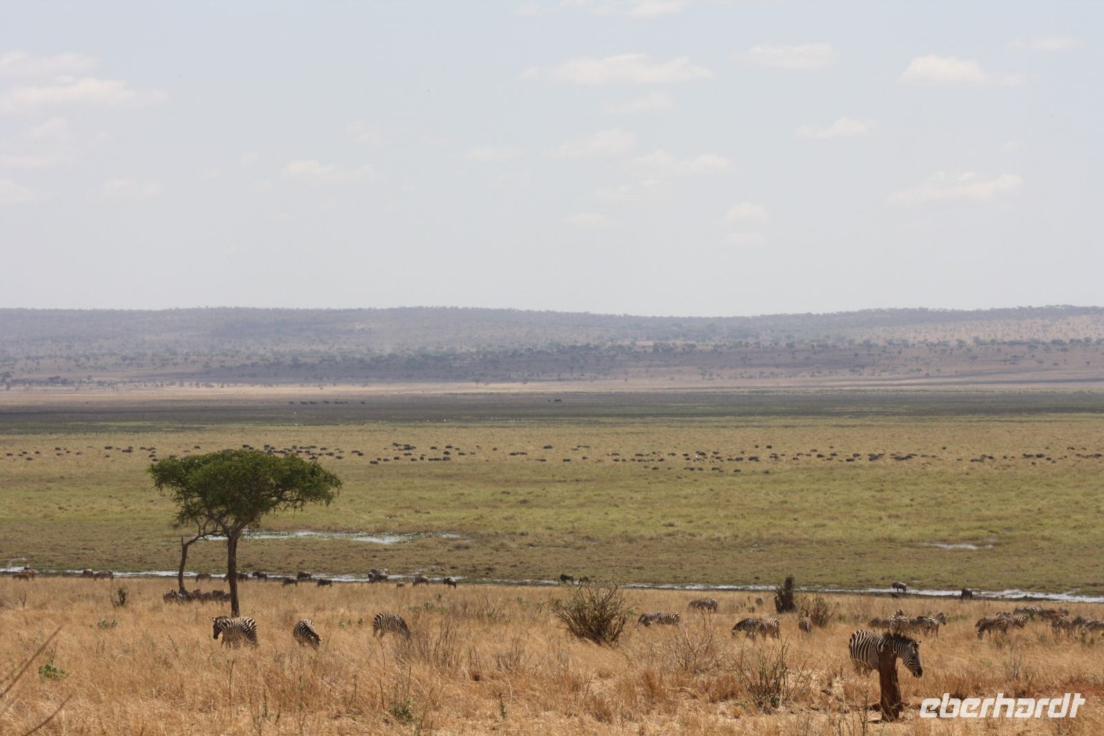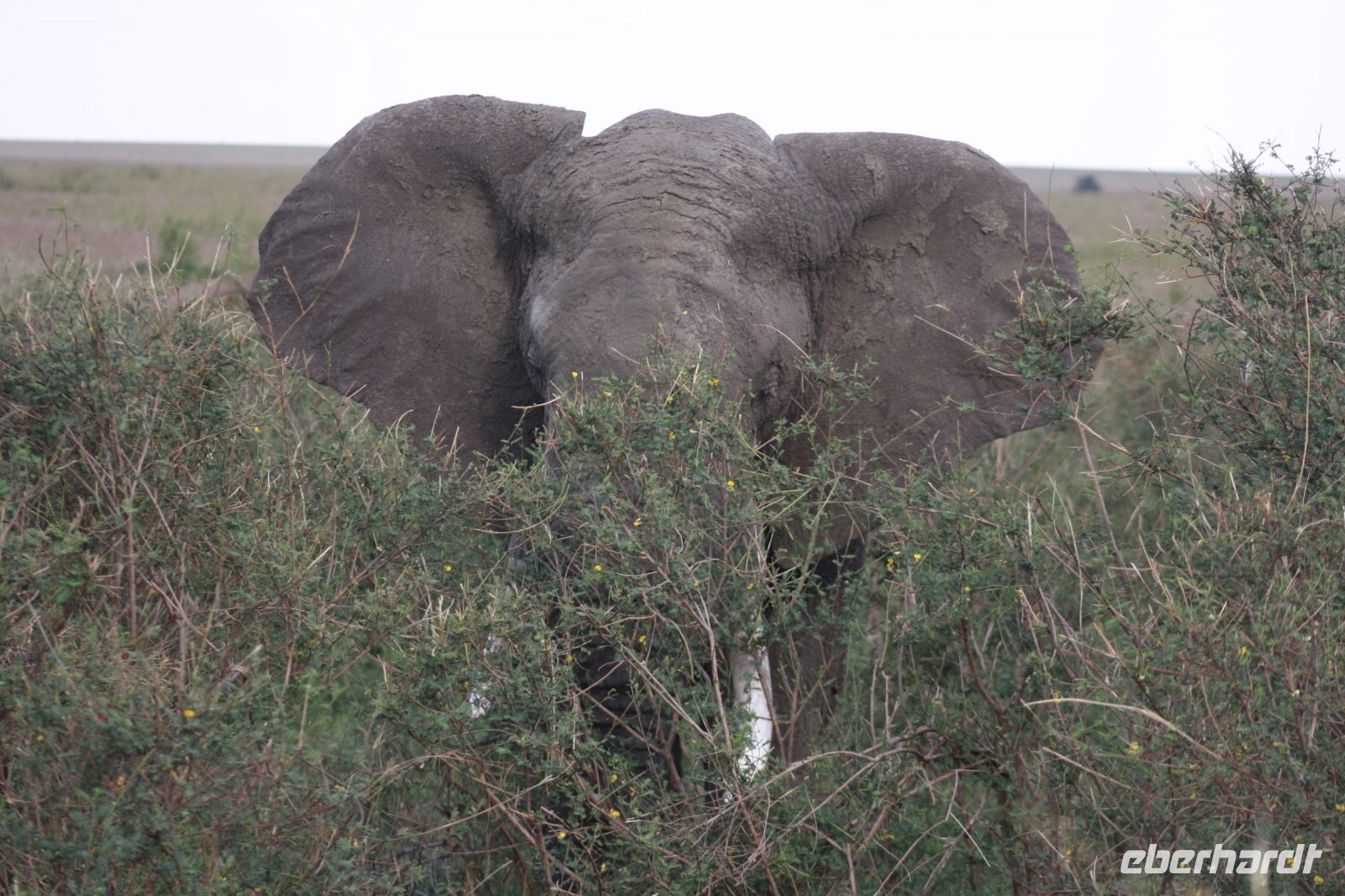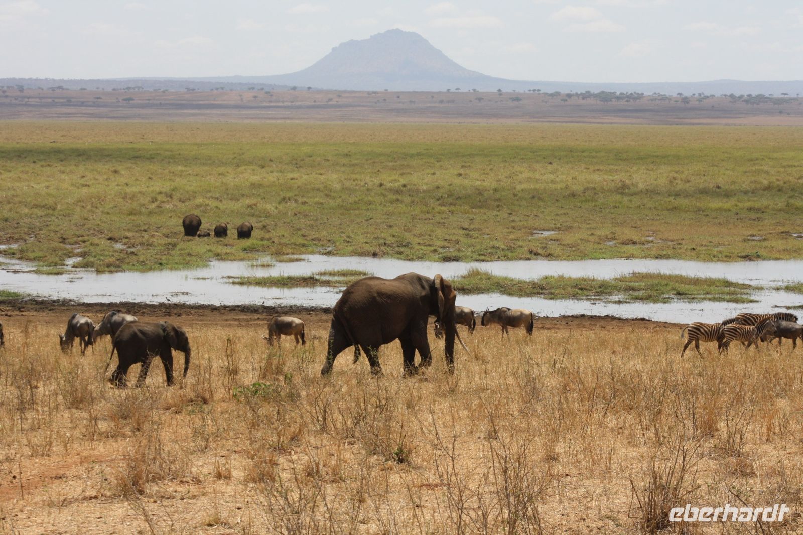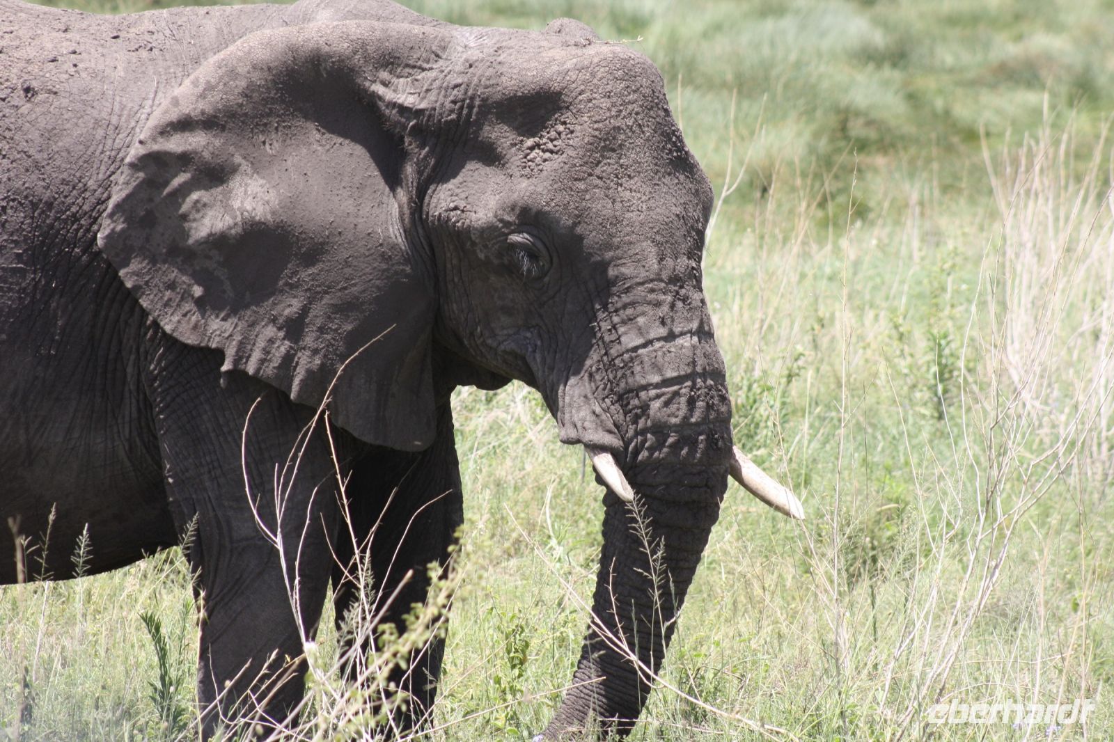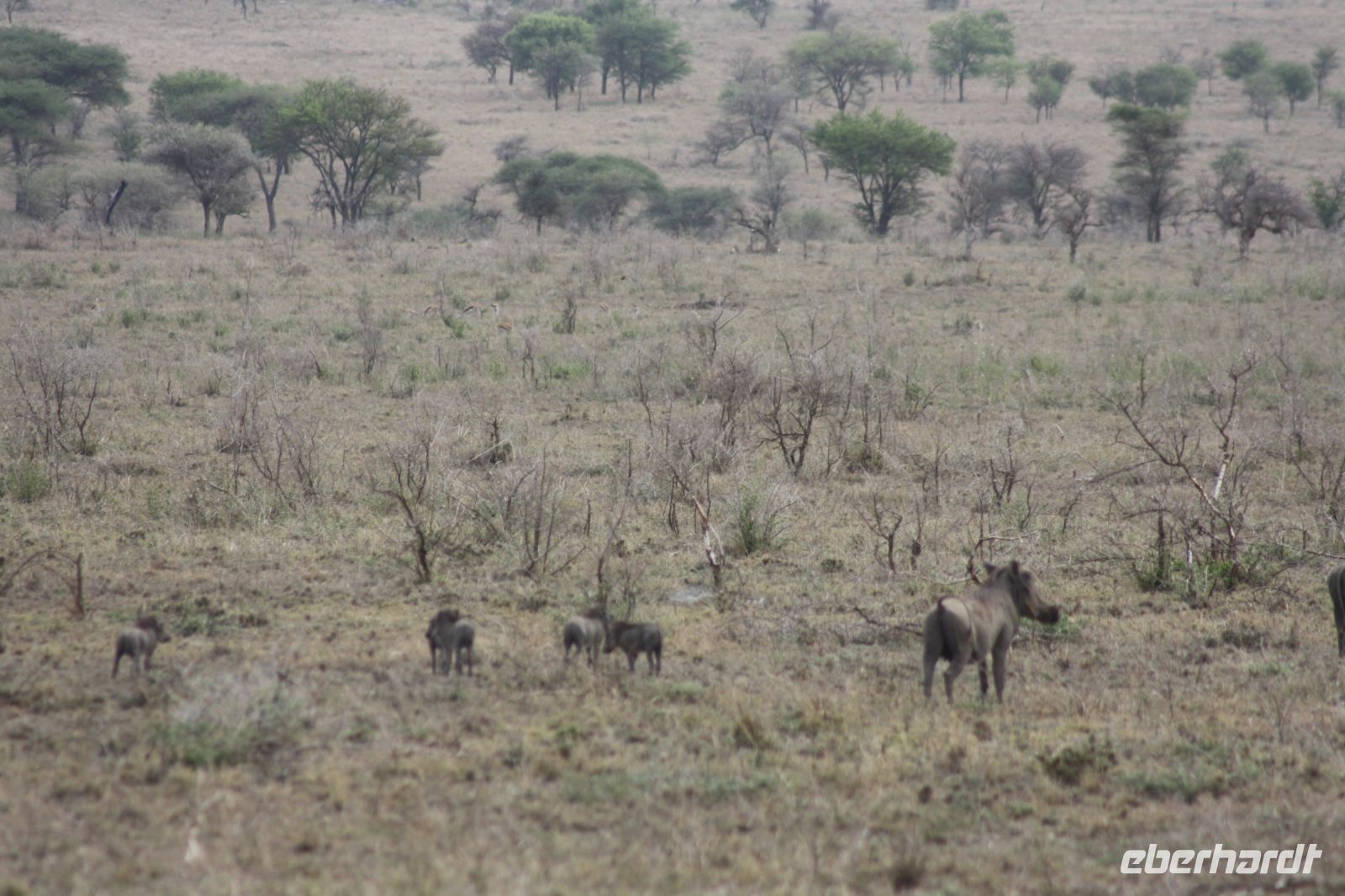 Heute verschob sich unsere Pirschfahrt ein wenig nach hinten. Bereits beim Frühstück konnten wir eine Gruppe von Elenantilopen, Zebras und Perlhuhn entdecken. Bereits in der Nacht wurden wir von Zebras und auch Elefanten besucht. Das ist der Vorteil, wenn man im Nationalpark übernachtet. Heute ließen wir den wunderschönen Tarangire Nationalpark hinter uns und machten uns auf den Weg zum Lake Manyara. Unsere Route führte uns durch viele kleine Dörfer und vorbei an bearbeiteten Reisfeldern. Immer wieder winkten uns Kinder zu und wir beobachteten die Bewohner und ihre Hütten. Am späten Vormittag erreichen wir den Manyara Nationalpark. Mit seinen 330 KM² kann der Nationalpark in Sachen Größe nicht mit seinen Nachbarn mithalten, allerdings besticht er durch seine botanische Vielfalt. Wir enterten den Park durch das südliche Gate. Ganz in der Nähe des Eingangs stießen wir auf eine Elefantenherde, die die Straße blockierten. Auf der anderen Seite konnten wir Paviane und schwarze Meerkatzen entdecken. Die Straße führte an durch die Wälder und vorbei am See. Auf unserer linken Seite konnten wir den Ostafrikanischen Grabenbruch erkennen, der sich als 500 - 800 Meter hohe Felsformation auftürmte. Immer wieder suchten wir die Bäume nach den heimischen Baumlöwen ab. Ihr atypisches Verhalten hat die Baumlöwen im Manyara Nationalpark bekannt gemacht. Der Grund des Verhaltens war vermutlich der Schutz vor lästigen Insekten in der Regenzeit und angriffslustige Büffel. Bis in den 70er Jahren gab es hier noch Herden von Büffeln, die jedoch zum Tarangire Nationalpark weitere gezogen sind. Weiter geht unsere Pirsch. Unser nach Stopp erfolgt direkt am See. Hier sehen wir einen toten Büffel mit fünf Geiern. Nur wenige Meter entfernt sonnen sich die Hippos und gucken den Hagedasch Ibisse beim Stolzieren zu. Insgesamt kann man im Nationalpark über 400 verschiedene Vogelarten entdecken. Immer wieder können wir Reiher, Pelikane, Turkane oder schwarze Hornraben erblicken. Am Wegesrand kreuzen Klippspringer unseren Weg. Zum Glück können wir die scheuen Tiere noch mit der Kamera aufnehmen. Im Anschluss können wir die verbliebenen Büffel beobachten. Am Nachmittag überqueren die grauen Dickhäuter wieder unsere Straße, sodass wir die Elefanten von nahen aufnehmen können. Auch eine größere Affengruppe schaut interessiert an diesen Spektakel zu. Unser nächstes Ziel sollte der Hippo Pool sein. Leider ist die Gegend durch die lange Regenzeit überschwemmt, sodass wir keine Chance auf weitere Hippos haben. Nach einen langen Tag verließen wir den Park und erhielten vom Aussichtspunkt mit schönem Blick über den kompletten Nationalpark.