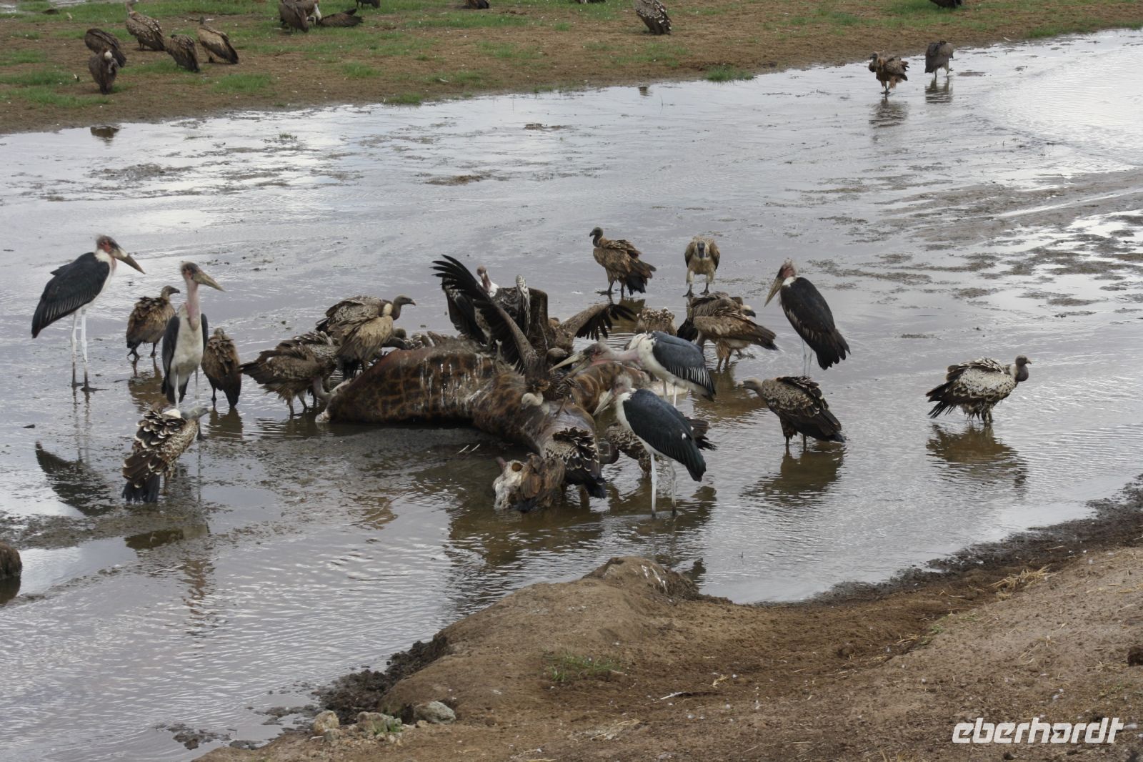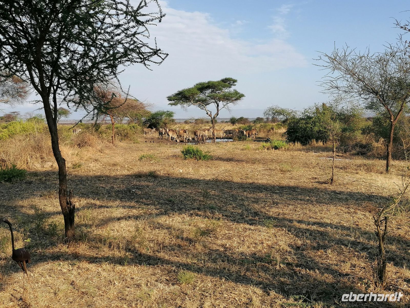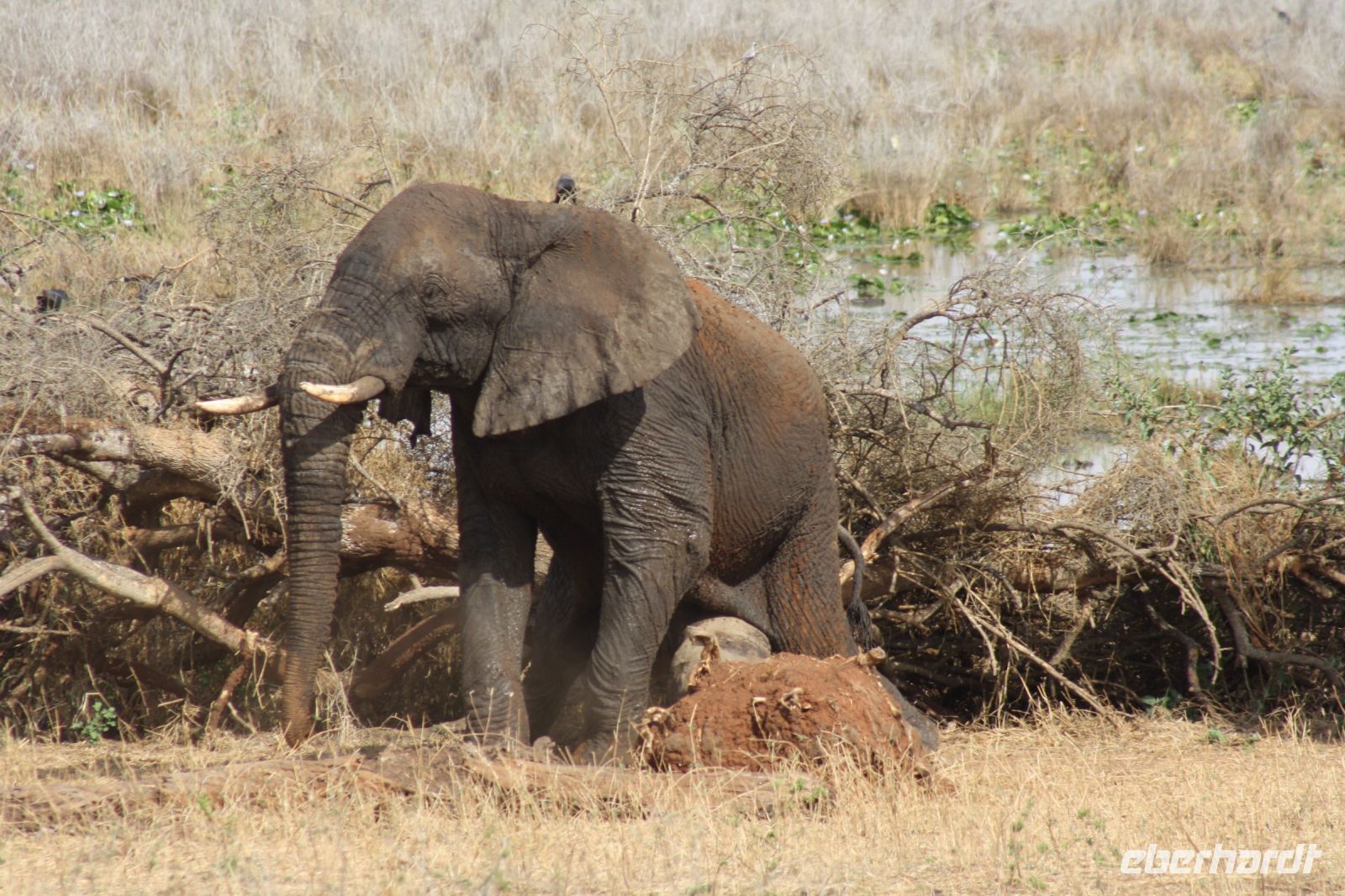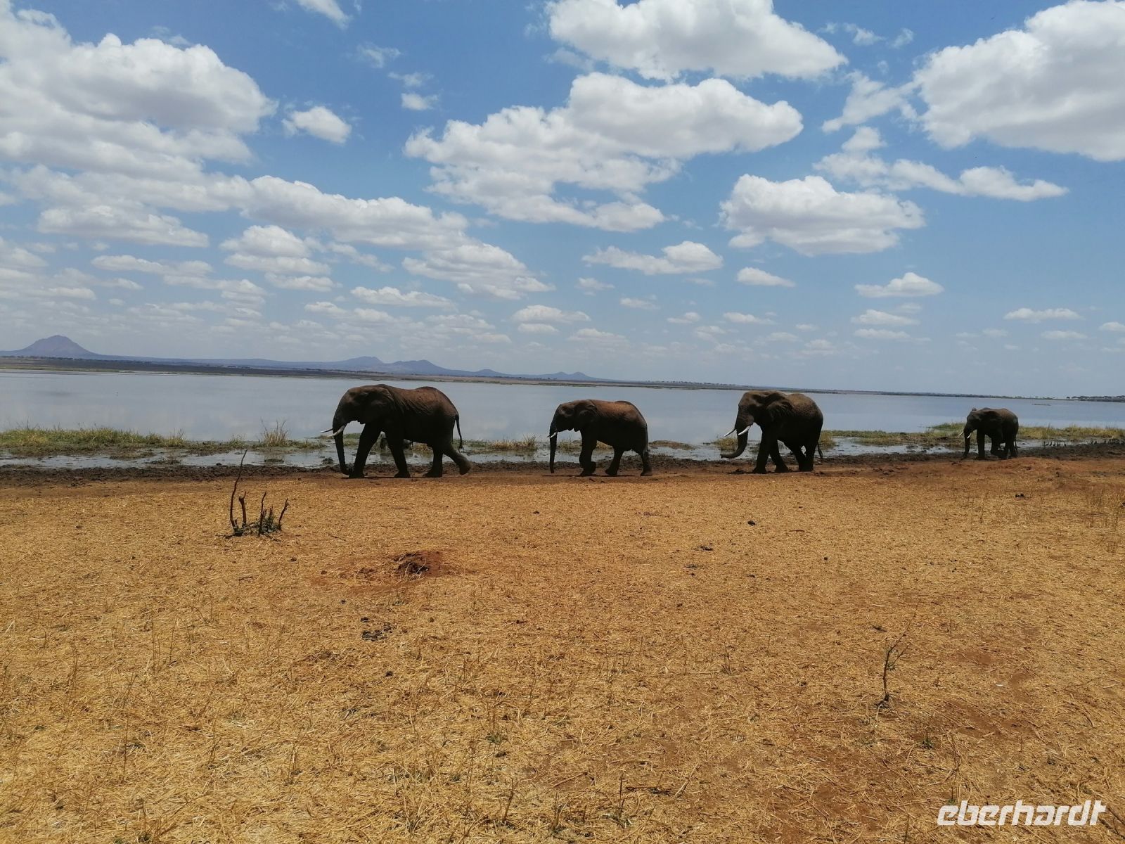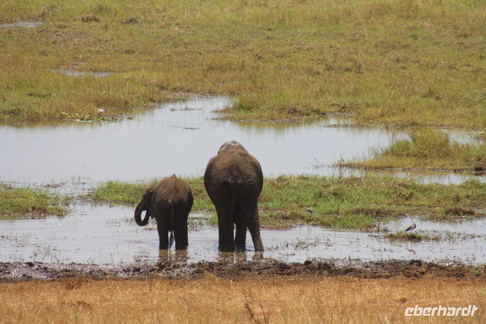 Bei unserem leckeren Frühstück auf der Beobachtungsterrasse konnten wir bereits zum Frühstück Giraffen, Impalas, Elefanten und Warzenschweine entdecken. Gegen 8 Uhr starteten wir in Richtung Sumpfgebiet. Unterwegs begegneten wir bereits Elefanten, Giraffen, Dikdiks und einen Quackvogel. Unter einem Baum erblickten wir drei alte Büffel, die sich gegenseitig vor Feinden schützten. Plötzlich spazierten Elefanten nah an unserem Jeep vorbei. Die Elefanten wollten genau wie wir in Richtung Sumpfgebiet. Das Gebiet ist ein Paradies für die heimische Tierwelt, da der Sumpf niemals austrocknet und ganzjährige das Tier und auch die Pflanzenwelt versorgt. Während wir die Elefanten fotografierten, bemerkten wir einen üblen Geruch. Direkt neben uns knapperten Geier an einem toten Gnu. Riesige Zebra Herden spazierten an uns vorbei und an einem kleinen Wasserloch badeten Impalas, Warzenschweine, Zebras und Gelbschnabelstörche gemeinsam. Kurz bevor wir das Sumpfgebiet erreichten, wartete eine große Büffelherde auf uns, die sich auf Wanderung begaben. Endlich erreichten wir das grüne Sumpfgebiet. Immer wieder zogen Elefantenherden und uns vorbei. Ihr Ziel war der Sumpf, wo sie baden und mit den kleinen Elefanten toben konnten. Neben einer Vielzahl an Gnus und Zebras, konnten wir über 100te Elefanten zählen. Ein absoluter Wahnsinn. Entlang des grünen Streifens konnten wir zudem Büffel und die hiesige Vogelwelt bestaunen. Wir erspähten einen Hagedasch-Vogel, Pelikane, Reihenreiher, pfeifende Enten, Eisvögel, Flamingos, Geier und ein Adler. Unsere Mittagspause konnten wir inmitten des Sumpfgebietes einnehmen und Karim versorgte uns mit Reis, Nudeln und Hühnchen. Nach der leckeren Mittagspause fuhren wir weiter zum Westen des Sumpfgebietes. Hier trafen wir wieder auf die drei Elefanten Bullen, die vermutlich den Weibchen hinterherliefen. Immer wieder konnten wir in der Ferne Elefanten baden sehen. Neben einen Sattelstorch konnten wir auch den Sekretär-Vogel entdecken, der durch die Gegend spazierte. Wir waren vollkommen fasziniert von der Vielfalt der verschiedenen Arten und die Vielzahl der Tiere. Leider mussten wir uns langsam von der Sumpflandschaft verabschieden. Eine weitere Herde von etwa 20 Elefanten und Kudos schlenderten an uns vorbei. Unterwegs konnten wir im Dreck wälzende Zebras sehen und ein sich juckender Elefant sorgte für Erheiterung. Ein wunderschöner Tag neigte sich nun dem Ende entgegen und wir ließen den Tag bei einem gemeinsam "Feierabendbier" in der Lodge ausklingen.