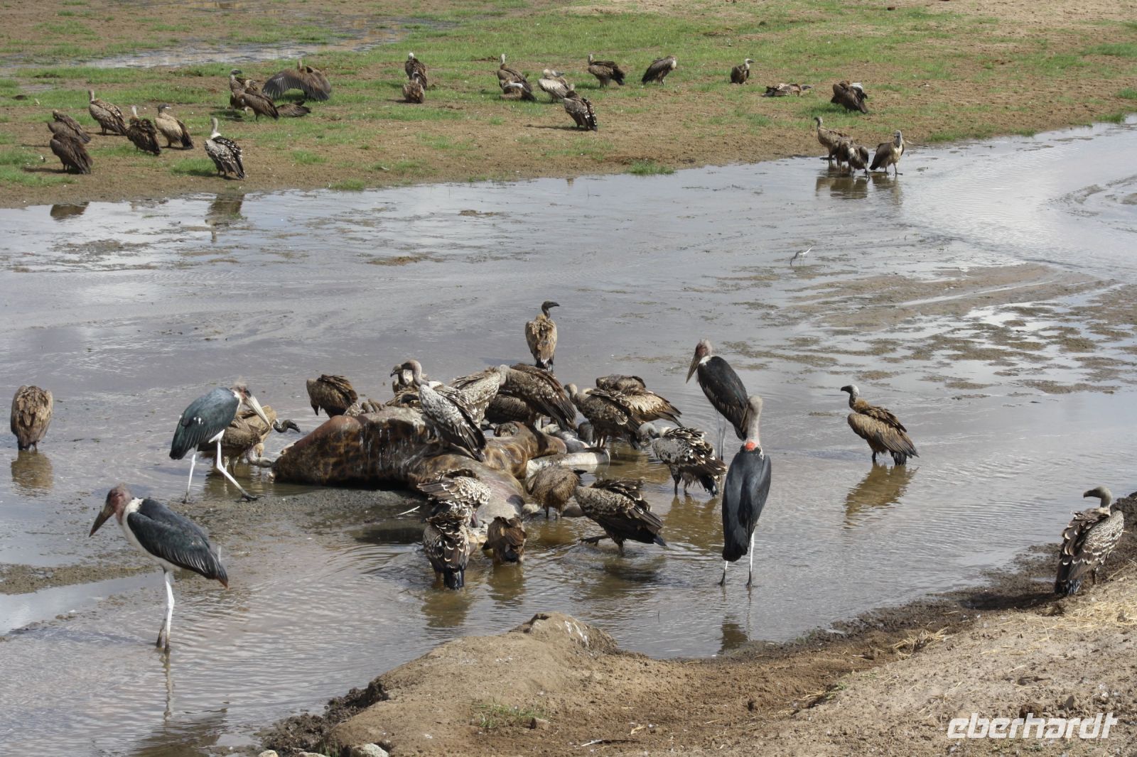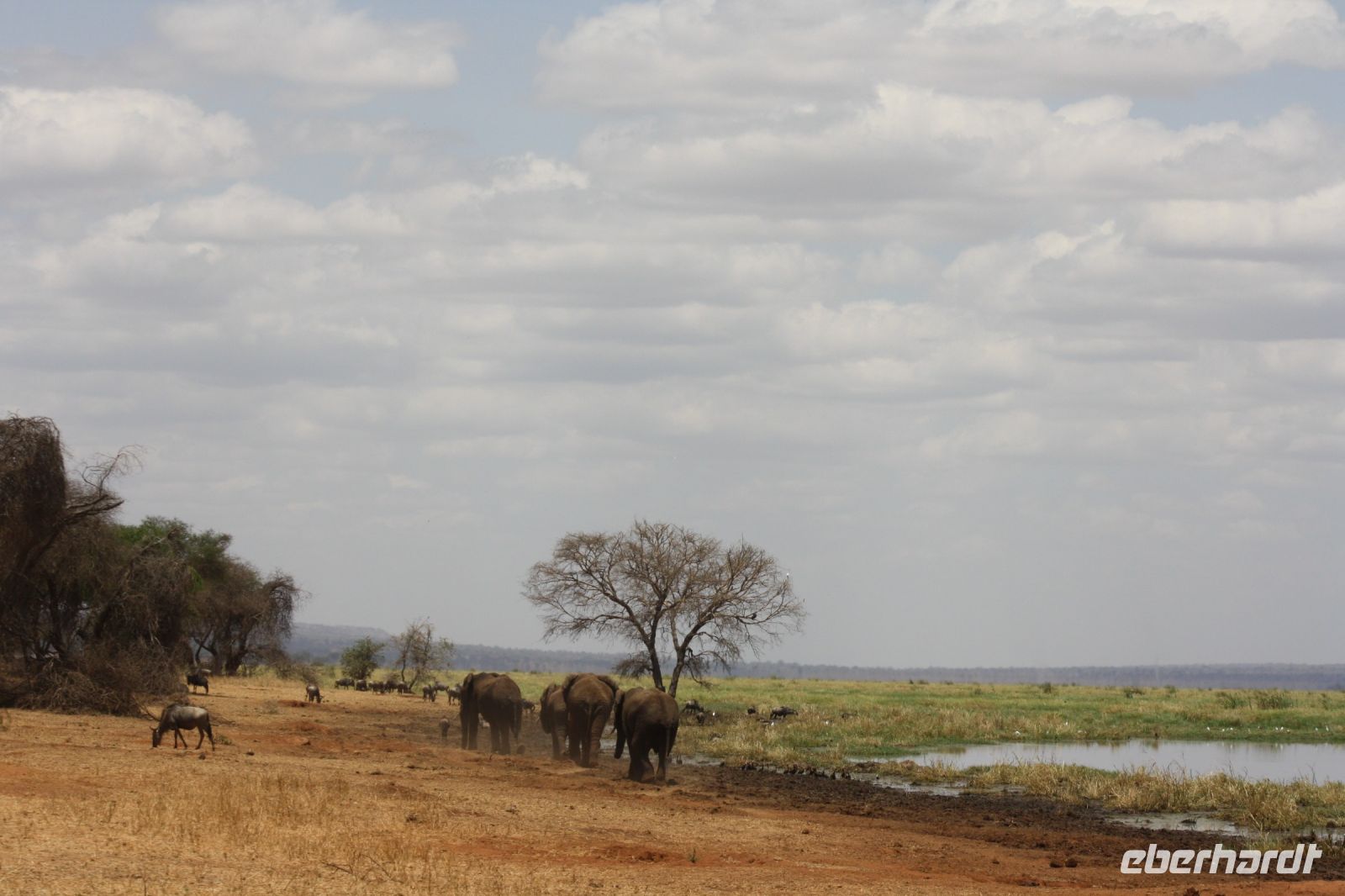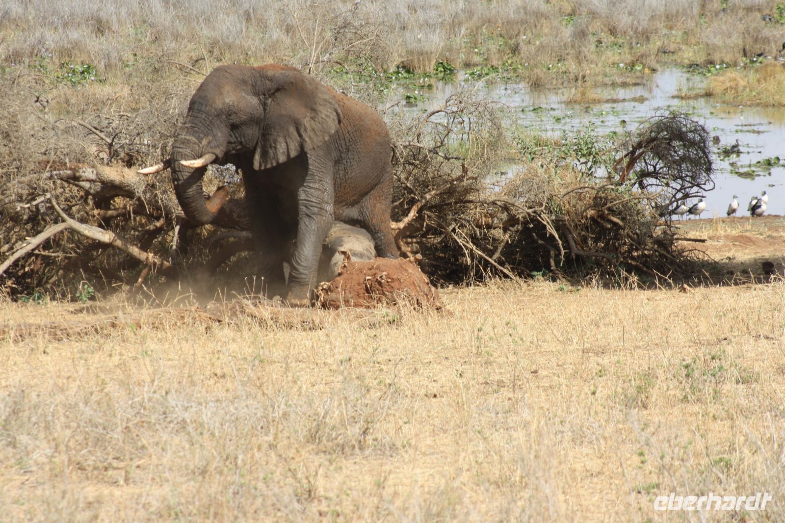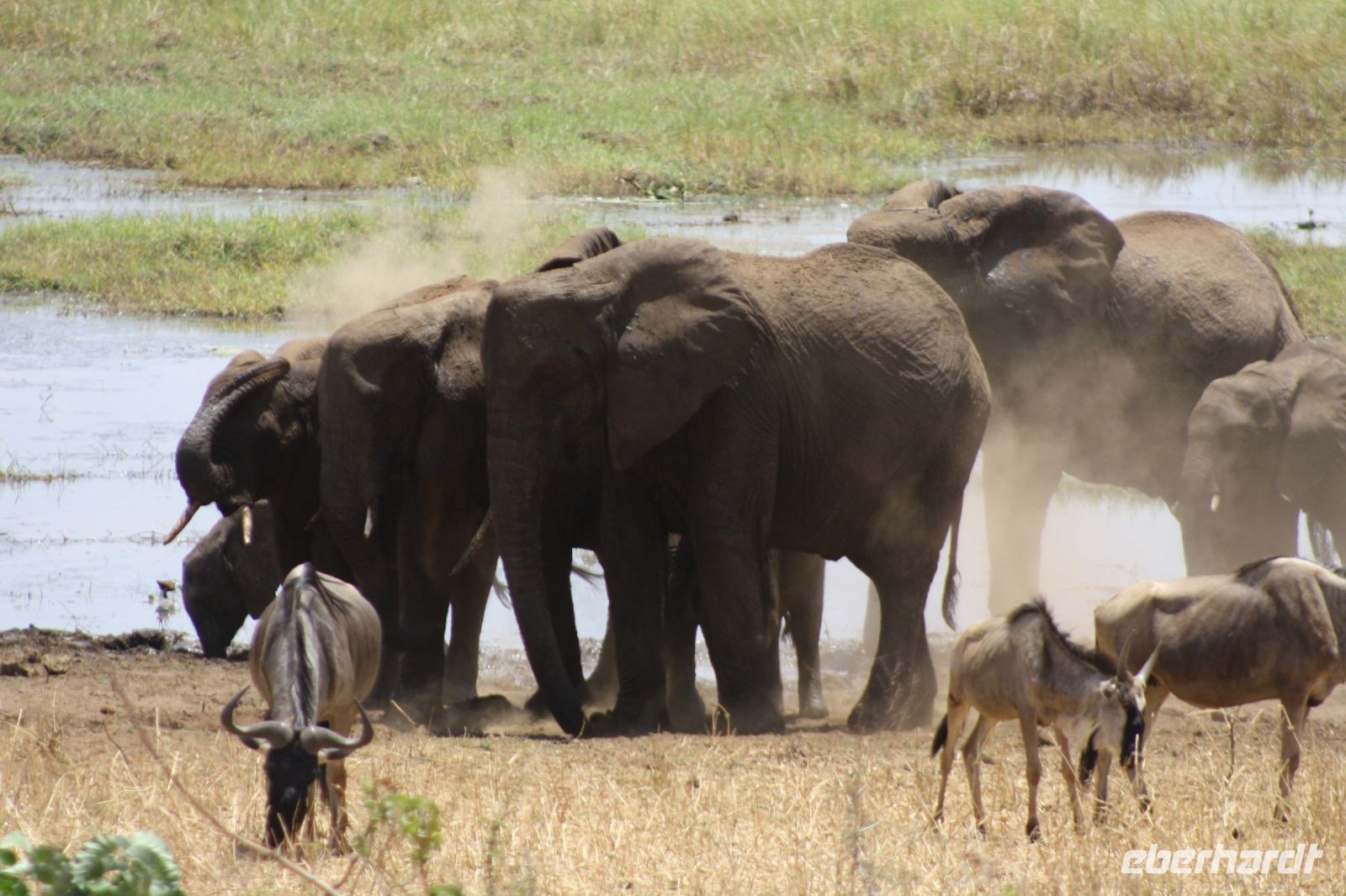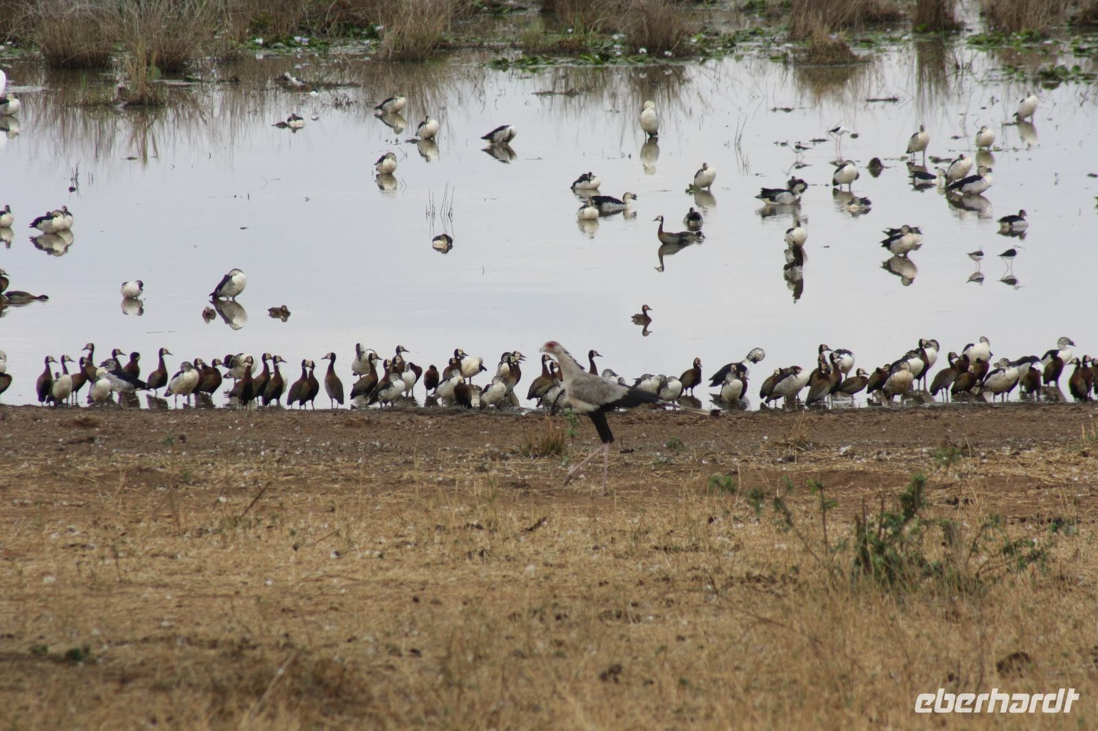 Bei unserem leckeren Frühstück auf der Beobachtungsterrasse konnten wir bereits zum Frühstück Giraffen, Impalas, Elefanten und Warzenschweine entdecken. Gegen 8 Uhr starteten wir in Richtung Sumpfgebiet. Unterwegs begegneten wir bereits Elefanten, Giraffen, Dikdiks und einen Quackvogel. Unter einem Baum erblickten wir drei alte Büffel, die sich gegenseitig vor Feinden schützten. Plötzlich spazierten Elefanten nah an unserem Jeep vorbei. Die Elefanten wollten genau wie wir in Richtung Sumpfgebiet. Das Gebiet ist ein Paradies für die heimische Tierwelt, da der Sumpf niemals austrocknet und ganzjährige das Tier und auch die Pflanzenwelt versorgt. Während wir die Elefanten fotografierten, bemerkten wir einen üblen Geruch. Direkt neben uns knapperten Geier an einem toten Gnu. Riesige Zebra Herden spazierten an uns vorbei und an einem kleinen Wasserloch badeten Impalas, Warzenschweine, Zebras und Gelbschnabelstörche gemeinsam. Kurz bevor wir das Sumpfgebiet erreichten, wartete eine große Büffelherde auf uns, die sich auf Wanderung begaben. Endlich erreichten wir das grüne Sumpfgebiet. Immer wieder zogen Elefantenherden und uns vorbei. Ihr Ziel war der Sumpf, wo sie baden und mit den kleinen Elefanten toben konnten. Neben einer Vielzahl an Gnus und Zebras, konnten wir über 100te Elefanten zählen. Ein absoluter Wahnsinn. Entlang des grünen Streifens konnten wir zudem Büffel und die hiesige Vogelwelt bestaunen. Wir erspähten einen Hagedasch-Vogel, Pelikane, Reihenreiher, pfeifende Enten, Eisvögel, Flamingos, Geier und ein Adler. Unsere Mittagspause konnten wir inmitten des Sumpfgebietes einnehmen und Karim versorgte uns mit Reis, Nudeln und Hühnchen. Nach der leckeren Mittagspause fuhren wir weiter zum Westen des Sumpfgebietes. Hier trafen wir wieder auf die drei Elefanten Bullen, die vermutlich den Weibchen hinterherliefen. Immer wieder konnten wir in der Ferne Elefanten baden sehen. Neben einen Sattelstorch konnten wir auch den Sekretär-Vogel entdecken, der durch die Gegend spazierte. Wir waren vollkommen fasziniert von der Vielfalt der verschiedenen Arten und die Vielzahl der Tiere. Leider mussten wir uns langsam von der Sumpflandschaft verabschieden. Eine weitere Herde von etwa 20 Elefanten und Kudos schlenderten an uns vorbei. Unterwegs konnten wir im Dreck wälzende Zebras sehen und ein sich juckender Elefant sorgte für Erheiterung. Ein wunderschöner Tag neigte sich nun dem Ende entgegen und wir ließen den Tag bei einem gemeinsam "Feierabendbier" in der Lodge ausklingen.
