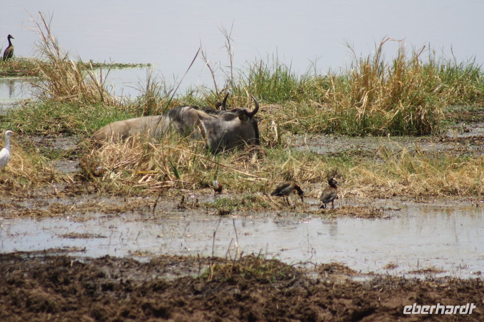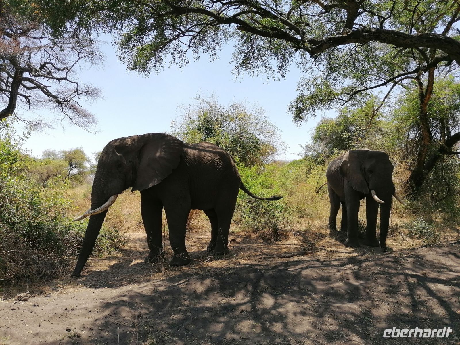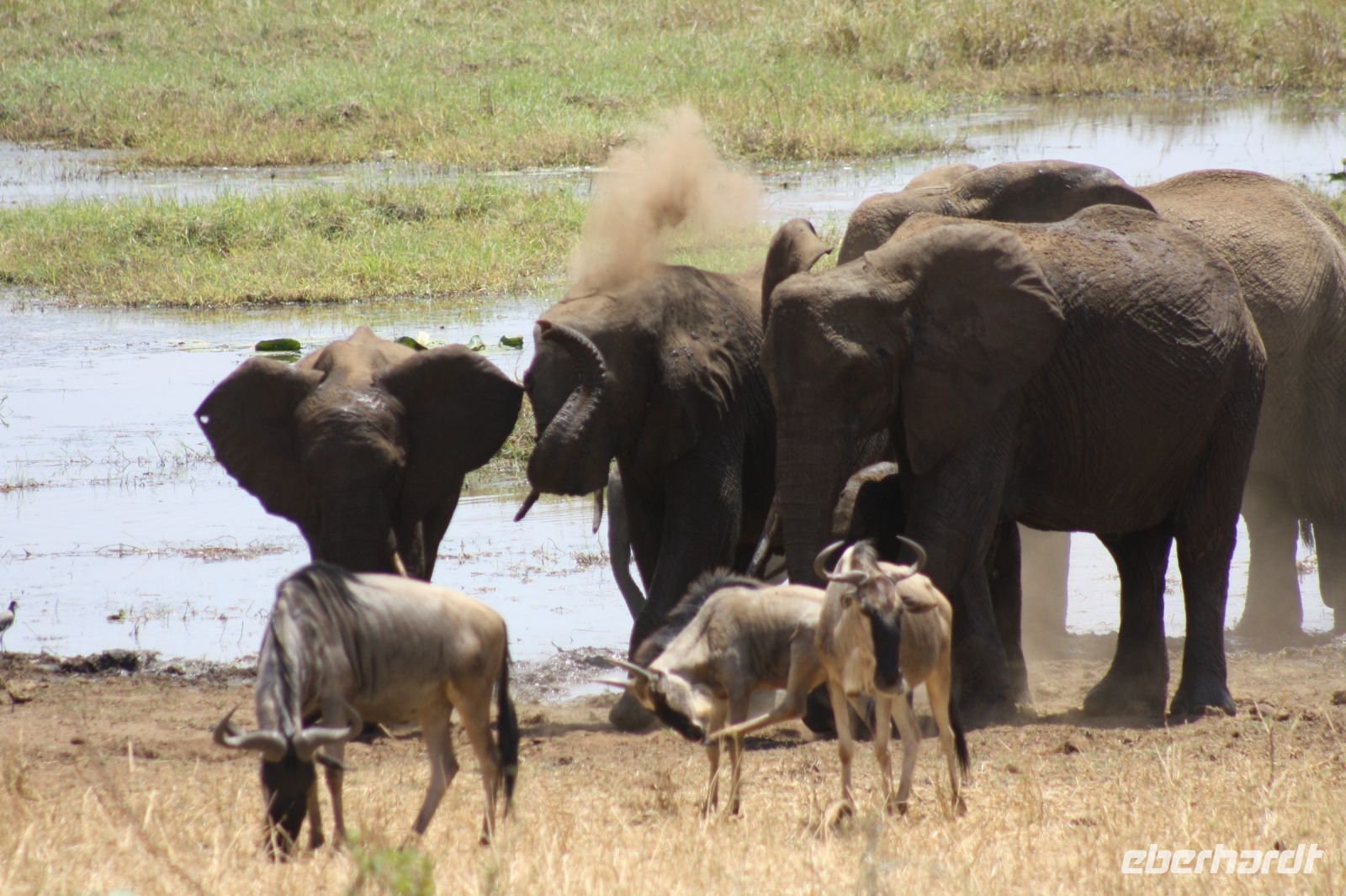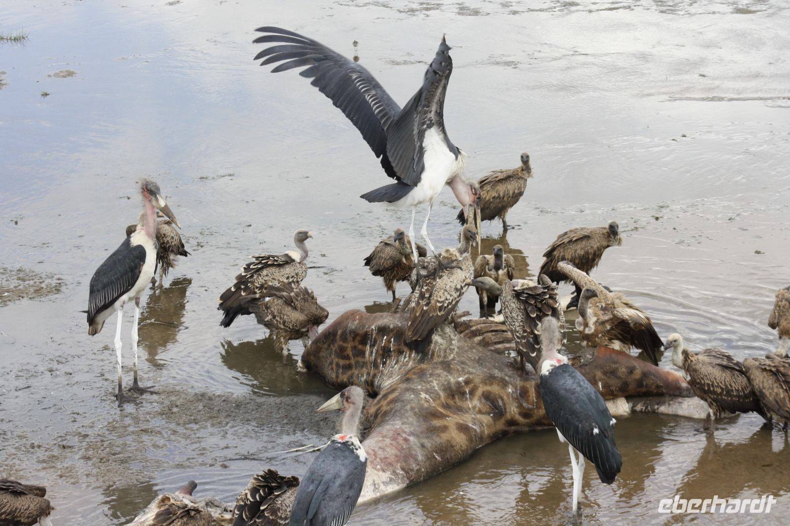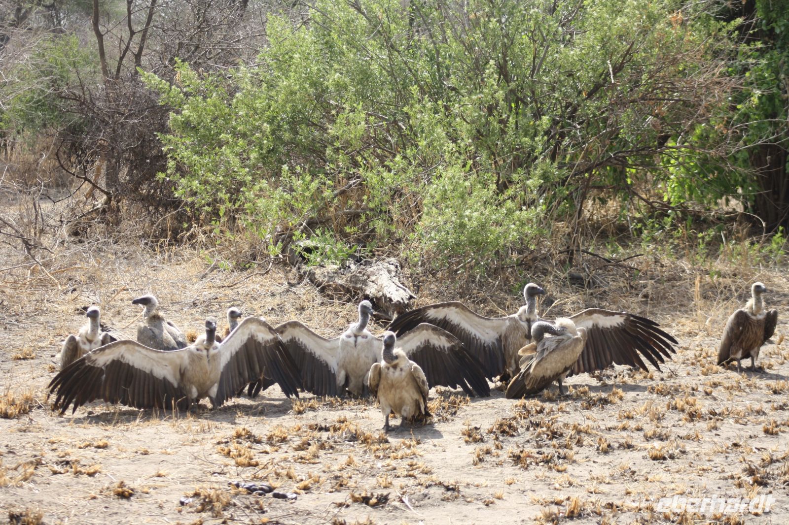 Bei unserem leckeren Frühstück auf der Beobachtungsterrasse konnten wir bereits zum Frühstück Giraffen, Impalas, Elefanten und Warzenschweine entdecken. Gegen 8 Uhr starteten wir in Richtung Sumpfgebiet. Unterwegs begegneten wir bereits Elefanten, Giraffen, Dikdiks und einen Quackvogel. Unter einem Baum erblickten wir drei alte Büffel, die sich gegenseitig vor Feinden schützten. Plötzlich spazierten Elefanten nah an unserem Jeep vorbei. Die Elefanten wollten genau wie wir in Richtung Sumpfgebiet. Das Gebiet ist ein Paradies für die heimische Tierwelt, da der Sumpf niemals austrocknet und ganzjährige das Tier und auch die Pflanzenwelt versorgt. Während wir die Elefanten fotografierten, bemerkten wir einen üblen Geruch. Direkt neben uns knapperten Geier an einem toten Gnu. Riesige Zebra Herden spazierten an uns vorbei und an einem kleinen Wasserloch badeten Impalas, Warzenschweine, Zebras und Gelbschnabelstörche gemeinsam. Kurz bevor wir das Sumpfgebiet erreichten, wartete eine große Büffelherde auf uns, die sich auf Wanderung begaben. Endlich erreichten wir das grüne Sumpfgebiet. Immer wieder zogen Elefantenherden und uns vorbei. Ihr Ziel war der Sumpf, wo sie baden und mit den kleinen Elefanten toben konnten. Neben einer Vielzahl an Gnus und Zebras, konnten wir über 100te Elefanten zählen. Ein absoluter Wahnsinn. Entlang des grünen Streifens konnten wir zudem Büffel und die hiesige Vogelwelt bestaunen. Wir erspähten einen Hagedasch-Vogel, Pelikane, Reihenreiher, pfeifende Enten, Eisvögel, Flamingos, Geier und ein Adler. Unsere Mittagspause konnten wir inmitten des Sumpfgebietes einnehmen und Karim versorgte uns mit Reis, Nudeln und Hühnchen. Nach der leckeren Mittagspause fuhren wir weiter zum Westen des Sumpfgebietes. Hier trafen wir wieder auf die drei Elefanten Bullen, die vermutlich den Weibchen hinterherliefen. Immer wieder konnten wir in der Ferne Elefanten baden sehen. Neben einen Sattelstorch konnten wir auch den Sekretär-Vogel entdecken, der durch die Gegend spazierte. Wir waren vollkommen fasziniert von der Vielfalt der verschiedenen Arten und die Vielzahl der Tiere. Leider mussten wir uns langsam von der Sumpflandschaft verabschieden. Eine weitere Herde von etwa 20 Elefanten und Kudos schlenderten an uns vorbei. Unterwegs konnten wir im Dreck wälzende Zebras sehen und ein sich juckender Elefant sorgte für Erheiterung. Ein wunderschöner Tag neigte sich nun dem Ende entgegen und wir ließen den Tag bei einem gemeinsam "Feierabendbier" in der Lodge ausklingen.