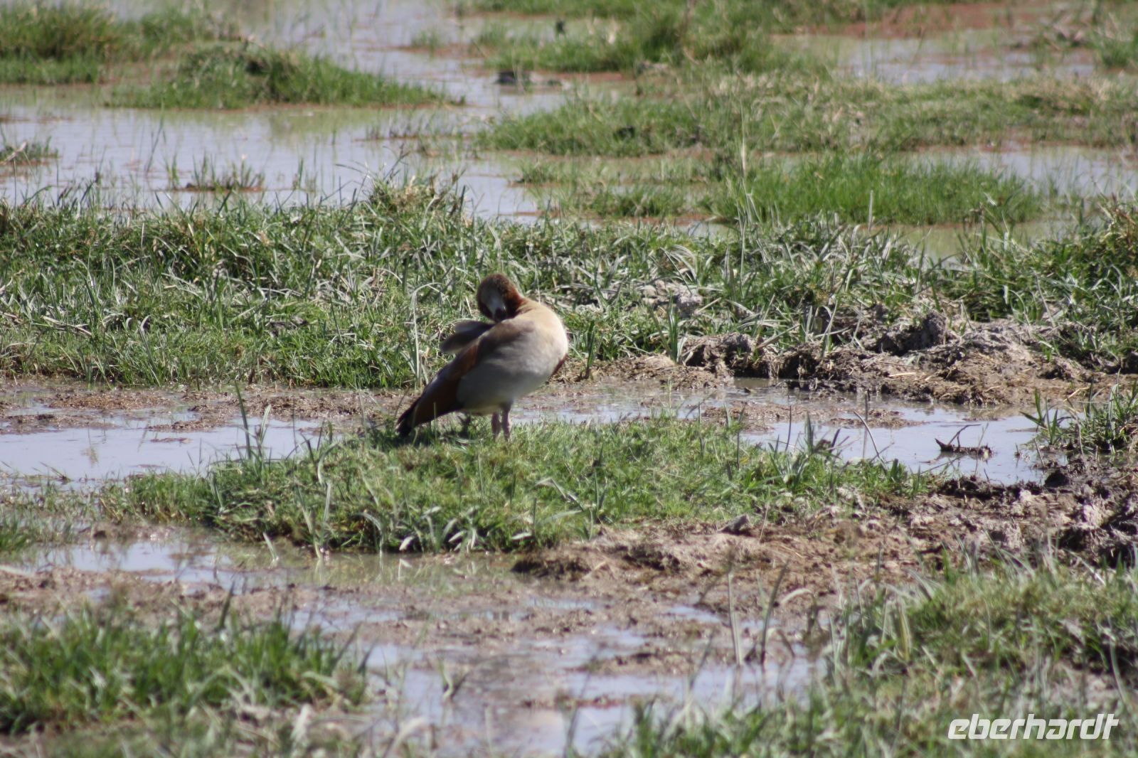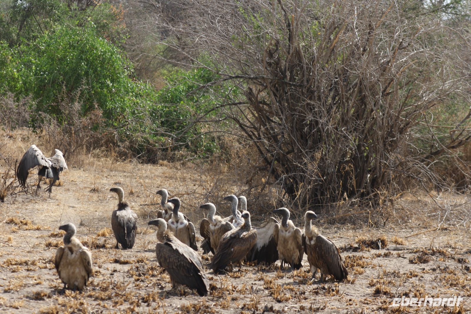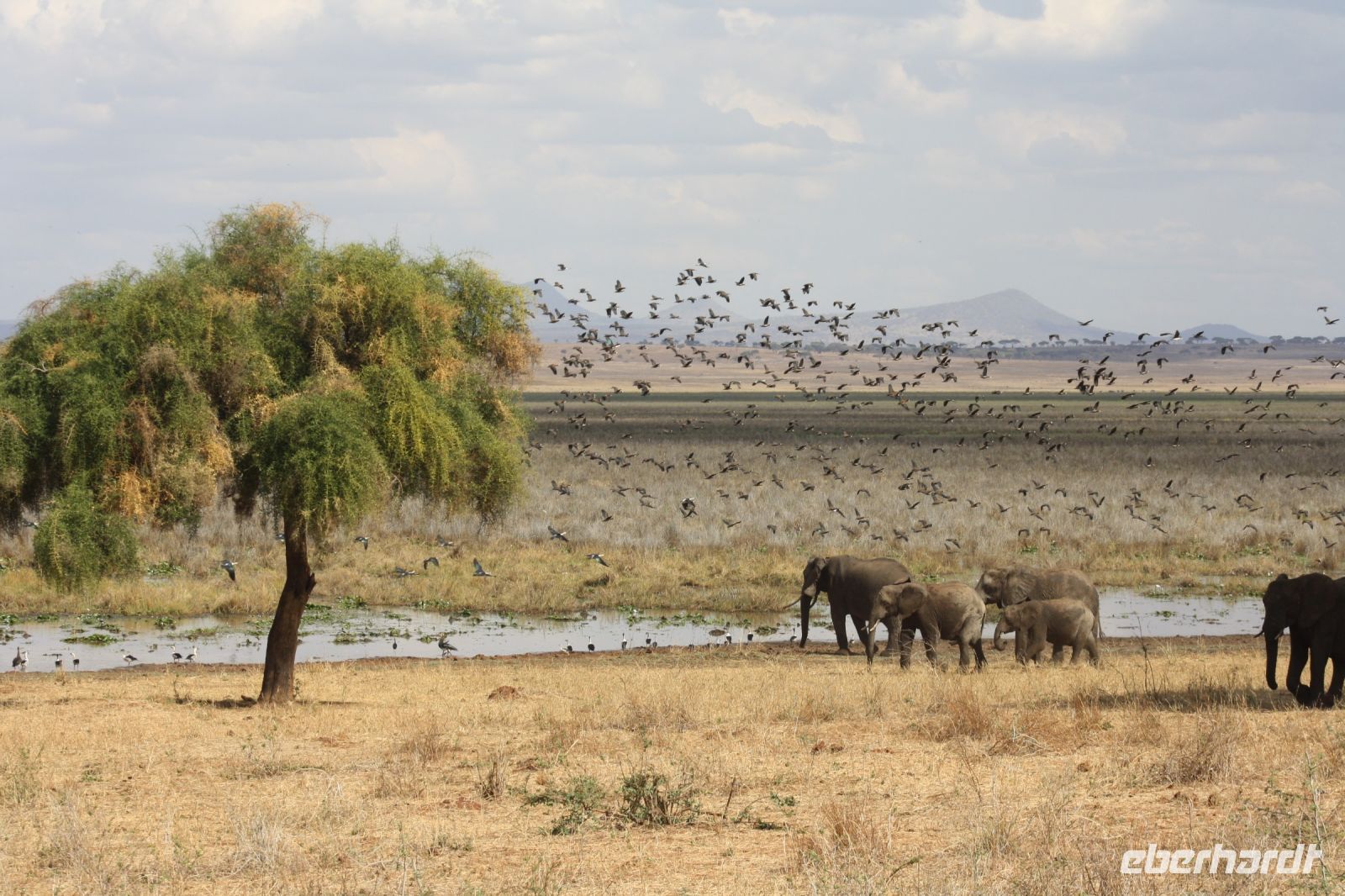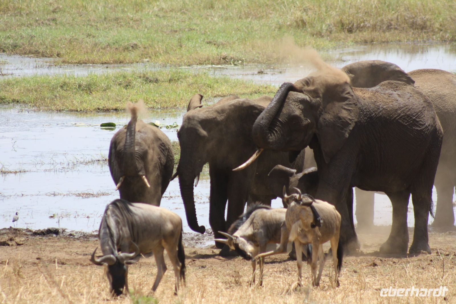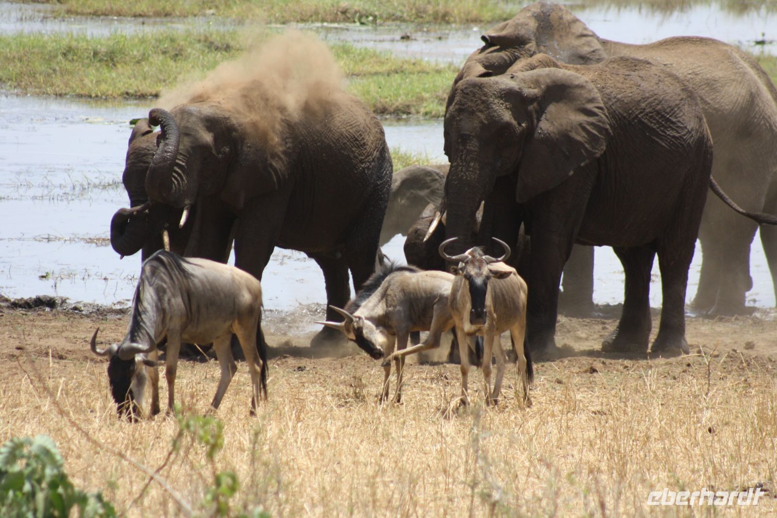 Bei unserem leckeren Frühstück auf der Beobachtungsterrasse konnten wir bereits zum Frühstück Giraffen, Impalas, Elefanten und Warzenschweine entdecken. Gegen 8 Uhr starteten wir in Richtung Sumpfgebiet. Unterwegs begegneten wir bereits Elefanten, Giraffen, Dikdiks und einen Quackvogel. Unter einem Baum erblickten wir drei alte Büffel, die sich gegenseitig vor Feinden schützten. Plötzlich spazierten Elefanten nah an unserem Jeep vorbei. Die Elefanten wollten genau wie wir in Richtung Sumpfgebiet. Das Gebiet ist ein Paradies für die heimische Tierwelt, da der Sumpf niemals austrocknet und ganzjährige das Tier und auch die Pflanzenwelt versorgt. Während wir die Elefanten fotografierten, bemerkten wir einen üblen Geruch. Direkt neben uns knapperten Geier an einem toten Gnu. Riesige Zebra Herden spazierten an uns vorbei und an einem kleinen Wasserloch badeten Impalas, Warzenschweine, Zebras und Gelbschnabelstörche gemeinsam. Kurz bevor wir das Sumpfgebiet erreichten, wartete eine große Büffelherde auf uns, die sich auf Wanderung begaben. Endlich erreichten wir das grüne Sumpfgebiet. Immer wieder zogen Elefantenherden und uns vorbei. Ihr Ziel war der Sumpf, wo sie baden und mit den kleinen Elefanten toben konnten. Neben einer Vielzahl an Gnus und Zebras, konnten wir über 100te Elefanten zählen. Ein absoluter Wahnsinn. Entlang des grünen Streifens konnten wir zudem Büffel und die hiesige Vogelwelt bestaunen. Wir erspähten einen Hagedasch-Vogel, Pelikane, Reihenreiher, pfeifende Enten, Eisvögel, Flamingos, Geier und ein Adler. Unsere Mittagspause konnten wir inmitten des Sumpfgebietes einnehmen und Karim versorgte uns mit Reis, Nudeln und Hühnchen. Nach der leckeren Mittagspause fuhren wir weiter zum Westen des Sumpfgebietes. Hier trafen wir wieder auf die drei Elefanten Bullen, die vermutlich den Weibchen hinterherliefen. Immer wieder konnten wir in der Ferne Elefanten baden sehen. Neben einen Sattelstorch konnten wir auch den Sekretär-Vogel entdecken, der durch die Gegend spazierte. Wir waren vollkommen fasziniert von der Vielfalt der verschiedenen Arten und die Vielzahl der Tiere. Leider mussten wir uns langsam von der Sumpflandschaft verabschieden. Eine weitere Herde von etwa 20 Elefanten und Kudos schlenderten an uns vorbei. Unterwegs konnten wir im Dreck wälzende Zebras sehen und ein sich juckender Elefant sorgte für Erheiterung. Ein wunderschöner Tag neigte sich nun dem Ende entgegen und wir ließen den Tag bei einem gemeinsam "Feierabendbier" in der Lodge ausklingen.