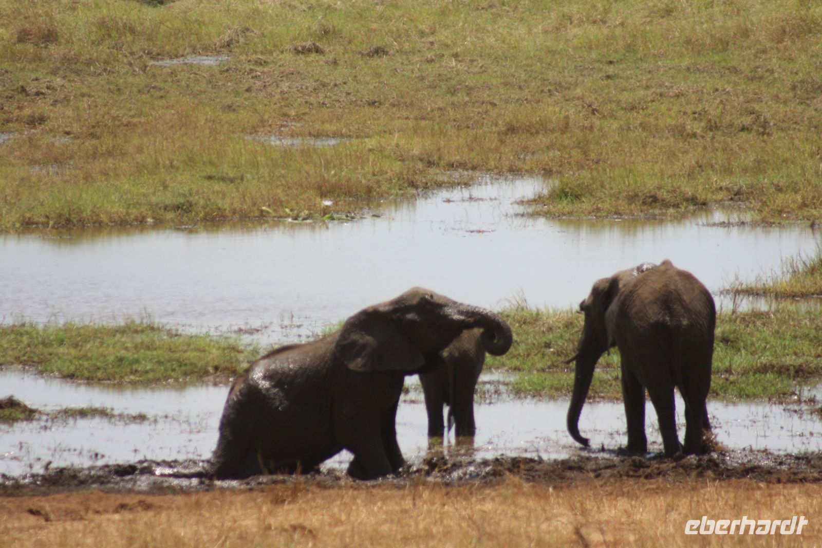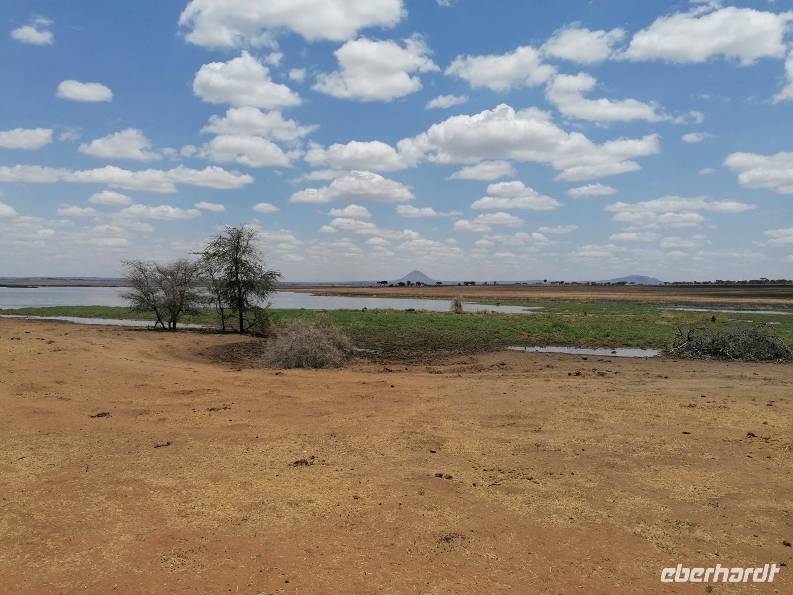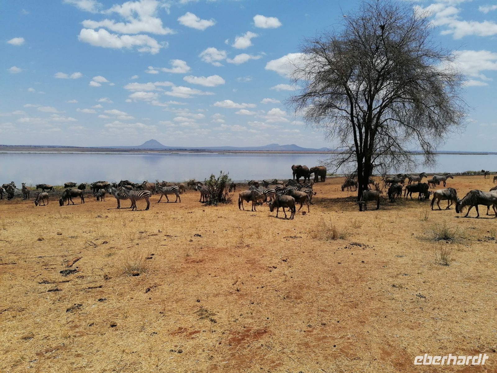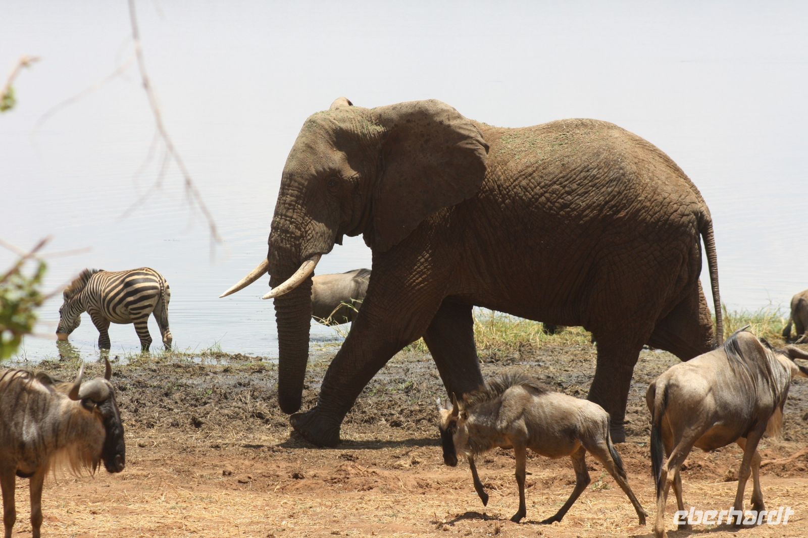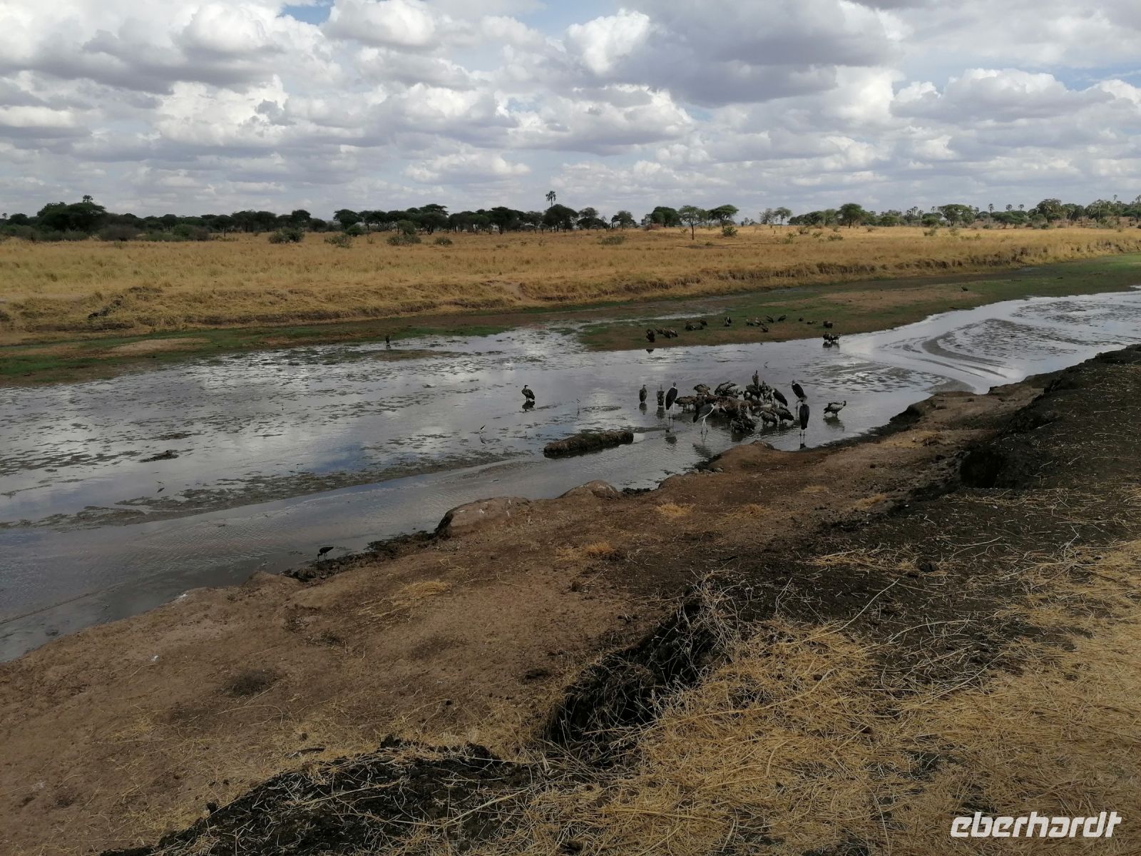 Bei unserem leckeren Frühstück auf der Beobachtungsterrasse konnten wir bereits zum Frühstück Giraffen, Impalas, Elefanten und Warzenschweine entdecken. Gegen 8 Uhr starteten wir in Richtung Sumpfgebiet. Unterwegs begegneten wir bereits Elefanten, Giraffen, Dikdiks und einen Quackvogel. Unter einem Baum erblickten wir drei alte Büffel, die sich gegenseitig vor Feinden schützten. Plötzlich spazierten Elefanten nah an unserem Jeep vorbei. Die Elefanten wollten genau wie wir in Richtung Sumpfgebiet. Das Gebiet ist ein Paradies für die heimische Tierwelt, da der Sumpf niemals austrocknet und ganzjährige das Tier und auch die Pflanzenwelt versorgt. Während wir die Elefanten fotografierten, bemerkten wir einen üblen Geruch. Direkt neben uns knapperten Geier an einem toten Gnu. Riesige Zebra Herden spazierten an uns vorbei und an einem kleinen Wasserloch badeten Impalas, Warzenschweine, Zebras und Gelbschnabelstörche gemeinsam. Kurz bevor wir das Sumpfgebiet erreichten, wartete eine große Büffelherde auf uns, die sich auf Wanderung begaben. Endlich erreichten wir das grüne Sumpfgebiet. Immer wieder zogen Elefantenherden und uns vorbei. Ihr Ziel war der Sumpf, wo sie baden und mit den kleinen Elefanten toben konnten. Neben einer Vielzahl an Gnus und Zebras, konnten wir über 100te Elefanten zählen. Ein absoluter Wahnsinn. Entlang des grünen Streifens konnten wir zudem Büffel und die hiesige Vogelwelt bestaunen. Wir erspähten einen Hagedasch-Vogel, Pelikane, Reihenreiher, pfeifende Enten, Eisvögel, Flamingos, Geier und ein Adler. Unsere Mittagspause konnten wir inmitten des Sumpfgebietes einnehmen und Karim versorgte uns mit Reis, Nudeln und Hühnchen. Nach der leckeren Mittagspause fuhren wir weiter zum Westen des Sumpfgebietes. Hier trafen wir wieder auf die drei Elefanten Bullen, die vermutlich den Weibchen hinterherliefen. Immer wieder konnten wir in der Ferne Elefanten baden sehen. Neben einen Sattelstorch konnten wir auch den Sekretär-Vogel entdecken, der durch die Gegend spazierte. Wir waren vollkommen fasziniert von der Vielfalt der verschiedenen Arten und die Vielzahl der Tiere. Leider mussten wir uns langsam von der Sumpflandschaft verabschieden. Eine weitere Herde von etwa 20 Elefanten und Kudos schlenderten an uns vorbei. Unterwegs konnten wir im Dreck wälzende Zebras sehen und ein sich juckender Elefant sorgte für Erheiterung. Ein wunderschöner Tag neigte sich nun dem Ende entgegen und wir ließen den Tag bei einem gemeinsam "Feierabendbier" in der Lodge ausklingen.