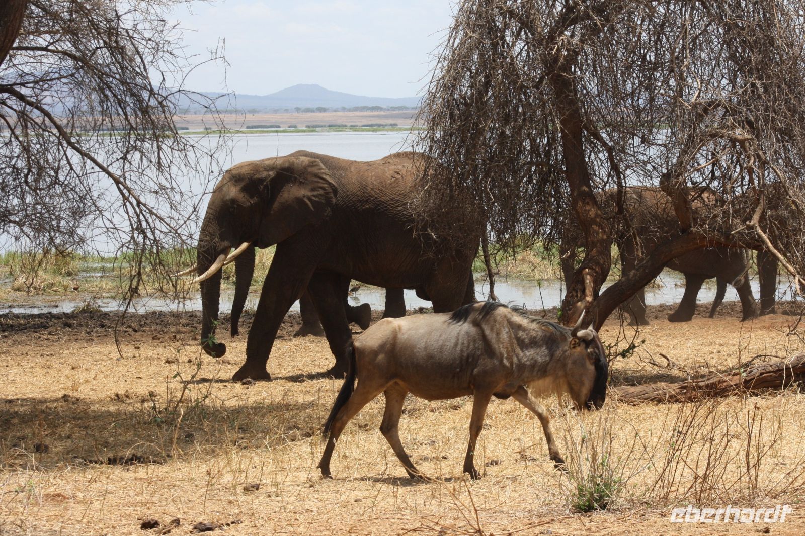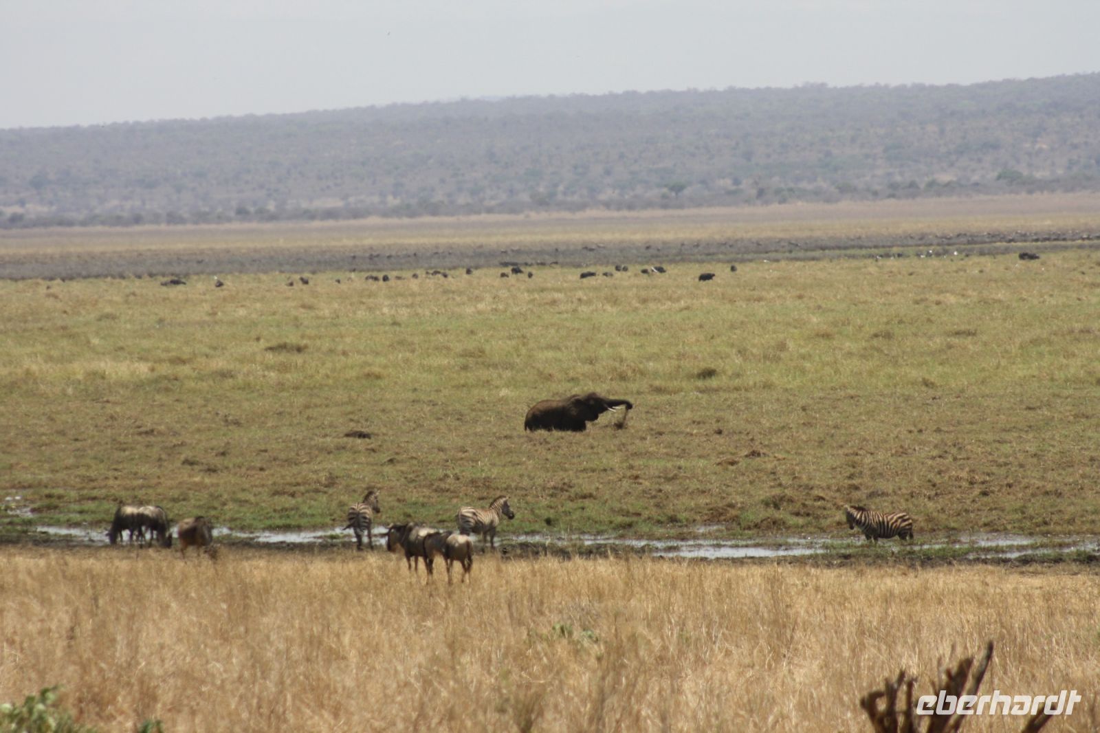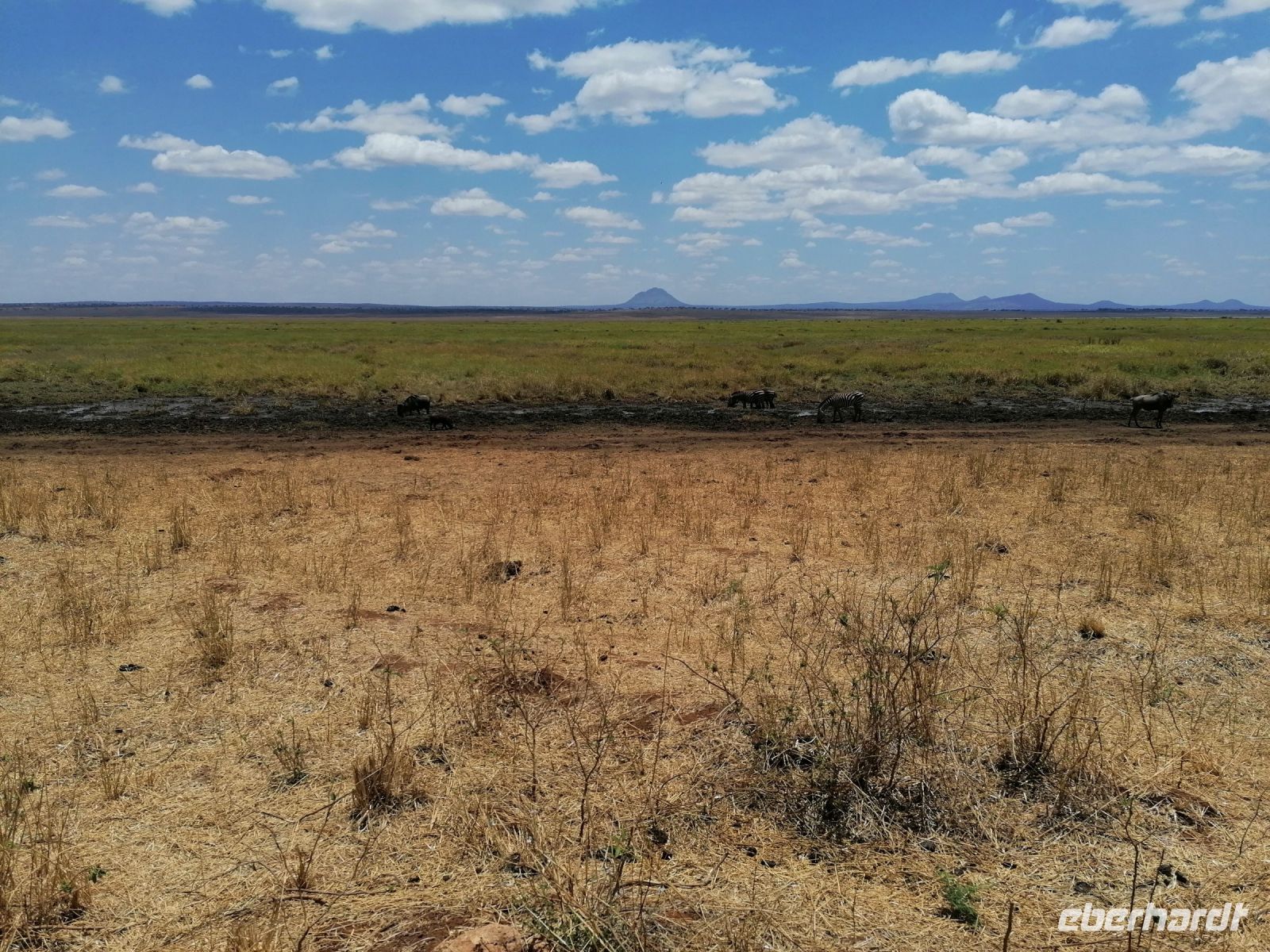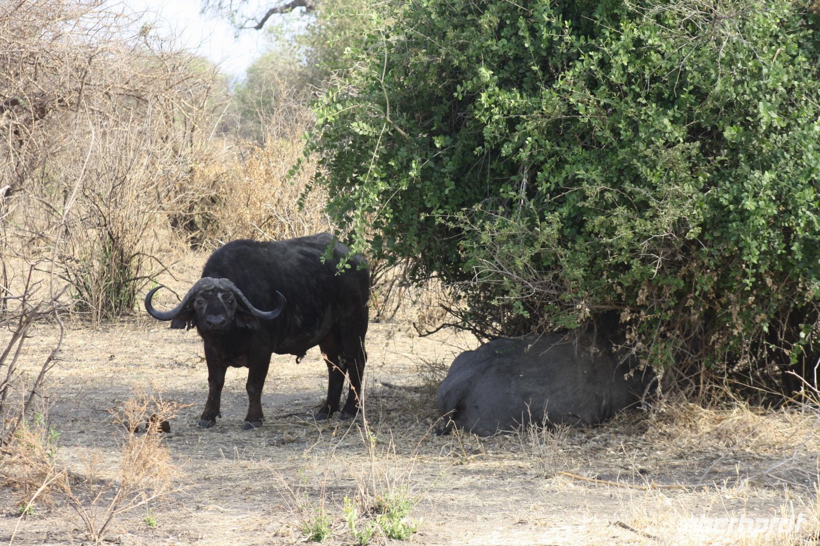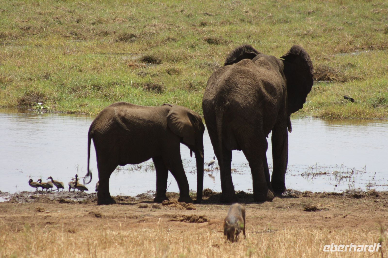 Bei unserem leckeren Frühstück auf der Beobachtungsterrasse konnten wir bereits zum Frühstück Giraffen, Impalas, Elefanten und Warzenschweine entdecken. Gegen 8 Uhr starteten wir in Richtung Sumpfgebiet. Unterwegs begegneten wir bereits Elefanten, Giraffen, Dikdiks und einen Quackvogel. Unter einem Baum erblickten wir drei alte Büffel, die sich gegenseitig vor Feinden schützten. Plötzlich spazierten Elefanten nah an unserem Jeep vorbei. Die Elefanten wollten genau wie wir in Richtung Sumpfgebiet. Das Gebiet ist ein Paradies für die heimische Tierwelt, da der Sumpf niemals austrocknet und ganzjährige das Tier und auch die Pflanzenwelt versorgt. Während wir die Elefanten fotografierten, bemerkten wir einen üblen Geruch. Direkt neben uns knapperten Geier an einem toten Gnu. Riesige Zebra Herden spazierten an uns vorbei und an einem kleinen Wasserloch badeten Impalas, Warzenschweine, Zebras und Gelbschnabelstörche gemeinsam. Kurz bevor wir das Sumpfgebiet erreichten, wartete eine große Büffelherde auf uns, die sich auf Wanderung begaben. Endlich erreichten wir das grüne Sumpfgebiet. Immer wieder zogen Elefantenherden und uns vorbei. Ihr Ziel war der Sumpf, wo sie baden und mit den kleinen Elefanten toben konnten. Neben einer Vielzahl an Gnus und Zebras, konnten wir über 100te Elefanten zählen. Ein absoluter Wahnsinn. Entlang des grünen Streifens konnten wir zudem Büffel und die hiesige Vogelwelt bestaunen. Wir erspähten einen Hagedasch-Vogel, Pelikane, Reihenreiher, pfeifende Enten, Eisvögel, Flamingos, Geier und ein Adler. Unsere Mittagspause konnten wir inmitten des Sumpfgebietes einnehmen und Karim versorgte uns mit Reis, Nudeln und Hühnchen. Nach der leckeren Mittagspause fuhren wir weiter zum Westen des Sumpfgebietes. Hier trafen wir wieder auf die drei Elefanten Bullen, die vermutlich den Weibchen hinterherliefen. Immer wieder konnten wir in der Ferne Elefanten baden sehen. Neben einen Sattelstorch konnten wir auch den Sekretär-Vogel entdecken, der durch die Gegend spazierte. Wir waren vollkommen fasziniert von der Vielfalt der verschiedenen Arten und die Vielzahl der Tiere. Leider mussten wir uns langsam von der Sumpflandschaft verabschieden. Eine weitere Herde von etwa 20 Elefanten und Kudos schlenderten an uns vorbei. Unterwegs konnten wir im Dreck wälzende Zebras sehen und ein sich juckender Elefant sorgte für Erheiterung. Ein wunderschöner Tag neigte sich nun dem Ende entgegen und wir ließen den Tag bei einem gemeinsam "Feierabendbier" in der Lodge ausklingen.