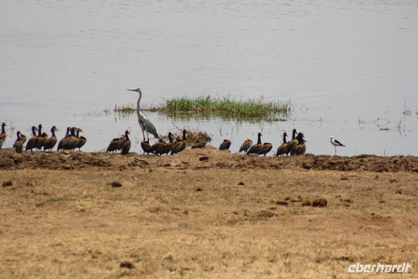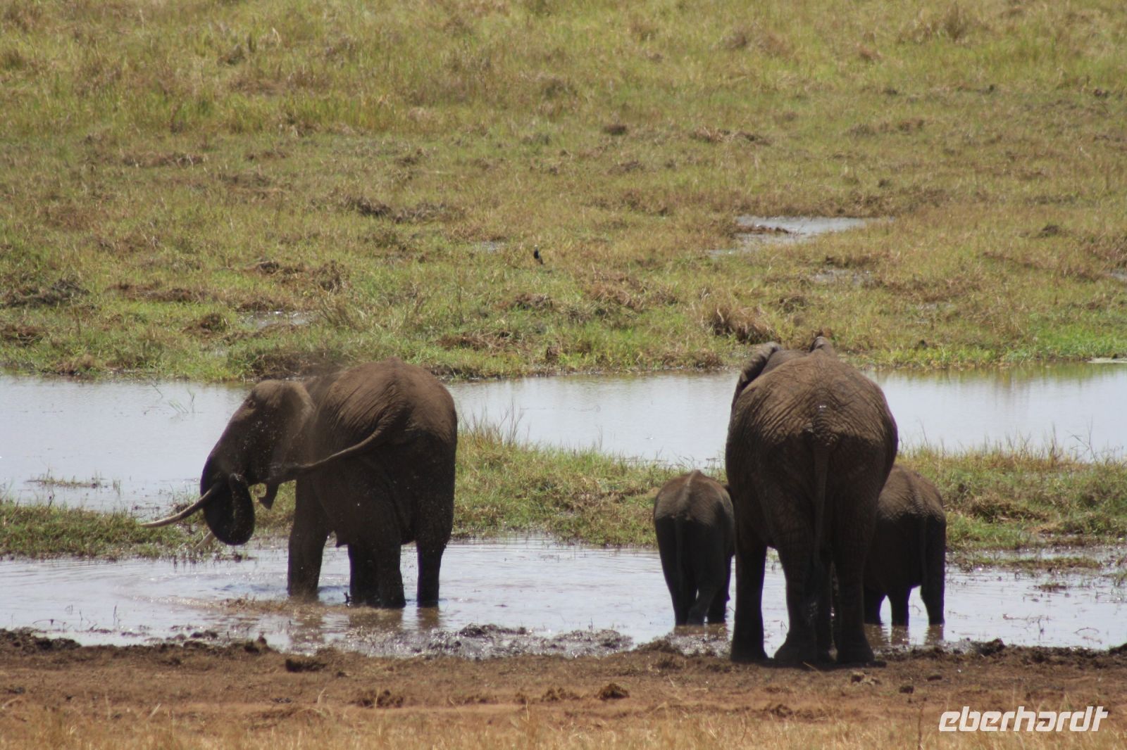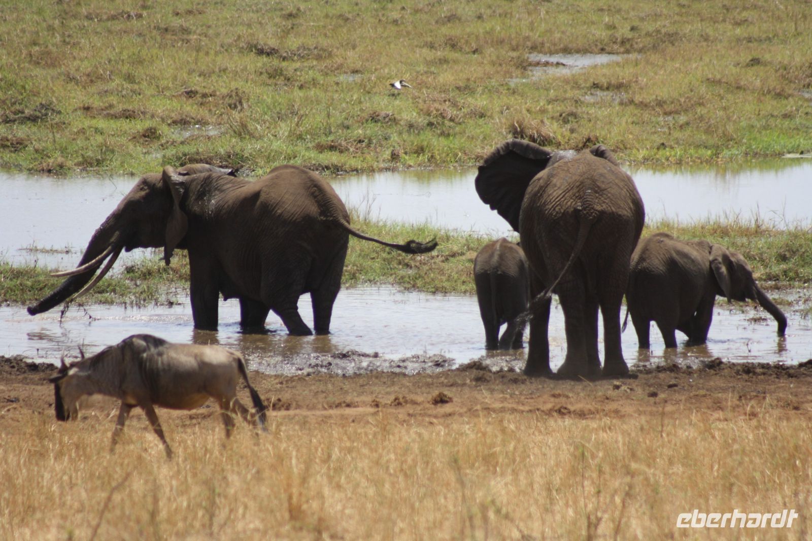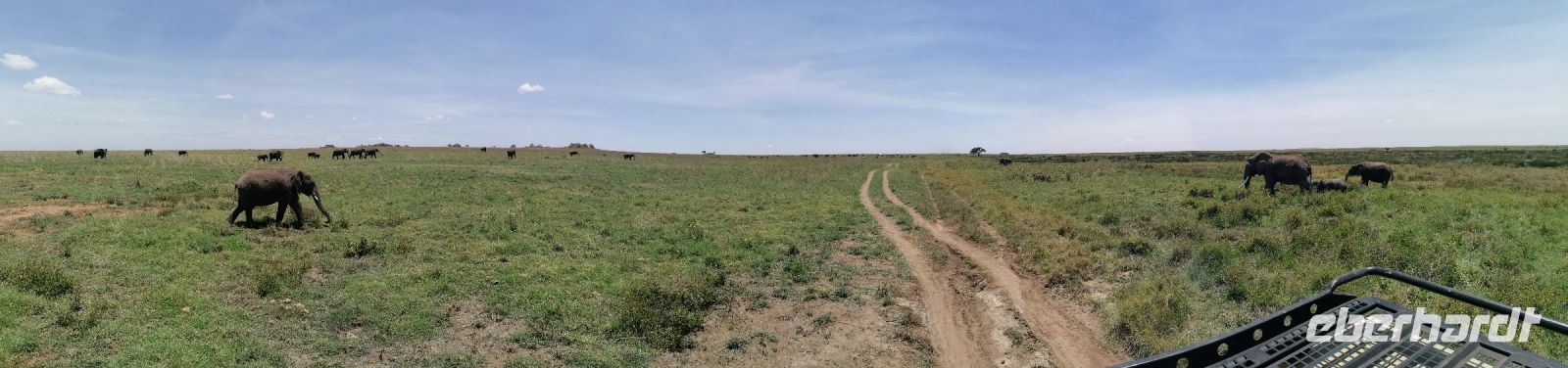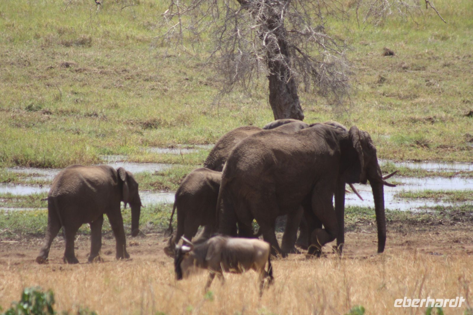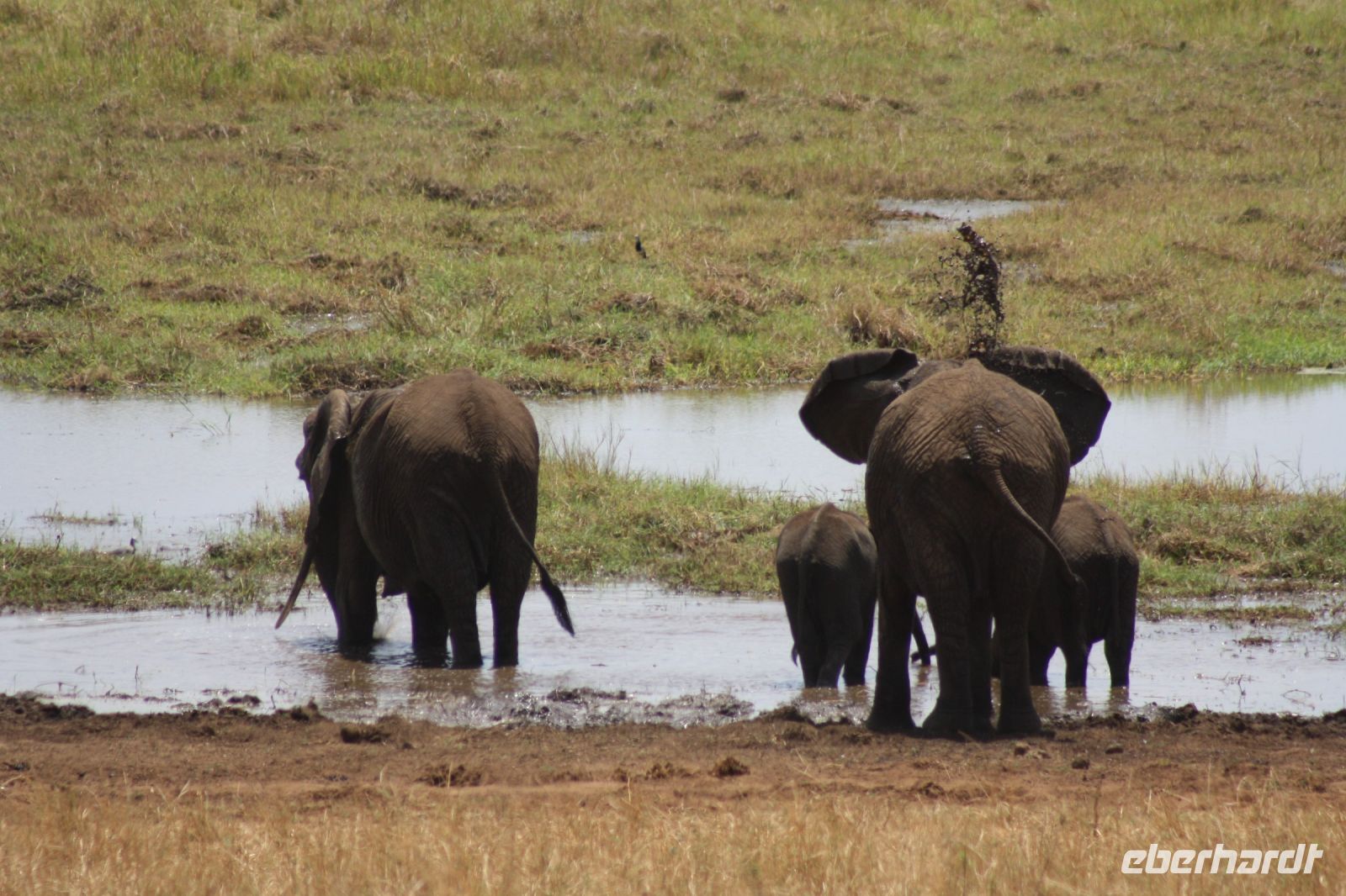 Bei unserem leckeren Frühstück auf der Beobachtungsterrasse konnten wir bereits zum Frühstück Giraffen, Impalas, Elefanten und Warzenschweine entdecken. Gegen 8 Uhr starteten wir in Richtung Sumpfgebiet. Unterwegs begegneten wir bereits Elefanten, Giraffen, Dikdiks und einen Quackvogel. Unter einem Baum erblickten wir drei alte Büffel, die sich gegenseitig vor Feinden schützten. Plötzlich spazierten Elefanten nah an unserem Jeep vorbei. Die Elefanten wollten genau wie wir in Richtung Sumpfgebiet. Das Gebiet ist ein Paradies für die heimische Tierwelt, da der Sumpf niemals austrocknet und ganzjährige das Tier und auch die Pflanzenwelt versorgt. Während wir die Elefanten fotografierten, bemerkten wir einen üblen Geruch. Direkt neben uns knapperten Geier an einem toten Gnu. Riesige Zebra Herden spazierten an uns vorbei und an einem kleinen Wasserloch badeten Impalas, Warzenschweine, Zebras und Gelbschnabelstörche gemeinsam. Kurz bevor wir das Sumpfgebiet erreichten, wartete eine große Büffelherde auf uns, die sich auf Wanderung begaben. Endlich erreichten wir das grüne Sumpfgebiet. Immer wieder zogen Elefantenherden und uns vorbei. Ihr Ziel war der Sumpf, wo sie baden und mit den kleinen Elefanten toben konnten. Neben einer Vielzahl an Gnus und Zebras, konnten wir über 100te Elefanten zählen. Ein absoluter Wahnsinn. Entlang des grünen Streifens konnten wir zudem Büffel und die hiesige Vogelwelt bestaunen. Wir erspähten einen Hagedasch-Vogel, Pelikane, Reihenreiher, pfeifende Enten, Eisvögel, Flamingos, Geier und ein Adler. Unsere Mittagspause konnten wir inmitten des Sumpfgebietes einnehmen und Karim versorgte uns mit Reis, Nudeln und Hühnchen. Nach der leckeren Mittagspause fuhren wir weiter zum Westen des Sumpfgebietes. Hier trafen wir wieder auf die drei Elefanten Bullen, die vermutlich den Weibchen hinterherliefen. Immer wieder konnten wir in der Ferne Elefanten baden sehen. Neben einen Sattelstorch konnten wir auch den Sekretär-Vogel entdecken, der durch die Gegend spazierte. Wir waren vollkommen fasziniert von der Vielfalt der verschiedenen Arten und die Vielzahl der Tiere. Leider mussten wir uns langsam von der Sumpflandschaft verabschieden. Eine weitere Herde von etwa 20 Elefanten und Kudos schlenderten an uns vorbei. Unterwegs konnten wir im Dreck wälzende Zebras sehen und ein sich juckender Elefant sorgte für Erheiterung. Ein wunderschöner Tag neigte sich nun dem Ende entgegen und wir ließen den Tag bei einem gemeinsam "Feierabendbier" in der Lodge ausklingen.