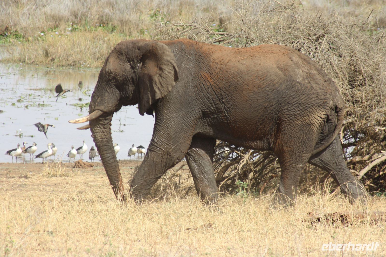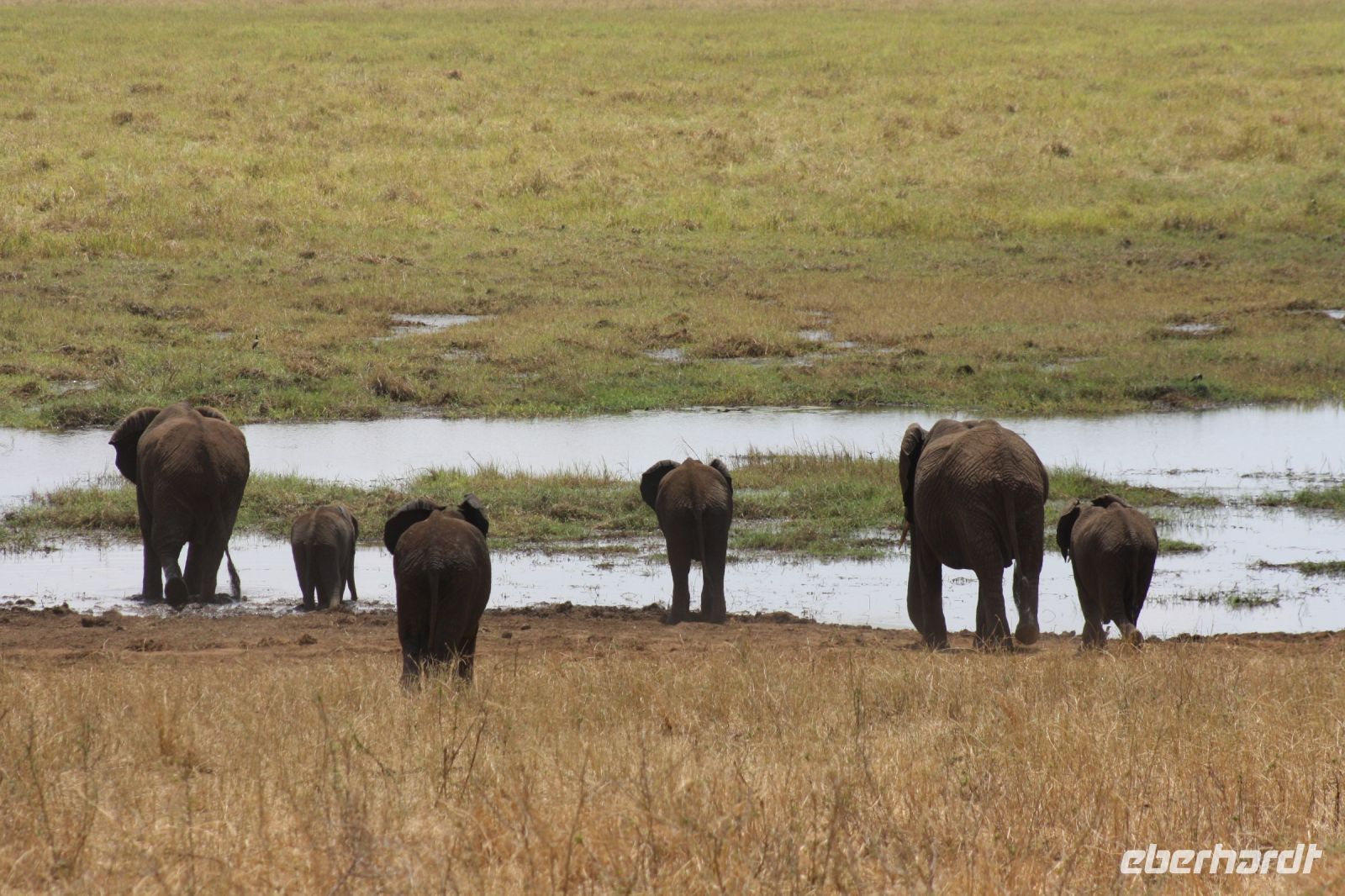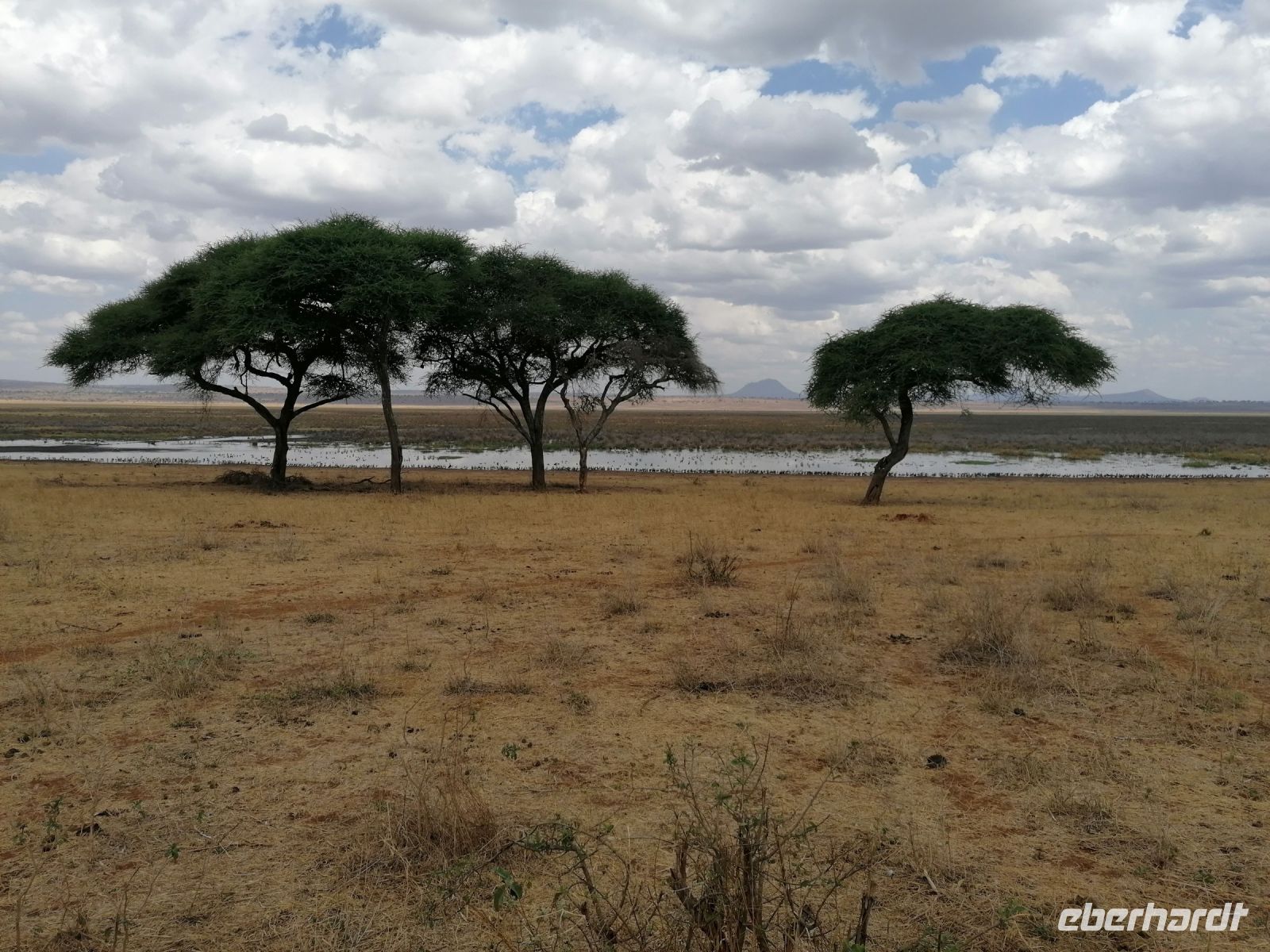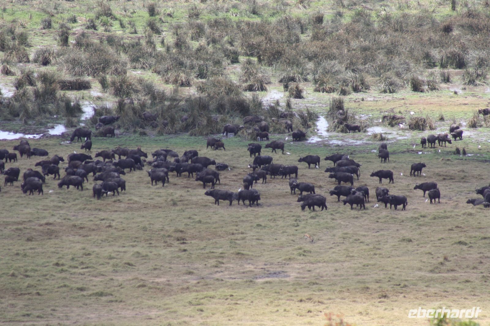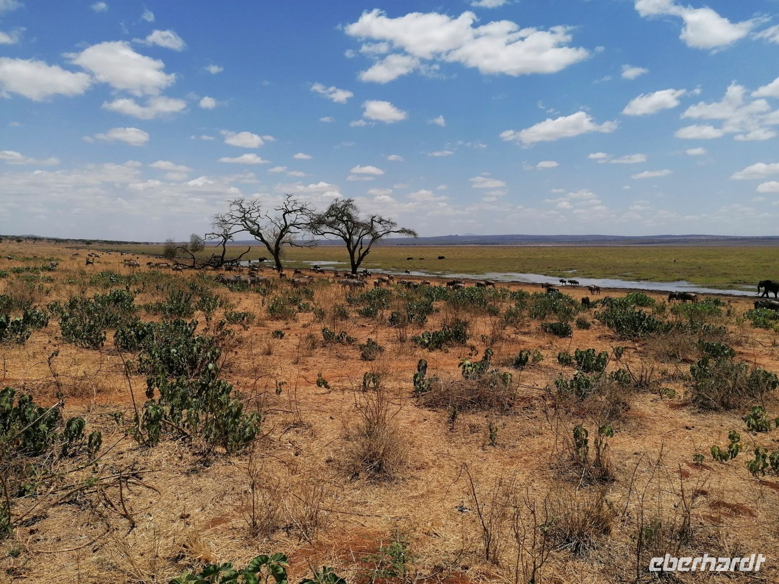 Bei unserem leckeren Frühstück auf der Beobachtungsterrasse konnten wir bereits zum Frühstück Giraffen, Impalas, Elefanten und Warzenschweine entdecken. Gegen 8 Uhr starteten wir in Richtung Sumpfgebiet. Unterwegs begegneten wir bereits Elefanten, Giraffen, Dikdiks und einen Quackvogel. Unter einem Baum erblickten wir drei alte Büffel, die sich gegenseitig vor Feinden schützten. Plötzlich spazierten Elefanten nah an unserem Jeep vorbei. Die Elefanten wollten genau wie wir in Richtung Sumpfgebiet. Das Gebiet ist ein Paradies für die heimische Tierwelt, da der Sumpf niemals austrocknet und ganzjährige das Tier und auch die Pflanzenwelt versorgt. Während wir die Elefanten fotografierten, bemerkten wir einen üblen Geruch. Direkt neben uns knapperten Geier an einem toten Gnu. Riesige Zebra Herden spazierten an uns vorbei und an einem kleinen Wasserloch badeten Impalas, Warzenschweine, Zebras und Gelbschnabelstörche gemeinsam. Kurz bevor wir das Sumpfgebiet erreichten, wartete eine große Büffelherde auf uns, die sich auf Wanderung begaben. Endlich erreichten wir das grüne Sumpfgebiet. Immer wieder zogen Elefantenherden und uns vorbei. Ihr Ziel war der Sumpf, wo sie baden und mit den kleinen Elefanten toben konnten. Neben einer Vielzahl an Gnus und Zebras, konnten wir über 100te Elefanten zählen. Ein absoluter Wahnsinn. Entlang des grünen Streifens konnten wir zudem Büffel und die hiesige Vogelwelt bestaunen. Wir erspähten einen Hagedasch-Vogel, Pelikane, Reihenreiher, pfeifende Enten, Eisvögel, Flamingos, Geier und ein Adler. Unsere Mittagspause konnten wir inmitten des Sumpfgebietes einnehmen und Karim versorgte uns mit Reis, Nudeln und Hühnchen. Nach der leckeren Mittagspause fuhren wir weiter zum Westen des Sumpfgebietes. Hier trafen wir wieder auf die drei Elefanten Bullen, die vermutlich den Weibchen hinterherliefen. Immer wieder konnten wir in der Ferne Elefanten baden sehen. Neben einen Sattelstorch konnten wir auch den Sekretär-Vogel entdecken, der durch die Gegend spazierte. Wir waren vollkommen fasziniert von der Vielfalt der verschiedenen Arten und die Vielzahl der Tiere. Leider mussten wir uns langsam von der Sumpflandschaft verabschieden. Eine weitere Herde von etwa 20 Elefanten und Kudos schlenderten an uns vorbei. Unterwegs konnten wir im Dreck wälzende Zebras sehen und ein sich juckender Elefant sorgte für Erheiterung. Ein wunderschöner Tag neigte sich nun dem Ende entgegen und wir ließen den Tag bei einem gemeinsam "Feierabendbier" in der Lodge ausklingen.