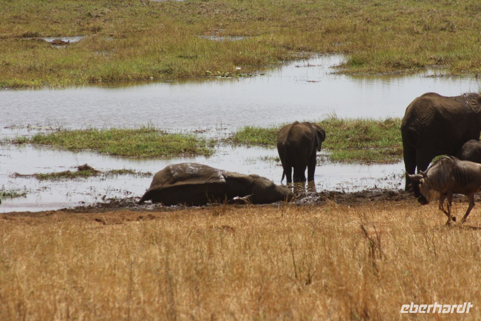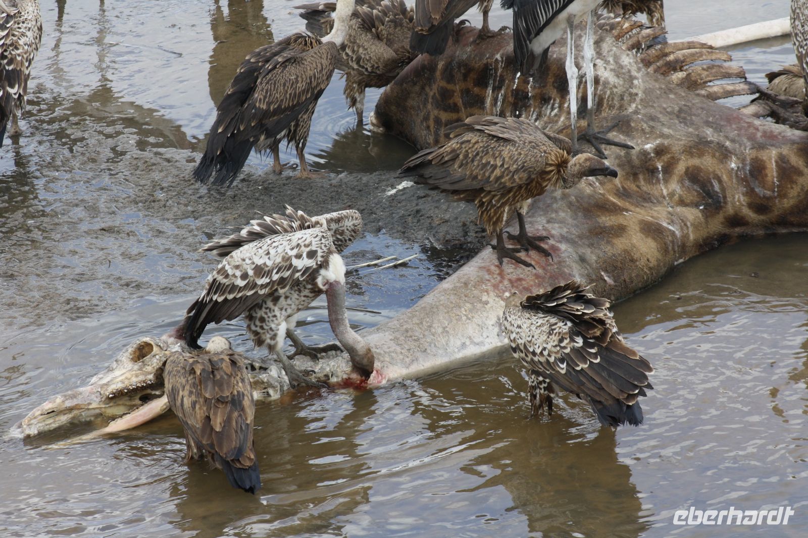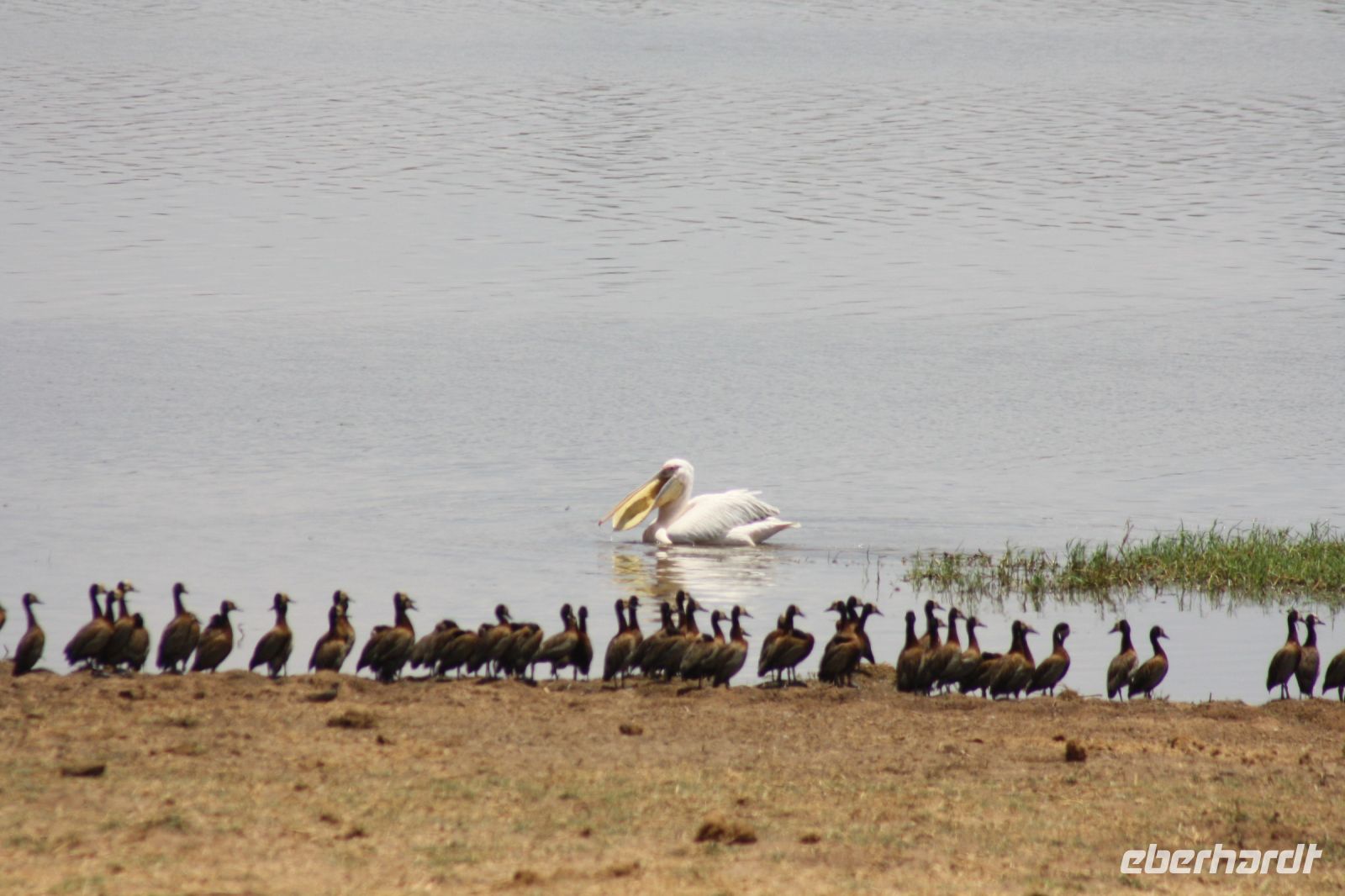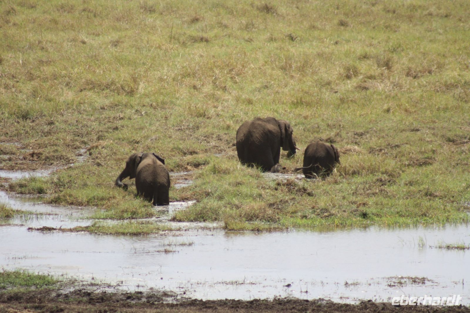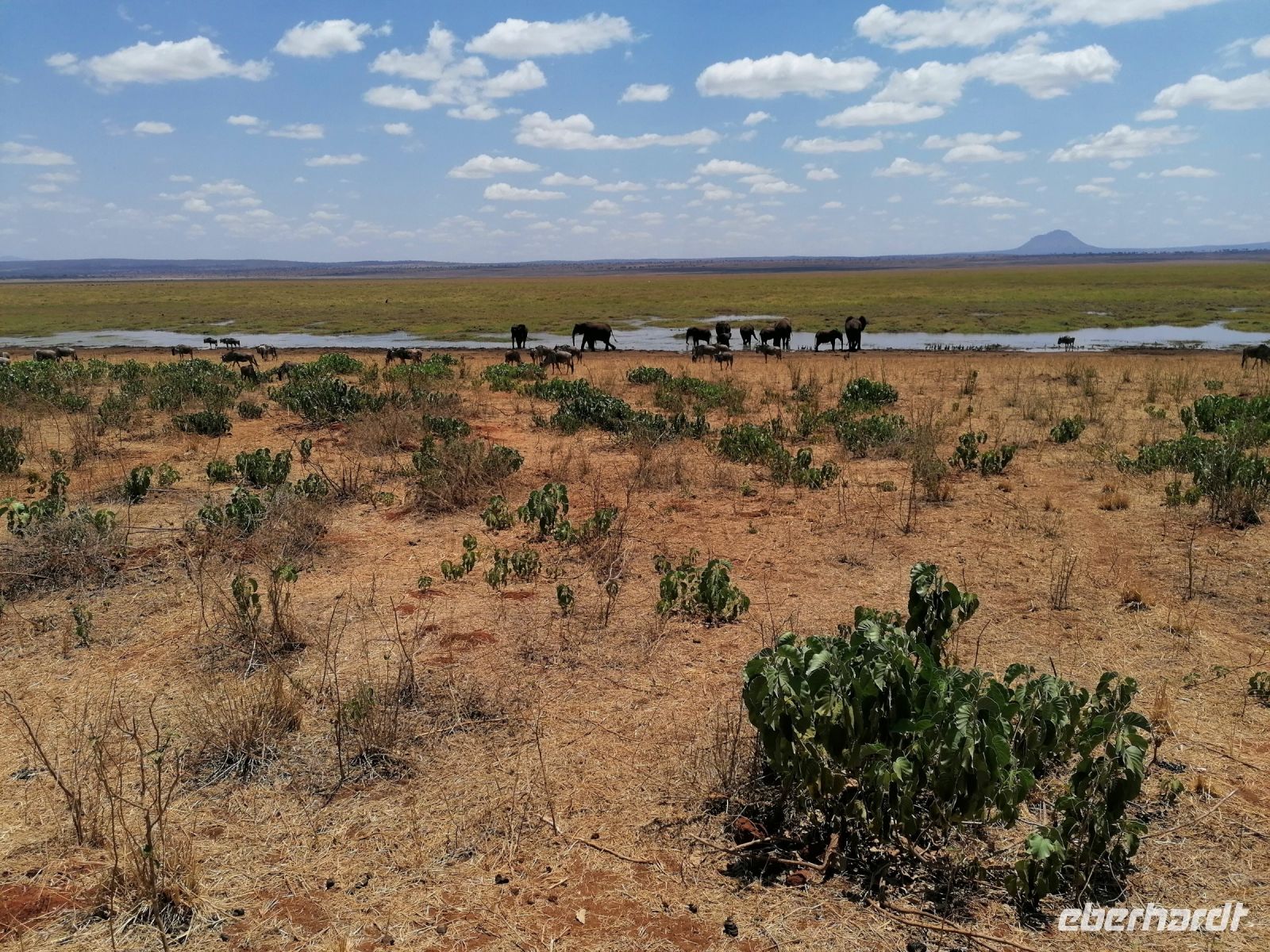 Bei unserem leckeren Frühstück auf der Beobachtungsterrasse konnten wir bereits zum Frühstück Giraffen, Impalas, Elefanten und Warzenschweine entdecken. Gegen 8 Uhr starteten wir in Richtung Sumpfgebiet. Unterwegs begegneten wir bereits Elefanten, Giraffen, Dikdiks und einen Quackvogel. Unter einem Baum erblickten wir drei alte Büffel, die sich gegenseitig vor Feinden schützten. Plötzlich spazierten Elefanten nah an unserem Jeep vorbei. Die Elefanten wollten genau wie wir in Richtung Sumpfgebiet. Das Gebiet ist ein Paradies für die heimische Tierwelt, da der Sumpf niemals austrocknet und ganzjährige das Tier und auch die Pflanzenwelt versorgt. Während wir die Elefanten fotografierten, bemerkten wir einen üblen Geruch. Direkt neben uns knapperten Geier an einem toten Gnu. Riesige Zebra Herden spazierten an uns vorbei und an einem kleinen Wasserloch badeten Impalas, Warzenschweine, Zebras und Gelbschnabelstörche gemeinsam. Kurz bevor wir das Sumpfgebiet erreichten, wartete eine große Büffelherde auf uns, die sich auf Wanderung begaben. Endlich erreichten wir das grüne Sumpfgebiet. Immer wieder zogen Elefantenherden und uns vorbei. Ihr Ziel war der Sumpf, wo sie baden und mit den kleinen Elefanten toben konnten. Neben einer Vielzahl an Gnus und Zebras, konnten wir über 100te Elefanten zählen. Ein absoluter Wahnsinn. Entlang des grünen Streifens konnten wir zudem Büffel und die hiesige Vogelwelt bestaunen. Wir erspähten einen Hagedasch-Vogel, Pelikane, Reihenreiher, pfeifende Enten, Eisvögel, Flamingos, Geier und ein Adler. Unsere Mittagspause konnten wir inmitten des Sumpfgebietes einnehmen und Karim versorgte uns mit Reis, Nudeln und Hühnchen. Nach der leckeren Mittagspause fuhren wir weiter zum Westen des Sumpfgebietes. Hier trafen wir wieder auf die drei Elefanten Bullen, die vermutlich den Weibchen hinterherliefen. Immer wieder konnten wir in der Ferne Elefanten baden sehen. Neben einen Sattelstorch konnten wir auch den Sekretär-Vogel entdecken, der durch die Gegend spazierte. Wir waren vollkommen fasziniert von der Vielfalt der verschiedenen Arten und die Vielzahl der Tiere. Leider mussten wir uns langsam von der Sumpflandschaft verabschieden. Eine weitere Herde von etwa 20 Elefanten und Kudos schlenderten an uns vorbei. Unterwegs konnten wir im Dreck wälzende Zebras sehen und ein sich juckender Elefant sorgte für Erheiterung. Ein wunderschöner Tag neigte sich nun dem Ende entgegen und wir ließen den Tag bei einem gemeinsam "Feierabendbier" in der Lodge ausklingen.