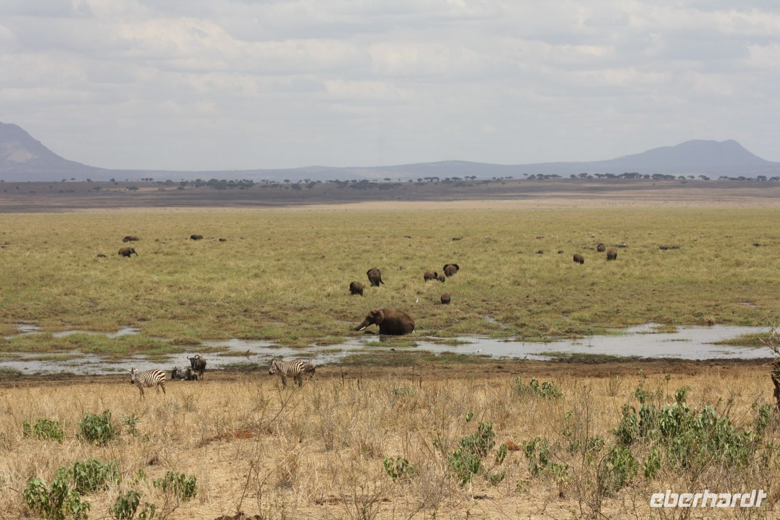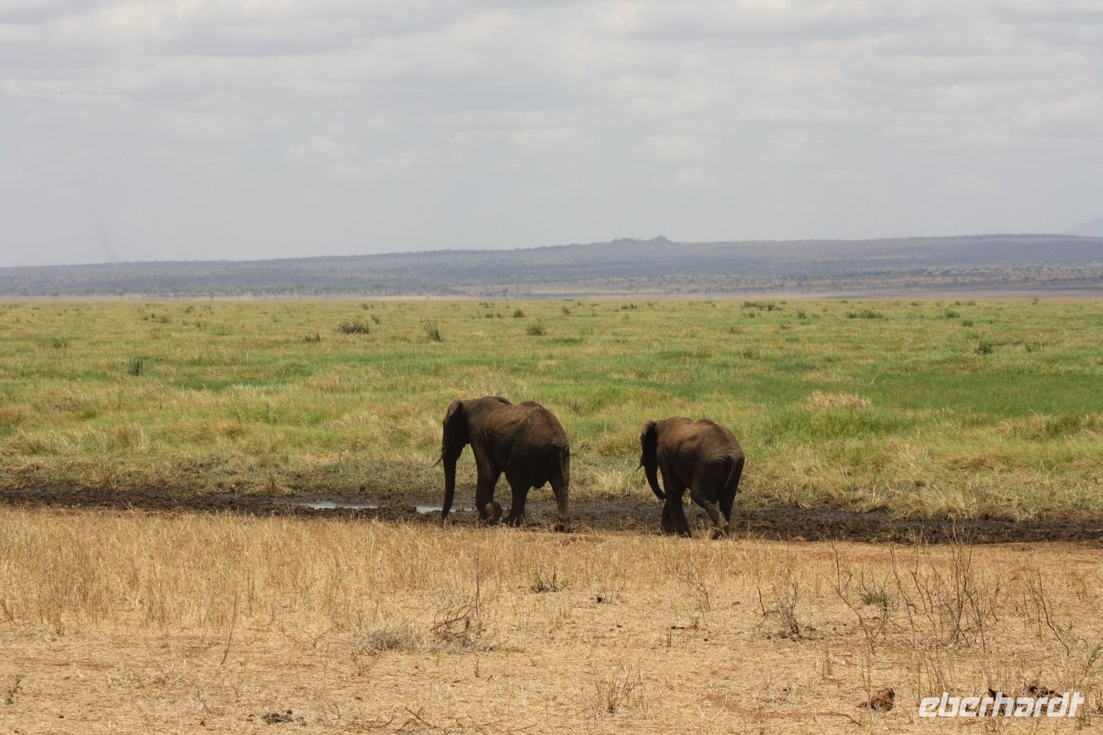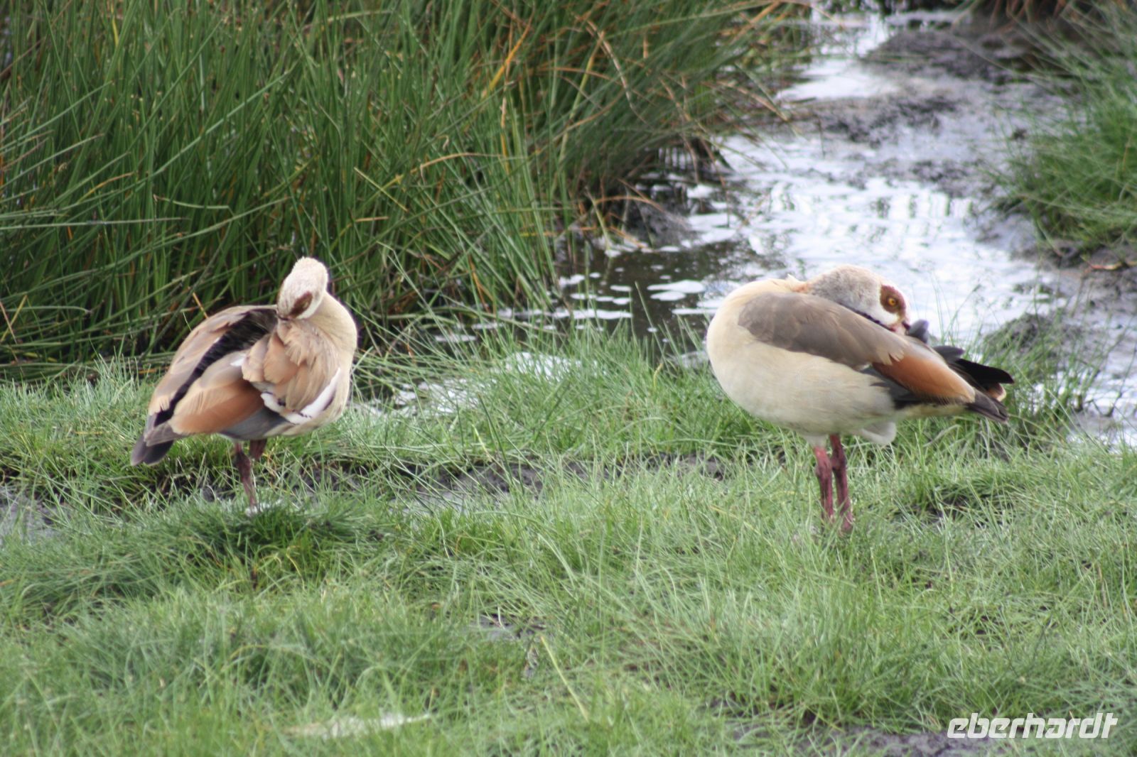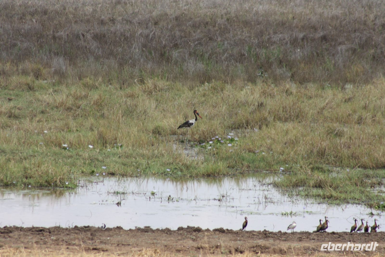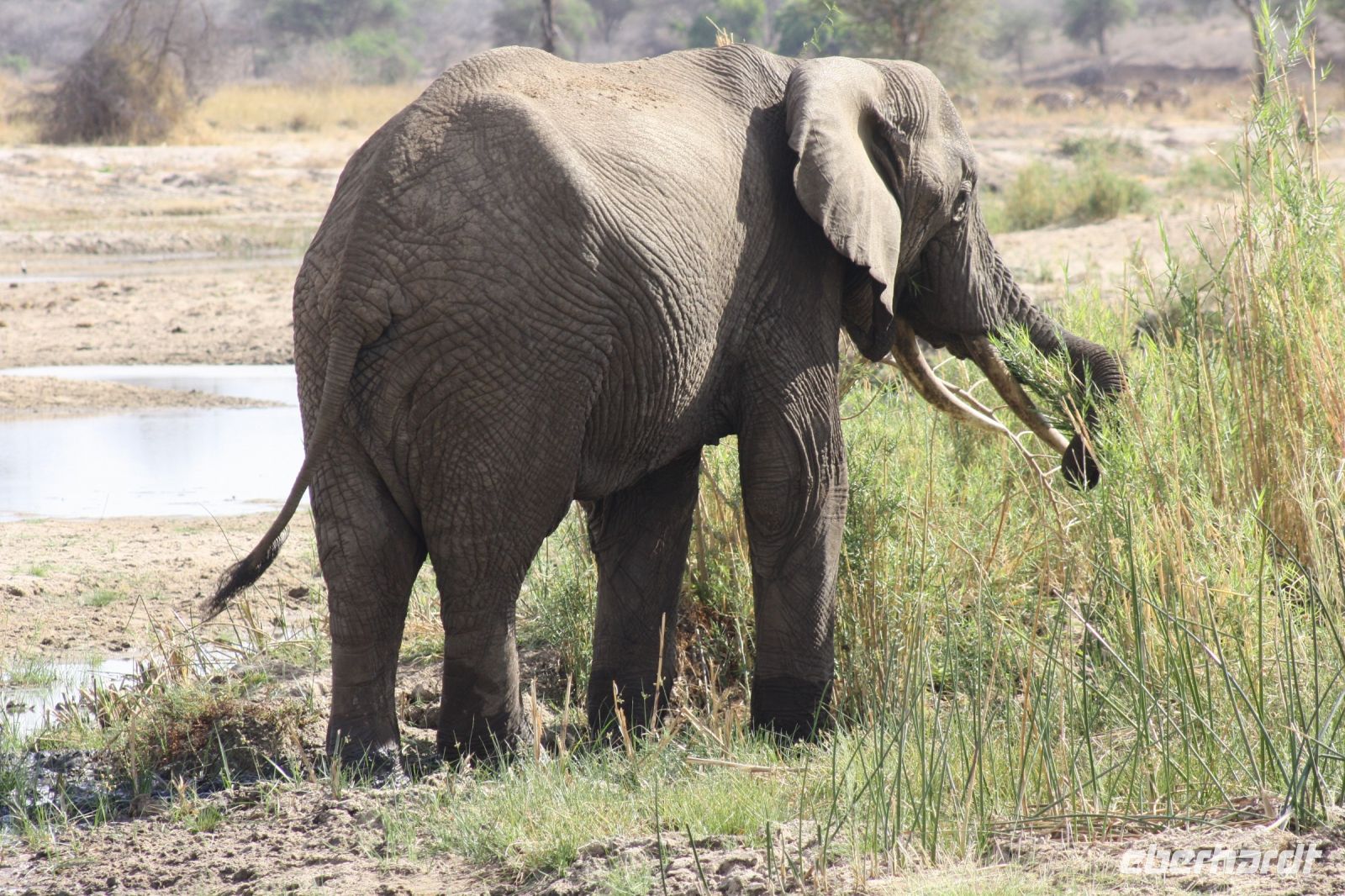 Bei unserem leckeren Frühstück auf der Beobachtungsterrasse konnten wir bereits zum Frühstück Giraffen, Impalas, Elefanten und Warzenschweine entdecken. Gegen 8 Uhr starteten wir in Richtung Sumpfgebiet. Unterwegs begegneten wir bereits Elefanten, Giraffen, Dikdiks und einen Quackvogel. Unter einem Baum erblickten wir drei alte Büffel, die sich gegenseitig vor Feinden schützten. Plötzlich spazierten Elefanten nah an unserem Jeep vorbei. Die Elefanten wollten genau wie wir in Richtung Sumpfgebiet. Das Gebiet ist ein Paradies für die heimische Tierwelt, da der Sumpf niemals austrocknet und ganzjährige das Tier und auch die Pflanzenwelt versorgt. Während wir die Elefanten fotografierten, bemerkten wir einen üblen Geruch. Direkt neben uns knapperten Geier an einem toten Gnu. Riesige Zebra Herden spazierten an uns vorbei und an einem kleinen Wasserloch badeten Impalas, Warzenschweine, Zebras und Gelbschnabelstörche gemeinsam. Kurz bevor wir das Sumpfgebiet erreichten, wartete eine große Büffelherde auf uns, die sich auf Wanderung begaben. Endlich erreichten wir das grüne Sumpfgebiet. Immer wieder zogen Elefantenherden und uns vorbei. Ihr Ziel war der Sumpf, wo sie baden und mit den kleinen Elefanten toben konnten. Neben einer Vielzahl an Gnus und Zebras, konnten wir über 100te Elefanten zählen. Ein absoluter Wahnsinn. Entlang des grünen Streifens konnten wir zudem Büffel und die hiesige Vogelwelt bestaunen. Wir erspähten einen Hagedasch-Vogel, Pelikane, Reihenreiher, pfeifende Enten, Eisvögel, Flamingos, Geier und ein Adler. Unsere Mittagspause konnten wir inmitten des Sumpfgebietes einnehmen und Karim versorgte uns mit Reis, Nudeln und Hühnchen. Nach der leckeren Mittagspause fuhren wir weiter zum Westen des Sumpfgebietes. Hier trafen wir wieder auf die drei Elefanten Bullen, die vermutlich den Weibchen hinterherliefen. Immer wieder konnten wir in der Ferne Elefanten baden sehen. Neben einen Sattelstorch konnten wir auch den Sekretär-Vogel entdecken, der durch die Gegend spazierte. Wir waren vollkommen fasziniert von der Vielfalt der verschiedenen Arten und die Vielzahl der Tiere. Leider mussten wir uns langsam von der Sumpflandschaft verabschieden. Eine weitere Herde von etwa 20 Elefanten und Kudos schlenderten an uns vorbei. Unterwegs konnten wir im Dreck wälzende Zebras sehen und ein sich juckender Elefant sorgte für Erheiterung. Ein wunderschöner Tag neigte sich nun dem Ende entgegen und wir ließen den Tag bei einem gemeinsam "Feierabendbier" in der Lodge ausklingen.