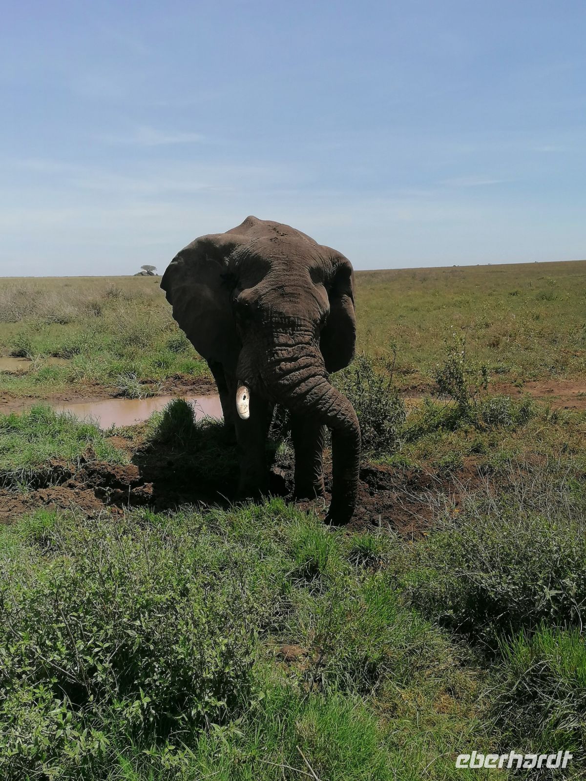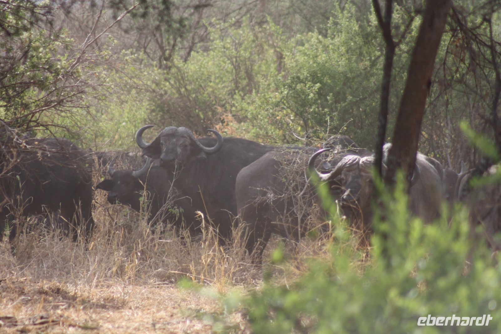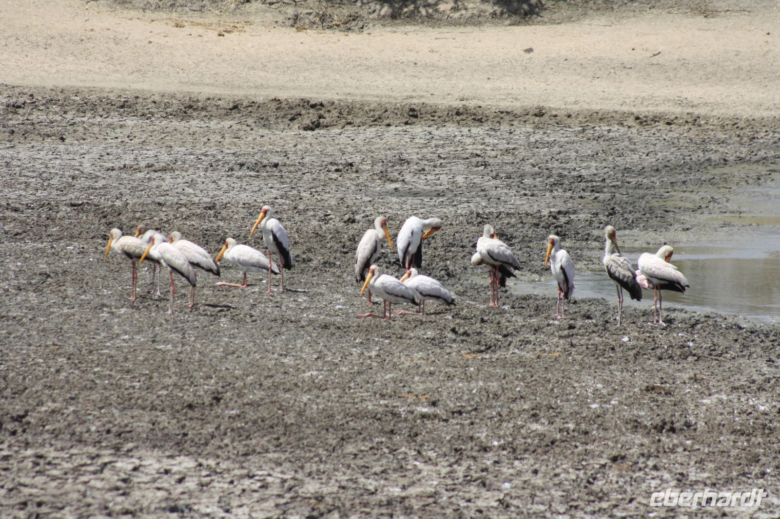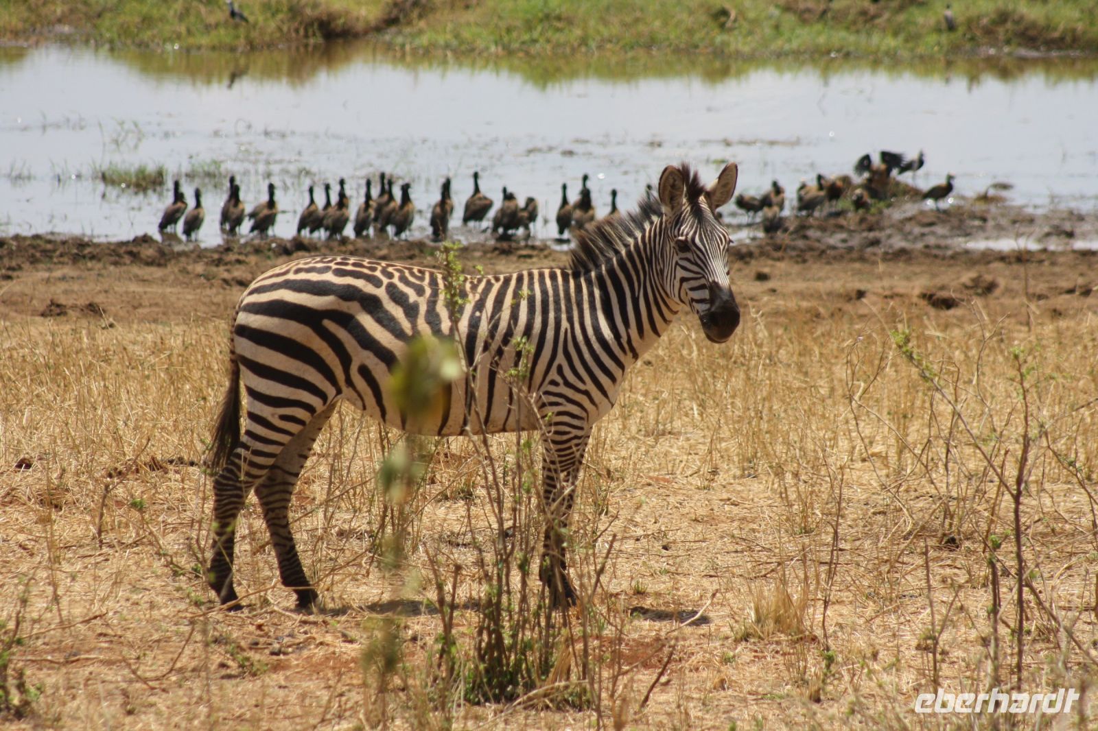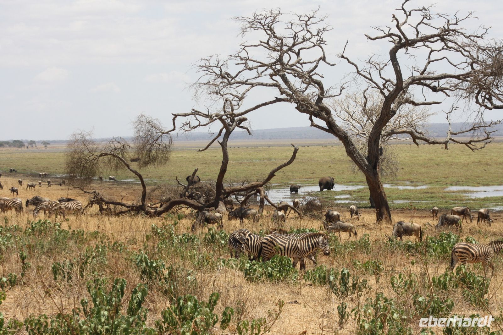 Bei unserem leckeren Frühstück auf der Beobachtungsterrasse konnten wir bereits zum Frühstück Giraffen, Impalas, Elefanten und Warzenschweine entdecken. Gegen 8 Uhr starteten wir in Richtung Sumpfgebiet. Unterwegs begegneten wir bereits Elefanten, Giraffen, Dikdiks und einen Quackvogel. Unter einem Baum erblickten wir drei alte Büffel, die sich gegenseitig vor Feinden schützten. Plötzlich spazierten Elefanten nah an unserem Jeep vorbei. Die Elefanten wollten genau wie wir in Richtung Sumpfgebiet. Das Gebiet ist ein Paradies für die heimische Tierwelt, da der Sumpf niemals austrocknet und ganzjährige das Tier und auch die Pflanzenwelt versorgt. Während wir die Elefanten fotografierten, bemerkten wir einen üblen Geruch. Direkt neben uns knapperten Geier an einem toten Gnu. Riesige Zebra Herden spazierten an uns vorbei und an einem kleinen Wasserloch badeten Impalas, Warzenschweine, Zebras und Gelbschnabelstörche gemeinsam. Kurz bevor wir das Sumpfgebiet erreichten, wartete eine große Büffelherde auf uns, die sich auf Wanderung begaben. Endlich erreichten wir das grüne Sumpfgebiet. Immer wieder zogen Elefantenherden und uns vorbei. Ihr Ziel war der Sumpf, wo sie baden und mit den kleinen Elefanten toben konnten. Neben einer Vielzahl an Gnus und Zebras, konnten wir über 100te Elefanten zählen. Ein absoluter Wahnsinn. Entlang des grünen Streifens konnten wir zudem Büffel und die hiesige Vogelwelt bestaunen. Wir erspähten einen Hagedasch-Vogel, Pelikane, Reihenreiher, pfeifende Enten, Eisvögel, Flamingos, Geier und ein Adler. Unsere Mittagspause konnten wir inmitten des Sumpfgebietes einnehmen und Karim versorgte uns mit Reis, Nudeln und Hühnchen. Nach der leckeren Mittagspause fuhren wir weiter zum Westen des Sumpfgebietes. Hier trafen wir wieder auf die drei Elefanten Bullen, die vermutlich den Weibchen hinterherliefen. Immer wieder konnten wir in der Ferne Elefanten baden sehen. Neben einen Sattelstorch konnten wir auch den Sekretär-Vogel entdecken, der durch die Gegend spazierte. Wir waren vollkommen fasziniert von der Vielfalt der verschiedenen Arten und die Vielzahl der Tiere. Leider mussten wir uns langsam von der Sumpflandschaft verabschieden. Eine weitere Herde von etwa 20 Elefanten und Kudos schlenderten an uns vorbei. Unterwegs konnten wir im Dreck wälzende Zebras sehen und ein sich juckender Elefant sorgte für Erheiterung. Ein wunderschöner Tag neigte sich nun dem Ende entgegen und wir ließen den Tag bei einem gemeinsam "Feierabendbier" in der Lodge ausklingen.