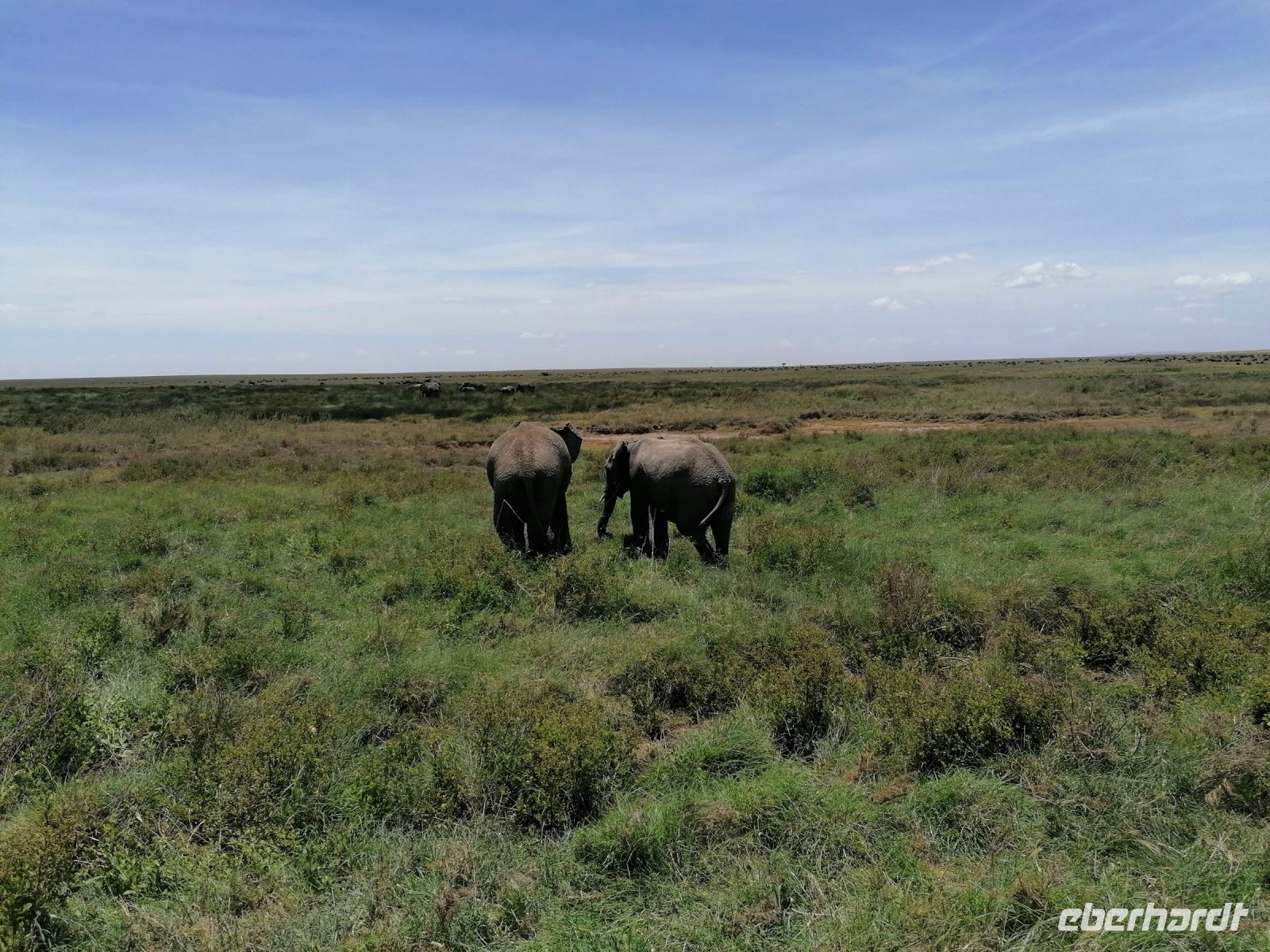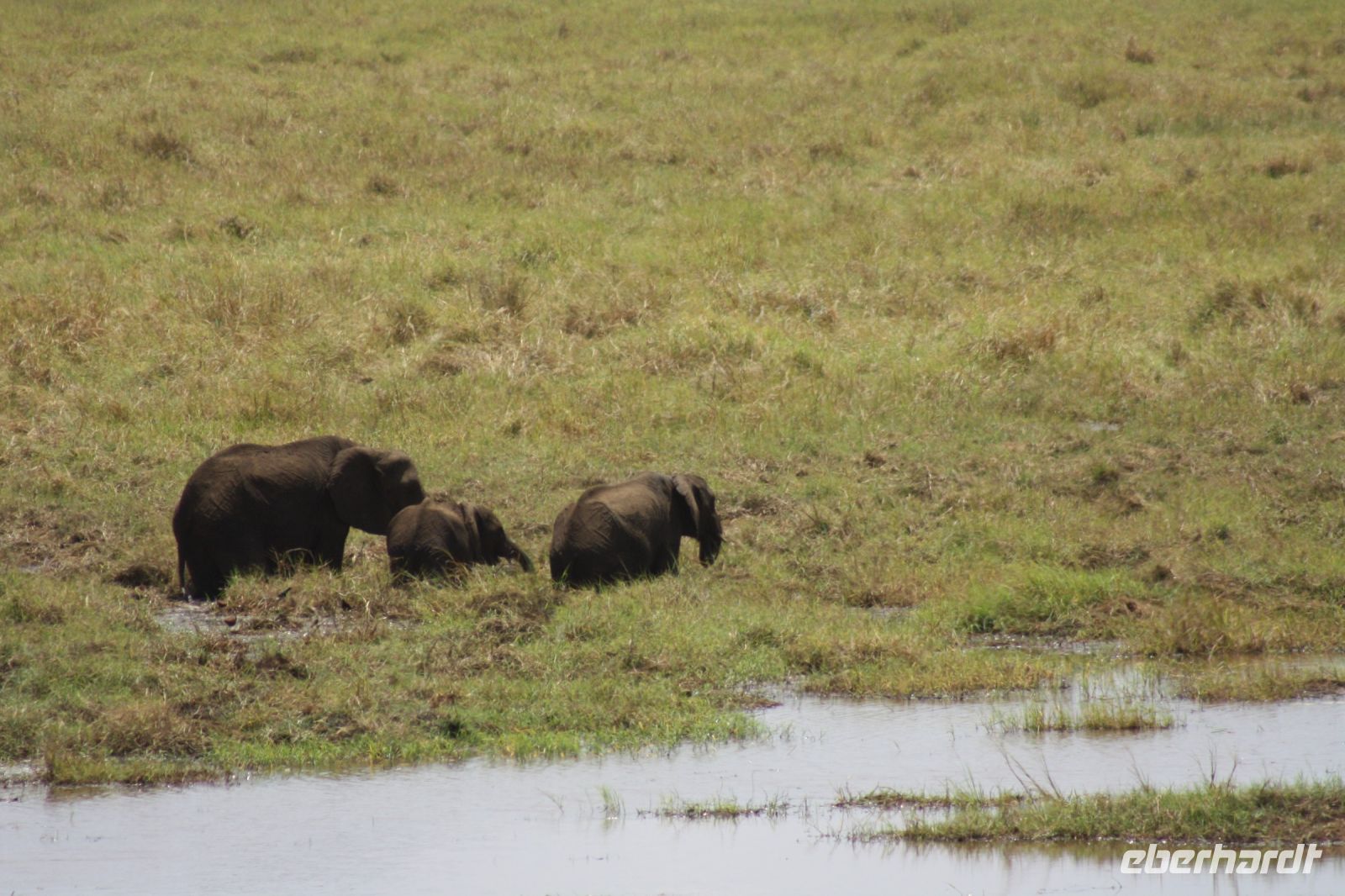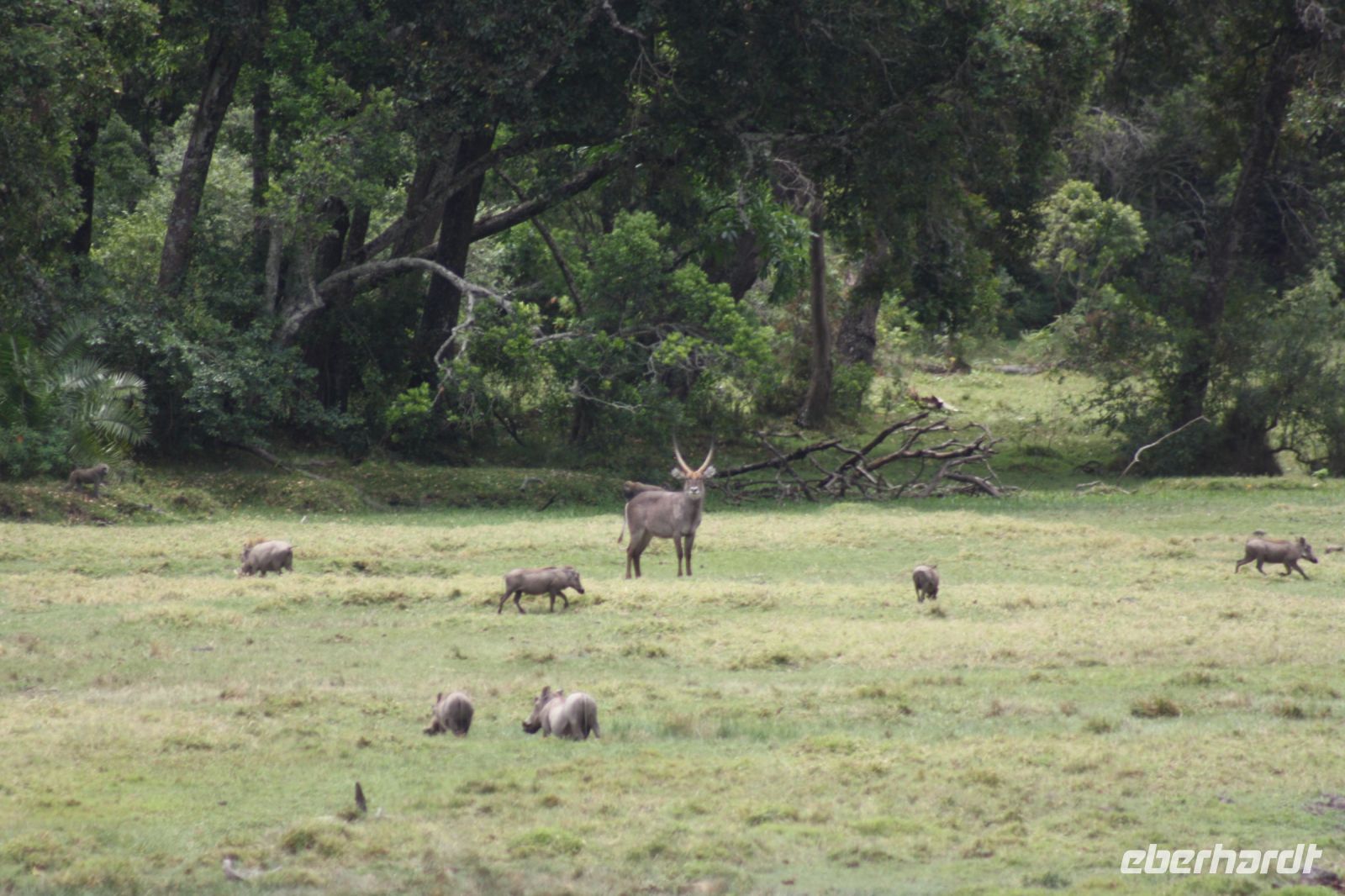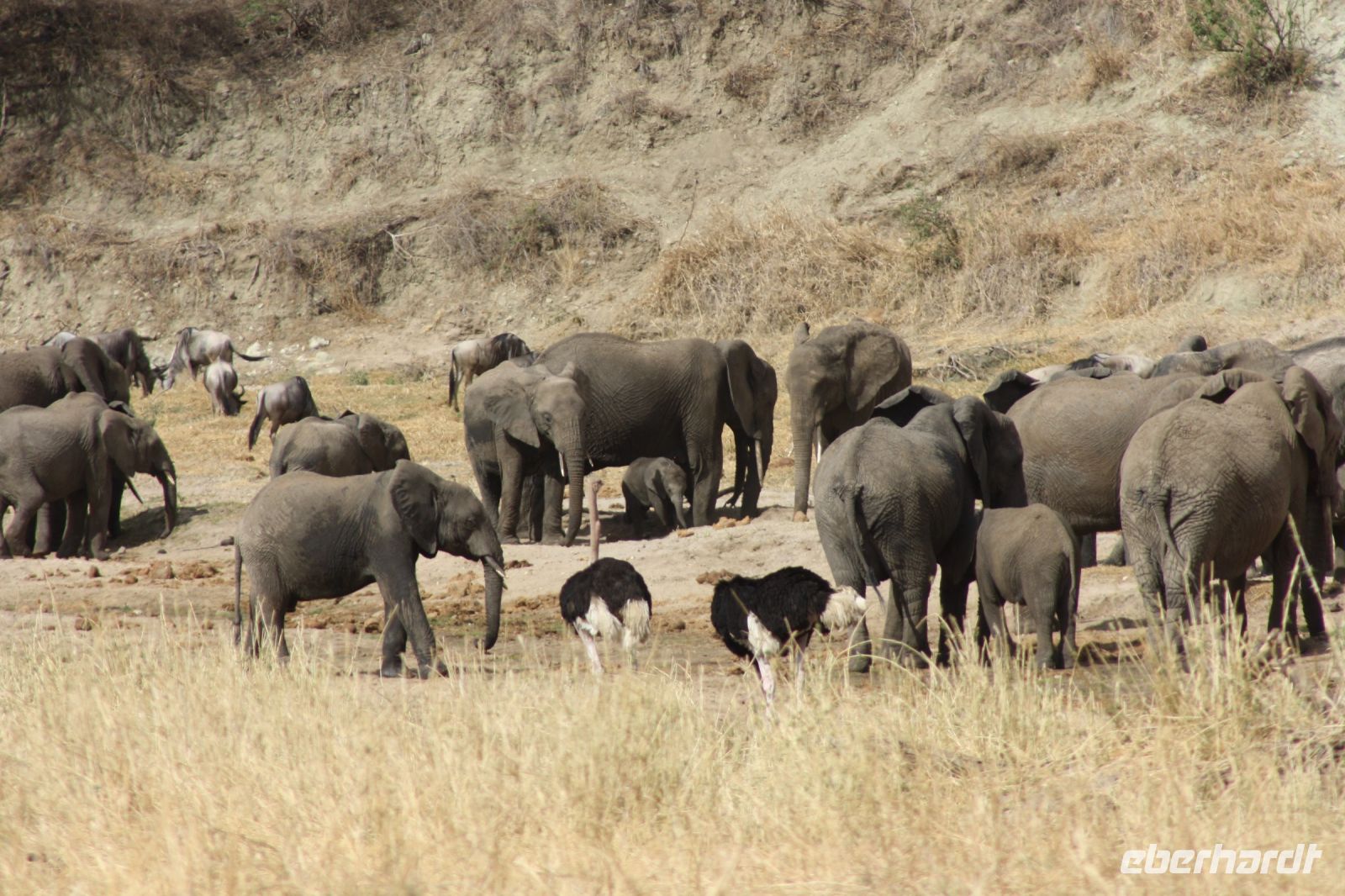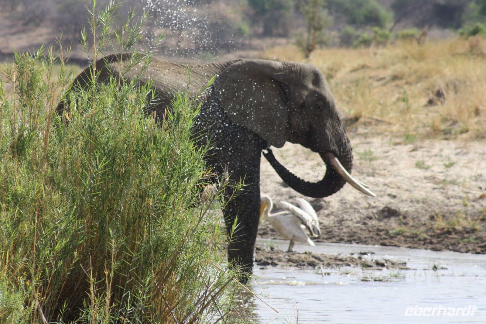 Bei unserem leckeren Frühstück auf der Beobachtungsterrasse konnten wir bereits zum Frühstück Giraffen, Impalas, Elefanten und Warzenschweine entdecken. Gegen 8 Uhr starteten wir in Richtung Sumpfgebiet. Unterwegs begegneten wir bereits Elefanten, Giraffen, Dikdiks und einen Quackvogel. Unter einem Baum erblickten wir drei alte Büffel, die sich gegenseitig vor Feinden schützten. Plötzlich spazierten Elefanten nah an unserem Jeep vorbei. Die Elefanten wollten genau wie wir in Richtung Sumpfgebiet. Das Gebiet ist ein Paradies für die heimische Tierwelt, da der Sumpf niemals austrocknet und ganzjährige das Tier und auch die Pflanzenwelt versorgt. Während wir die Elefanten fotografierten, bemerkten wir einen üblen Geruch. Direkt neben uns knapperten Geier an einem toten Gnu. Riesige Zebra Herden spazierten an uns vorbei und an einem kleinen Wasserloch badeten Impalas, Warzenschweine, Zebras und Gelbschnabelstörche gemeinsam. Kurz bevor wir das Sumpfgebiet erreichten, wartete eine große Büffelherde auf uns, die sich auf Wanderung begaben. Endlich erreichten wir das grüne Sumpfgebiet. Immer wieder zogen Elefantenherden und uns vorbei. Ihr Ziel war der Sumpf, wo sie baden und mit den kleinen Elefanten toben konnten. Neben einer Vielzahl an Gnus und Zebras, konnten wir über 100te Elefanten zählen. Ein absoluter Wahnsinn. Entlang des grünen Streifens konnten wir zudem Büffel und die hiesige Vogelwelt bestaunen. Wir erspähten einen Hagedasch-Vogel, Pelikane, Reihenreiher, pfeifende Enten, Eisvögel, Flamingos, Geier und ein Adler. Unsere Mittagspause konnten wir inmitten des Sumpfgebietes einnehmen und Karim versorgte uns mit Reis, Nudeln und Hühnchen. Nach der leckeren Mittagspause fuhren wir weiter zum Westen des Sumpfgebietes. Hier trafen wir wieder auf die drei Elefanten Bullen, die vermutlich den Weibchen hinterherliefen. Immer wieder konnten wir in der Ferne Elefanten baden sehen. Neben einen Sattelstorch konnten wir auch den Sekretär-Vogel entdecken, der durch die Gegend spazierte. Wir waren vollkommen fasziniert von der Vielfalt der verschiedenen Arten und die Vielzahl der Tiere. Leider mussten wir uns langsam von der Sumpflandschaft verabschieden. Eine weitere Herde von etwa 20 Elefanten und Kudos schlenderten an uns vorbei. Unterwegs konnten wir im Dreck wälzende Zebras sehen und ein sich juckender Elefant sorgte für Erheiterung. Ein wunderschöner Tag neigte sich nun dem Ende entgegen und wir ließen den Tag bei einem gemeinsam "Feierabendbier" in der Lodge ausklingen.