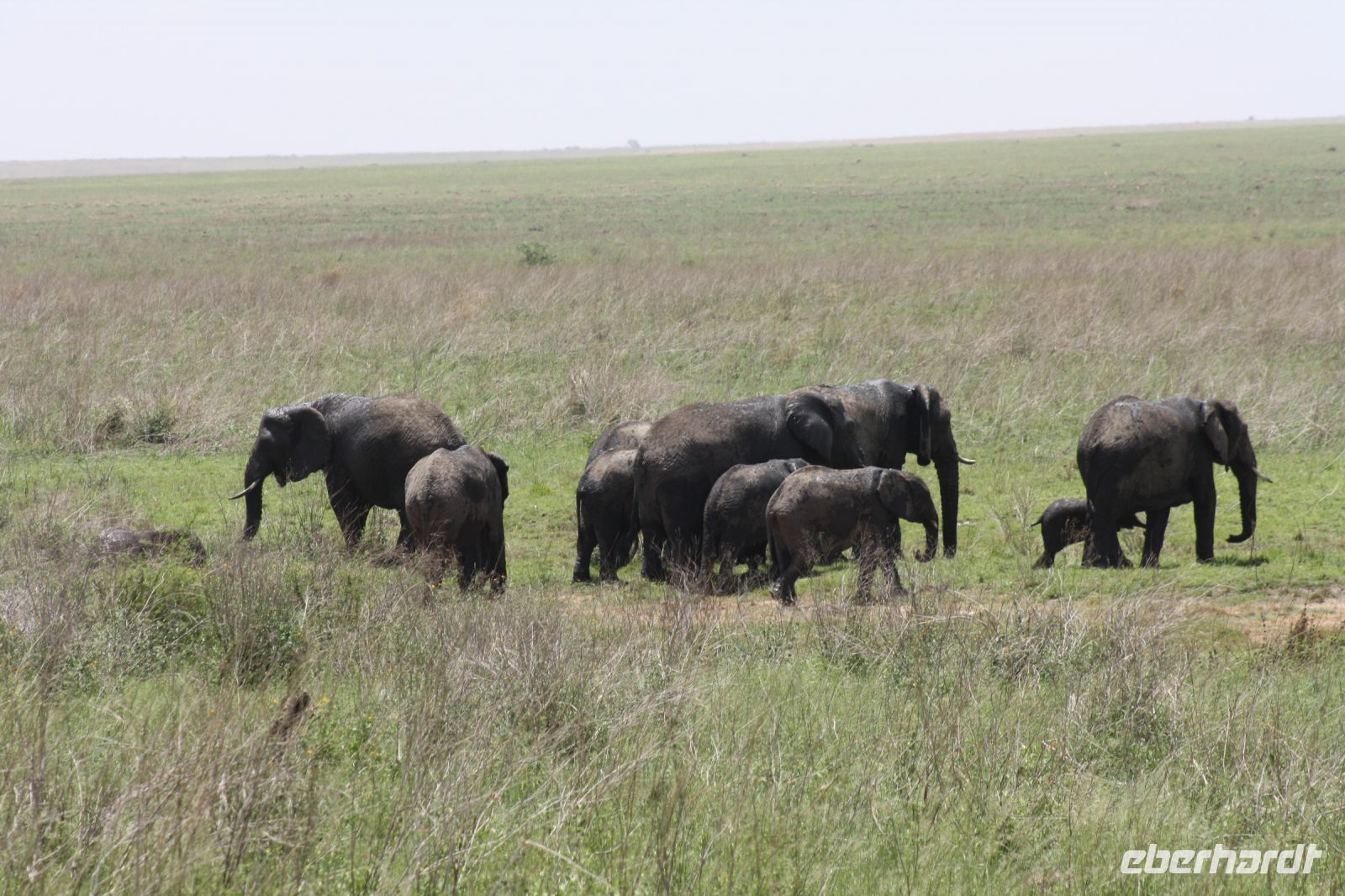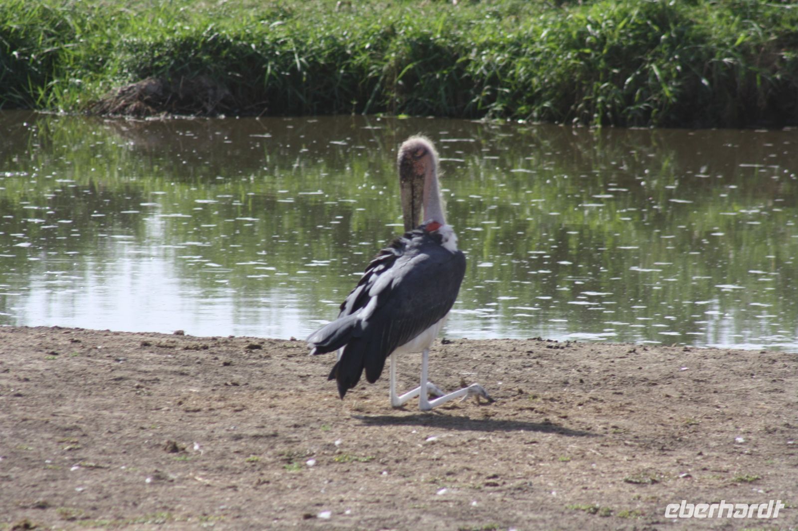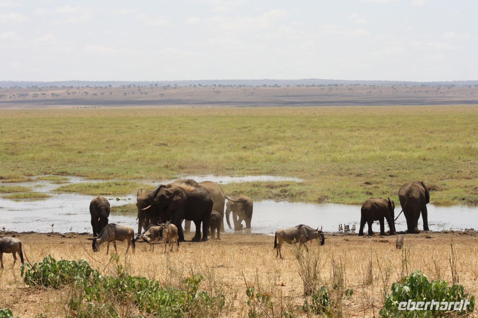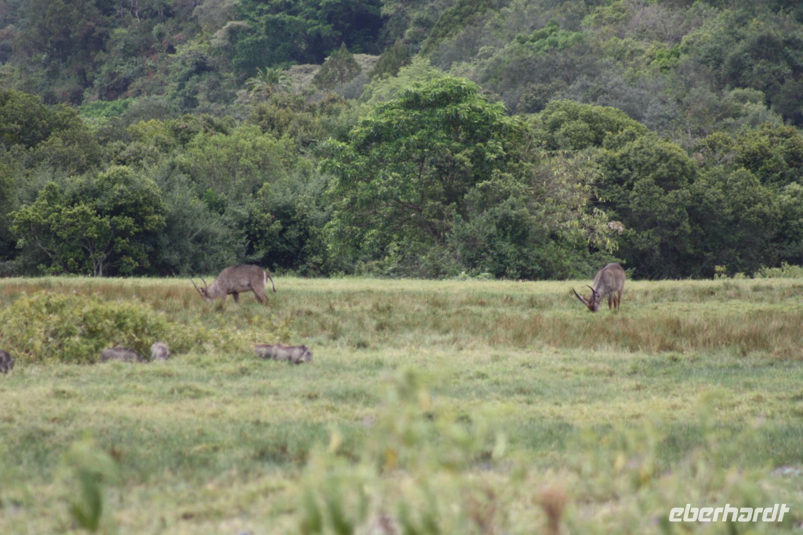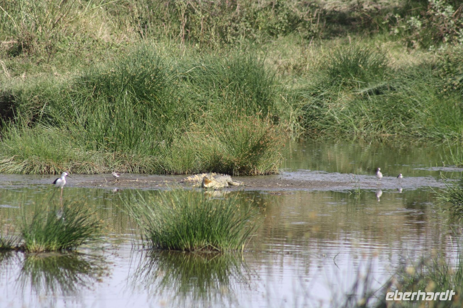 Bei unserem leckeren Frühstück auf der Beobachtungsterrasse konnten wir bereits zum Frühstück Giraffen, Impalas, Elefanten und Warzenschweine entdecken. Gegen 8 Uhr starteten wir in Richtung Sumpfgebiet. Unterwegs begegneten wir bereits Elefanten, Giraffen, Dikdiks und einen Quackvogel. Unter einem Baum erblickten wir drei alte Büffel, die sich gegenseitig vor Feinden schützten. Plötzlich spazierten Elefanten nah an unserem Jeep vorbei. Die Elefanten wollten genau wie wir in Richtung Sumpfgebiet. Das Gebiet ist ein Paradies für die heimische Tierwelt, da der Sumpf niemals austrocknet und ganzjährige das Tier und auch die Pflanzenwelt versorgt. Während wir die Elefanten fotografierten, bemerkten wir einen üblen Geruch. Direkt neben uns knapperten Geier an einem toten Gnu. Riesige Zebra Herden spazierten an uns vorbei und an einem kleinen Wasserloch badeten Impalas, Warzenschweine, Zebras und Gelbschnabelstörche gemeinsam. Kurz bevor wir das Sumpfgebiet erreichten, wartete eine große Büffelherde auf uns, die sich auf Wanderung begaben. Endlich erreichten wir das grüne Sumpfgebiet. Immer wieder zogen Elefantenherden und uns vorbei. Ihr Ziel war der Sumpf, wo sie baden und mit den kleinen Elefanten toben konnten. Neben einer Vielzahl an Gnus und Zebras, konnten wir über 100te Elefanten zählen. Ein absoluter Wahnsinn. Entlang des grünen Streifens konnten wir zudem Büffel und die hiesige Vogelwelt bestaunen. Wir erspähten einen Hagedasch-Vogel, Pelikane, Reihenreiher, pfeifende Enten, Eisvögel, Flamingos, Geier und ein Adler. Unsere Mittagspause konnten wir inmitten des Sumpfgebietes einnehmen und Karim versorgte uns mit Reis, Nudeln und Hühnchen. Nach der leckeren Mittagspause fuhren wir weiter zum Westen des Sumpfgebietes. Hier trafen wir wieder auf die drei Elefanten Bullen, die vermutlich den Weibchen hinterherliefen. Immer wieder konnten wir in der Ferne Elefanten baden sehen. Neben einen Sattelstorch konnten wir auch den Sekretär-Vogel entdecken, der durch die Gegend spazierte. Wir waren vollkommen fasziniert von der Vielfalt der verschiedenen Arten und die Vielzahl der Tiere. Leider mussten wir uns langsam von der Sumpflandschaft verabschieden. Eine weitere Herde von etwa 20 Elefanten und Kudos schlenderten an uns vorbei. Unterwegs konnten wir im Dreck wälzende Zebras sehen und ein sich juckender Elefant sorgte für Erheiterung. Ein wunderschöner Tag neigte sich nun dem Ende entgegen und wir ließen den Tag bei einem gemeinsam "Feierabendbier" in der Lodge ausklingen.