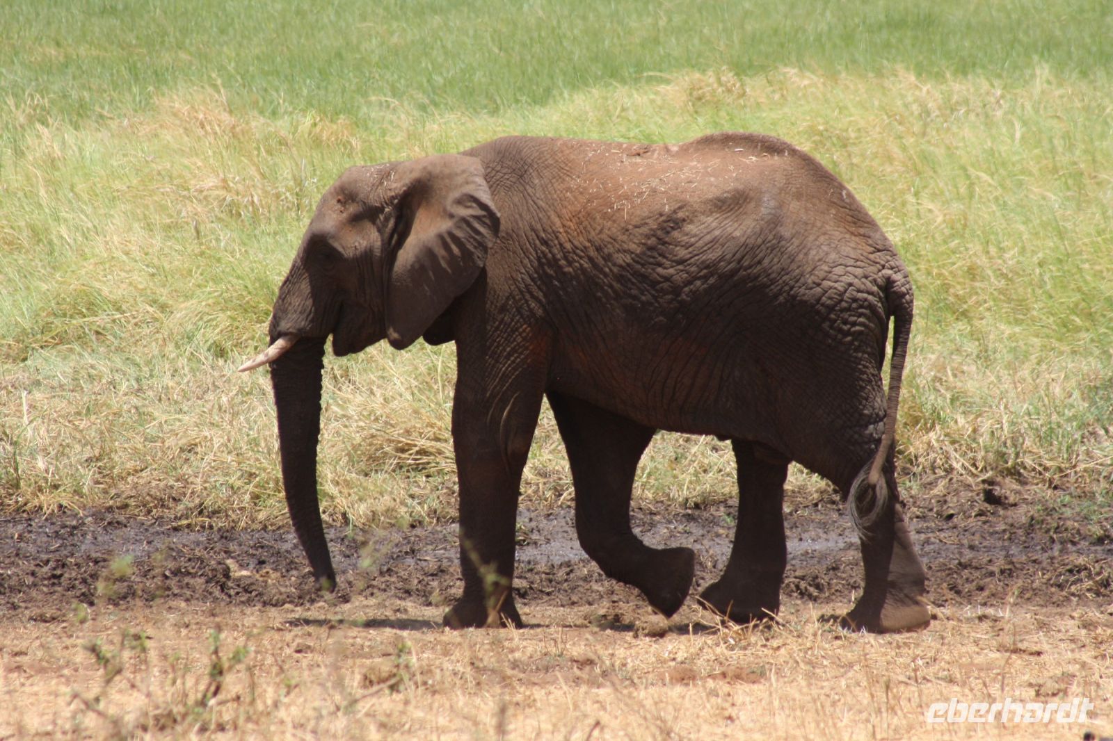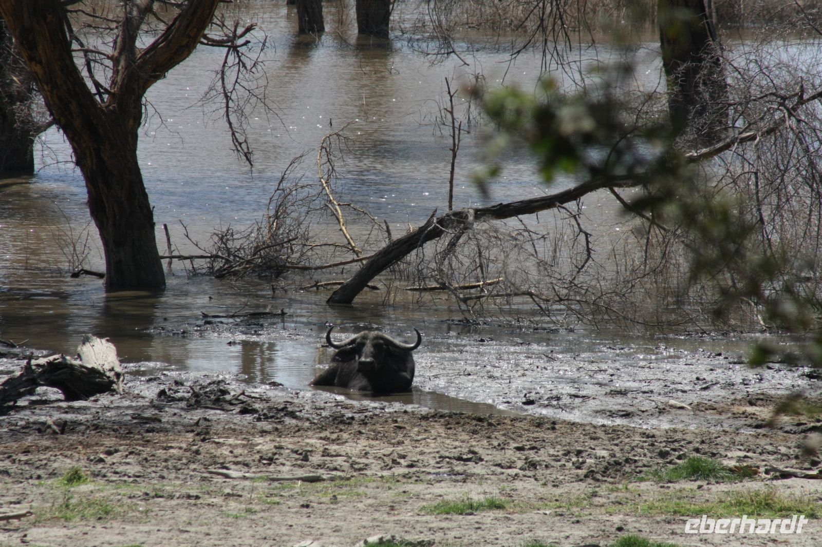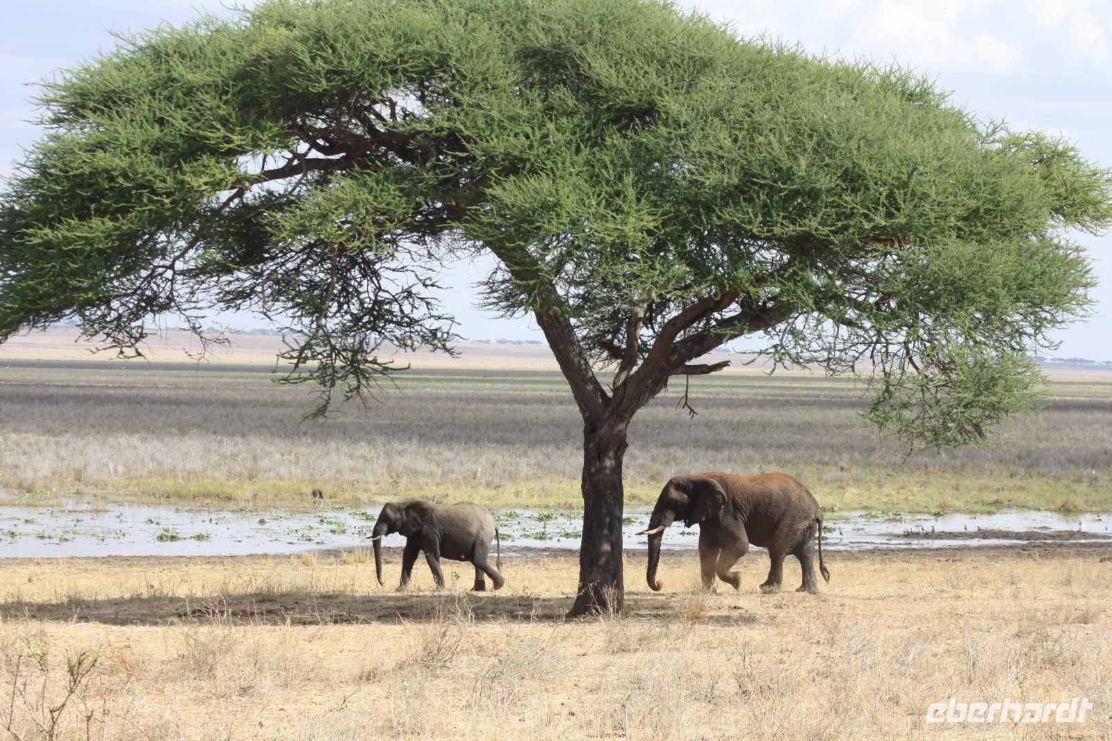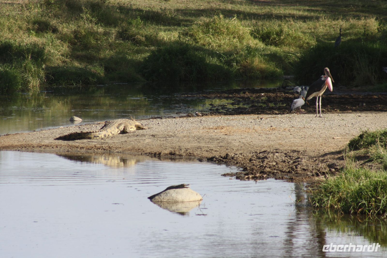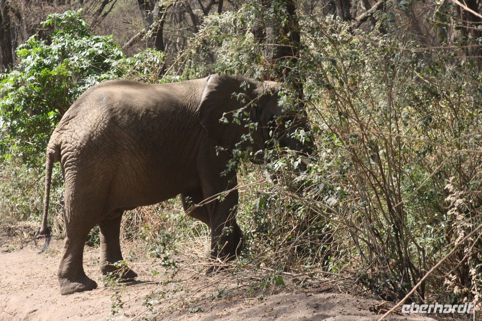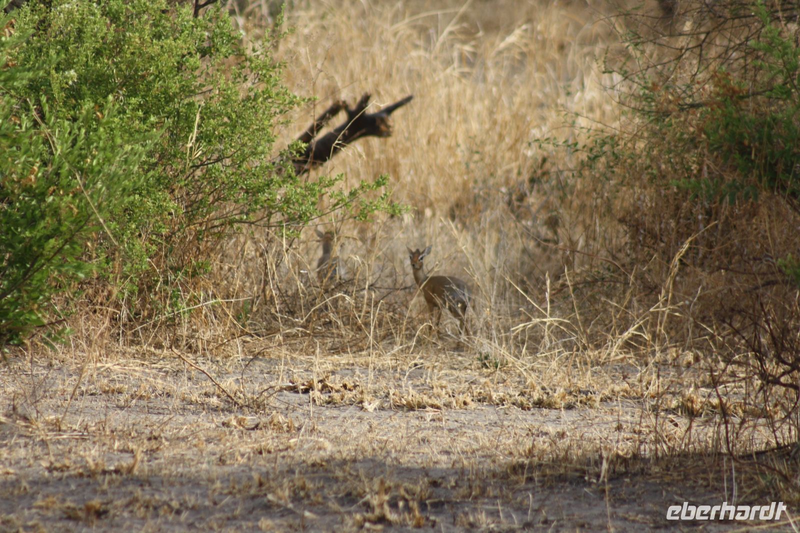 Bei unserem leckeren Frühstück auf der Beobachtungsterrasse konnten wir bereits zum Frühstück Giraffen, Impalas, Elefanten und Warzenschweine entdecken. Gegen 8 Uhr starteten wir in Richtung Sumpfgebiet. Unterwegs begegneten wir bereits Elefanten, Giraffen, Dikdiks und einen Quackvogel. Unter einem Baum erblickten wir drei alte Büffel, die sich gegenseitig vor Feinden schützten. Plötzlich spazierten Elefanten nah an unserem Jeep vorbei. Die Elefanten wollten genau wie wir in Richtung Sumpfgebiet. Das Gebiet ist ein Paradies für die heimische Tierwelt, da der Sumpf niemals austrocknet und ganzjährige das Tier und auch die Pflanzenwelt versorgt. Während wir die Elefanten fotografierten, bemerkten wir einen üblen Geruch. Direkt neben uns knapperten Geier an einem toten Gnu. Riesige Zebra Herden spazierten an uns vorbei und an einem kleinen Wasserloch badeten Impalas, Warzenschweine, Zebras und Gelbschnabelstörche gemeinsam. Kurz bevor wir das Sumpfgebiet erreichten, wartete eine große Büffelherde auf uns, die sich auf Wanderung begaben. Endlich erreichten wir das grüne Sumpfgebiet. Immer wieder zogen Elefantenherden und uns vorbei. Ihr Ziel war der Sumpf, wo sie baden und mit den kleinen Elefanten toben konnten. Neben einer Vielzahl an Gnus und Zebras, konnten wir über 100te Elefanten zählen. Ein absoluter Wahnsinn. Entlang des grünen Streifens konnten wir zudem Büffel und die hiesige Vogelwelt bestaunen. Wir erspähten einen Hagedasch-Vogel, Pelikane, Reihenreiher, pfeifende Enten, Eisvögel, Flamingos, Geier und ein Adler. Unsere Mittagspause konnten wir inmitten des Sumpfgebietes einnehmen und Karim versorgte uns mit Reis, Nudeln und Hühnchen. Nach der leckeren Mittagspause fuhren wir weiter zum Westen des Sumpfgebietes. Hier trafen wir wieder auf die drei Elefanten Bullen, die vermutlich den Weibchen hinterherliefen. Immer wieder konnten wir in der Ferne Elefanten baden sehen. Neben einen Sattelstorch konnten wir auch den Sekretär-Vogel entdecken, der durch die Gegend spazierte. Wir waren vollkommen fasziniert von der Vielfalt der verschiedenen Arten und die Vielzahl der Tiere. Leider mussten wir uns langsam von der Sumpflandschaft verabschieden. Eine weitere Herde von etwa 20 Elefanten und Kudos schlenderten an uns vorbei. Unterwegs konnten wir im Dreck wälzende Zebras sehen und ein sich juckender Elefant sorgte für Erheiterung. Ein wunderschöner Tag neigte sich nun dem Ende entgegen und wir ließen den Tag bei einem gemeinsam "Feierabendbier" in der Lodge ausklingen.