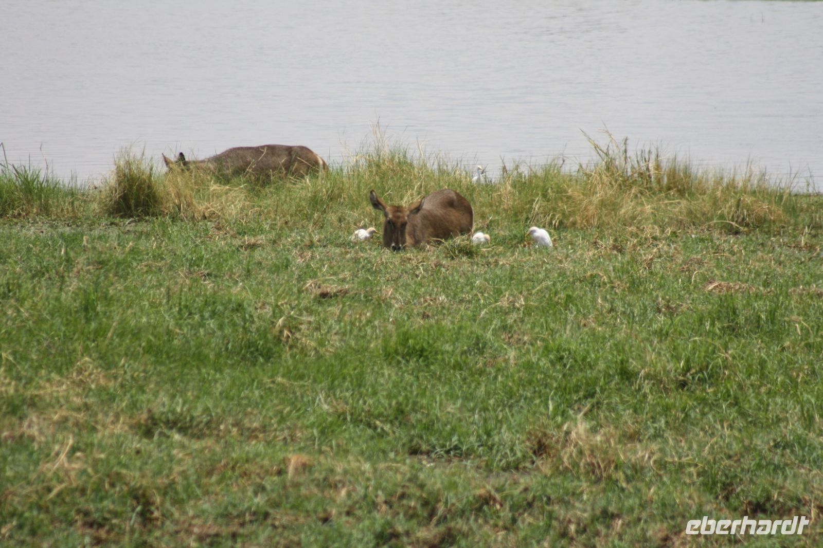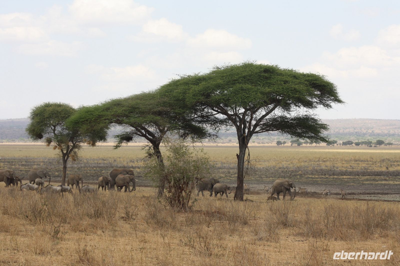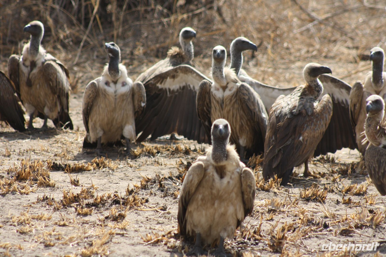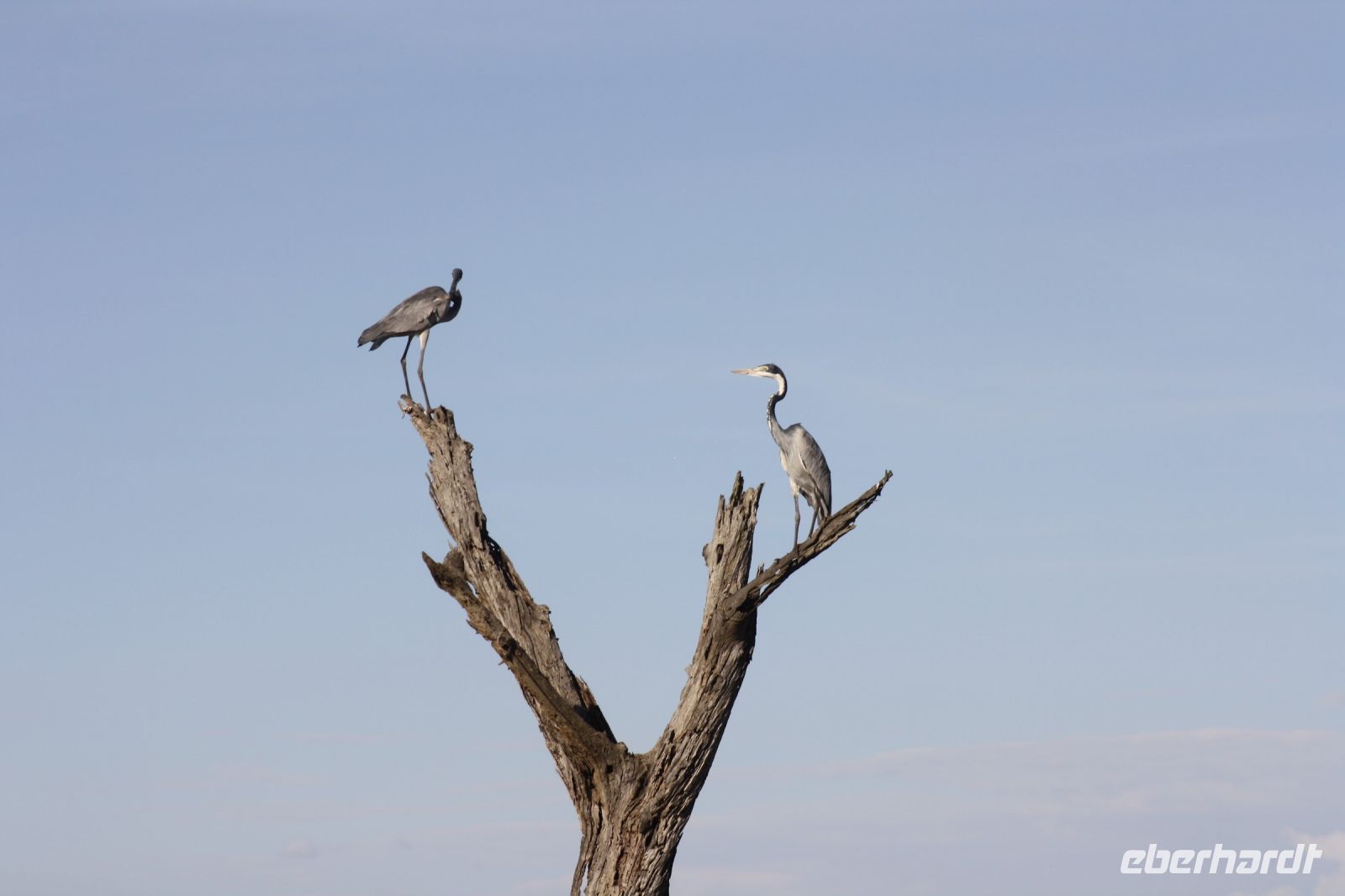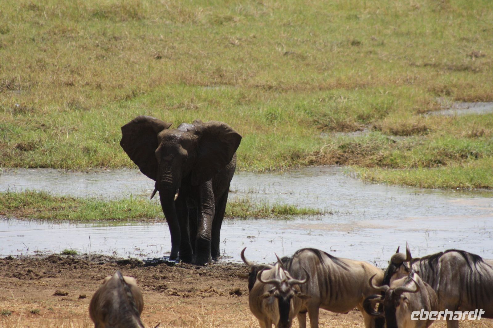 Bei unserem leckeren Frühstück auf der Beobachtungsterrasse konnten wir bereits zum Frühstück Giraffen, Impalas, Elefanten und Warzenschweine entdecken. Gegen 8 Uhr starteten wir in Richtung Sumpfgebiet. Unterwegs begegneten wir bereits Elefanten, Giraffen, Dikdiks und einen Quackvogel. Unter einem Baum erblickten wir drei alte Büffel, die sich gegenseitig vor Feinden schützten. Plötzlich spazierten Elefanten nah an unserem Jeep vorbei. Die Elefanten wollten genau wie wir in Richtung Sumpfgebiet. Das Gebiet ist ein Paradies für die heimische Tierwelt, da der Sumpf niemals austrocknet und ganzjährige das Tier und auch die Pflanzenwelt versorgt. Während wir die Elefanten fotografierten, bemerkten wir einen üblen Geruch. Direkt neben uns knapperten Geier an einem toten Gnu. Riesige Zebra Herden spazierten an uns vorbei und an einem kleinen Wasserloch badeten Impalas, Warzenschweine, Zebras und Gelbschnabelstörche gemeinsam. Kurz bevor wir das Sumpfgebiet erreichten, wartete eine große Büffelherde auf uns, die sich auf Wanderung begaben. Endlich erreichten wir das grüne Sumpfgebiet. Immer wieder zogen Elefantenherden und uns vorbei. Ihr Ziel war der Sumpf, wo sie baden und mit den kleinen Elefanten toben konnten. Neben einer Vielzahl an Gnus und Zebras, konnten wir über 100te Elefanten zählen. Ein absoluter Wahnsinn. Entlang des grünen Streifens konnten wir zudem Büffel und die hiesige Vogelwelt bestaunen. Wir erspähten einen Hagedasch-Vogel, Pelikane, Reihenreiher, pfeifende Enten, Eisvögel, Flamingos, Geier und ein Adler. Unsere Mittagspause konnten wir inmitten des Sumpfgebietes einnehmen und Karim versorgte uns mit Reis, Nudeln und Hühnchen. Nach der leckeren Mittagspause fuhren wir weiter zum Westen des Sumpfgebietes. Hier trafen wir wieder auf die drei Elefanten Bullen, die vermutlich den Weibchen hinterherliefen. Immer wieder konnten wir in der Ferne Elefanten baden sehen. Neben einen Sattelstorch konnten wir auch den Sekretär-Vogel entdecken, der durch die Gegend spazierte. Wir waren vollkommen fasziniert von der Vielfalt der verschiedenen Arten und die Vielzahl der Tiere. Leider mussten wir uns langsam von der Sumpflandschaft verabschieden. Eine weitere Herde von etwa 20 Elefanten und Kudos schlenderten an uns vorbei. Unterwegs konnten wir im Dreck wälzende Zebras sehen und ein sich juckender Elefant sorgte für Erheiterung. Ein wunderschöner Tag neigte sich nun dem Ende entgegen und wir ließen den Tag bei einem gemeinsam "Feierabendbier" in der Lodge ausklingen.