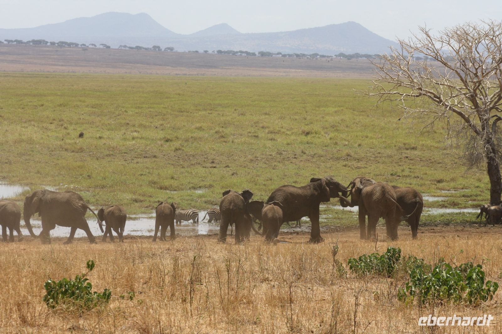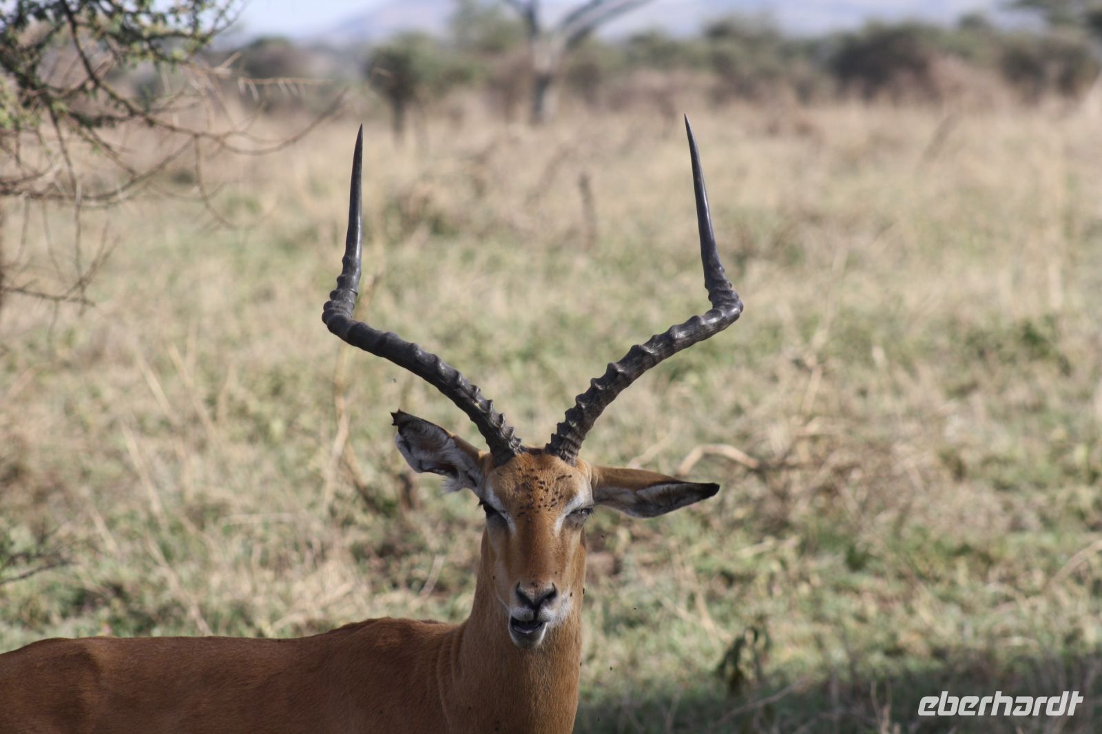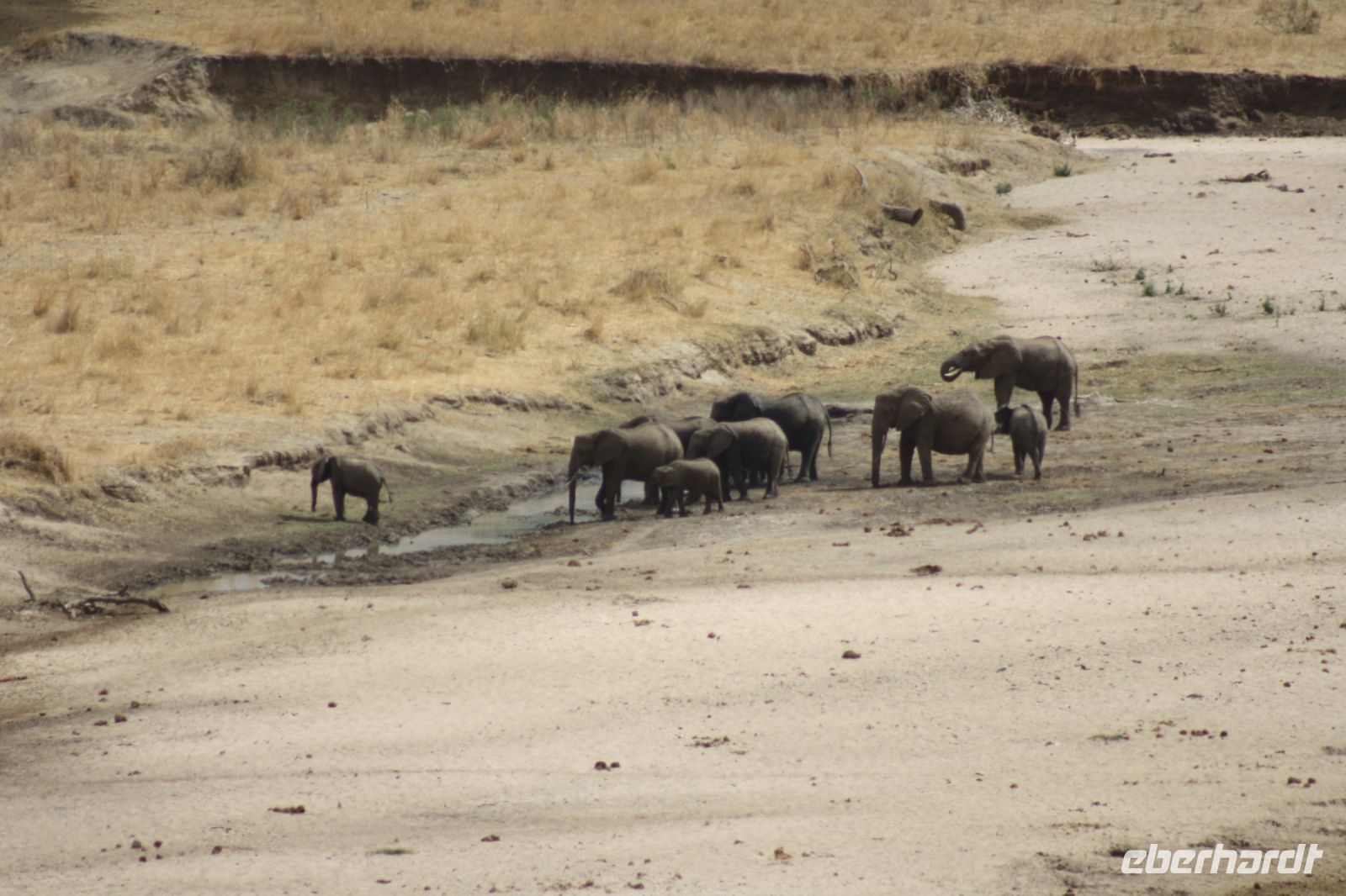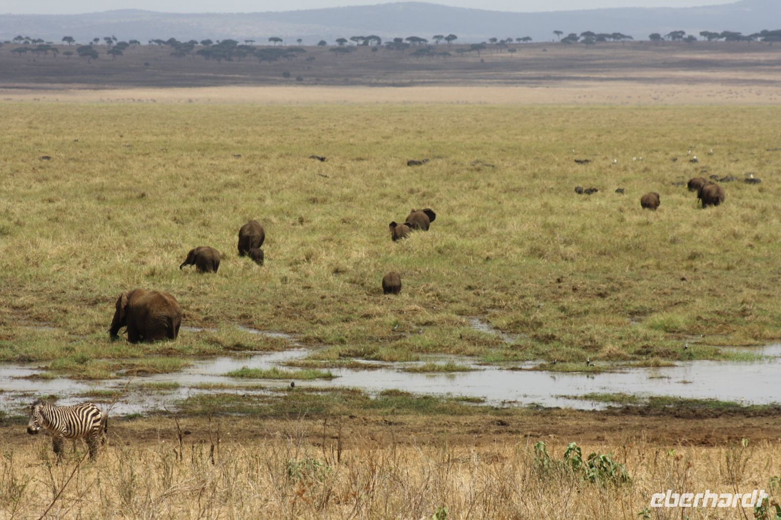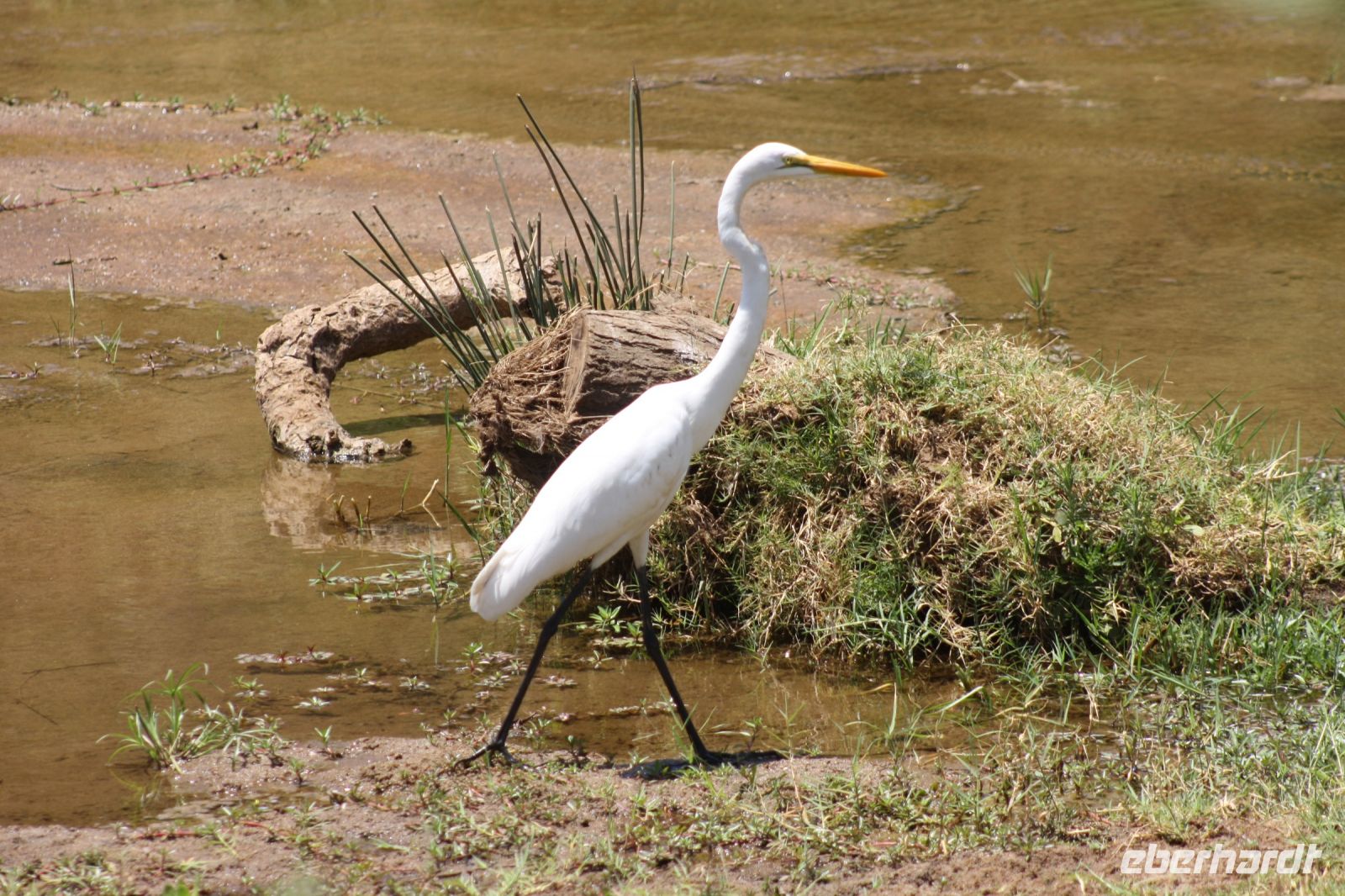 Bei unserem leckeren Frühstück auf der Beobachtungsterrasse konnten wir bereits zum Frühstück Giraffen, Impalas, Elefanten und Warzenschweine entdecken. Gegen 8 Uhr starteten wir in Richtung Sumpfgebiet. Unterwegs begegneten wir bereits Elefanten, Giraffen, Dikdiks und einen Quackvogel. Unter einem Baum erblickten wir drei alte Büffel, die sich gegenseitig vor Feinden schützten. Plötzlich spazierten Elefanten nah an unserem Jeep vorbei. Die Elefanten wollten genau wie wir in Richtung Sumpfgebiet. Das Gebiet ist ein Paradies für die heimische Tierwelt, da der Sumpf niemals austrocknet und ganzjährige das Tier und auch die Pflanzenwelt versorgt. Während wir die Elefanten fotografierten, bemerkten wir einen üblen Geruch. Direkt neben uns knapperten Geier an einem toten Gnu. Riesige Zebra Herden spazierten an uns vorbei und an einem kleinen Wasserloch badeten Impalas, Warzenschweine, Zebras und Gelbschnabelstörche gemeinsam. Kurz bevor wir das Sumpfgebiet erreichten, wartete eine große Büffelherde auf uns, die sich auf Wanderung begaben. Endlich erreichten wir das grüne Sumpfgebiet. Immer wieder zogen Elefantenherden und uns vorbei. Ihr Ziel war der Sumpf, wo sie baden und mit den kleinen Elefanten toben konnten. Neben einer Vielzahl an Gnus und Zebras, konnten wir über 100te Elefanten zählen. Ein absoluter Wahnsinn. Entlang des grünen Streifens konnten wir zudem Büffel und die hiesige Vogelwelt bestaunen. Wir erspähten einen Hagedasch-Vogel, Pelikane, Reihenreiher, pfeifende Enten, Eisvögel, Flamingos, Geier und ein Adler. Unsere Mittagspause konnten wir inmitten des Sumpfgebietes einnehmen und Karim versorgte uns mit Reis, Nudeln und Hühnchen. Nach der leckeren Mittagspause fuhren wir weiter zum Westen des Sumpfgebietes. Hier trafen wir wieder auf die drei Elefanten Bullen, die vermutlich den Weibchen hinterherliefen. Immer wieder konnten wir in der Ferne Elefanten baden sehen. Neben einen Sattelstorch konnten wir auch den Sekretär-Vogel entdecken, der durch die Gegend spazierte. Wir waren vollkommen fasziniert von der Vielfalt der verschiedenen Arten und die Vielzahl der Tiere. Leider mussten wir uns langsam von der Sumpflandschaft verabschieden. Eine weitere Herde von etwa 20 Elefanten und Kudos schlenderten an uns vorbei. Unterwegs konnten wir im Dreck wälzende Zebras sehen und ein sich juckender Elefant sorgte für Erheiterung. Ein wunderschöner Tag neigte sich nun dem Ende entgegen und wir ließen den Tag bei einem gemeinsam "Feierabendbier" in der Lodge ausklingen.