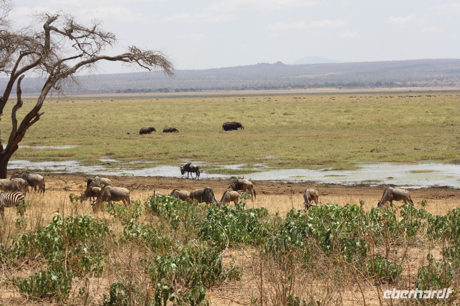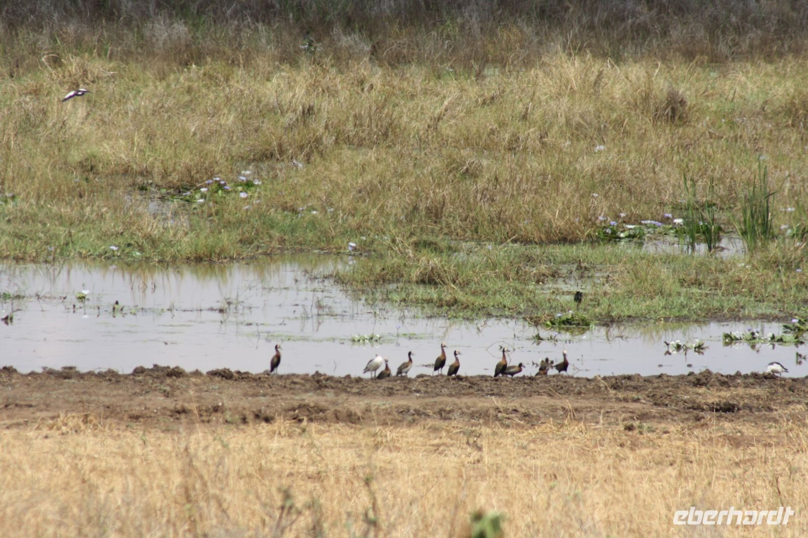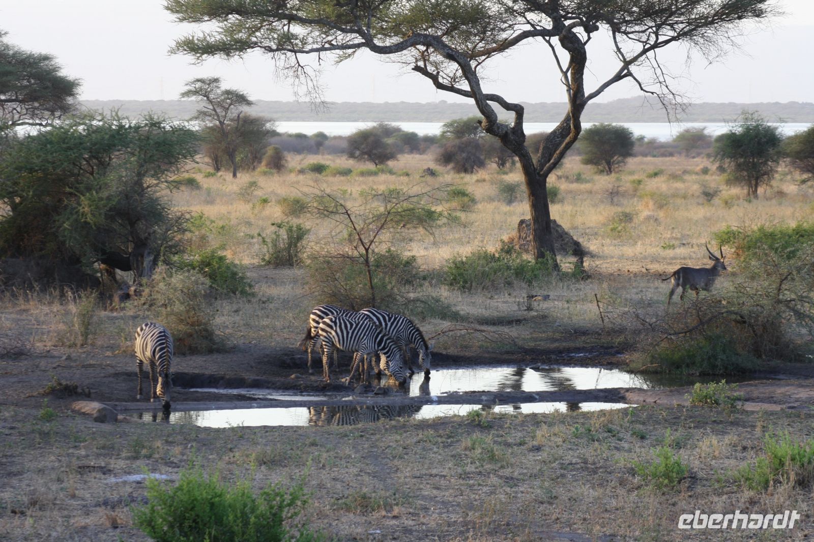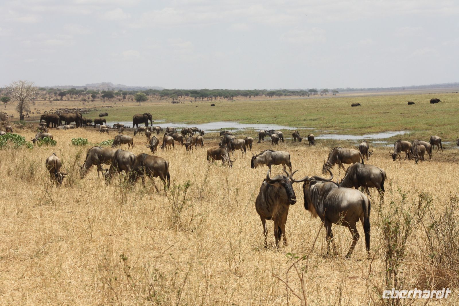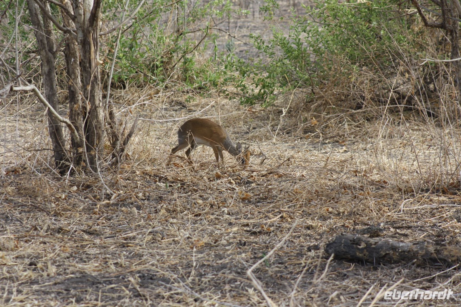 Bei unserem leckeren Frühstück auf der Beobachtungsterrasse konnten wir bereits zum Frühstück Giraffen, Impalas, Elefanten und Warzenschweine entdecken. Gegen 8 Uhr starteten wir in Richtung Sumpfgebiet. Unterwegs begegneten wir bereits Elefanten, Giraffen, Dikdiks und einen Quackvogel. Unter einem Baum erblickten wir drei alte Büffel, die sich gegenseitig vor Feinden schützten. Plötzlich spazierten Elefanten nah an unserem Jeep vorbei. Die Elefanten wollten genau wie wir in Richtung Sumpfgebiet. Das Gebiet ist ein Paradies für die heimische Tierwelt, da der Sumpf niemals austrocknet und ganzjährige das Tier und auch die Pflanzenwelt versorgt. Während wir die Elefanten fotografierten, bemerkten wir einen üblen Geruch. Direkt neben uns knapperten Geier an einem toten Gnu. Riesige Zebra Herden spazierten an uns vorbei und an einem kleinen Wasserloch badeten Impalas, Warzenschweine, Zebras und Gelbschnabelstörche gemeinsam. Kurz bevor wir das Sumpfgebiet erreichten, wartete eine große Büffelherde auf uns, die sich auf Wanderung begaben. Endlich erreichten wir das grüne Sumpfgebiet. Immer wieder zogen Elefantenherden und uns vorbei. Ihr Ziel war der Sumpf, wo sie baden und mit den kleinen Elefanten toben konnten. Neben einer Vielzahl an Gnus und Zebras, konnten wir über 100te Elefanten zählen. Ein absoluter Wahnsinn. Entlang des grünen Streifens konnten wir zudem Büffel und die hiesige Vogelwelt bestaunen. Wir erspähten einen Hagedasch-Vogel, Pelikane, Reihenreiher, pfeifende Enten, Eisvögel, Flamingos, Geier und ein Adler. Unsere Mittagspause konnten wir inmitten des Sumpfgebietes einnehmen und Karim versorgte uns mit Reis, Nudeln und Hühnchen. Nach der leckeren Mittagspause fuhren wir weiter zum Westen des Sumpfgebietes. Hier trafen wir wieder auf die drei Elefanten Bullen, die vermutlich den Weibchen hinterherliefen. Immer wieder konnten wir in der Ferne Elefanten baden sehen. Neben einen Sattelstorch konnten wir auch den Sekretär-Vogel entdecken, der durch die Gegend spazierte. Wir waren vollkommen fasziniert von der Vielfalt der verschiedenen Arten und die Vielzahl der Tiere. Leider mussten wir uns langsam von der Sumpflandschaft verabschieden. Eine weitere Herde von etwa 20 Elefanten und Kudos schlenderten an uns vorbei. Unterwegs konnten wir im Dreck wälzende Zebras sehen und ein sich juckender Elefant sorgte für Erheiterung. Ein wunderschöner Tag neigte sich nun dem Ende entgegen und wir ließen den Tag bei einem gemeinsam "Feierabendbier" in der Lodge ausklingen.