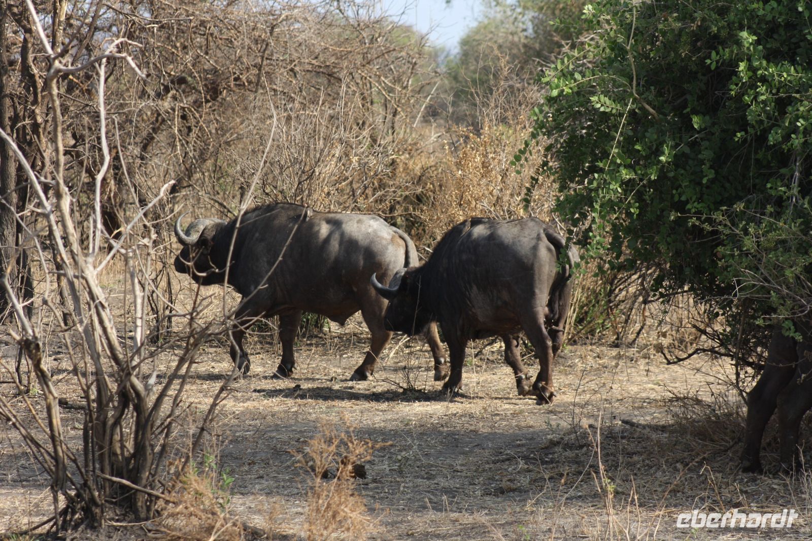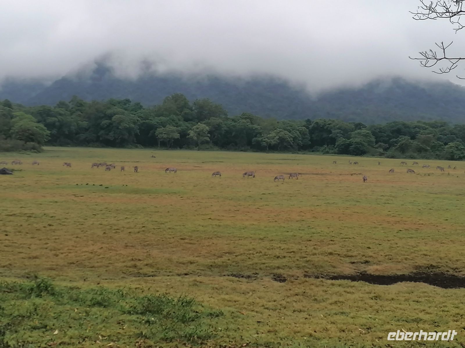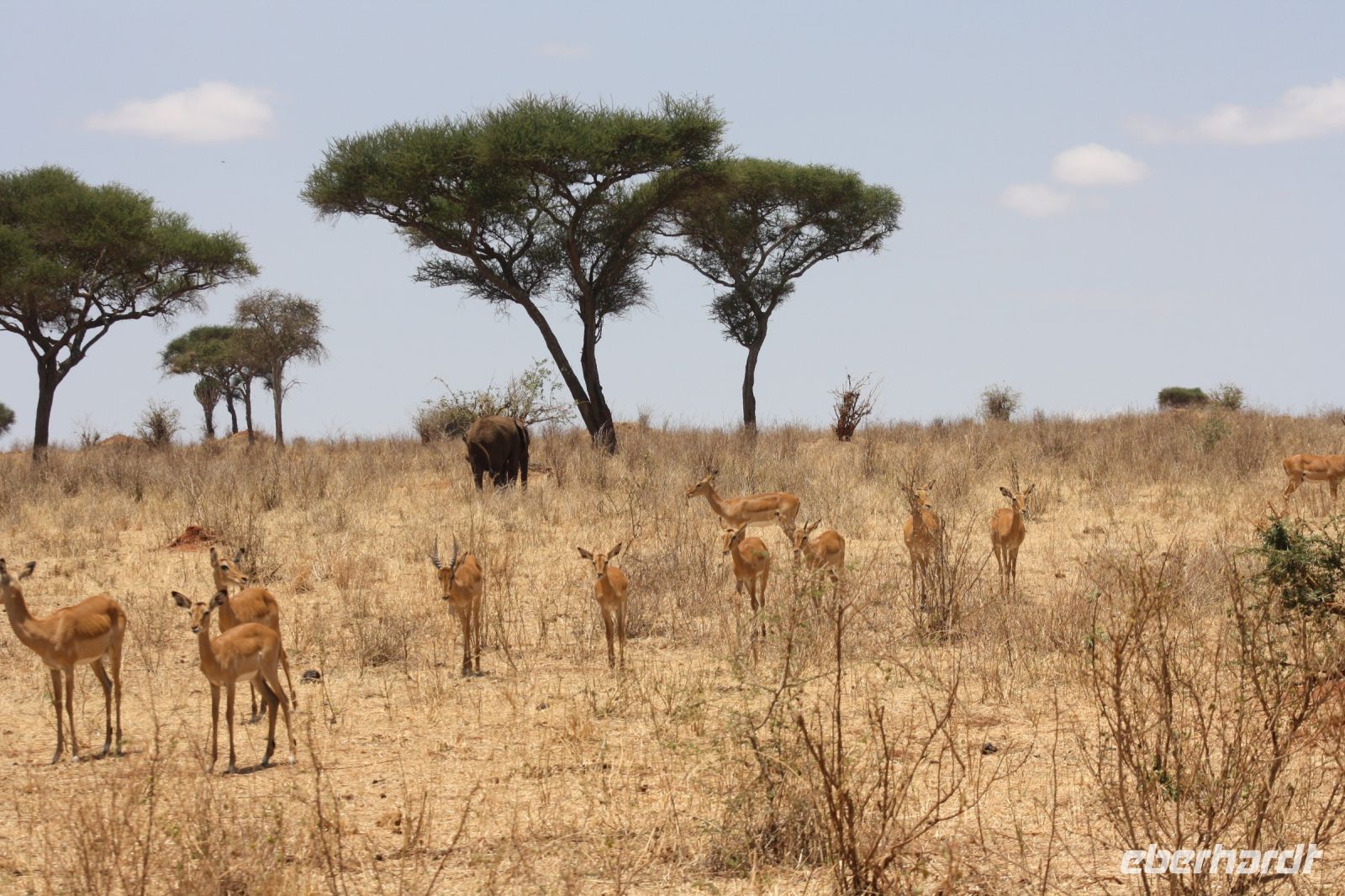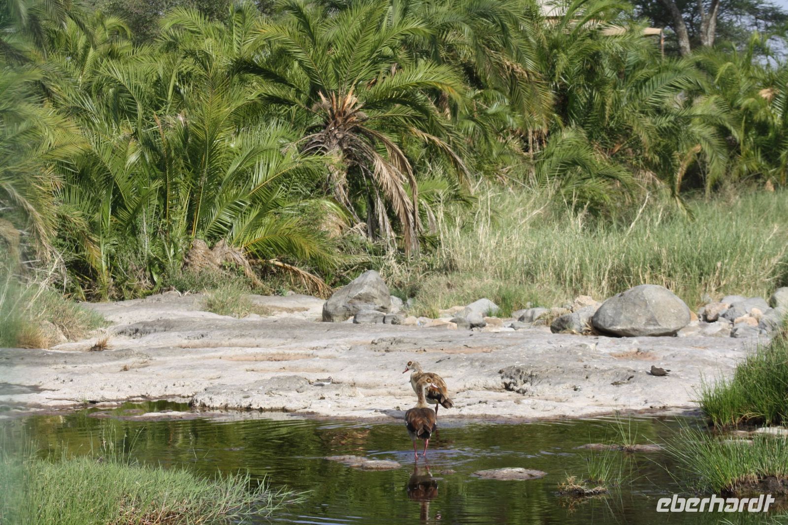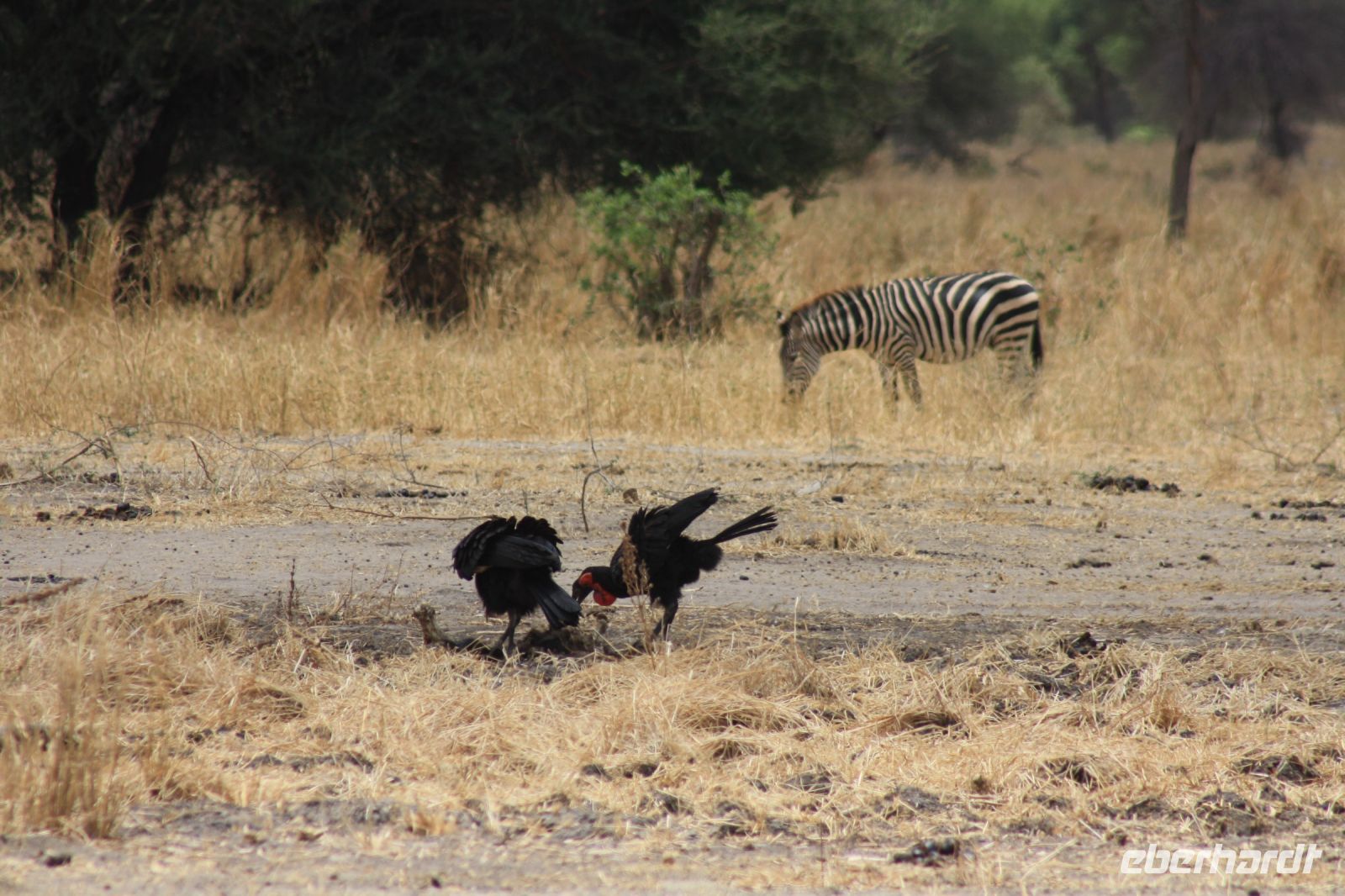 Bei unserem leckeren Frühstück auf der Beobachtungsterrasse konnten wir bereits zum Frühstück Giraffen, Impalas, Elefanten und Warzenschweine entdecken. Gegen 8 Uhr starteten wir in Richtung Sumpfgebiet. Unterwegs begegneten wir bereits Elefanten, Giraffen, Dikdiks und einen Quackvogel. Unter einem Baum erblickten wir drei alte Büffel, die sich gegenseitig vor Feinden schützten. Plötzlich spazierten Elefanten nah an unserem Jeep vorbei. Die Elefanten wollten genau wie wir in Richtung Sumpfgebiet. Das Gebiet ist ein Paradies für die heimische Tierwelt, da der Sumpf niemals austrocknet und ganzjährige das Tier und auch die Pflanzenwelt versorgt. Während wir die Elefanten fotografierten, bemerkten wir einen üblen Geruch. Direkt neben uns knapperten Geier an einem toten Gnu. Riesige Zebra Herden spazierten an uns vorbei und an einem kleinen Wasserloch badeten Impalas, Warzenschweine, Zebras und Gelbschnabelstörche gemeinsam. Kurz bevor wir das Sumpfgebiet erreichten, wartete eine große Büffelherde auf uns, die sich auf Wanderung begaben. Endlich erreichten wir das grüne Sumpfgebiet. Immer wieder zogen Elefantenherden und uns vorbei. Ihr Ziel war der Sumpf, wo sie baden und mit den kleinen Elefanten toben konnten. Neben einer Vielzahl an Gnus und Zebras, konnten wir über 100te Elefanten zählen. Ein absoluter Wahnsinn. Entlang des grünen Streifens konnten wir zudem Büffel und die hiesige Vogelwelt bestaunen. Wir erspähten einen Hagedasch-Vogel, Pelikane, Reihenreiher, pfeifende Enten, Eisvögel, Flamingos, Geier und ein Adler. Unsere Mittagspause konnten wir inmitten des Sumpfgebietes einnehmen und Karim versorgte uns mit Reis, Nudeln und Hühnchen. Nach der leckeren Mittagspause fuhren wir weiter zum Westen des Sumpfgebietes. Hier trafen wir wieder auf die drei Elefanten Bullen, die vermutlich den Weibchen hinterherliefen. Immer wieder konnten wir in der Ferne Elefanten baden sehen. Neben einen Sattelstorch konnten wir auch den Sekretär-Vogel entdecken, der durch die Gegend spazierte. Wir waren vollkommen fasziniert von der Vielfalt der verschiedenen Arten und die Vielzahl der Tiere. Leider mussten wir uns langsam von der Sumpflandschaft verabschieden. Eine weitere Herde von etwa 20 Elefanten und Kudos schlenderten an uns vorbei. Unterwegs konnten wir im Dreck wälzende Zebras sehen und ein sich juckender Elefant sorgte für Erheiterung. Ein wunderschöner Tag neigte sich nun dem Ende entgegen und wir ließen den Tag bei einem gemeinsam "Feierabendbier" in der Lodge ausklingen.