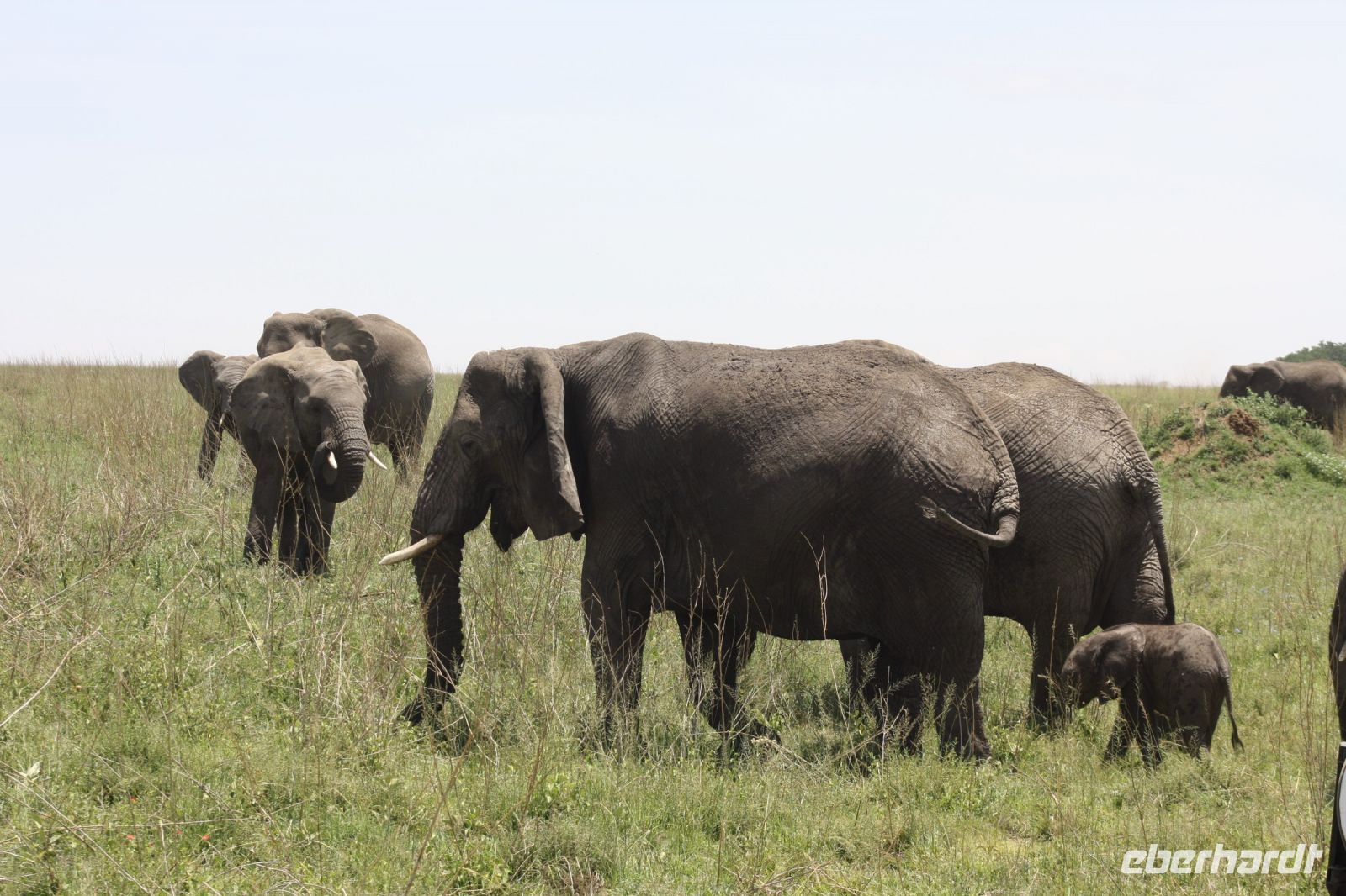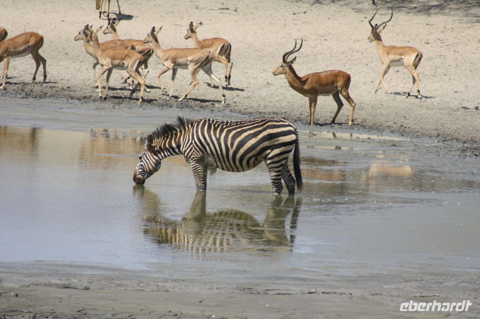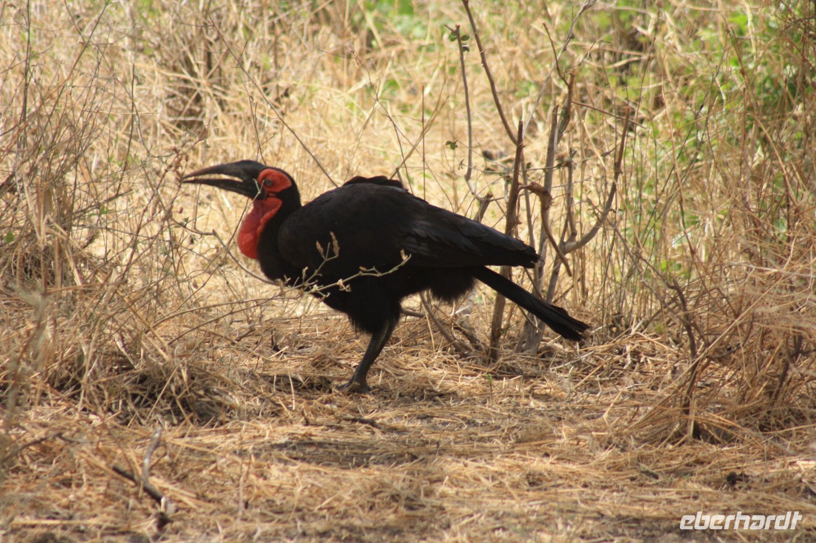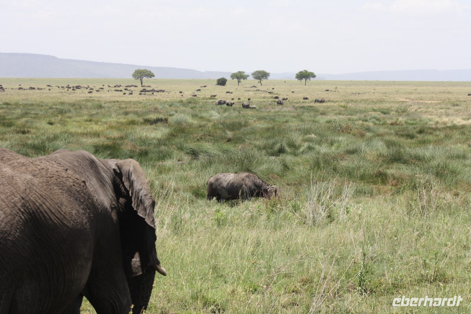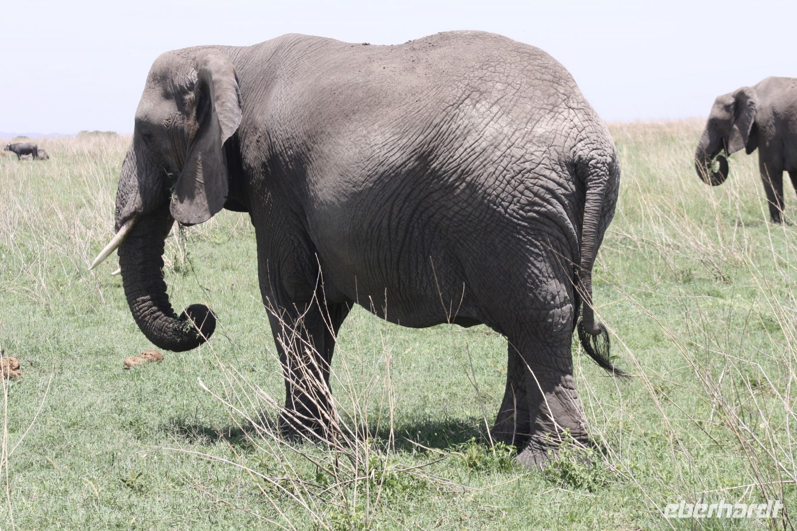 Bei unserem leckeren Frühstück auf der Beobachtungsterrasse konnten wir bereits zum Frühstück Giraffen, Impalas, Elefanten und Warzenschweine entdecken. Gegen 8 Uhr starteten wir in Richtung Sumpfgebiet. Unterwegs begegneten wir bereits Elefanten, Giraffen, Dikdiks und einen Quackvogel. Unter einem Baum erblickten wir drei alte Büffel, die sich gegenseitig vor Feinden schützten. Plötzlich spazierten Elefanten nah an unserem Jeep vorbei. Die Elefanten wollten genau wie wir in Richtung Sumpfgebiet. Das Gebiet ist ein Paradies für die heimische Tierwelt, da der Sumpf niemals austrocknet und ganzjährige das Tier und auch die Pflanzenwelt versorgt. Während wir die Elefanten fotografierten, bemerkten wir einen üblen Geruch. Direkt neben uns knapperten Geier an einem toten Gnu. Riesige Zebra Herden spazierten an uns vorbei und an einem kleinen Wasserloch badeten Impalas, Warzenschweine, Zebras und Gelbschnabelstörche gemeinsam. Kurz bevor wir das Sumpfgebiet erreichten, wartete eine große Büffelherde auf uns, die sich auf Wanderung begaben. Endlich erreichten wir das grüne Sumpfgebiet. Immer wieder zogen Elefantenherden und uns vorbei. Ihr Ziel war der Sumpf, wo sie baden und mit den kleinen Elefanten toben konnten. Neben einer Vielzahl an Gnus und Zebras, konnten wir über 100te Elefanten zählen. Ein absoluter Wahnsinn. Entlang des grünen Streifens konnten wir zudem Büffel und die hiesige Vogelwelt bestaunen. Wir erspähten einen Hagedasch-Vogel, Pelikane, Reihenreiher, pfeifende Enten, Eisvögel, Flamingos, Geier und ein Adler. Unsere Mittagspause konnten wir inmitten des Sumpfgebietes einnehmen und Karim versorgte uns mit Reis, Nudeln und Hühnchen. Nach der leckeren Mittagspause fuhren wir weiter zum Westen des Sumpfgebietes. Hier trafen wir wieder auf die drei Elefanten Bullen, die vermutlich den Weibchen hinterherliefen. Immer wieder konnten wir in der Ferne Elefanten baden sehen. Neben einen Sattelstorch konnten wir auch den Sekretär-Vogel entdecken, der durch die Gegend spazierte. Wir waren vollkommen fasziniert von der Vielfalt der verschiedenen Arten und die Vielzahl der Tiere. Leider mussten wir uns langsam von der Sumpflandschaft verabschieden. Eine weitere Herde von etwa 20 Elefanten und Kudos schlenderten an uns vorbei. Unterwegs konnten wir im Dreck wälzende Zebras sehen und ein sich juckender Elefant sorgte für Erheiterung. Ein wunderschöner Tag neigte sich nun dem Ende entgegen und wir ließen den Tag bei einem gemeinsam "Feierabendbier" in der Lodge ausklingen.