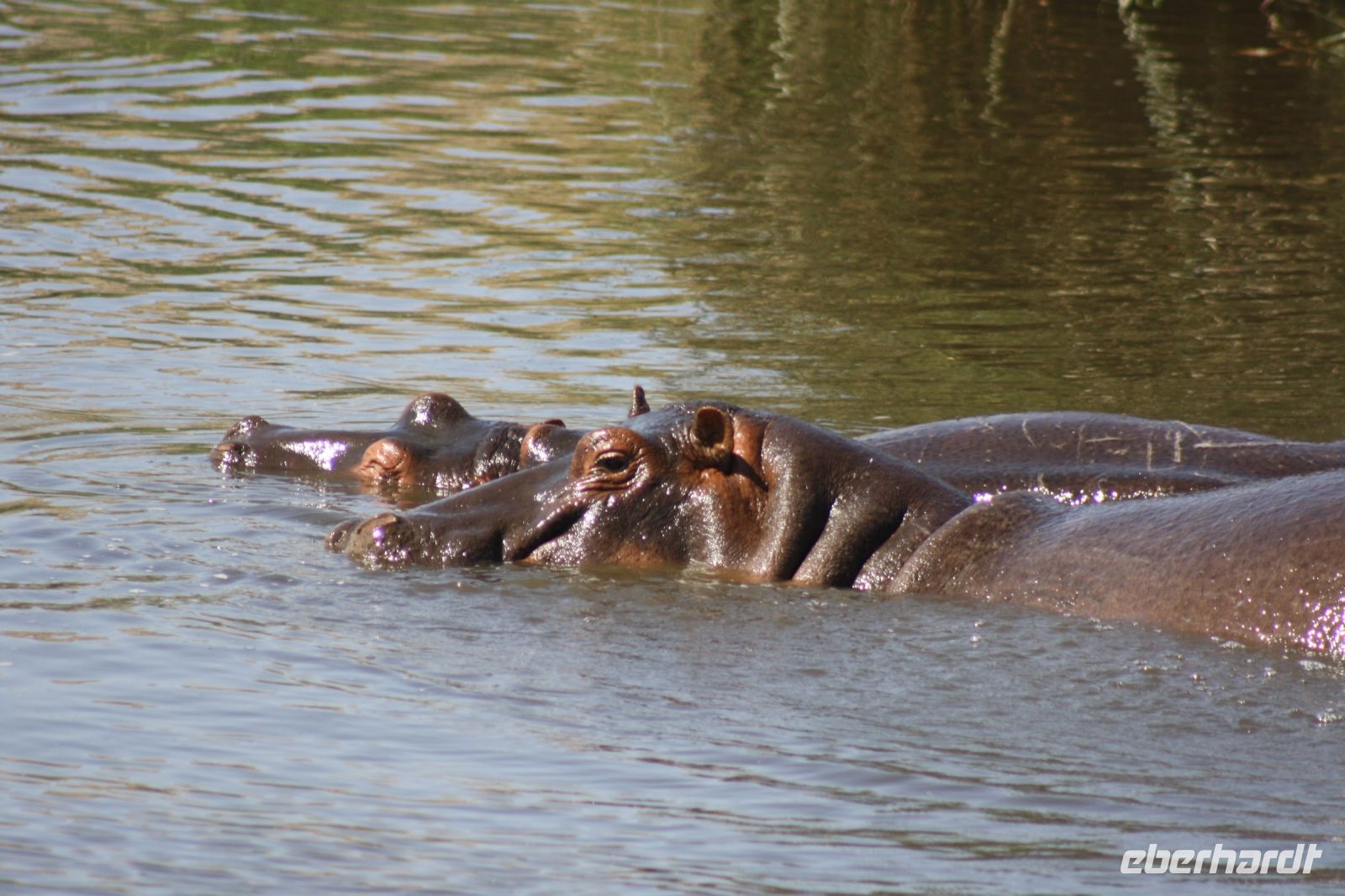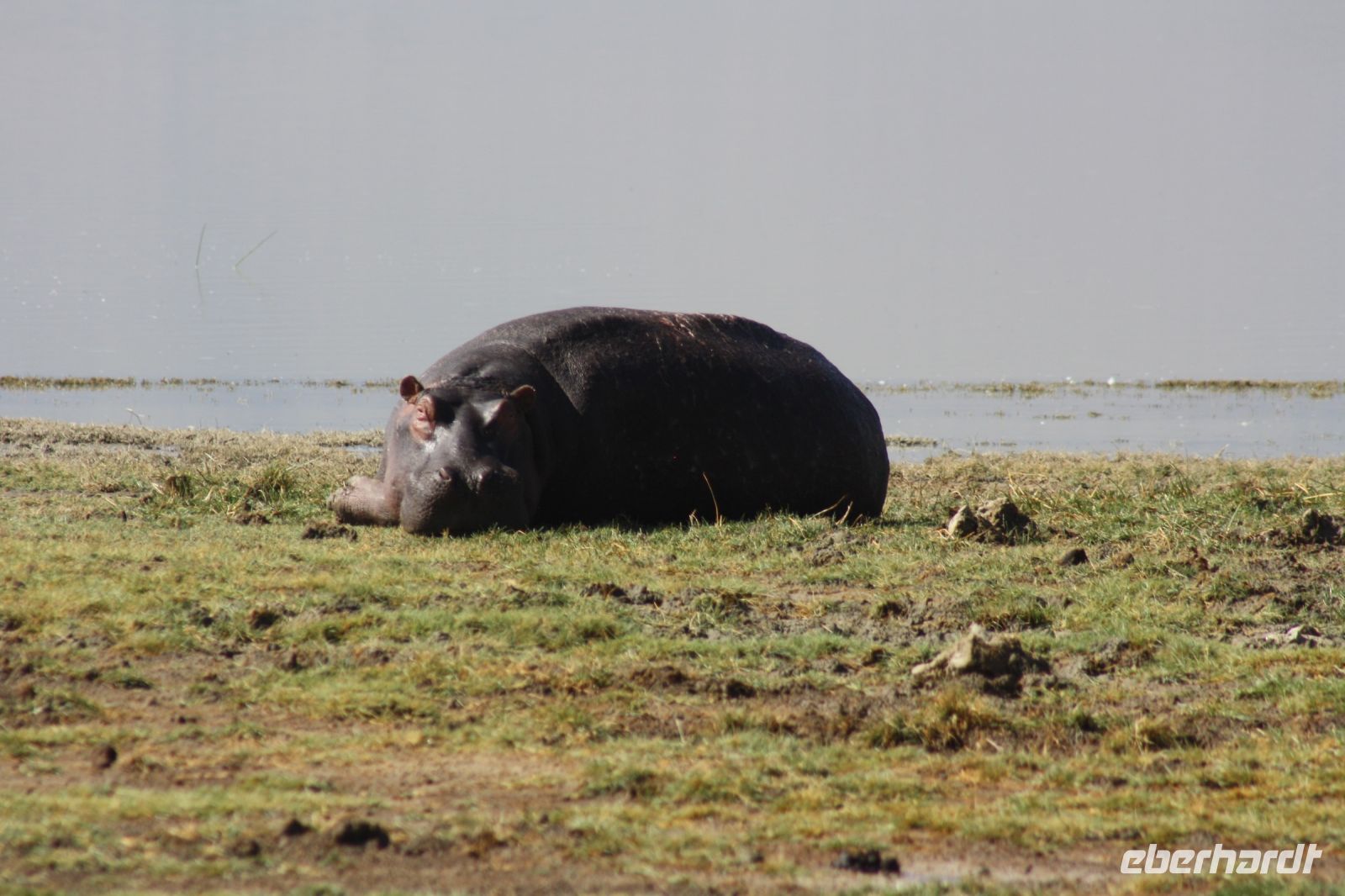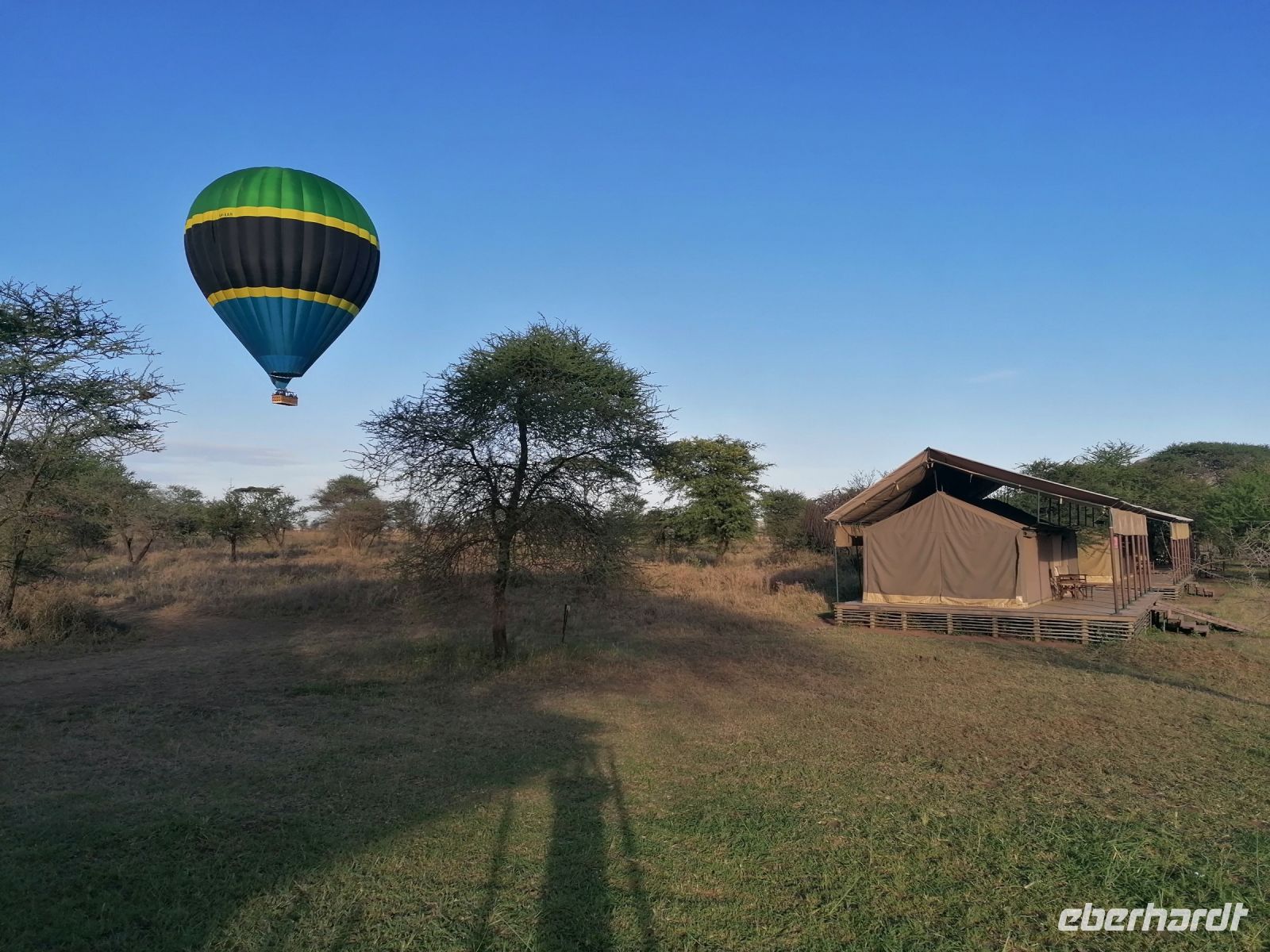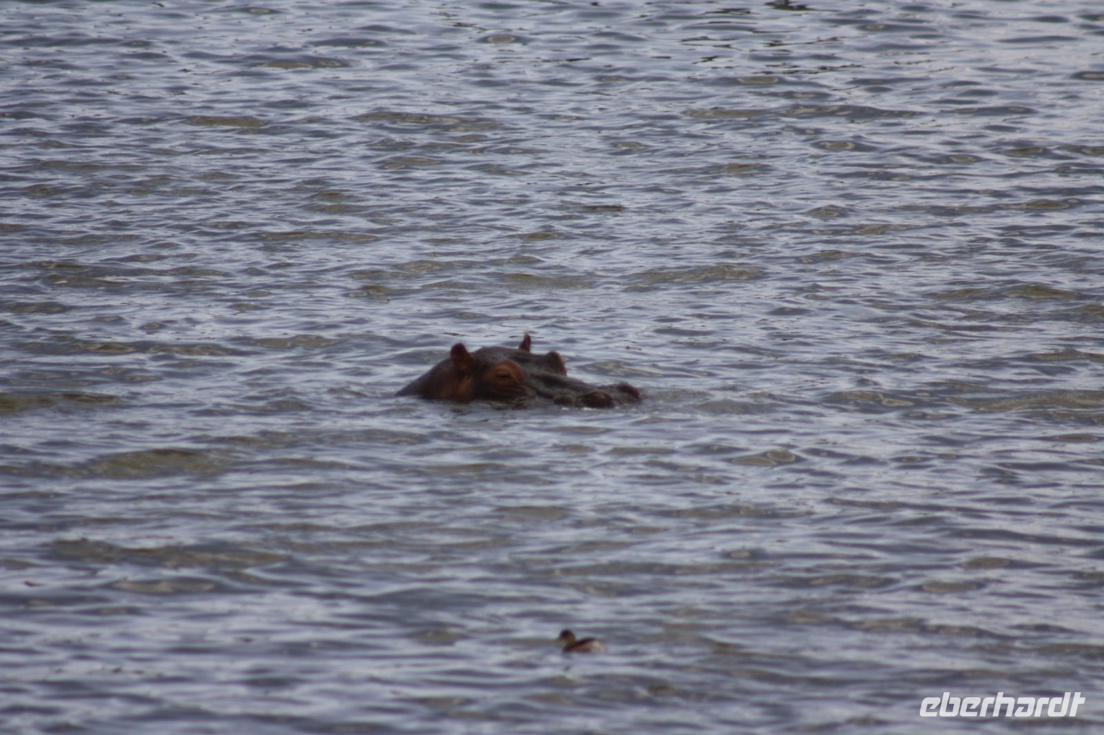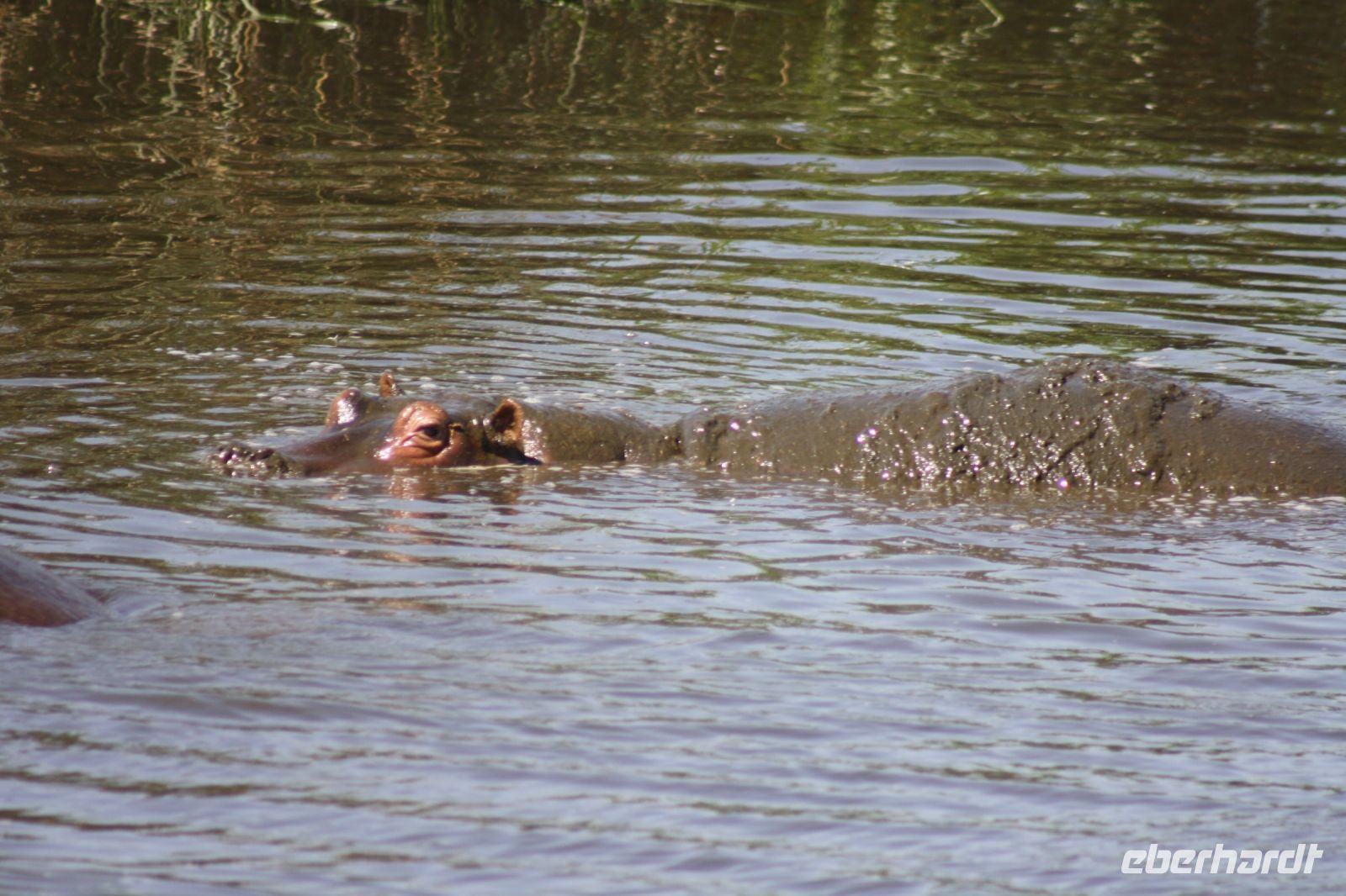 Leider stand heute ein letztes gemeinsames frühes Frühstück auf dem Programm. Leider mussten wir heute Abschied von unserem Lieblingscamp nehmen, wo wir mit viel Herzlichkeit und Gemütlichkeit empfangen wurden. Bevor wir zum Flughafen fuhren, stand noch eine abschließende Pirschfahrt an. Bereits vom Frühstück aus konnten wir einen Hippo entdecken, der an unserem Camp vorbei spaziert. Ein Heißluftballon grüßte uns aus der Ferne und wir bekamen bereits Fernweh.
