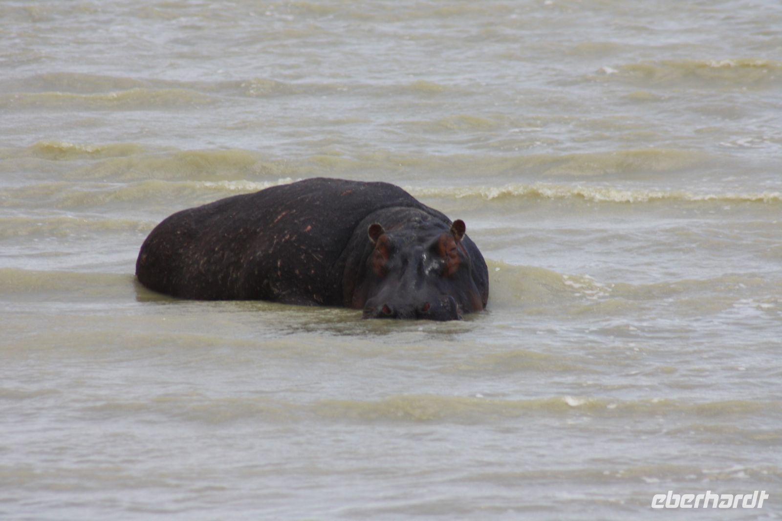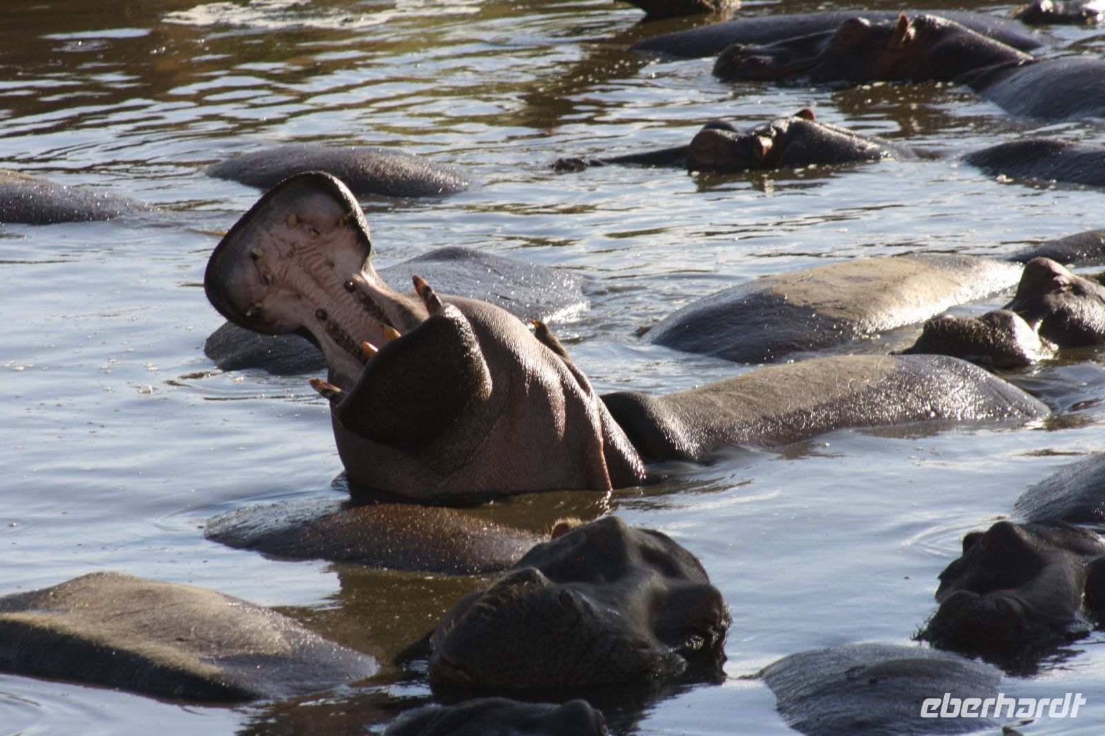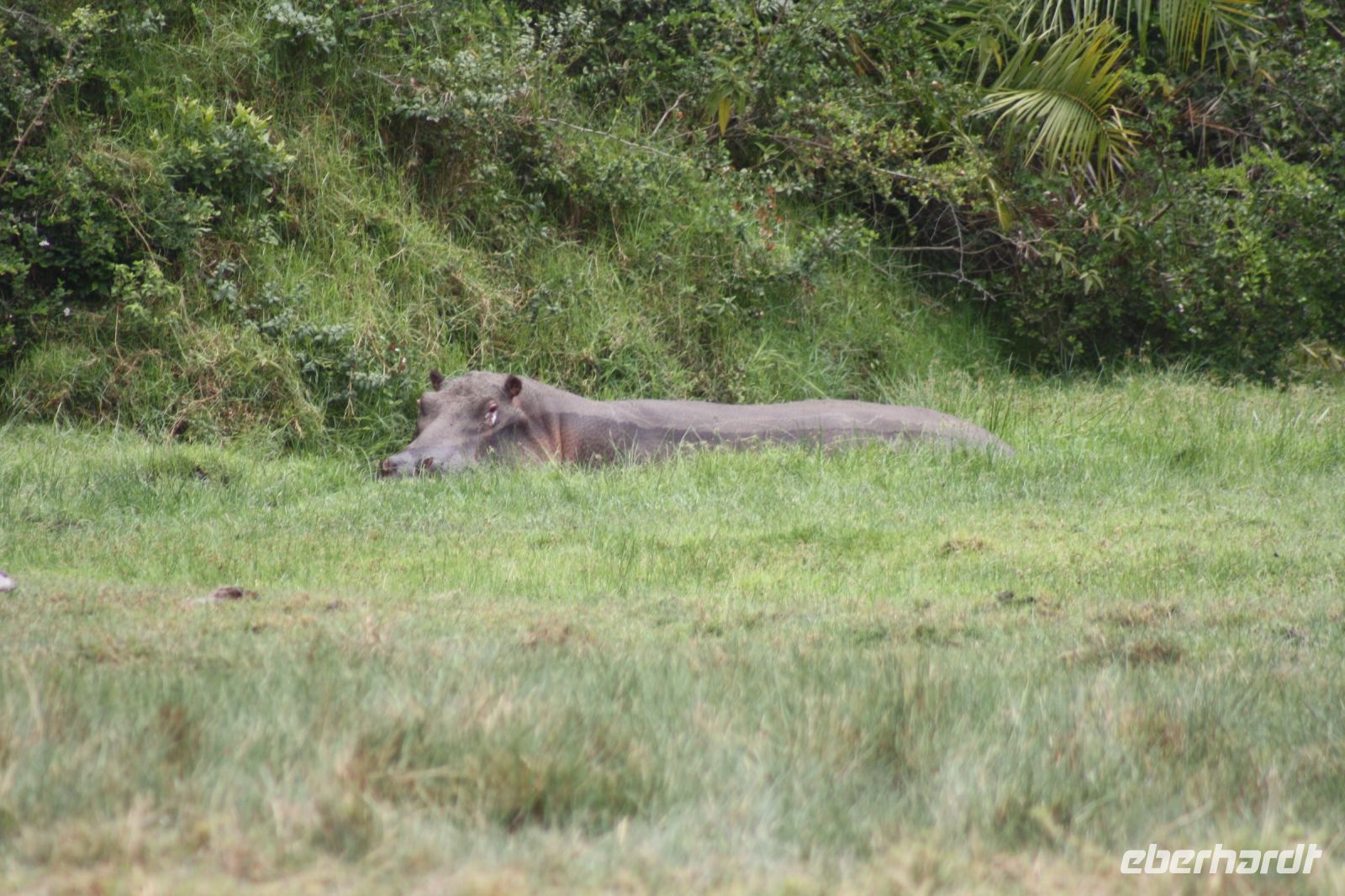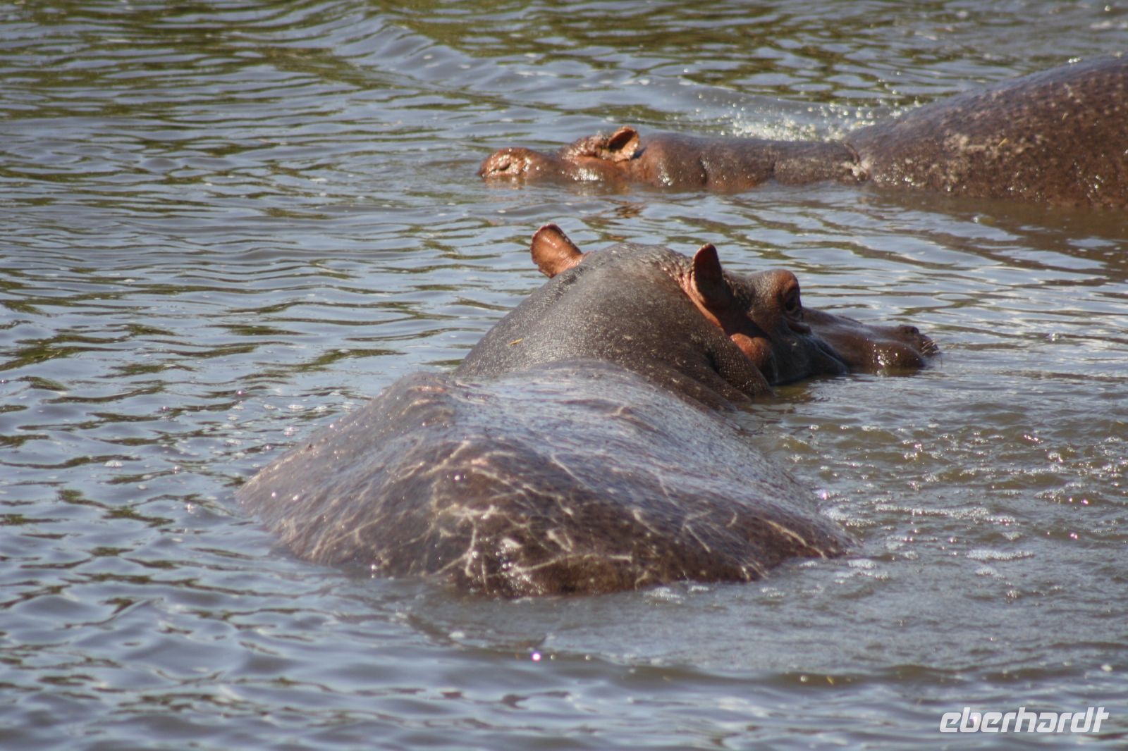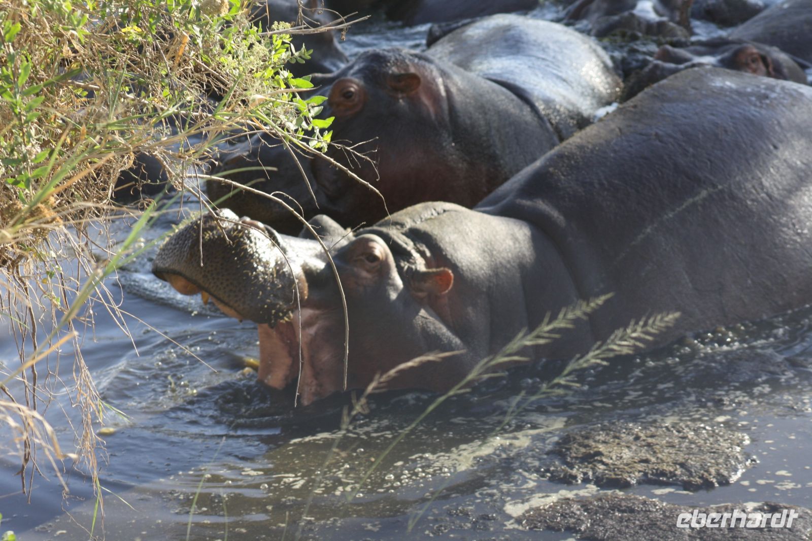 Leider stand heute ein letztes gemeinsames frühes Frühstück auf dem Programm. Leider mussten wir heute Abschied von unserem Lieblingscamp nehmen, wo wir mit viel Herzlichkeit und Gemütlichkeit empfangen wurden. Bevor wir zum Flughafen fuhren, stand noch eine abschließende Pirschfahrt an. Bereits vom Frühstück aus konnten wir einen Hippo entdecken, der an unserem Camp vorbei spaziert. Ein Heißluftballon grüßte uns aus der Ferne und wir bekamen bereits Fernweh.