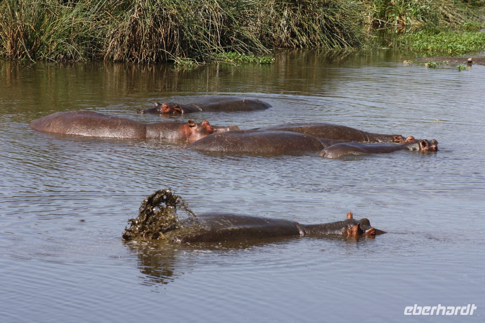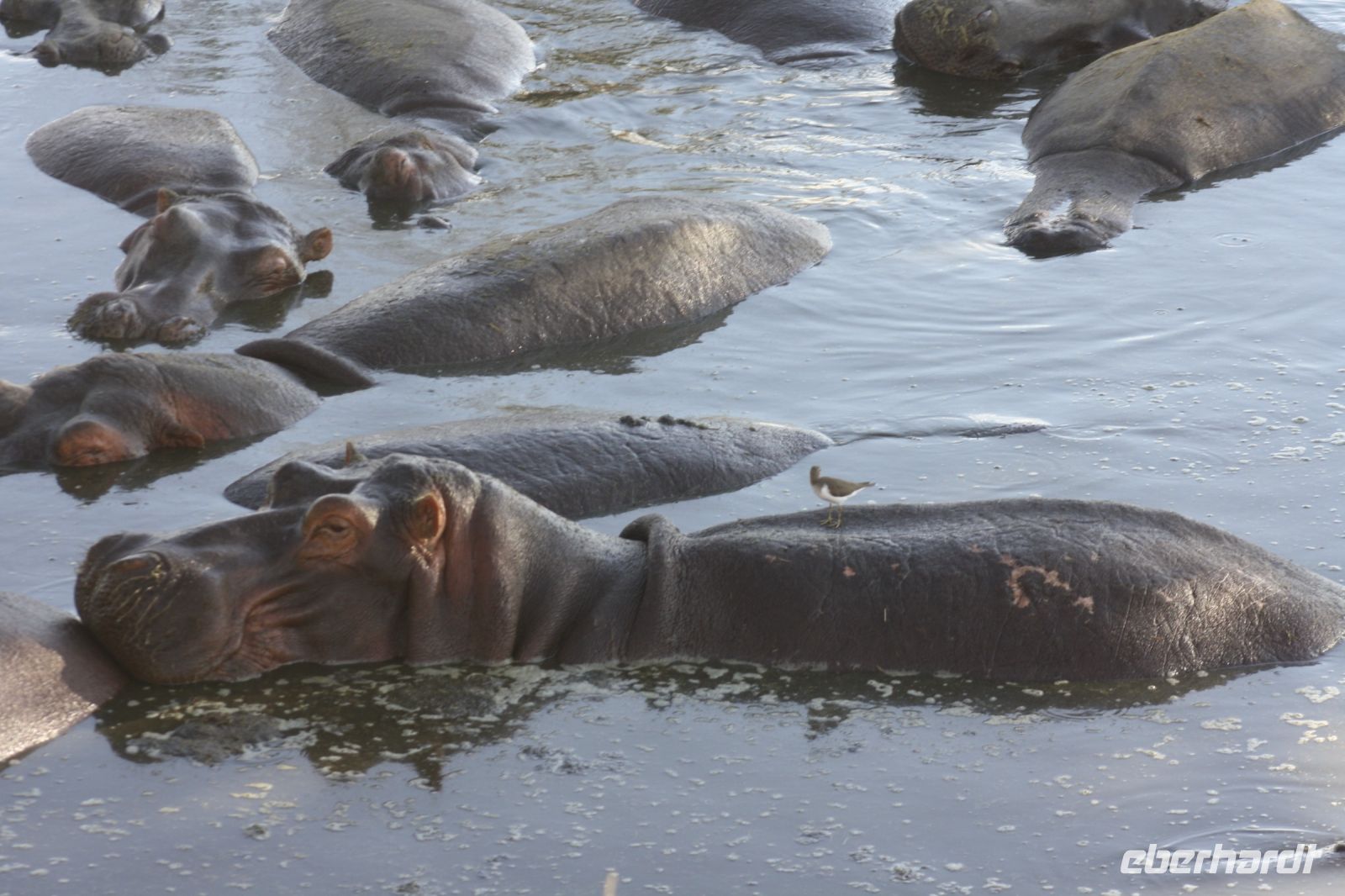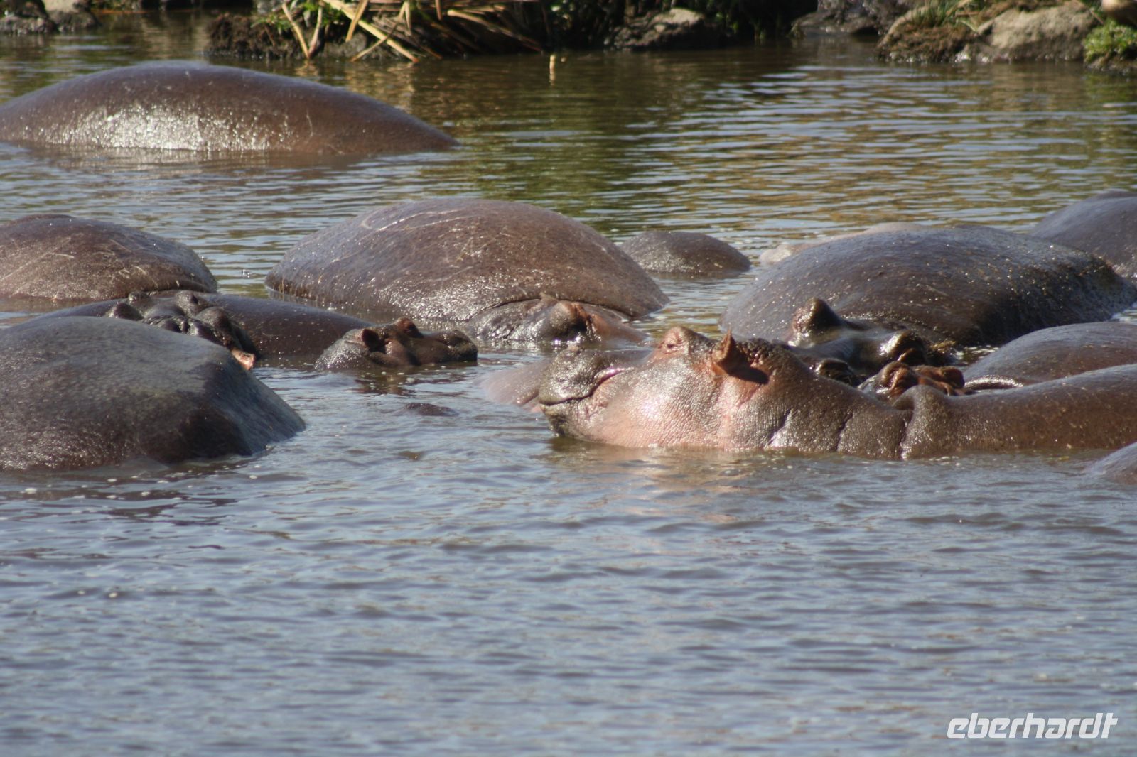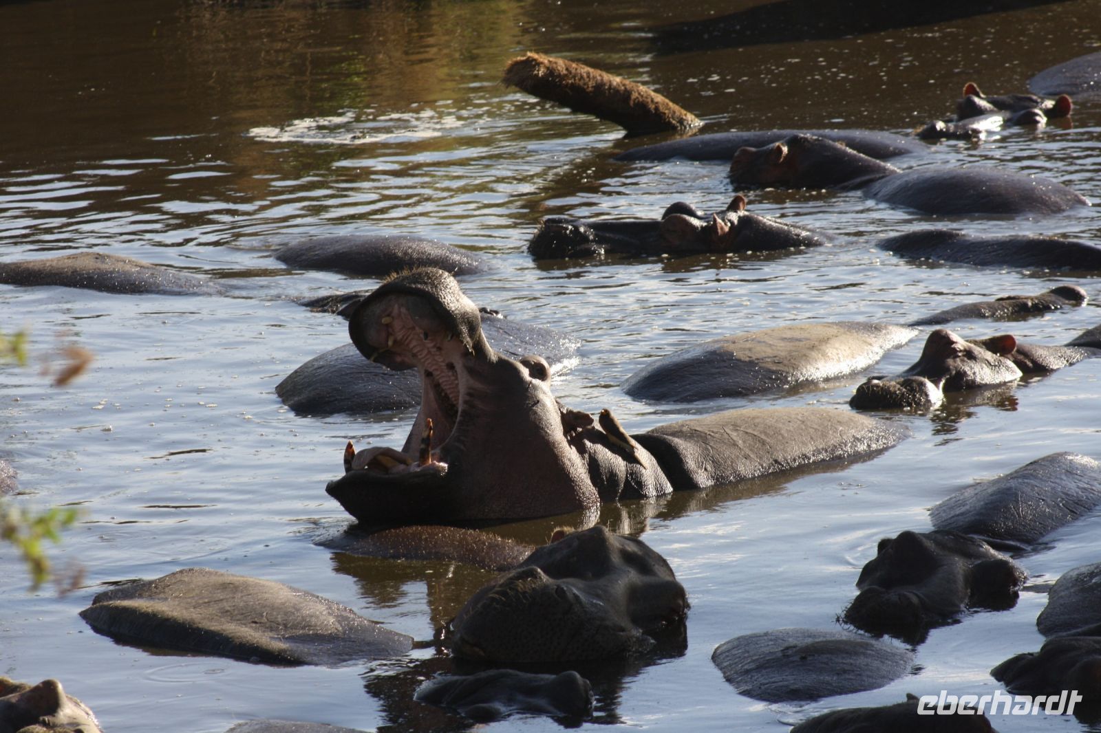 Leider stand heute ein letztes gemeinsames frühes Frühstück auf dem Programm. Leider mussten wir heute Abschied von unserem Lieblingscamp nehmen, wo wir mit viel Herzlichkeit und Gemütlichkeit empfangen wurden. Bevor wir zum Flughafen fuhren, stand noch eine abschließende Pirschfahrt an. Bereits vom Frühstück aus konnten wir einen Hippo entdecken, der an unserem Camp vorbei spaziert. Ein Heißluftballon grüßte uns aus der Ferne und wir bekamen bereits Fernweh.