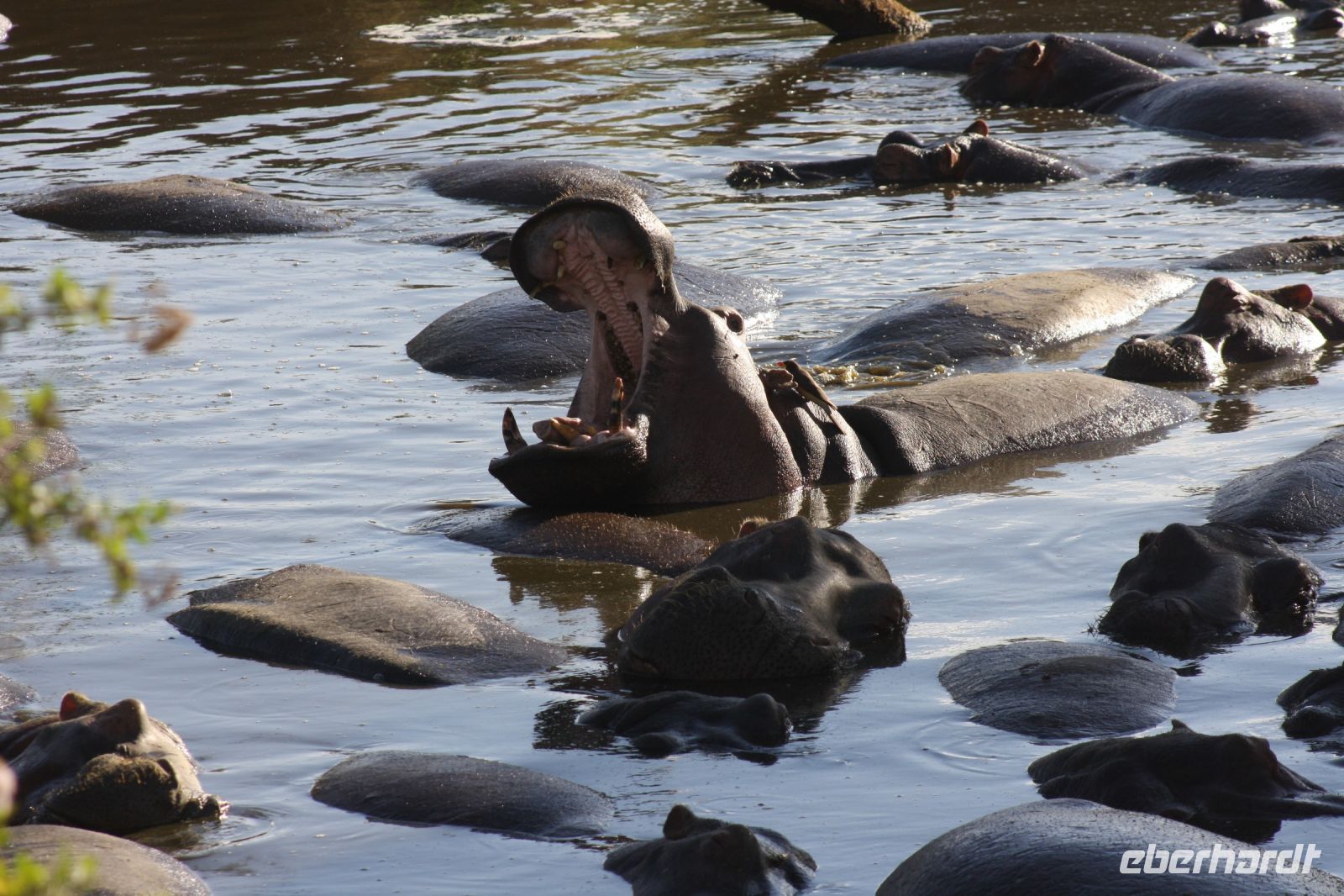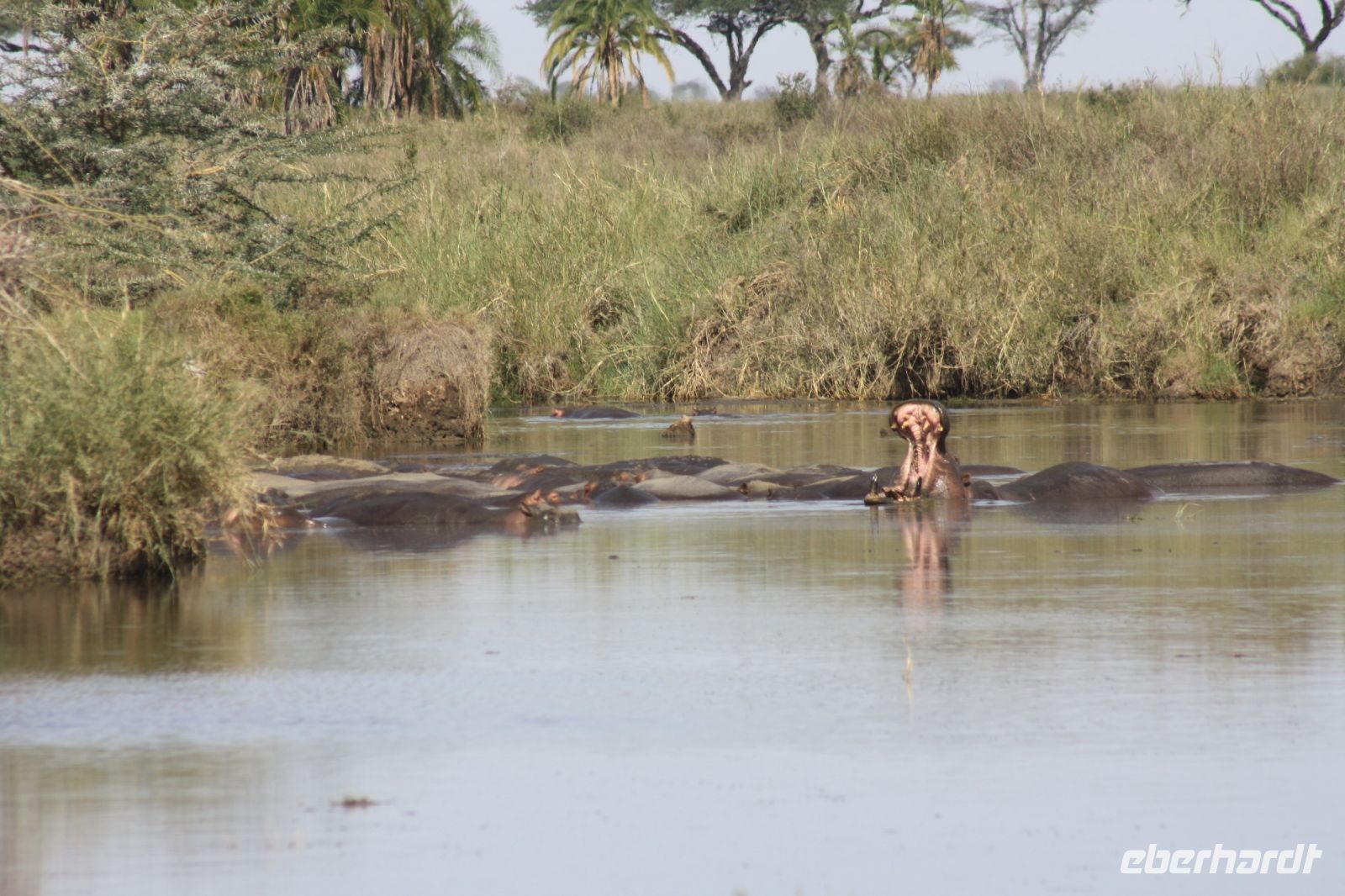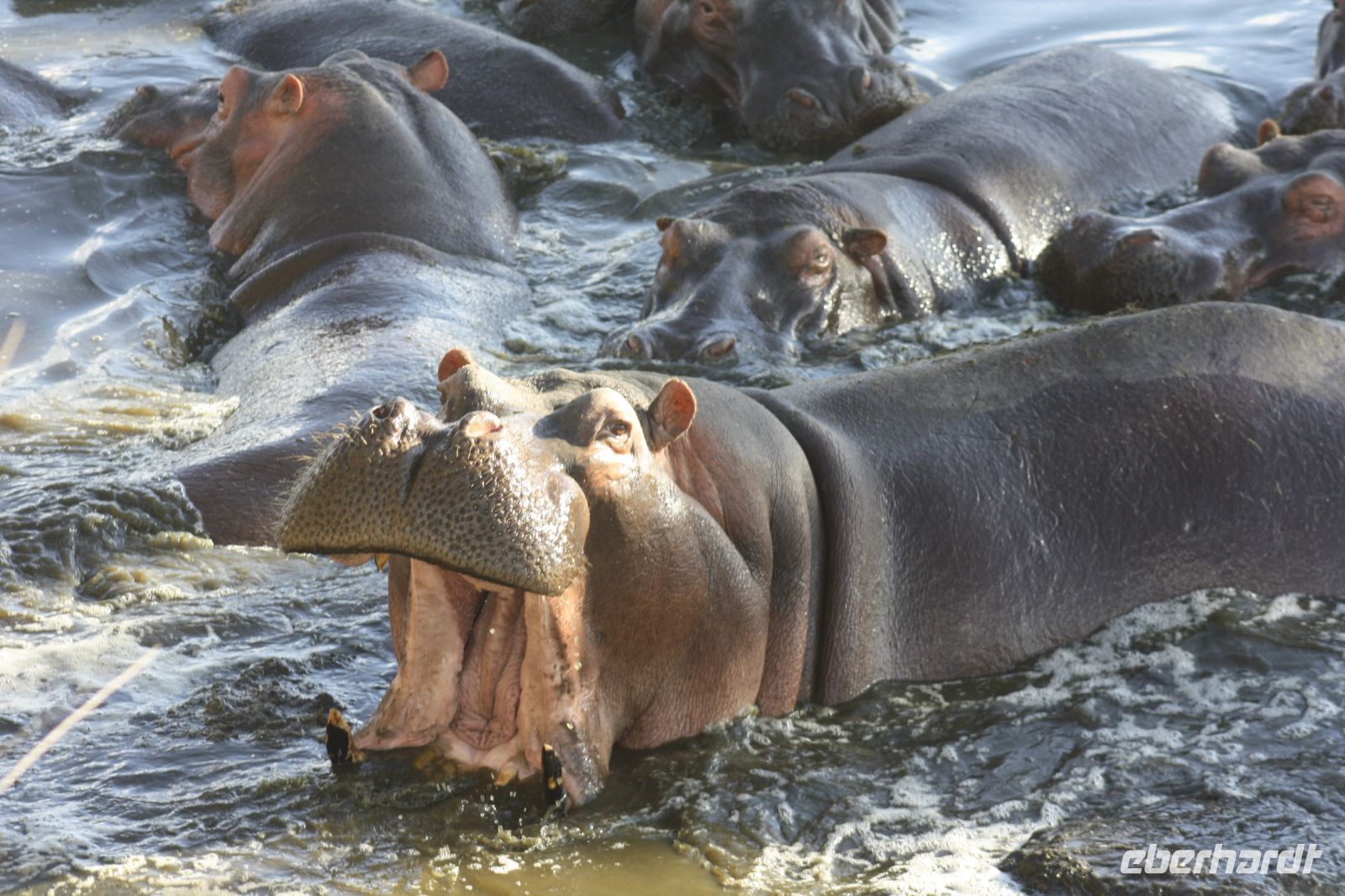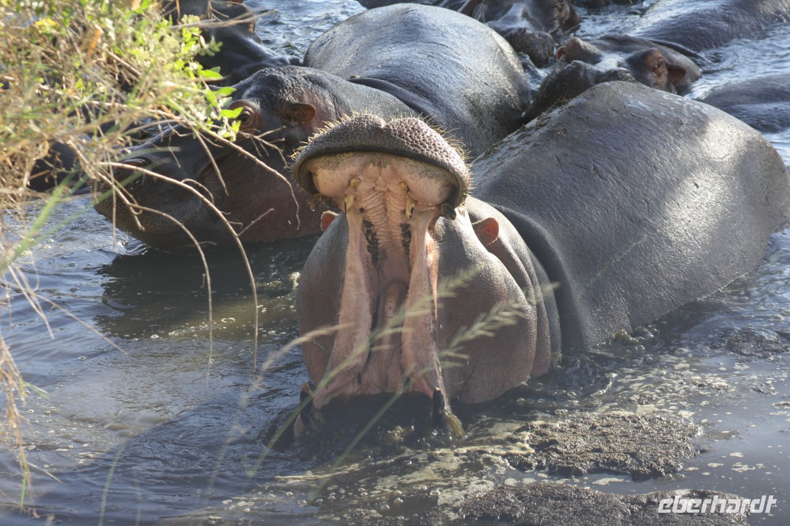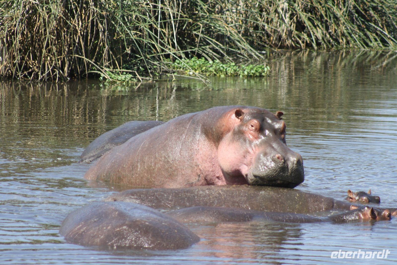 Leider stand heute ein letztes gemeinsames frühes Frühstück auf dem Programm. Leider mussten wir heute Abschied von unserem Lieblingscamp nehmen, wo wir mit viel Herzlichkeit und Gemütlichkeit empfangen wurden. Bevor wir zum Flughafen fuhren, stand noch eine abschließende Pirschfahrt an. Bereits vom Frühstück aus konnten wir einen Hippo entdecken, der an unserem Camp vorbei spaziert. Ein Heißluftballon grüßte uns aus der Ferne und wir bekamen bereits Fernweh.
