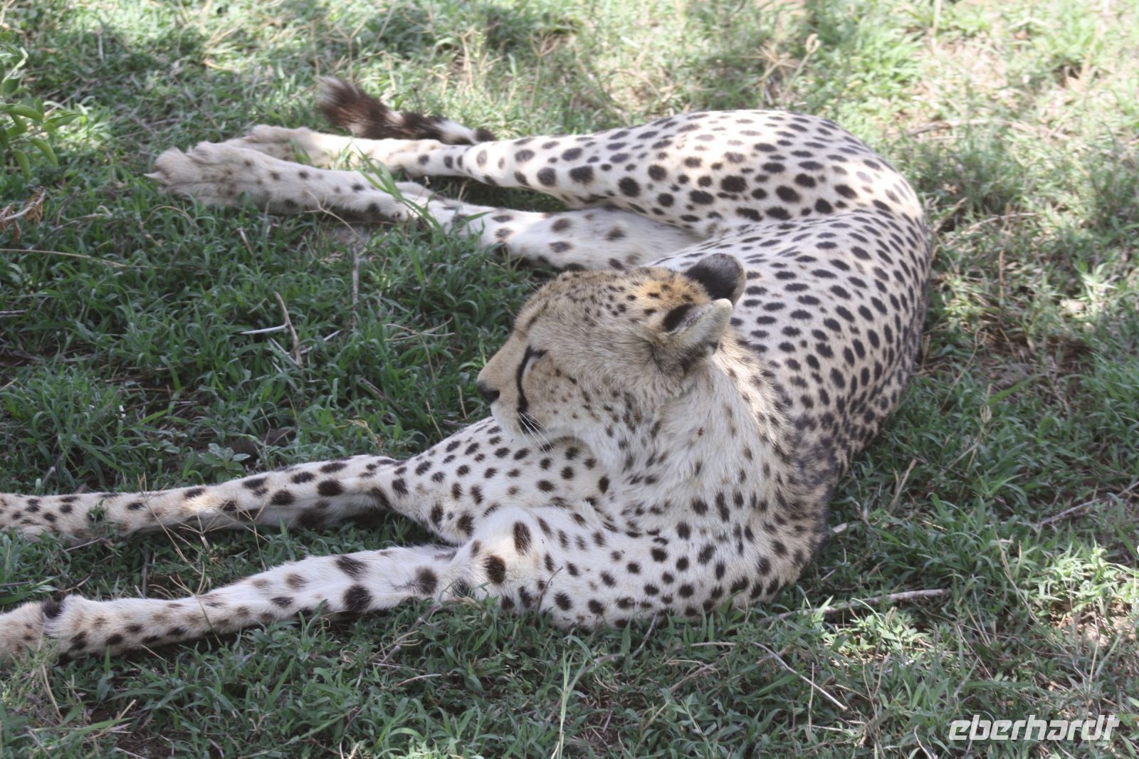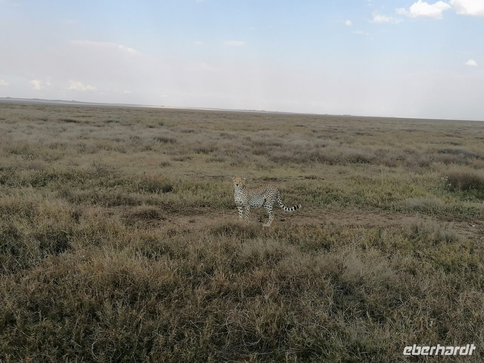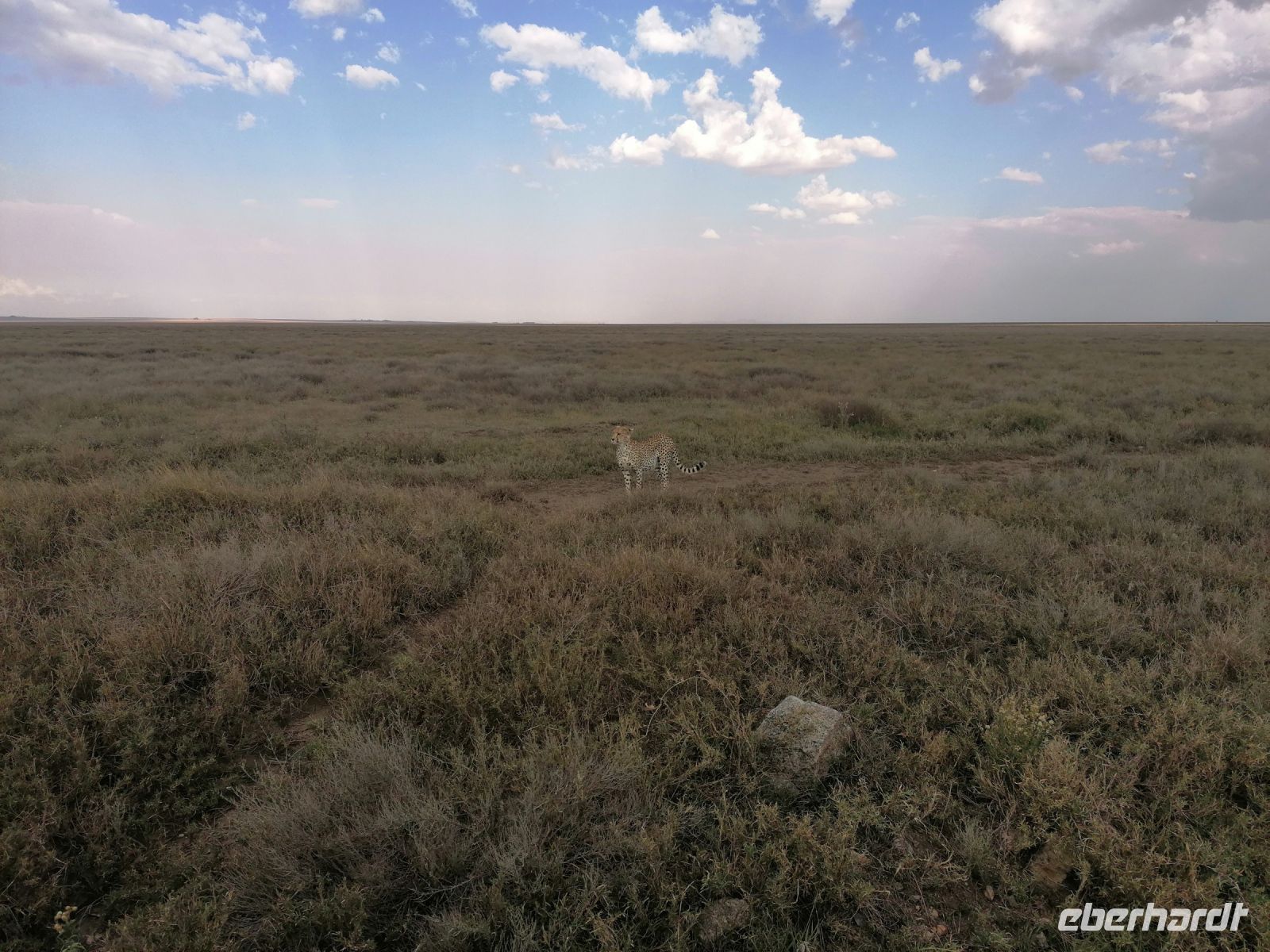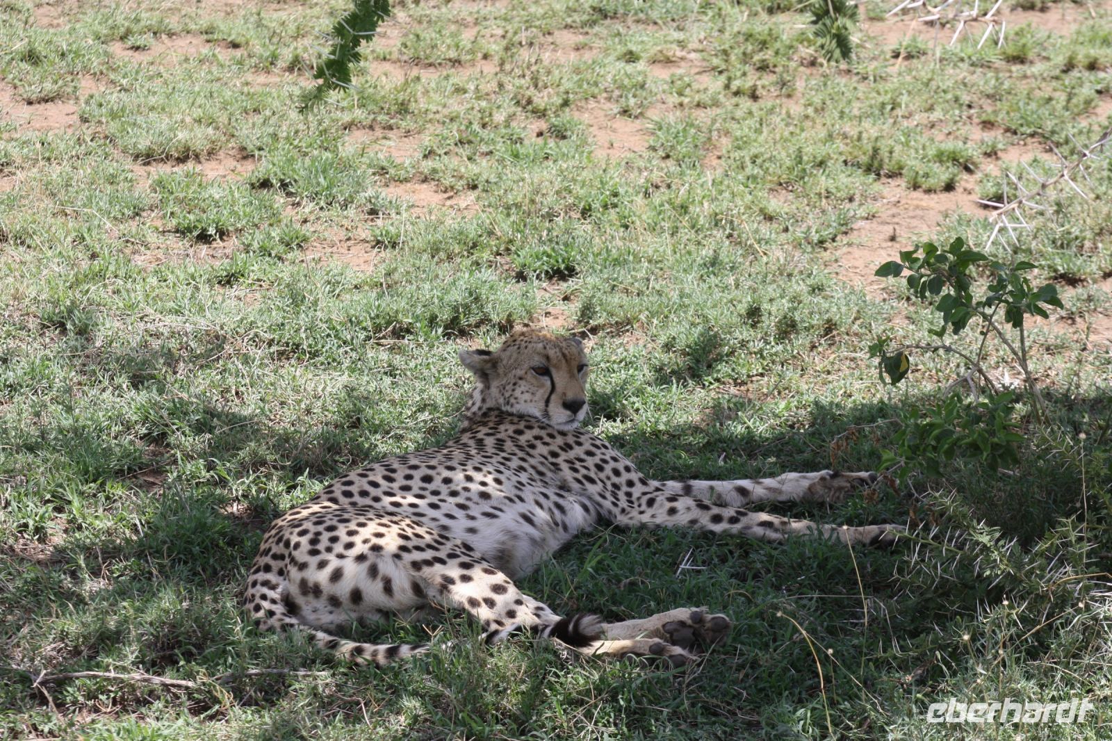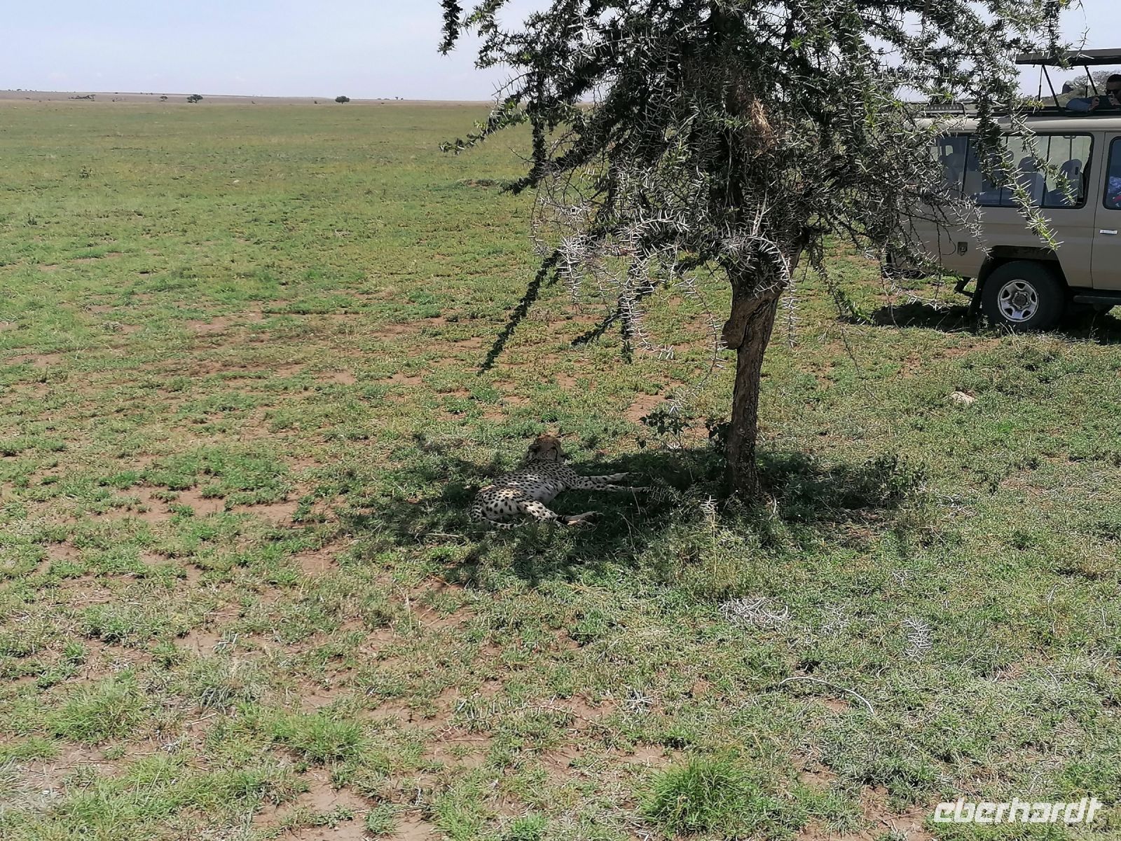 Am letzten in unserem Zeltcamp musste wir zunächst einmal mit einem Stromausfall kämpfen. Nichtsdestotrotz erhielten wir heißen Kaffee und warmes Frühstück. Unser Weg führt uns nochmal in Richtung Ngorongoro Krater und wir hielten kurz am Wochenmarkt. Die Stände werden gerade aufgebaut und Menschen aus den naheliegenden Dörfern erreichten den Markplatz, um zu handeln oder zu verkaufen. Nachdem wir den Markt verlassen hatten, versorgten wir uns an einem weiteren Souvenir Laden mit Mitbringsel. Der Weg verlief nochmal oberhalb des Ngorongoro Kraters bis nach Olduveit. Bereits an der Straße wurde ein neues großes Monument und ein neuer Eingang zum Olduveit Visitor Center gebaut. In der Region wurde bei Ausgrabungen primitive Werkzeuge, Fußabdrücke und menschliche Überreste gefunden. Man fand heraus, dass die ersten Menschen bereits vor 3 Millionen Jahren in der Region wohnten. Das neu angelegte Museum zeigte uns die Geschichte und Entwicklung der Menschheit, die bereits in der frühen Zeit zusammenlebten. Von einem angelegten Bühnen hatten wir einen fantastischen Blick in die beeindruckende tiefe Schlucht, wo die Ausgrabungen erfolgten. Hier konnten wir auch unsere Mittagspause und die Lunchbox genießen. Am Anschluss besuchten wir ein Dorf der Masai. Die Mitglieder dieses Stammes leben immer noch völlig traditionell in ihren Dörfern und hausten in Lehmhütten. Die Kinder und Männer arbeiten als Hirten und kümmern sich um die Tiere. Die Frau kochen, sammeln Holz und suchen nach Wasser. Wir werden zunächst von den Dorfbewohnern in ihrer bunten Kleidung und dem üppigen Perlenschmuck mit einem traditionellen Lied empfangen. Im Anschluss folgte eine Vorführung des Tanzes, womit die Männer mit den typischen hohen Sprüngen der bekannt wurden. Nach dem Tanz werden wir durch das Dorf geführt. Der Sohn des Häuptlings lud uns in seine Lehmhütte ein und wir könnten einen Eindruck gewinnen, wie die Masai auf kleinsten Raum lebten. Zum Schluss besuchten wir noch den Kindergarten des Dorfes. Hier lernen die 3-5jährigen Kinder bereits das Alphabet und die Zahlen bis Einhundert. Auch die Kinder begrüßen uns mit einem fröhlichen Lied und erwärmten unsere Herzen. Am Nachmittag erreichten wir das südliche Tor der Serengeti. Den Ort den die Masai den großen endlosen Weit nennen. Endlich waren wir im Serengeti Nationalpark angekommen. Wir freuten uns auf die nächsten Tage. Nach nur wenigen Kilometern fielen wir fast schon aus den Sitzen. Was ein Glück, denn als ersten Tier in der Serengeti sahen wir 2 männlichen Geparden. Die männliche Geparden sind meist in Gruppen zusammen, wobei die Weibchen immer alleine spazieren. Im Anschluss trafen wir auf großen Gruppen von Antilopen und Zebras. Ein Riesenkorid, der schwerste fliegende Vogel in Afrika blickten uns vom Wegrand an und Elefant fraßen in aller Ruhe in unserer Nähe. Nach nur wenigen Minuten waren wir stark beeindruckt von der Serengeti. Kurze Zeit später entdeckten wir zwei schlafende Löwen, die vermutlich gerade gegessen hatte. Im Hintergrund lauerten Hyänen und hofften sich einen Teil der Beute erbeuten zu können. Auf dem Weg zur Lodge konnten wir vier Löwinnen und 1 Löwe unterm Baum entdecken. Auch diese hatte gefressen, aber guckten ab und zu in die Kamera. Am Abend erreichten wir unser Camp, wo wir freundlich und herzlich empfangen wurden.