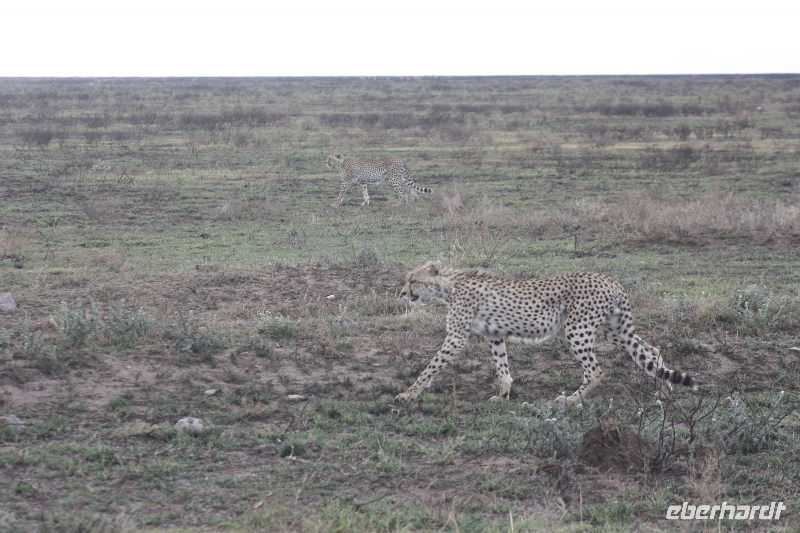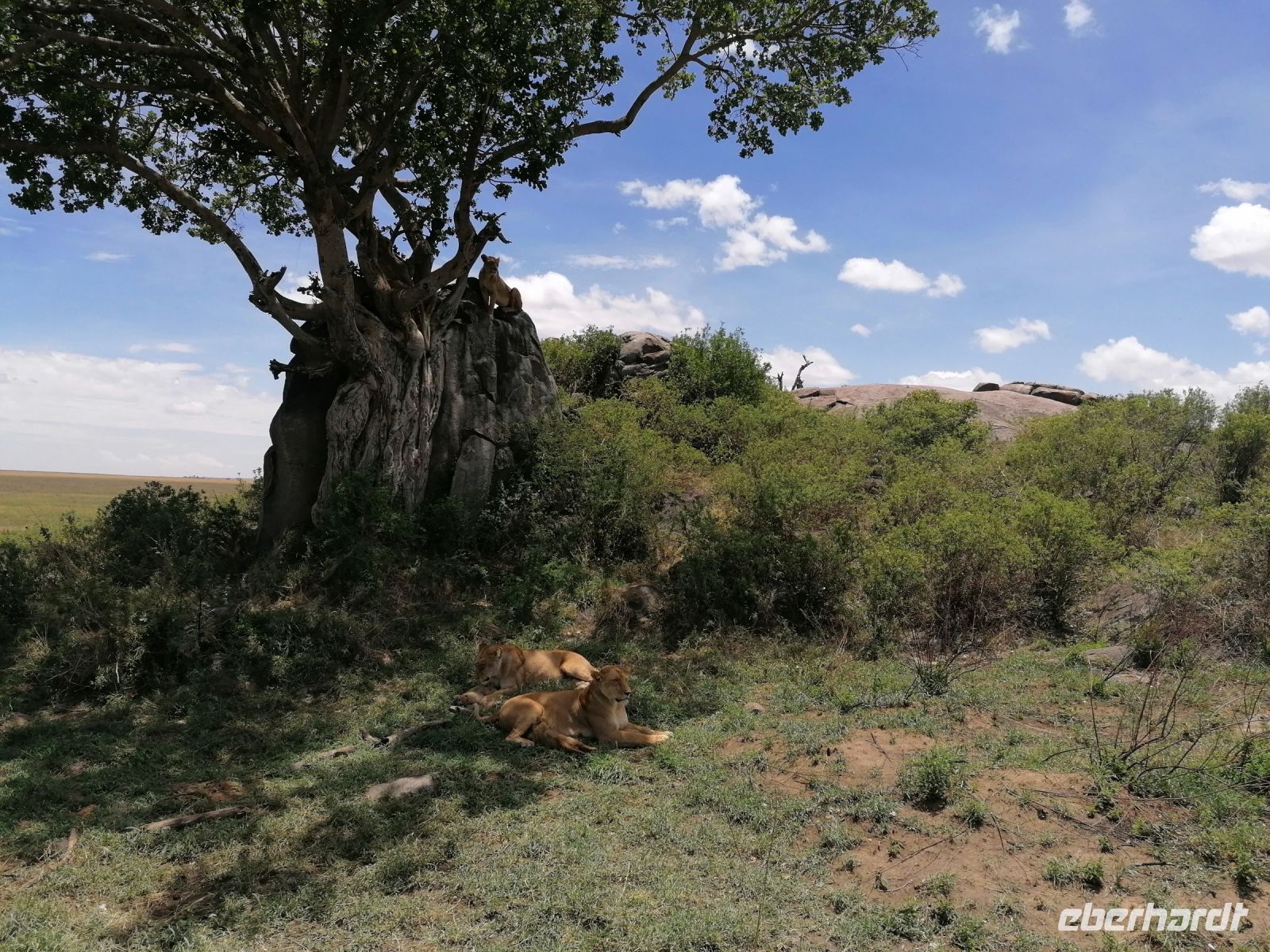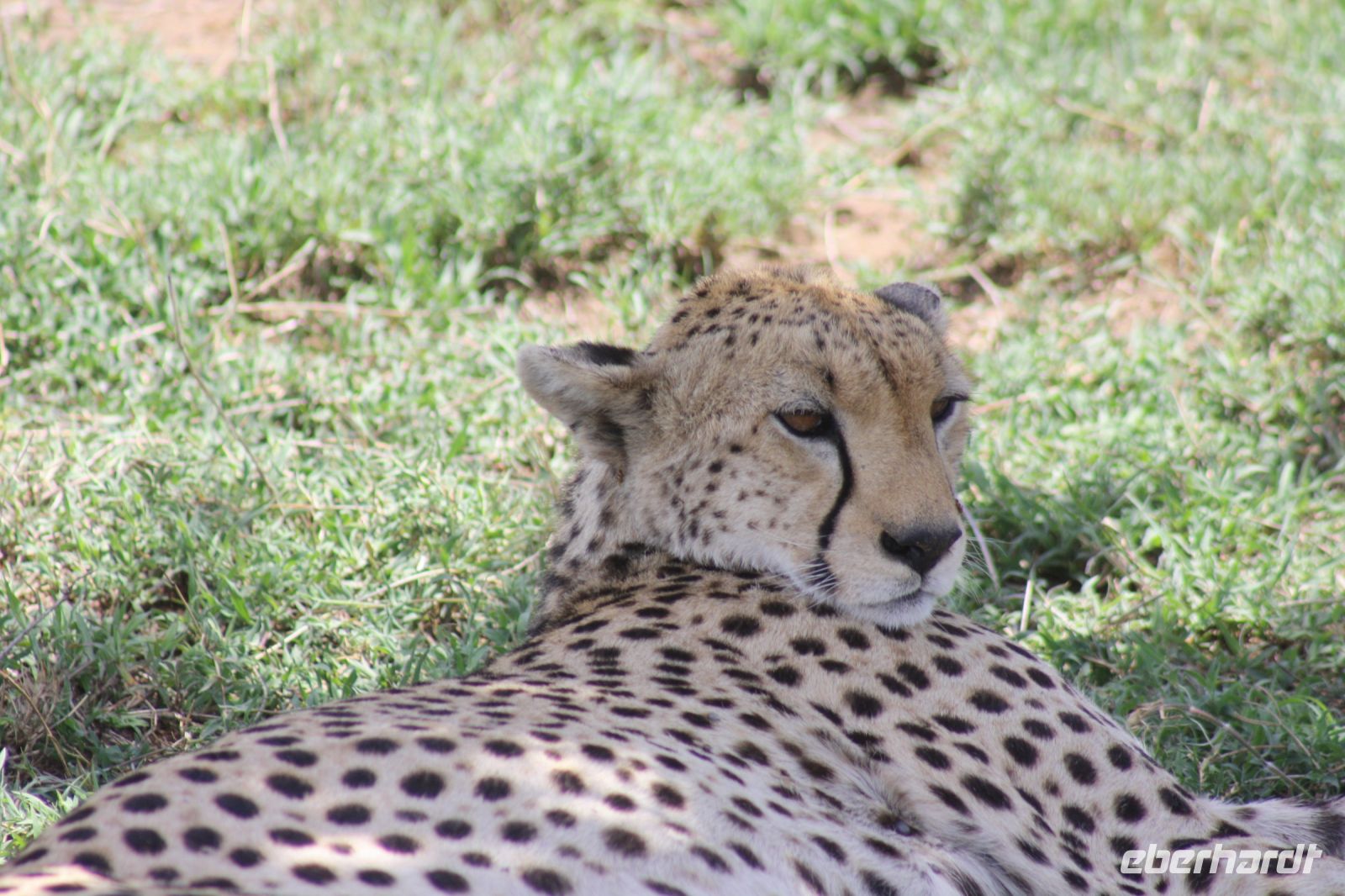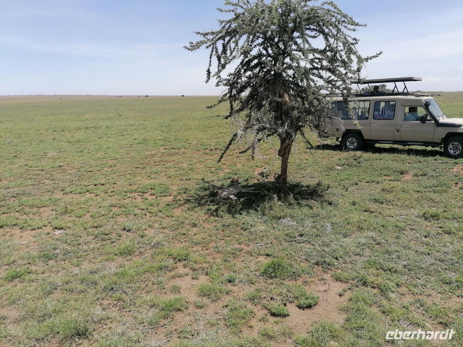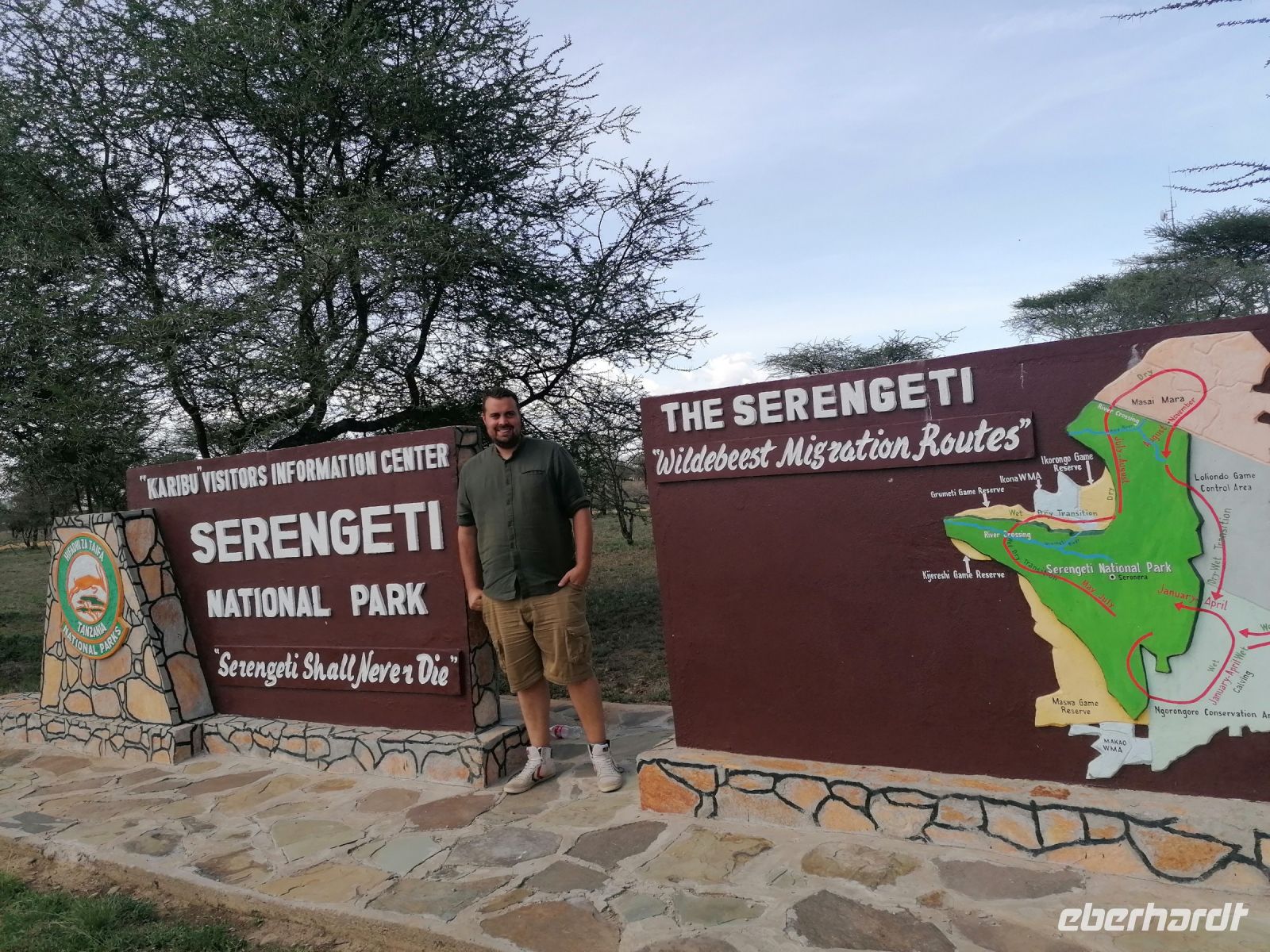 Am letzten in unserem Zeltcamp musste wir zunächst einmal mit einem Stromausfall kämpfen. Nichtsdestotrotz erhielten wir heißen Kaffee und warmes Frühstück. Unser Weg führt uns nochmal in Richtung Ngorongoro Krater und wir hielten kurz am Wochenmarkt. Die Stände werden gerade aufgebaut und Menschen aus den naheliegenden Dörfern erreichten den Markplatz, um zu handeln oder zu verkaufen. Nachdem wir den Markt verlassen hatten, versorgten wir uns an einem weiteren Souvenir Laden mit Mitbringsel. Der Weg verlief nochmal oberhalb des Ngorongoro Kraters bis nach Olduveit. Bereits an der Straße wurde ein neues großes Monument und ein neuer Eingang zum Olduveit Visitor Center gebaut. In der Region wurde bei Ausgrabungen primitive Werkzeuge, Fußabdrücke und menschliche Überreste gefunden. Man fand heraus, dass die ersten Menschen bereits vor 3 Millionen Jahren in der Region wohnten. Das neu angelegte Museum zeigte uns die Geschichte und Entwicklung der Menschheit, die bereits in der frühen Zeit zusammenlebten. Von einem angelegten Bühnen hatten wir einen fantastischen Blick in die beeindruckende tiefe Schlucht, wo die Ausgrabungen erfolgten. Hier konnten wir auch unsere Mittagspause und die Lunchbox genießen. Am Anschluss besuchten wir ein Dorf der Masai. Die Mitglieder dieses Stammes leben immer noch völlig traditionell in ihren Dörfern und hausten in Lehmhütten. Die Kinder und Männer arbeiten als Hirten und kümmern sich um die Tiere. Die Frau kochen, sammeln Holz und suchen nach Wasser. Wir werden zunächst von den Dorfbewohnern in ihrer bunten Kleidung und dem üppigen Perlenschmuck mit einem traditionellen Lied empfangen. Im Anschluss folgte eine Vorführung des Tanzes, womit die Männer mit den typischen hohen Sprüngen der bekannt wurden. Nach dem Tanz werden wir durch das Dorf geführt. Der Sohn des Häuptlings lud uns in seine Lehmhütte ein und wir könnten einen Eindruck gewinnen, wie die Masai auf kleinsten Raum lebten. Zum Schluss besuchten wir noch den Kindergarten des Dorfes. Hier lernen die 3-5jährigen Kinder bereits das Alphabet und die Zahlen bis Einhundert. Auch die Kinder begrüßen uns mit einem fröhlichen Lied und erwärmten unsere Herzen. Am Nachmittag erreichten wir das südliche Tor der Serengeti. Den Ort den die Masai den großen endlosen Weit nennen. Endlich waren wir im Serengeti Nationalpark angekommen. Wir freuten uns auf die nächsten Tage. Nach nur wenigen Kilometern fielen wir fast schon aus den Sitzen. Was ein Glück, denn als ersten Tier in der Serengeti sahen wir 2 männlichen Geparden. Die männliche Geparden sind meist in Gruppen zusammen, wobei die Weibchen immer alleine spazieren. Im Anschluss trafen wir auf großen Gruppen von Antilopen und Zebras. Ein Riesenkorid, der schwerste fliegende Vogel in Afrika blickten uns vom Wegrand an und Elefant fraßen in aller Ruhe in unserer Nähe. Nach nur wenigen Minuten waren wir stark beeindruckt von der Serengeti. Kurze Zeit später entdeckten wir zwei schlafende Löwen, die vermutlich gerade gegessen hatte. Im Hintergrund lauerten Hyänen und hofften sich einen Teil der Beute erbeuten zu können. Auf dem Weg zur Lodge konnten wir vier Löwinnen und 1 Löwe unterm Baum entdecken. Auch diese hatte gefressen, aber guckten ab und zu in die Kamera. Am Abend erreichten wir unser Camp, wo wir freundlich und herzlich empfangen wurden.