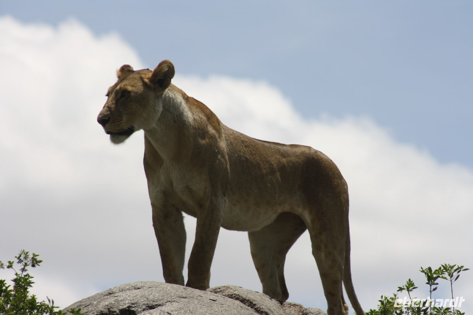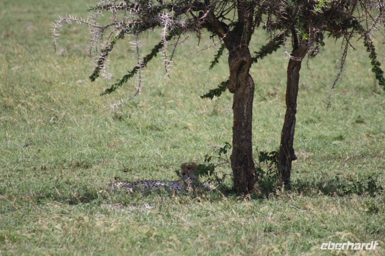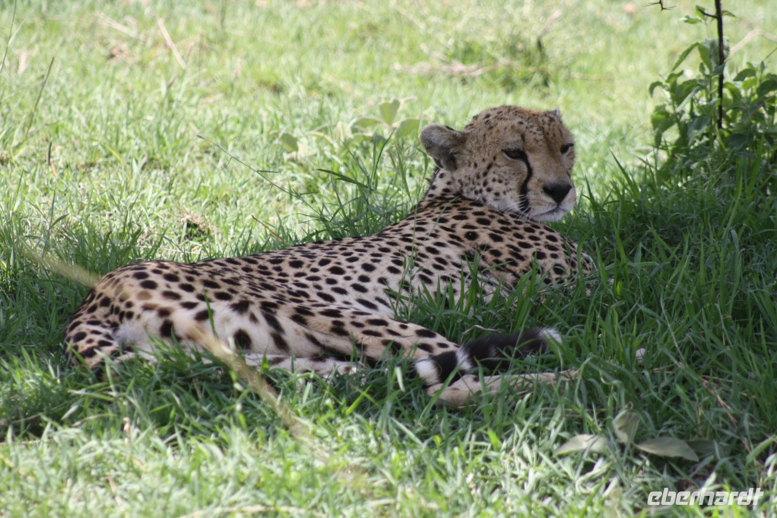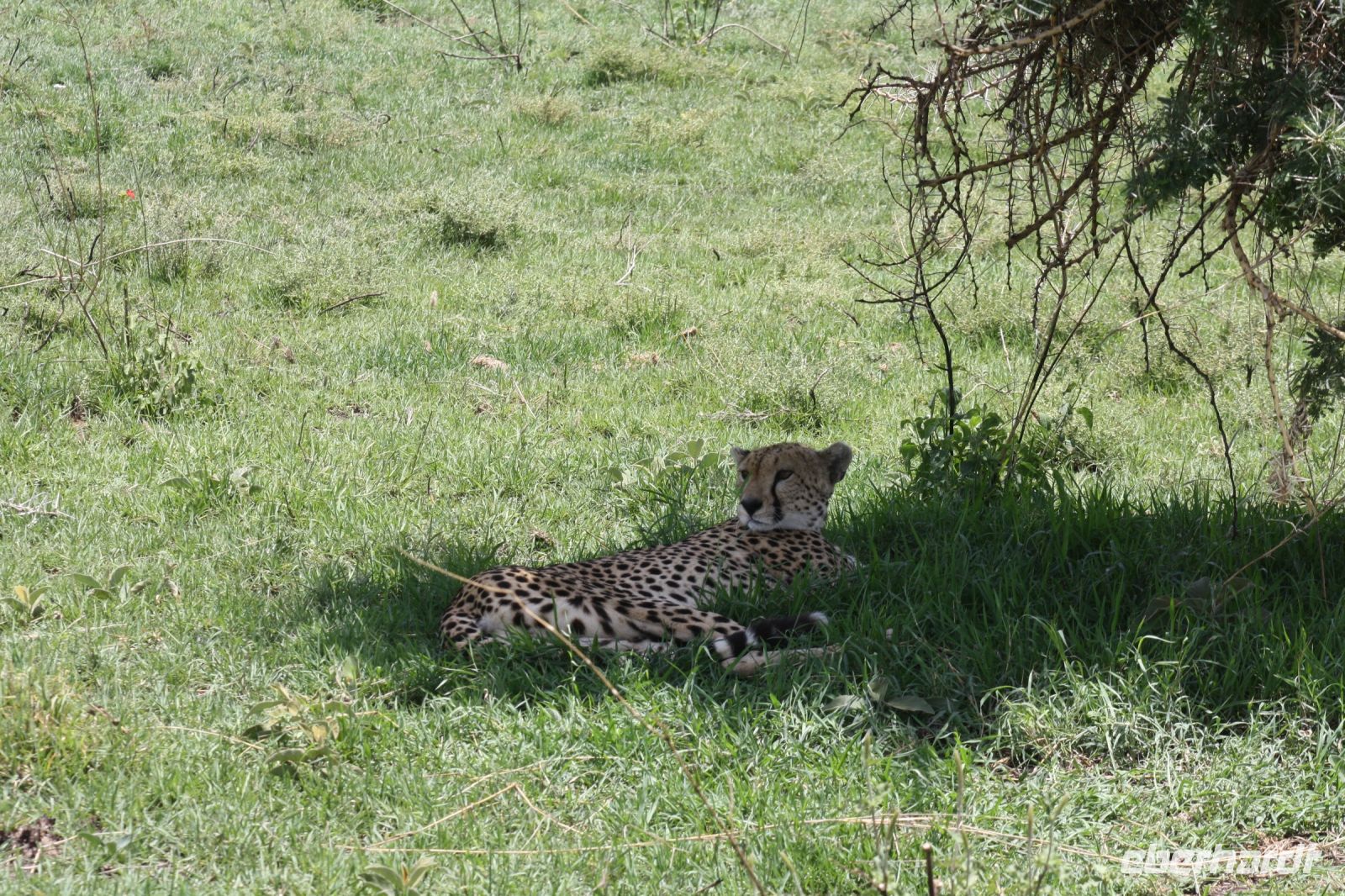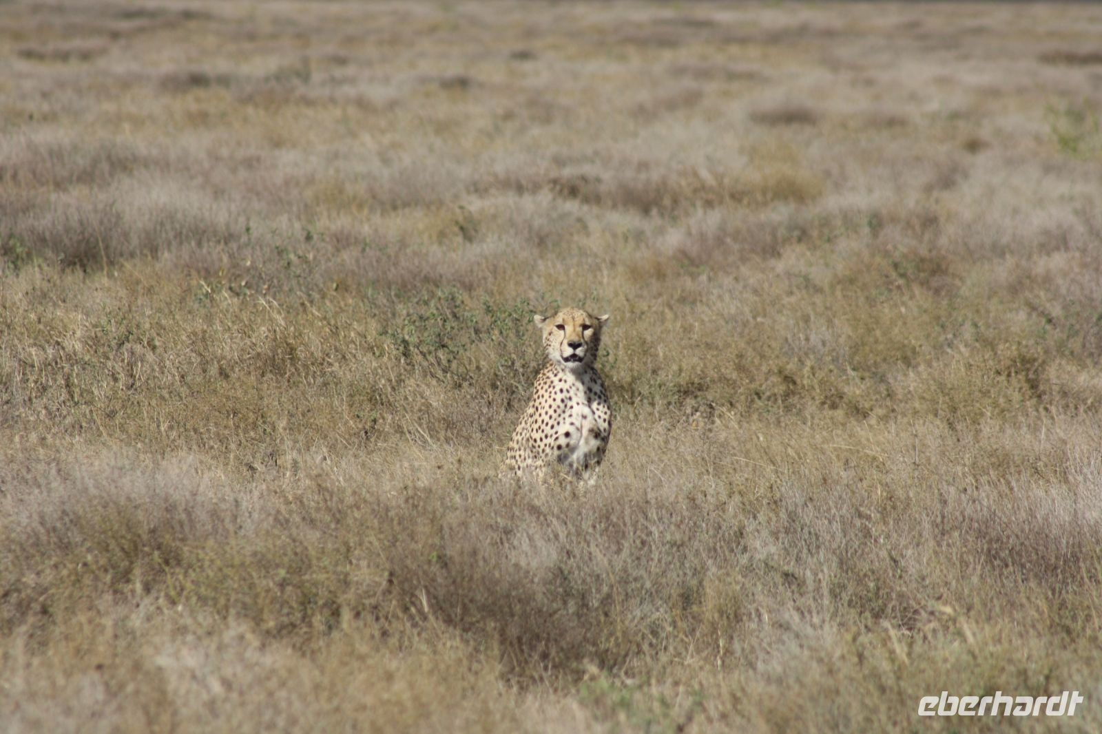 Am letzten in unserem Zeltcamp musste wir zunächst einmal mit einem Stromausfall kämpfen. Nichtsdestotrotz erhielten wir heißen Kaffee und warmes Frühstück. Unser Weg führt uns nochmal in Richtung Ngorongoro Krater und wir hielten kurz am Wochenmarkt. Die Stände werden gerade aufgebaut und Menschen aus den naheliegenden Dörfern erreichten den Markplatz, um zu handeln oder zu verkaufen. Nachdem wir den Markt verlassen hatten, versorgten wir uns an einem weiteren Souvenir Laden mit Mitbringsel. Der Weg verlief nochmal oberhalb des Ngorongoro Kraters bis nach Olduveit. Bereits an der Straße wurde ein neues großes Monument und ein neuer Eingang zum Olduveit Visitor Center gebaut. In der Region wurde bei Ausgrabungen primitive Werkzeuge, Fußabdrücke und menschliche Überreste gefunden. Man fand heraus, dass die ersten Menschen bereits vor 3 Millionen Jahren in der Region wohnten. Das neu angelegte Museum zeigte uns die Geschichte und Entwicklung der Menschheit, die bereits in der frühen Zeit zusammenlebten. Von einem angelegten Bühnen hatten wir einen fantastischen Blick in die beeindruckende tiefe Schlucht, wo die Ausgrabungen erfolgten. Hier konnten wir auch unsere Mittagspause und die Lunchbox genießen. Am Anschluss besuchten wir ein Dorf der Masai. Die Mitglieder dieses Stammes leben immer noch völlig traditionell in ihren Dörfern und hausten in Lehmhütten. Die Kinder und Männer arbeiten als Hirten und kümmern sich um die Tiere. Die Frau kochen, sammeln Holz und suchen nach Wasser. Wir werden zunächst von den Dorfbewohnern in ihrer bunten Kleidung und dem üppigen Perlenschmuck mit einem traditionellen Lied empfangen. Im Anschluss folgte eine Vorführung des Tanzes, womit die Männer mit den typischen hohen Sprüngen der bekannt wurden. Nach dem Tanz werden wir durch das Dorf geführt. Der Sohn des Häuptlings lud uns in seine Lehmhütte ein und wir könnten einen Eindruck gewinnen, wie die Masai auf kleinsten Raum lebten. Zum Schluss besuchten wir noch den Kindergarten des Dorfes. Hier lernen die 3-5jährigen Kinder bereits das Alphabet und die Zahlen bis Einhundert. Auch die Kinder begrüßen uns mit einem fröhlichen Lied und erwärmten unsere Herzen. Am Nachmittag erreichten wir das südliche Tor der Serengeti. Den Ort den die Masai den großen endlosen Weit nennen. Endlich waren wir im Serengeti Nationalpark angekommen. Wir freuten uns auf die nächsten Tage. Nach nur wenigen Kilometern fielen wir fast schon aus den Sitzen. Was ein Glück, denn als ersten Tier in der Serengeti sahen wir 2 männlichen Geparden. Die männliche Geparden sind meist in Gruppen zusammen, wobei die Weibchen immer alleine spazieren. Im Anschluss trafen wir auf großen Gruppen von Antilopen und Zebras. Ein Riesenkorid, der schwerste fliegende Vogel in Afrika blickten uns vom Wegrand an und Elefant fraßen in aller Ruhe in unserer Nähe. Nach nur wenigen Minuten waren wir stark beeindruckt von der Serengeti. Kurze Zeit später entdeckten wir zwei schlafende Löwen, die vermutlich gerade gegessen hatte. Im Hintergrund lauerten Hyänen und hofften sich einen Teil der Beute erbeuten zu können. Auf dem Weg zur Lodge konnten wir vier Löwinnen und 1 Löwe unterm Baum entdecken. Auch diese hatte gefressen, aber guckten ab und zu in die Kamera. Am Abend erreichten wir unser Camp, wo wir freundlich und herzlich empfangen wurden.