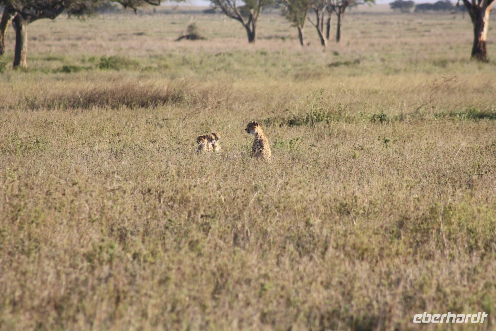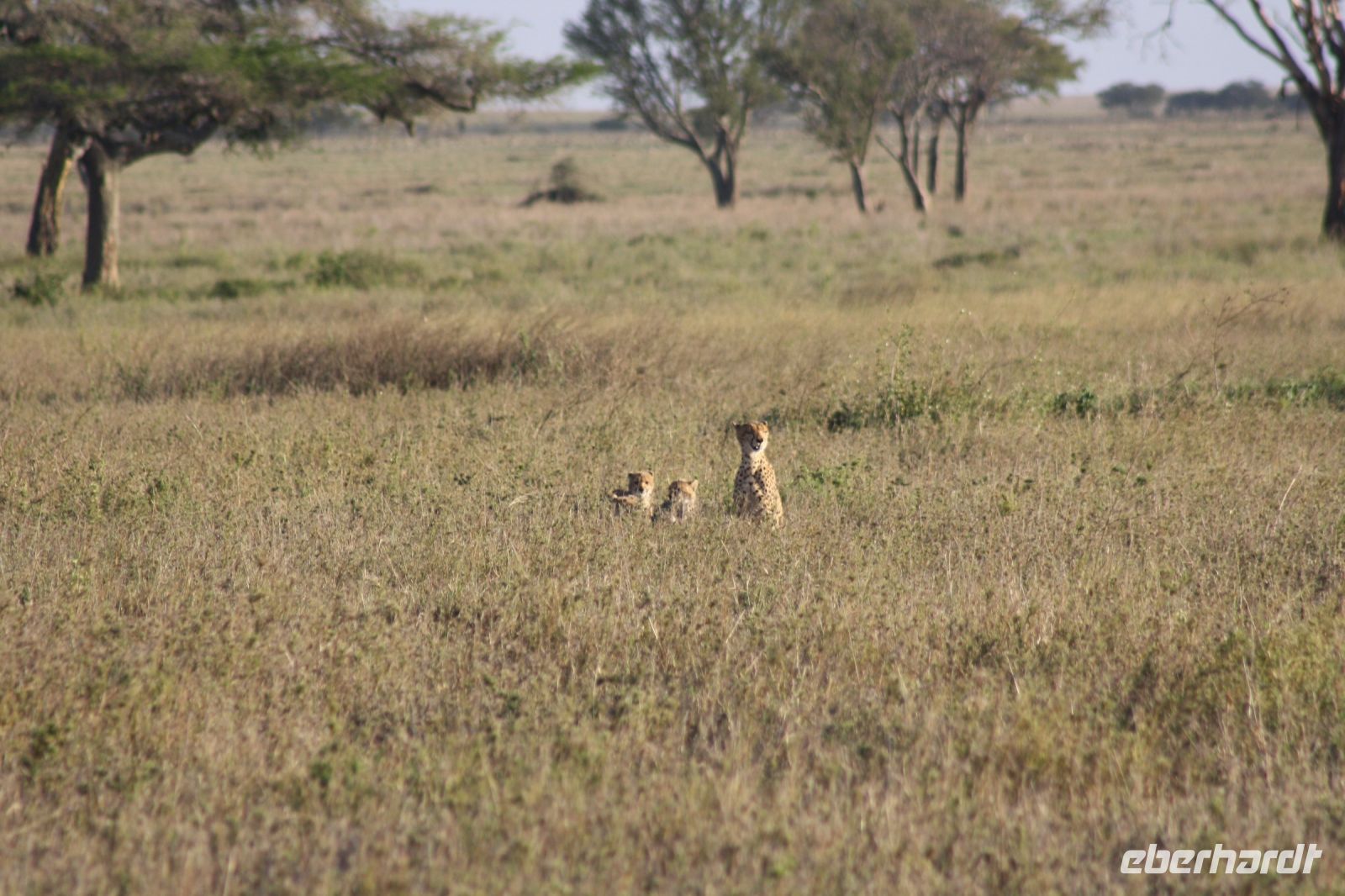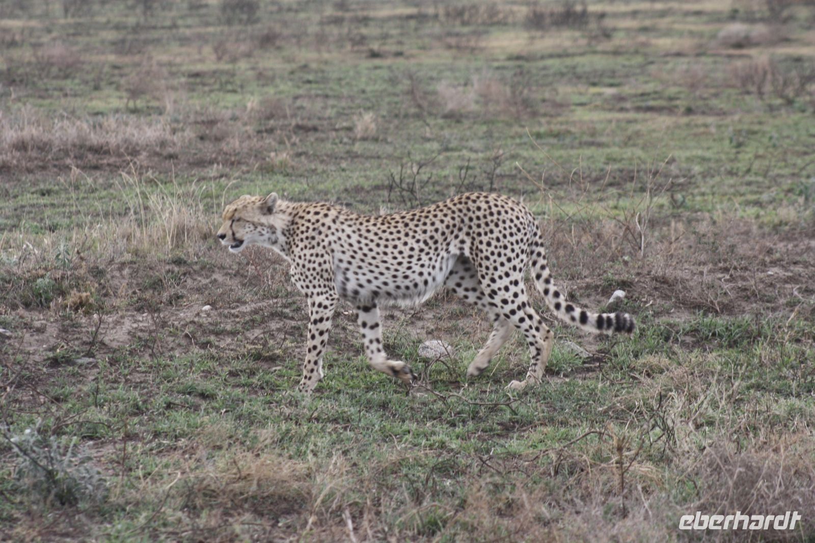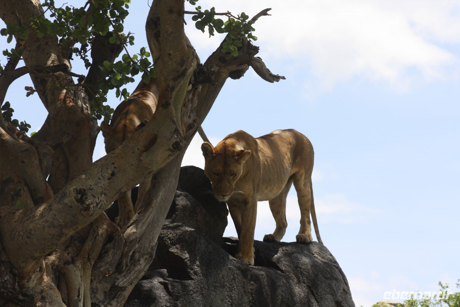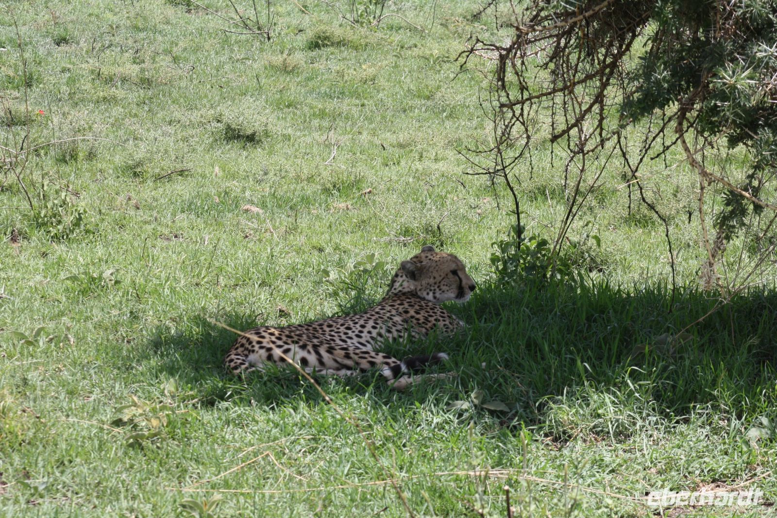 Am letzten in unserem Zeltcamp musste wir zunächst einmal mit einem Stromausfall kämpfen. Nichtsdestotrotz erhielten wir heißen Kaffee und warmes Frühstück. Unser Weg führt uns nochmal in Richtung Ngorongoro Krater und wir hielten kurz am Wochenmarkt. Die Stände werden gerade aufgebaut und Menschen aus den naheliegenden Dörfern erreichten den Markplatz, um zu handeln oder zu verkaufen. Nachdem wir den Markt verlassen hatten, versorgten wir uns an einem weiteren Souvenir Laden mit Mitbringsel. Der Weg verlief nochmal oberhalb des Ngorongoro Kraters bis nach Olduveit. Bereits an der Straße wurde ein neues großes Monument und ein neuer Eingang zum Olduveit Visitor Center gebaut. In der Region wurde bei Ausgrabungen primitive Werkzeuge, Fußabdrücke und menschliche Überreste gefunden. Man fand heraus, dass die ersten Menschen bereits vor 3 Millionen Jahren in der Region wohnten. Das neu angelegte Museum zeigte uns die Geschichte und Entwicklung der Menschheit, die bereits in der frühen Zeit zusammenlebten. Von einem angelegten Bühnen hatten wir einen fantastischen Blick in die beeindruckende tiefe Schlucht, wo die Ausgrabungen erfolgten. Hier konnten wir auch unsere Mittagspause und die Lunchbox genießen. Am Anschluss besuchten wir ein Dorf der Masai. Die Mitglieder dieses Stammes leben immer noch völlig traditionell in ihren Dörfern und hausten in Lehmhütten. Die Kinder und Männer arbeiten als Hirten und kümmern sich um die Tiere. Die Frau kochen, sammeln Holz und suchen nach Wasser. Wir werden zunächst von den Dorfbewohnern in ihrer bunten Kleidung und dem üppigen Perlenschmuck mit einem traditionellen Lied empfangen. Im Anschluss folgte eine Vorführung des Tanzes, womit die Männer mit den typischen hohen Sprüngen der bekannt wurden. Nach dem Tanz werden wir durch das Dorf geführt. Der Sohn des Häuptlings lud uns in seine Lehmhütte ein und wir könnten einen Eindruck gewinnen, wie die Masai auf kleinsten Raum lebten. Zum Schluss besuchten wir noch den Kindergarten des Dorfes. Hier lernen die 3-5jährigen Kinder bereits das Alphabet und die Zahlen bis Einhundert. Auch die Kinder begrüßen uns mit einem fröhlichen Lied und erwärmten unsere Herzen. Am Nachmittag erreichten wir das südliche Tor der Serengeti. Den Ort den die Masai den großen endlosen Weit nennen. Endlich waren wir im Serengeti Nationalpark angekommen. Wir freuten uns auf die nächsten Tage. Nach nur wenigen Kilometern fielen wir fast schon aus den Sitzen. Was ein Glück, denn als ersten Tier in der Serengeti sahen wir 2 männlichen Geparden. Die männliche Geparden sind meist in Gruppen zusammen, wobei die Weibchen immer alleine spazieren. Im Anschluss trafen wir auf großen Gruppen von Antilopen und Zebras. Ein Riesenkorid, der schwerste fliegende Vogel in Afrika blickten uns vom Wegrand an und Elefant fraßen in aller Ruhe in unserer Nähe. Nach nur wenigen Minuten waren wir stark beeindruckt von der Serengeti. Kurze Zeit später entdeckten wir zwei schlafende Löwen, die vermutlich gerade gegessen hatte. Im Hintergrund lauerten Hyänen und hofften sich einen Teil der Beute erbeuten zu können. Auf dem Weg zur Lodge konnten wir vier Löwinnen und 1 Löwe unterm Baum entdecken. Auch diese hatte gefressen, aber guckten ab und zu in die Kamera. Am Abend erreichten wir unser Camp, wo wir freundlich und herzlich empfangen wurden.