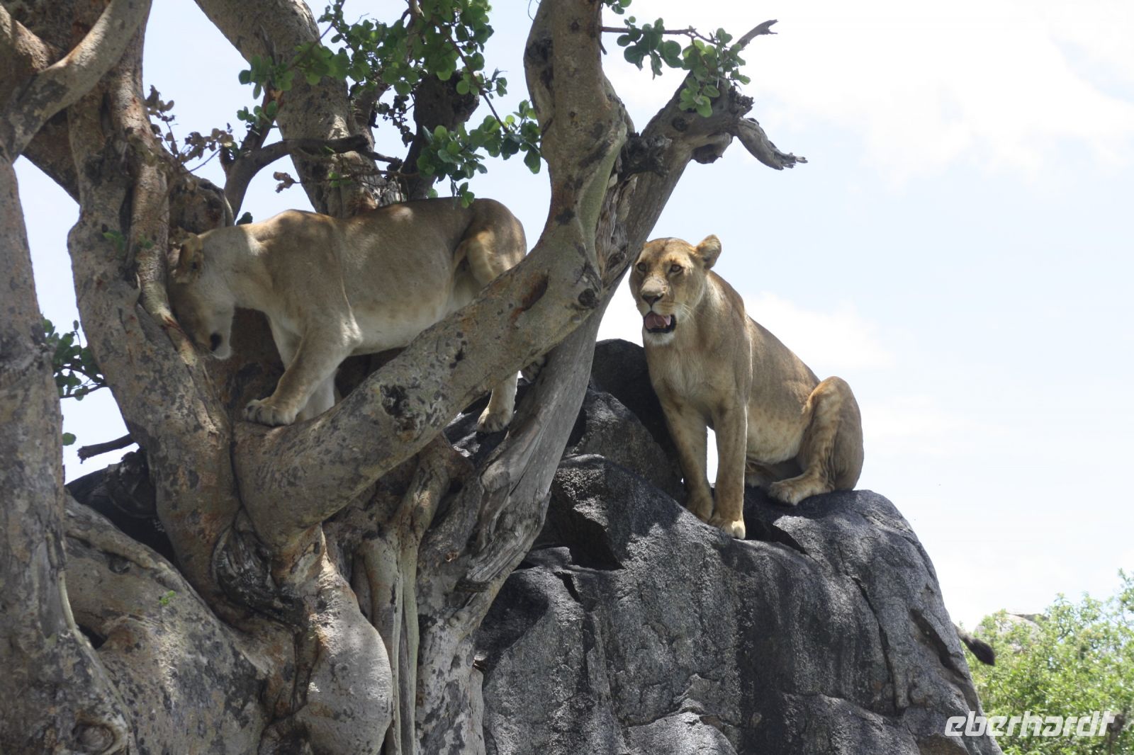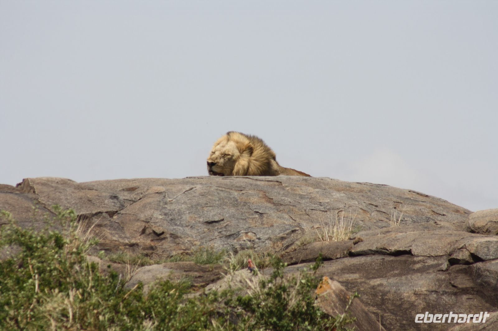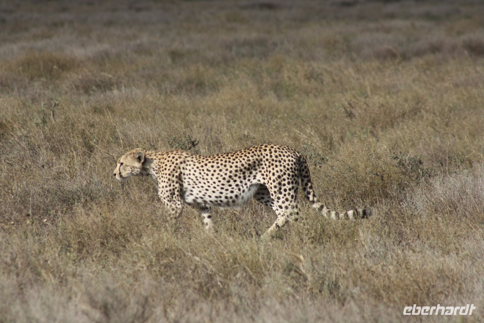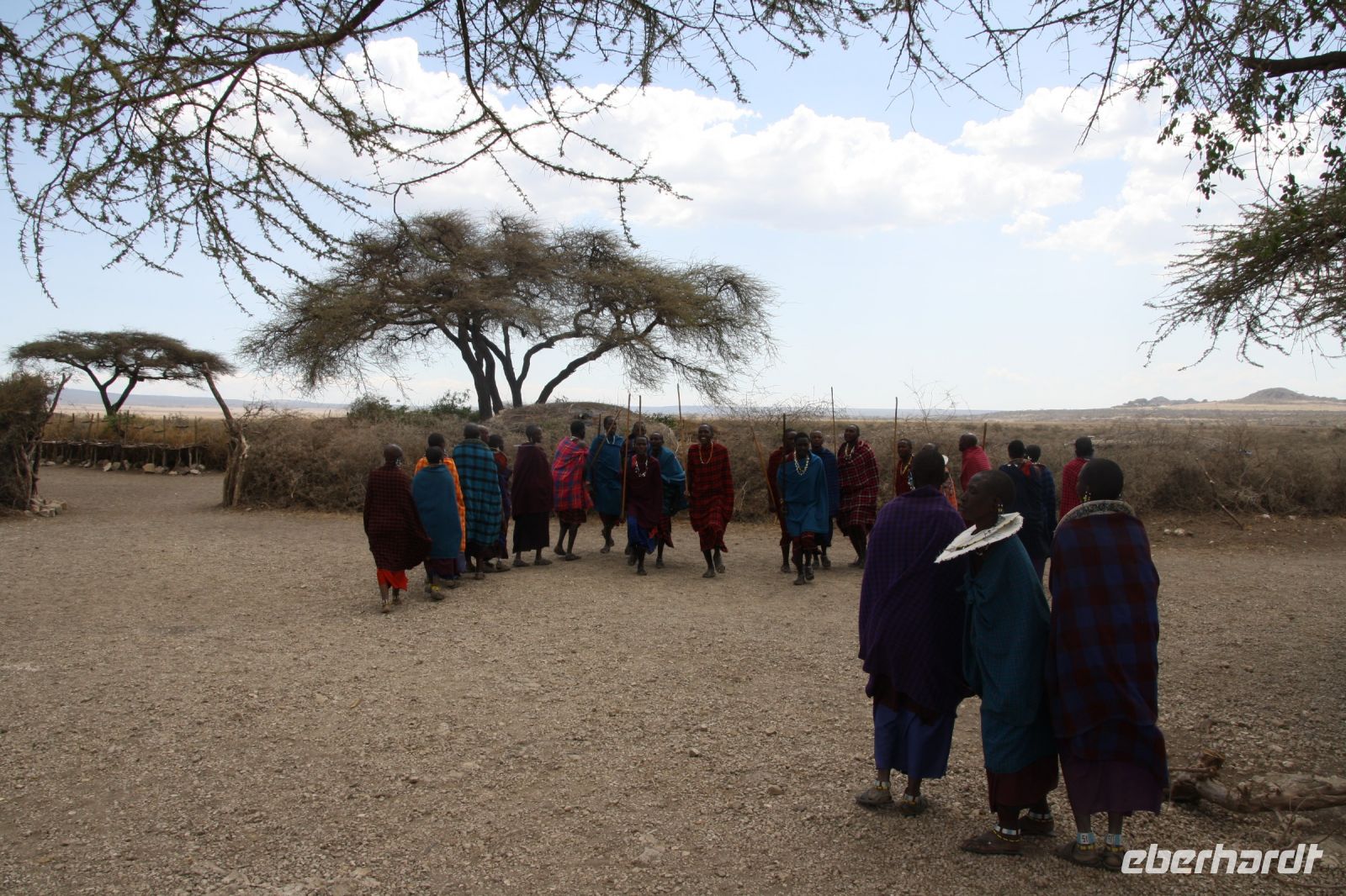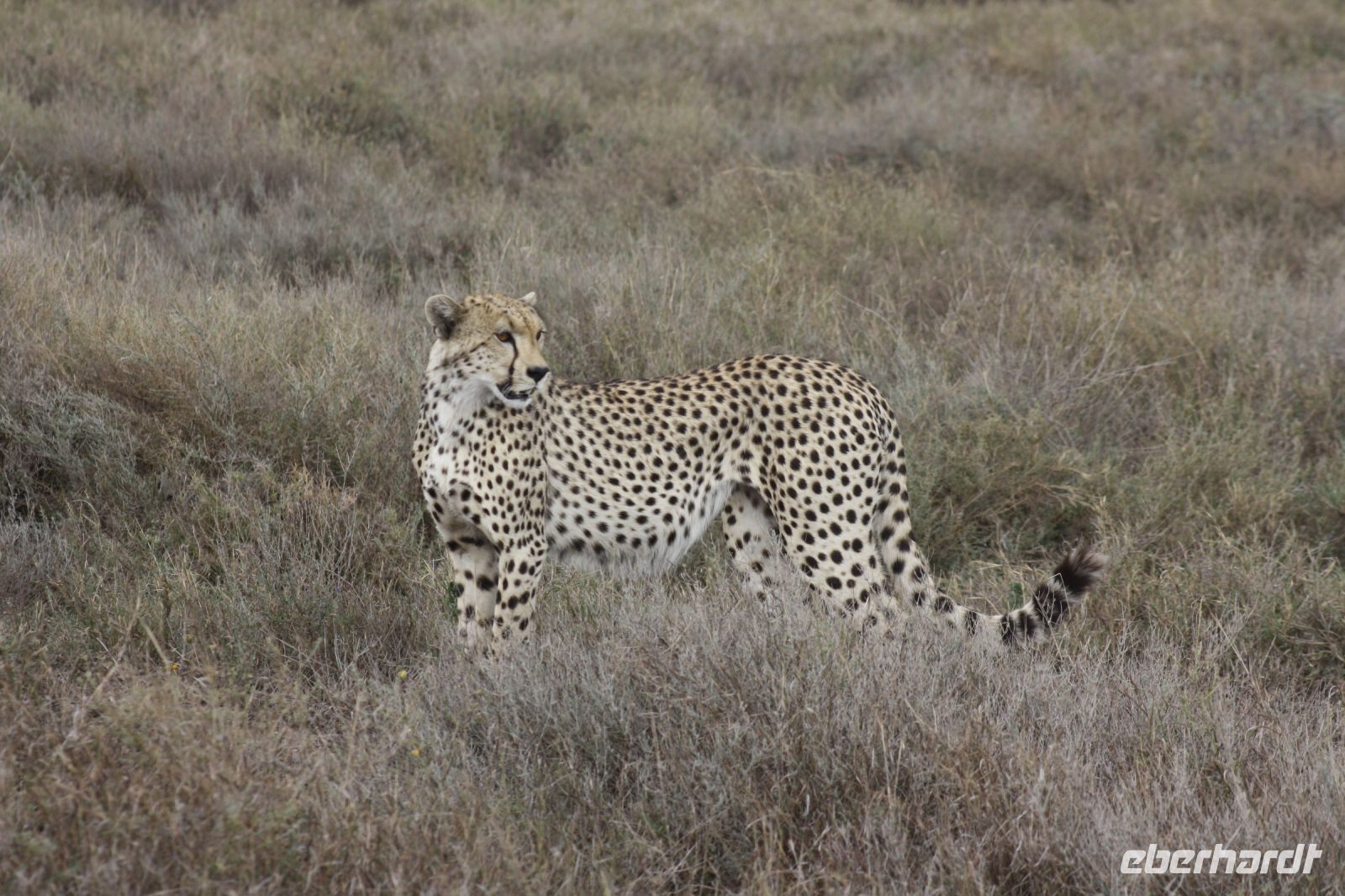 Am letzten in unserem Zeltcamp musste wir zunächst einmal mit einem Stromausfall kämpfen. Nichtsdestotrotz erhielten wir heißen Kaffee und warmes Frühstück. Unser Weg führt uns nochmal in Richtung Ngorongoro Krater und wir hielten kurz am Wochenmarkt. Die Stände werden gerade aufgebaut und Menschen aus den naheliegenden Dörfern erreichten den Markplatz, um zu handeln oder zu verkaufen. Nachdem wir den Markt verlassen hatten, versorgten wir uns an einem weiteren Souvenir Laden mit Mitbringsel. Der Weg verlief nochmal oberhalb des Ngorongoro Kraters bis nach Olduveit. Bereits an der Straße wurde ein neues großes Monument und ein neuer Eingang zum Olduveit Visitor Center gebaut. In der Region wurde bei Ausgrabungen primitive Werkzeuge, Fußabdrücke und menschliche Überreste gefunden. Man fand heraus, dass die ersten Menschen bereits vor 3 Millionen Jahren in der Region wohnten. Das neu angelegte Museum zeigte uns die Geschichte und Entwicklung der Menschheit, die bereits in der frühen Zeit zusammenlebten. Von einem angelegten Bühnen hatten wir einen fantastischen Blick in die beeindruckende tiefe Schlucht, wo die Ausgrabungen erfolgten. Hier konnten wir auch unsere Mittagspause und die Lunchbox genießen. Am Anschluss besuchten wir ein Dorf der Masai. Die Mitglieder dieses Stammes leben immer noch völlig traditionell in ihren Dörfern und hausten in Lehmhütten. Die Kinder und Männer arbeiten als Hirten und kümmern sich um die Tiere. Die Frau kochen, sammeln Holz und suchen nach Wasser. Wir werden zunächst von den Dorfbewohnern in ihrer bunten Kleidung und dem üppigen Perlenschmuck mit einem traditionellen Lied empfangen. Im Anschluss folgte eine Vorführung des Tanzes, womit die Männer mit den typischen hohen Sprüngen der bekannt wurden. Nach dem Tanz werden wir durch das Dorf geführt. Der Sohn des Häuptlings lud uns in seine Lehmhütte ein und wir könnten einen Eindruck gewinnen, wie die Masai auf kleinsten Raum lebten. Zum Schluss besuchten wir noch den Kindergarten des Dorfes. Hier lernen die 3-5jährigen Kinder bereits das Alphabet und die Zahlen bis Einhundert. Auch die Kinder begrüßen uns mit einem fröhlichen Lied und erwärmten unsere Herzen. Am Nachmittag erreichten wir das südliche Tor der Serengeti. Den Ort den die Masai den großen endlosen Weit nennen. Endlich waren wir im Serengeti Nationalpark angekommen. Wir freuten uns auf die nächsten Tage. Nach nur wenigen Kilometern fielen wir fast schon aus den Sitzen. Was ein Glück, denn als ersten Tier in der Serengeti sahen wir 2 männlichen Geparden. Die männliche Geparden sind meist in Gruppen zusammen, wobei die Weibchen immer alleine spazieren. Im Anschluss trafen wir auf großen Gruppen von Antilopen und Zebras. Ein Riesenkorid, der schwerste fliegende Vogel in Afrika blickten uns vom Wegrand an und Elefant fraßen in aller Ruhe in unserer Nähe. Nach nur wenigen Minuten waren wir stark beeindruckt von der Serengeti. Kurze Zeit später entdeckten wir zwei schlafende Löwen, die vermutlich gerade gegessen hatte. Im Hintergrund lauerten Hyänen und hofften sich einen Teil der Beute erbeuten zu können. Auf dem Weg zur Lodge konnten wir vier Löwinnen und 1 Löwe unterm Baum entdecken. Auch diese hatte gefressen, aber guckten ab und zu in die Kamera. Am Abend erreichten wir unser Camp, wo wir freundlich und herzlich empfangen wurden.
