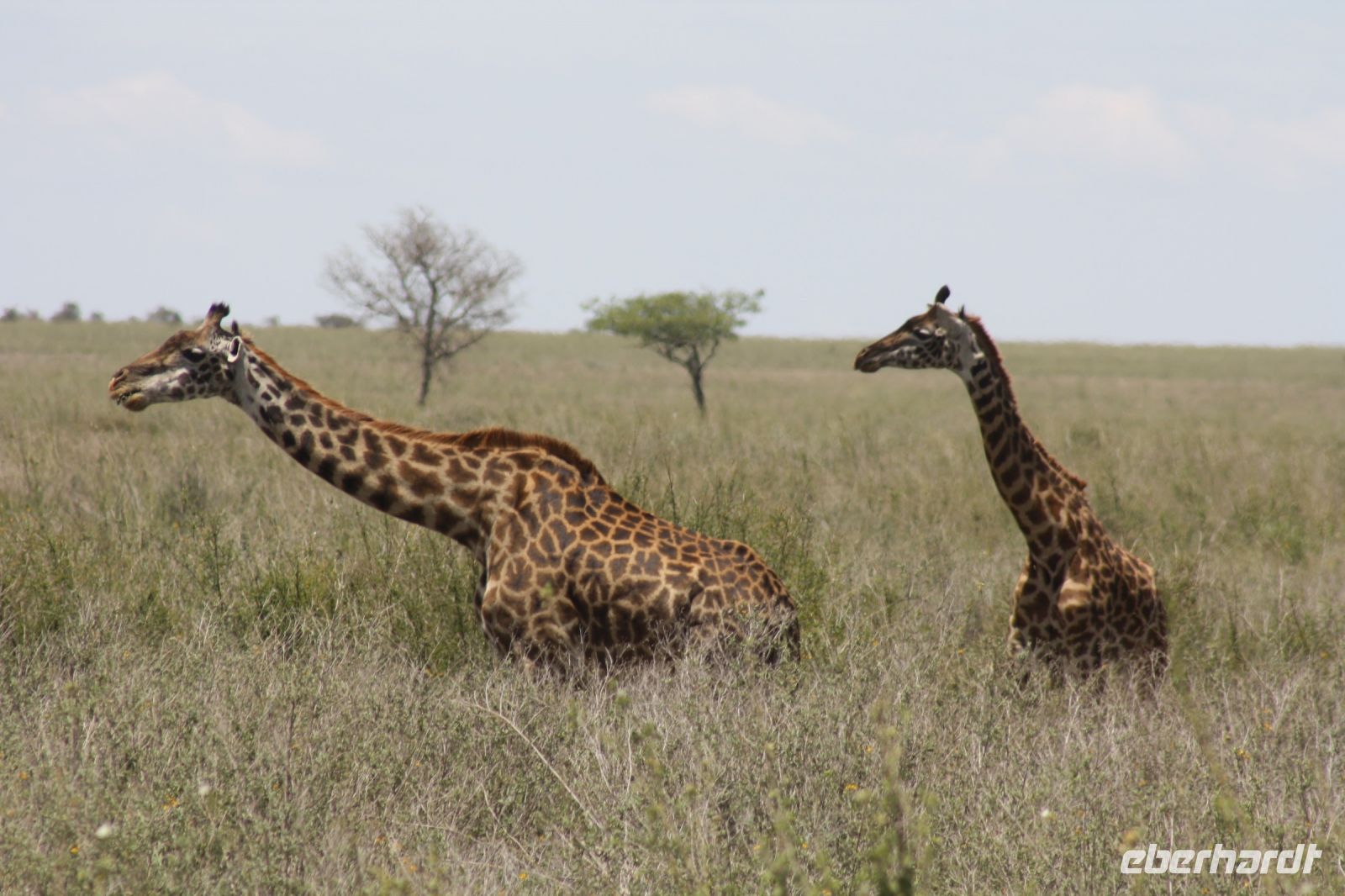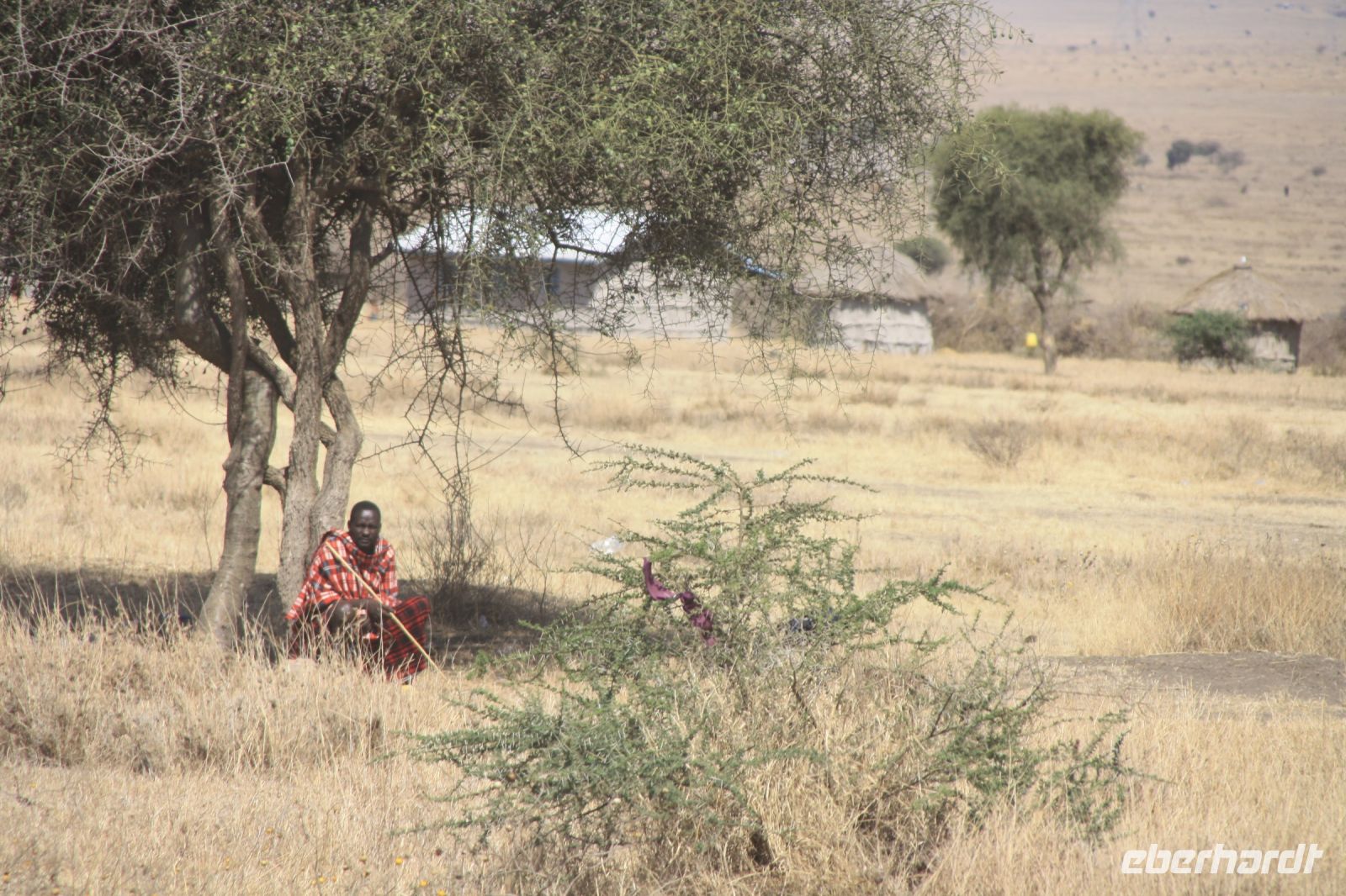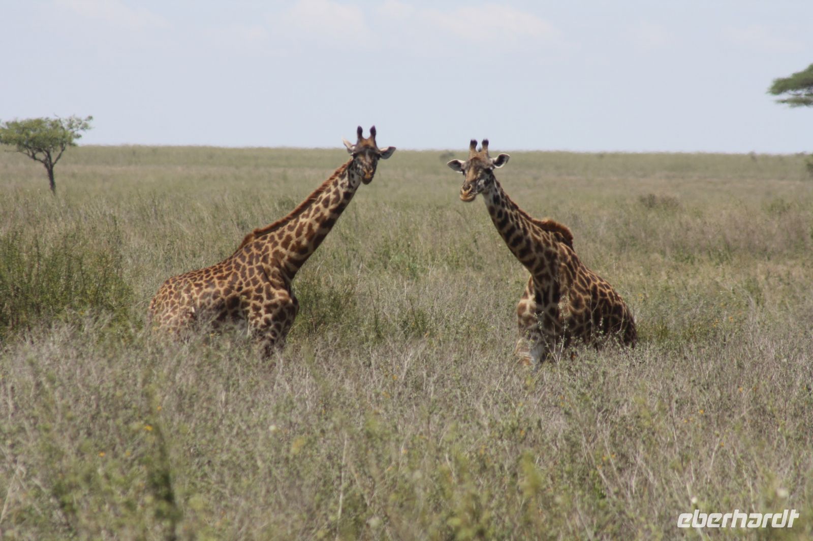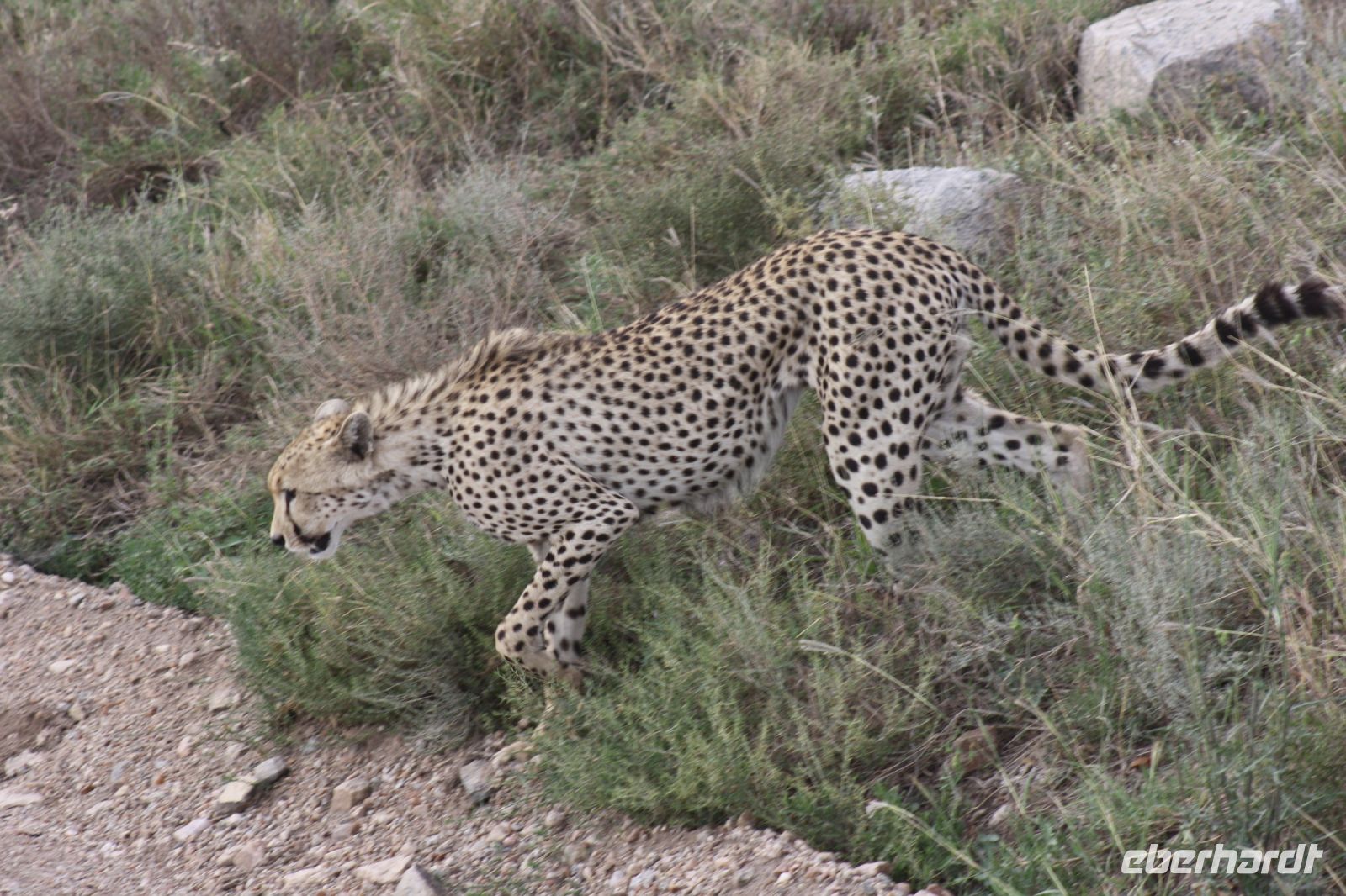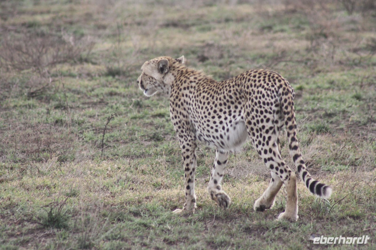 Am letzten in unserem Zeltcamp musste wir zunächst einmal mit einem Stromausfall kämpfen. Nichtsdestotrotz erhielten wir heißen Kaffee und warmes Frühstück. Unser Weg führt uns nochmal in Richtung Ngorongoro Krater und wir hielten kurz am Wochenmarkt. Die Stände werden gerade aufgebaut und Menschen aus den naheliegenden Dörfern erreichten den Markplatz, um zu handeln oder zu verkaufen. Nachdem wir den Markt verlassen hatten, versorgten wir uns an einem weiteren Souvenir Laden mit Mitbringsel. Der Weg verlief nochmal oberhalb des Ngorongoro Kraters bis nach Olduveit. Bereits an der Straße wurde ein neues großes Monument und ein neuer Eingang zum Olduveit Visitor Center gebaut. In der Region wurde bei Ausgrabungen primitive Werkzeuge, Fußabdrücke und menschliche Überreste gefunden. Man fand heraus, dass die ersten Menschen bereits vor 3 Millionen Jahren in der Region wohnten. Das neu angelegte Museum zeigte uns die Geschichte und Entwicklung der Menschheit, die bereits in der frühen Zeit zusammenlebten. Von einem angelegten Bühnen hatten wir einen fantastischen Blick in die beeindruckende tiefe Schlucht, wo die Ausgrabungen erfolgten. Hier konnten wir auch unsere Mittagspause und die Lunchbox genießen. Am Anschluss besuchten wir ein Dorf der Masai. Die Mitglieder dieses Stammes leben immer noch völlig traditionell in ihren Dörfern und hausten in Lehmhütten. Die Kinder und Männer arbeiten als Hirten und kümmern sich um die Tiere. Die Frau kochen, sammeln Holz und suchen nach Wasser. Wir werden zunächst von den Dorfbewohnern in ihrer bunten Kleidung und dem üppigen Perlenschmuck mit einem traditionellen Lied empfangen. Im Anschluss folgte eine Vorführung des Tanzes, womit die Männer mit den typischen hohen Sprüngen der bekannt wurden. Nach dem Tanz werden wir durch das Dorf geführt. Der Sohn des Häuptlings lud uns in seine Lehmhütte ein und wir könnten einen Eindruck gewinnen, wie die Masai auf kleinsten Raum lebten. Zum Schluss besuchten wir noch den Kindergarten des Dorfes. Hier lernen die 3-5jährigen Kinder bereits das Alphabet und die Zahlen bis Einhundert. Auch die Kinder begrüßen uns mit einem fröhlichen Lied und erwärmten unsere Herzen. Am Nachmittag erreichten wir das südliche Tor der Serengeti. Den Ort den die Masai den großen endlosen Weit nennen. Endlich waren wir im Serengeti Nationalpark angekommen. Wir freuten uns auf die nächsten Tage. Nach nur wenigen Kilometern fielen wir fast schon aus den Sitzen. Was ein Glück, denn als ersten Tier in der Serengeti sahen wir 2 männlichen Geparden. Die männliche Geparden sind meist in Gruppen zusammen, wobei die Weibchen immer alleine spazieren. Im Anschluss trafen wir auf großen Gruppen von Antilopen und Zebras. Ein Riesenkorid, der schwerste fliegende Vogel in Afrika blickten uns vom Wegrand an und Elefant fraßen in aller Ruhe in unserer Nähe. Nach nur wenigen Minuten waren wir stark beeindruckt von der Serengeti. Kurze Zeit später entdeckten wir zwei schlafende Löwen, die vermutlich gerade gegessen hatte. Im Hintergrund lauerten Hyänen und hofften sich einen Teil der Beute erbeuten zu können. Auf dem Weg zur Lodge konnten wir vier Löwinnen und 1 Löwe unterm Baum entdecken. Auch diese hatte gefressen, aber guckten ab und zu in die Kamera. Am Abend erreichten wir unser Camp, wo wir freundlich und herzlich empfangen wurden.