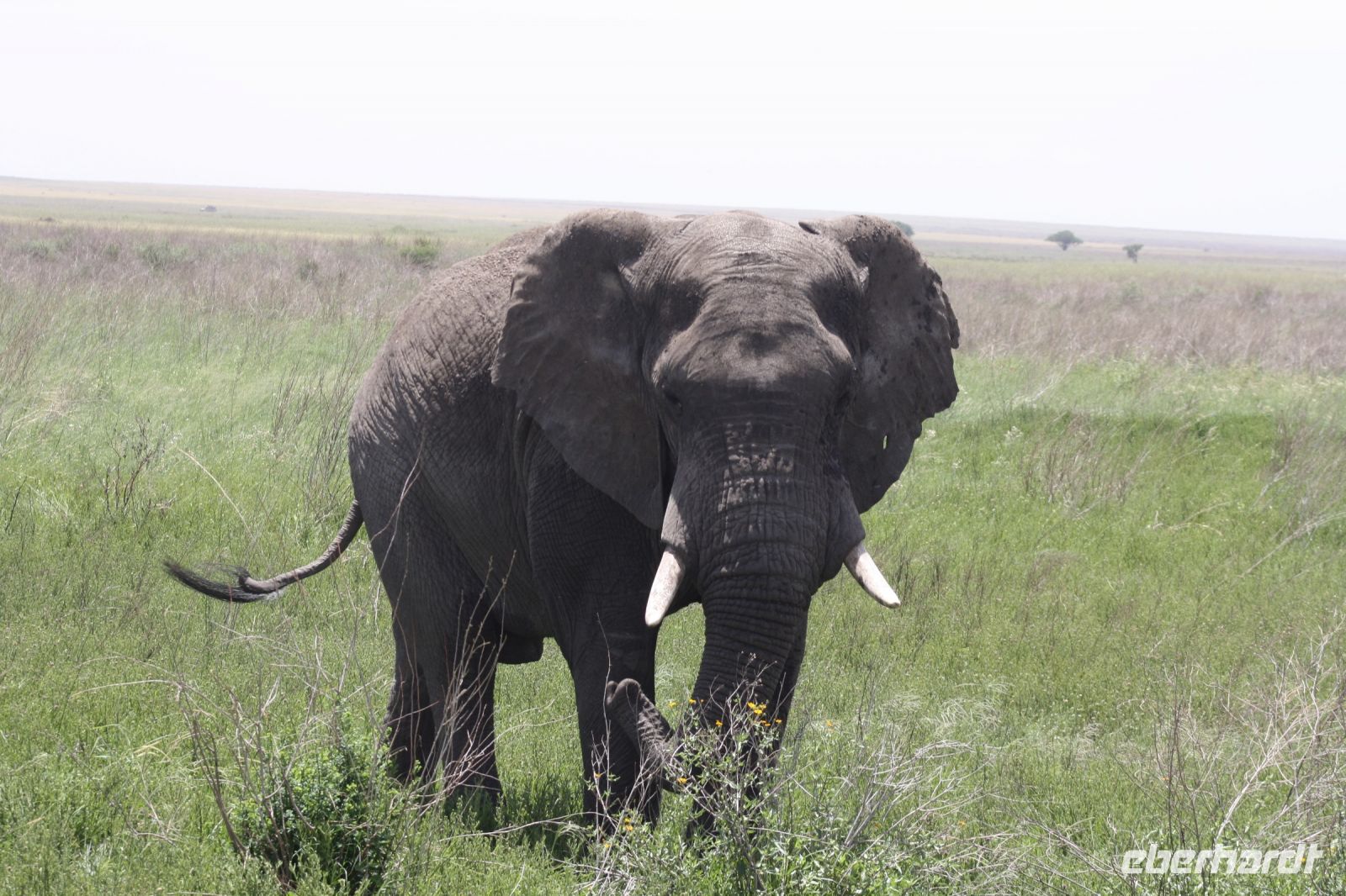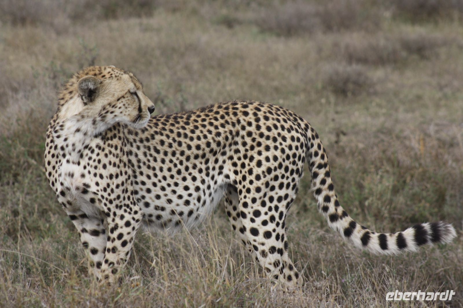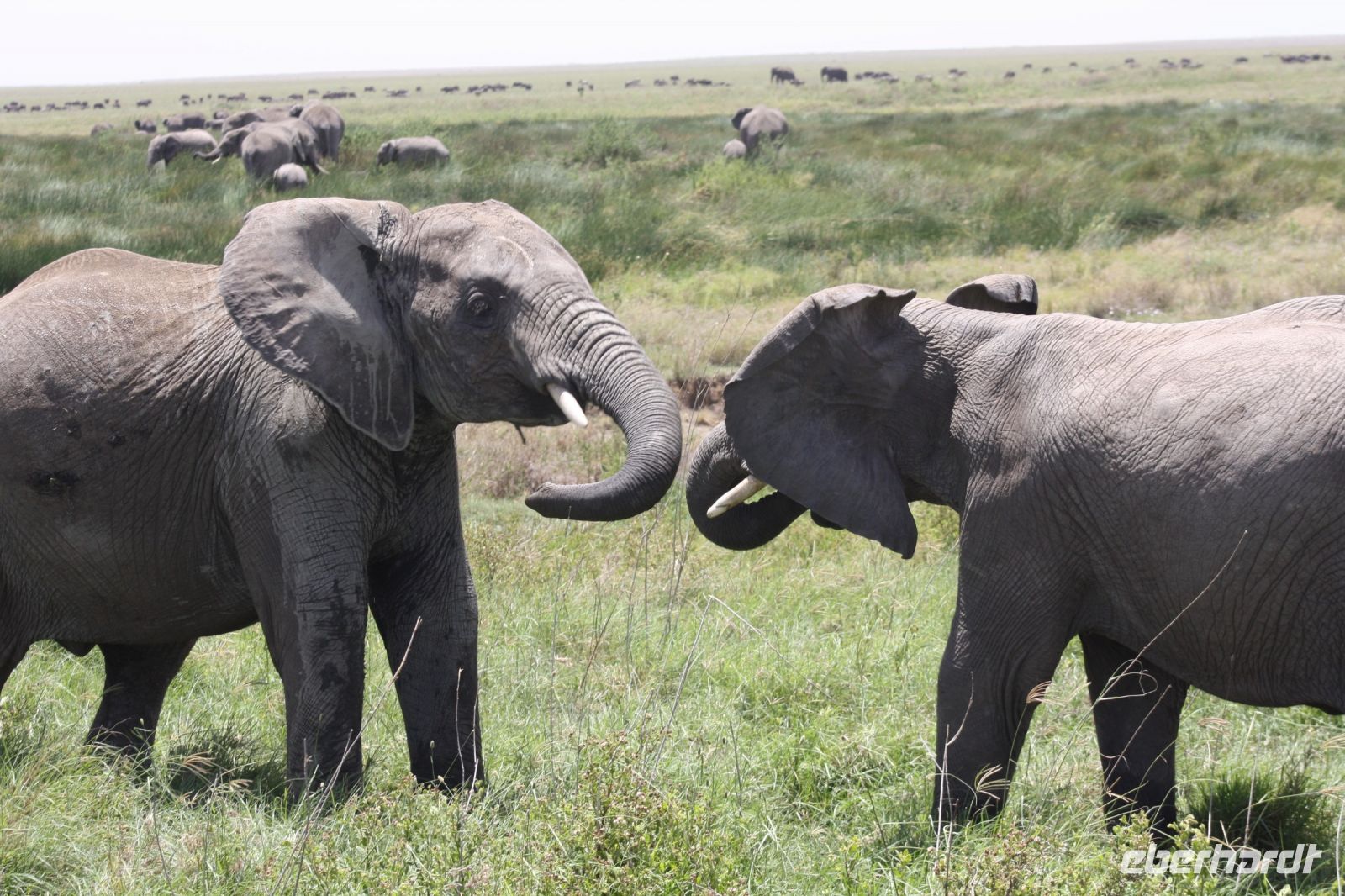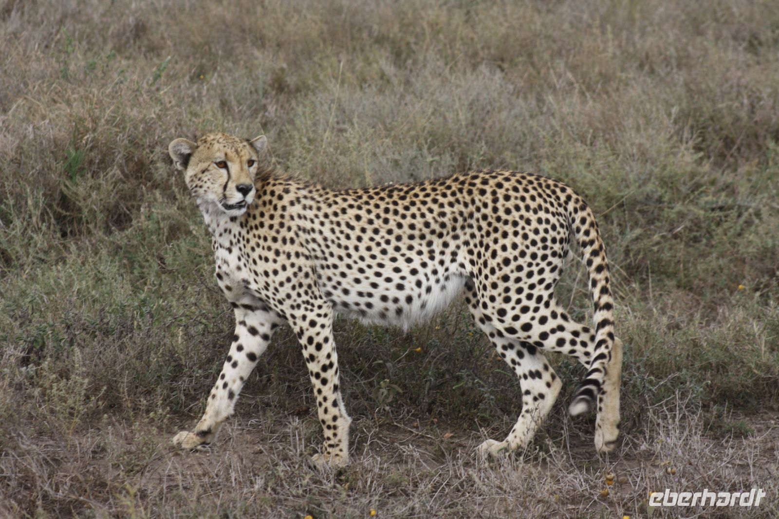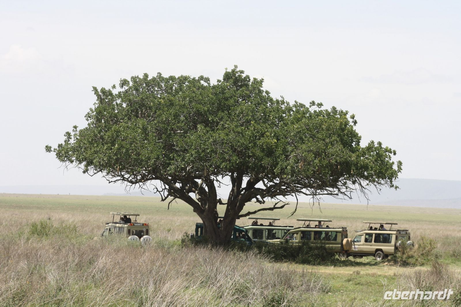 Am letzten in unserem Zeltcamp musste wir zunächst einmal mit einem Stromausfall kämpfen. Nichtsdestotrotz erhielten wir heißen Kaffee und warmes Frühstück. Unser Weg führt uns nochmal in Richtung Ngorongoro Krater und wir hielten kurz am Wochenmarkt. Die Stände werden gerade aufgebaut und Menschen aus den naheliegenden Dörfern erreichten den Markplatz, um zu handeln oder zu verkaufen. Nachdem wir den Markt verlassen hatten, versorgten wir uns an einem weiteren Souvenir Laden mit Mitbringsel. Der Weg verlief nochmal oberhalb des Ngorongoro Kraters bis nach Olduveit. Bereits an der Straße wurde ein neues großes Monument und ein neuer Eingang zum Olduveit Visitor Center gebaut. In der Region wurde bei Ausgrabungen primitive Werkzeuge, Fußabdrücke und menschliche Überreste gefunden. Man fand heraus, dass die ersten Menschen bereits vor 3 Millionen Jahren in der Region wohnten. Das neu angelegte Museum zeigte uns die Geschichte und Entwicklung der Menschheit, die bereits in der frühen Zeit zusammenlebten. Von einem angelegten Bühnen hatten wir einen fantastischen Blick in die beeindruckende tiefe Schlucht, wo die Ausgrabungen erfolgten. Hier konnten wir auch unsere Mittagspause und die Lunchbox genießen. Am Anschluss besuchten wir ein Dorf der Masai. Die Mitglieder dieses Stammes leben immer noch völlig traditionell in ihren Dörfern und hausten in Lehmhütten. Die Kinder und Männer arbeiten als Hirten und kümmern sich um die Tiere. Die Frau kochen, sammeln Holz und suchen nach Wasser. Wir werden zunächst von den Dorfbewohnern in ihrer bunten Kleidung und dem üppigen Perlenschmuck mit einem traditionellen Lied empfangen. Im Anschluss folgte eine Vorführung des Tanzes, womit die Männer mit den typischen hohen Sprüngen der bekannt wurden. Nach dem Tanz werden wir durch das Dorf geführt. Der Sohn des Häuptlings lud uns in seine Lehmhütte ein und wir könnten einen Eindruck gewinnen, wie die Masai auf kleinsten Raum lebten. Zum Schluss besuchten wir noch den Kindergarten des Dorfes. Hier lernen die 3-5jährigen Kinder bereits das Alphabet und die Zahlen bis Einhundert. Auch die Kinder begrüßen uns mit einem fröhlichen Lied und erwärmten unsere Herzen. Am Nachmittag erreichten wir das südliche Tor der Serengeti. Den Ort den die Masai den großen endlosen Weit nennen. Endlich waren wir im Serengeti Nationalpark angekommen. Wir freuten uns auf die nächsten Tage. Nach nur wenigen Kilometern fielen wir fast schon aus den Sitzen. Was ein Glück, denn als ersten Tier in der Serengeti sahen wir 2 männlichen Geparden. Die männliche Geparden sind meist in Gruppen zusammen, wobei die Weibchen immer alleine spazieren. Im Anschluss trafen wir auf großen Gruppen von Antilopen und Zebras. Ein Riesenkorid, der schwerste fliegende Vogel in Afrika blickten uns vom Wegrand an und Elefant fraßen in aller Ruhe in unserer Nähe. Nach nur wenigen Minuten waren wir stark beeindruckt von der Serengeti. Kurze Zeit später entdeckten wir zwei schlafende Löwen, die vermutlich gerade gegessen hatte. Im Hintergrund lauerten Hyänen und hofften sich einen Teil der Beute erbeuten zu können. Auf dem Weg zur Lodge konnten wir vier Löwinnen und 1 Löwe unterm Baum entdecken. Auch diese hatte gefressen, aber guckten ab und zu in die Kamera. Am Abend erreichten wir unser Camp, wo wir freundlich und herzlich empfangen wurden.