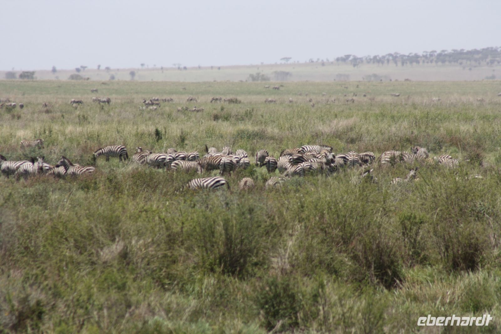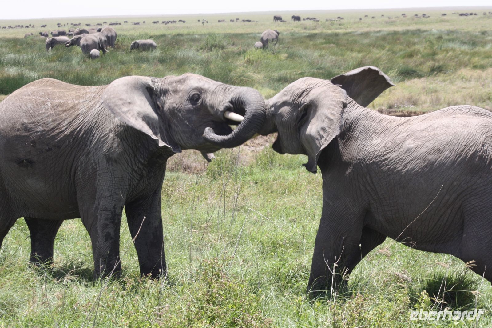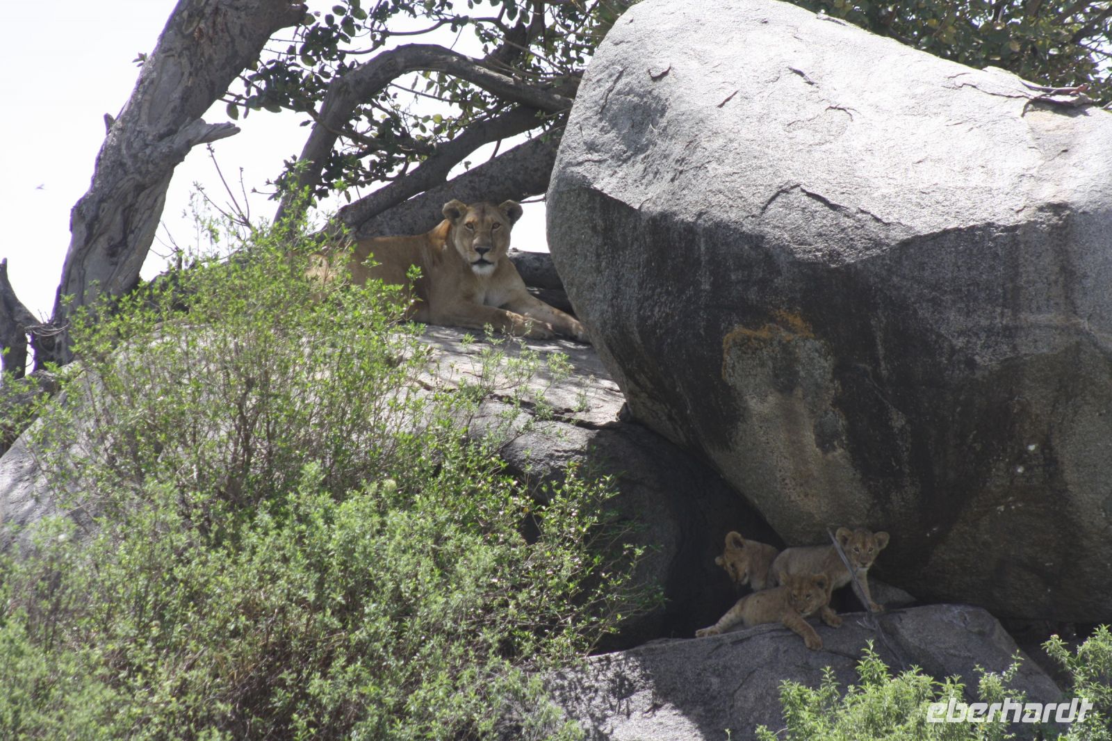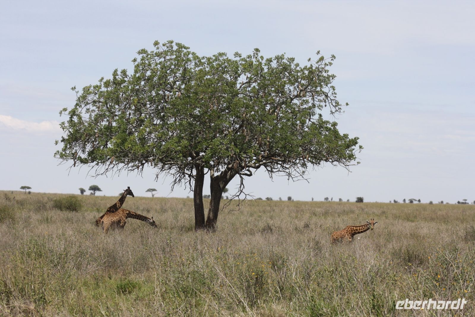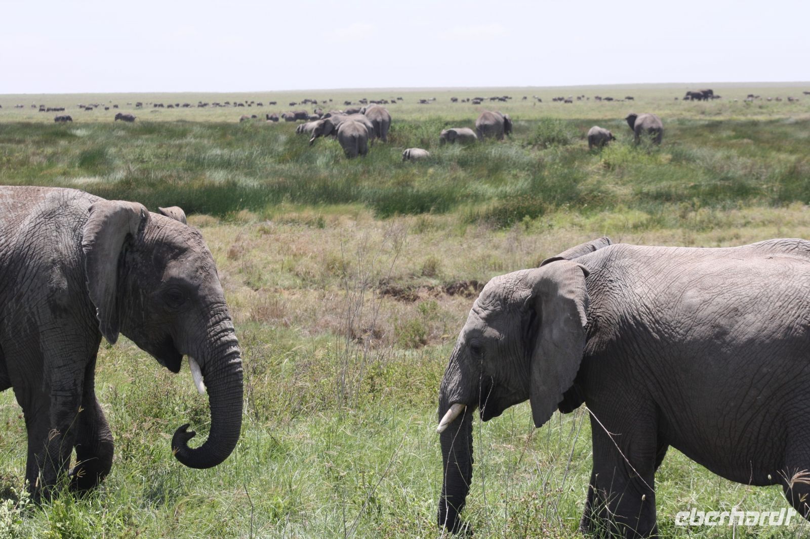 Am letzten in unserem Zeltcamp musste wir zunächst einmal mit einem Stromausfall kämpfen. Nichtsdestotrotz erhielten wir heißen Kaffee und warmes Frühstück. Unser Weg führt uns nochmal in Richtung Ngorongoro Krater und wir hielten kurz am Wochenmarkt. Die Stände werden gerade aufgebaut und Menschen aus den naheliegenden Dörfern erreichten den Markplatz, um zu handeln oder zu verkaufen. Nachdem wir den Markt verlassen hatten, versorgten wir uns an einem weiteren Souvenir Laden mit Mitbringsel. Der Weg verlief nochmal oberhalb des Ngorongoro Kraters bis nach Olduveit. Bereits an der Straße wurde ein neues großes Monument und ein neuer Eingang zum Olduveit Visitor Center gebaut. In der Region wurde bei Ausgrabungen primitive Werkzeuge, Fußabdrücke und menschliche Überreste gefunden. Man fand heraus, dass die ersten Menschen bereits vor 3 Millionen Jahren in der Region wohnten. Das neu angelegte Museum zeigte uns die Geschichte und Entwicklung der Menschheit, die bereits in der frühen Zeit zusammenlebten. Von einem angelegten Bühnen hatten wir einen fantastischen Blick in die beeindruckende tiefe Schlucht, wo die Ausgrabungen erfolgten. Hier konnten wir auch unsere Mittagspause und die Lunchbox genießen. Am Anschluss besuchten wir ein Dorf der Masai. Die Mitglieder dieses Stammes leben immer noch völlig traditionell in ihren Dörfern und hausten in Lehmhütten. Die Kinder und Männer arbeiten als Hirten und kümmern sich um die Tiere. Die Frau kochen, sammeln Holz und suchen nach Wasser. Wir werden zunächst von den Dorfbewohnern in ihrer bunten Kleidung und dem üppigen Perlenschmuck mit einem traditionellen Lied empfangen. Im Anschluss folgte eine Vorführung des Tanzes, womit die Männer mit den typischen hohen Sprüngen der bekannt wurden. Nach dem Tanz werden wir durch das Dorf geführt. Der Sohn des Häuptlings lud uns in seine Lehmhütte ein und wir könnten einen Eindruck gewinnen, wie die Masai auf kleinsten Raum lebten. Zum Schluss besuchten wir noch den Kindergarten des Dorfes. Hier lernen die 3-5jährigen Kinder bereits das Alphabet und die Zahlen bis Einhundert. Auch die Kinder begrüßen uns mit einem fröhlichen Lied und erwärmten unsere Herzen. Am Nachmittag erreichten wir das südliche Tor der Serengeti. Den Ort den die Masai den großen endlosen Weit nennen. Endlich waren wir im Serengeti Nationalpark angekommen. Wir freuten uns auf die nächsten Tage. Nach nur wenigen Kilometern fielen wir fast schon aus den Sitzen. Was ein Glück, denn als ersten Tier in der Serengeti sahen wir 2 männlichen Geparden. Die männliche Geparden sind meist in Gruppen zusammen, wobei die Weibchen immer alleine spazieren. Im Anschluss trafen wir auf großen Gruppen von Antilopen und Zebras. Ein Riesenkorid, der schwerste fliegende Vogel in Afrika blickten uns vom Wegrand an und Elefant fraßen in aller Ruhe in unserer Nähe. Nach nur wenigen Minuten waren wir stark beeindruckt von der Serengeti. Kurze Zeit später entdeckten wir zwei schlafende Löwen, die vermutlich gerade gegessen hatte. Im Hintergrund lauerten Hyänen und hofften sich einen Teil der Beute erbeuten zu können. Auf dem Weg zur Lodge konnten wir vier Löwinnen und 1 Löwe unterm Baum entdecken. Auch diese hatte gefressen, aber guckten ab und zu in die Kamera. Am Abend erreichten wir unser Camp, wo wir freundlich und herzlich empfangen wurden.