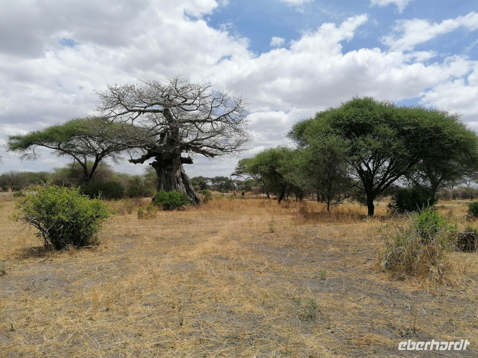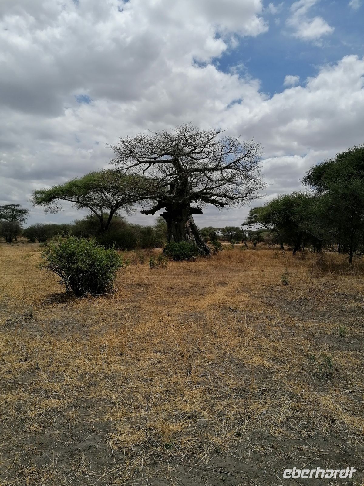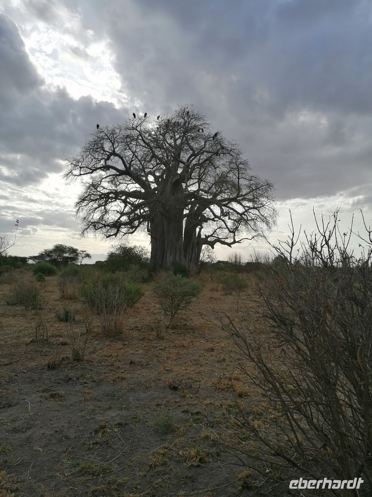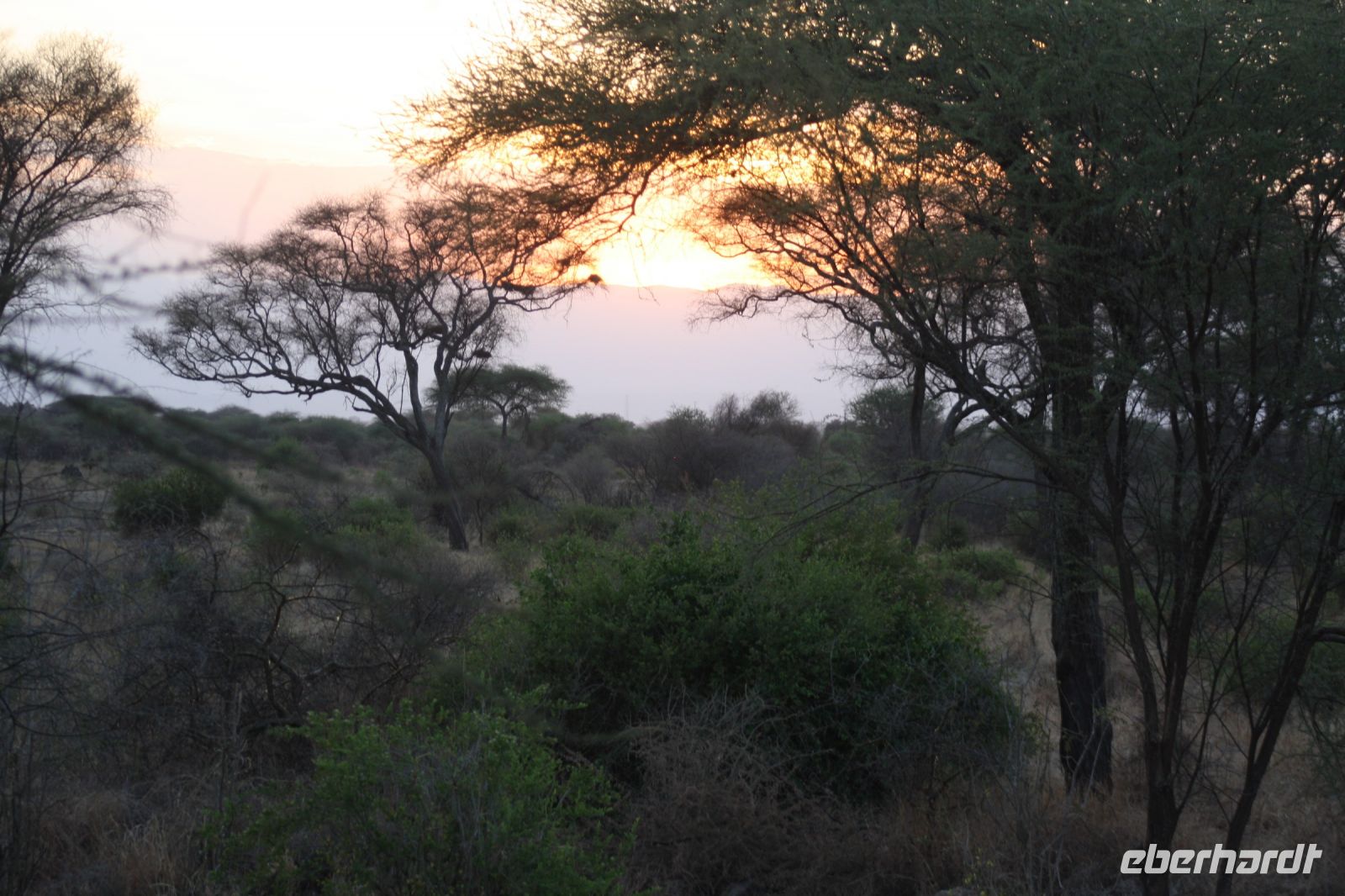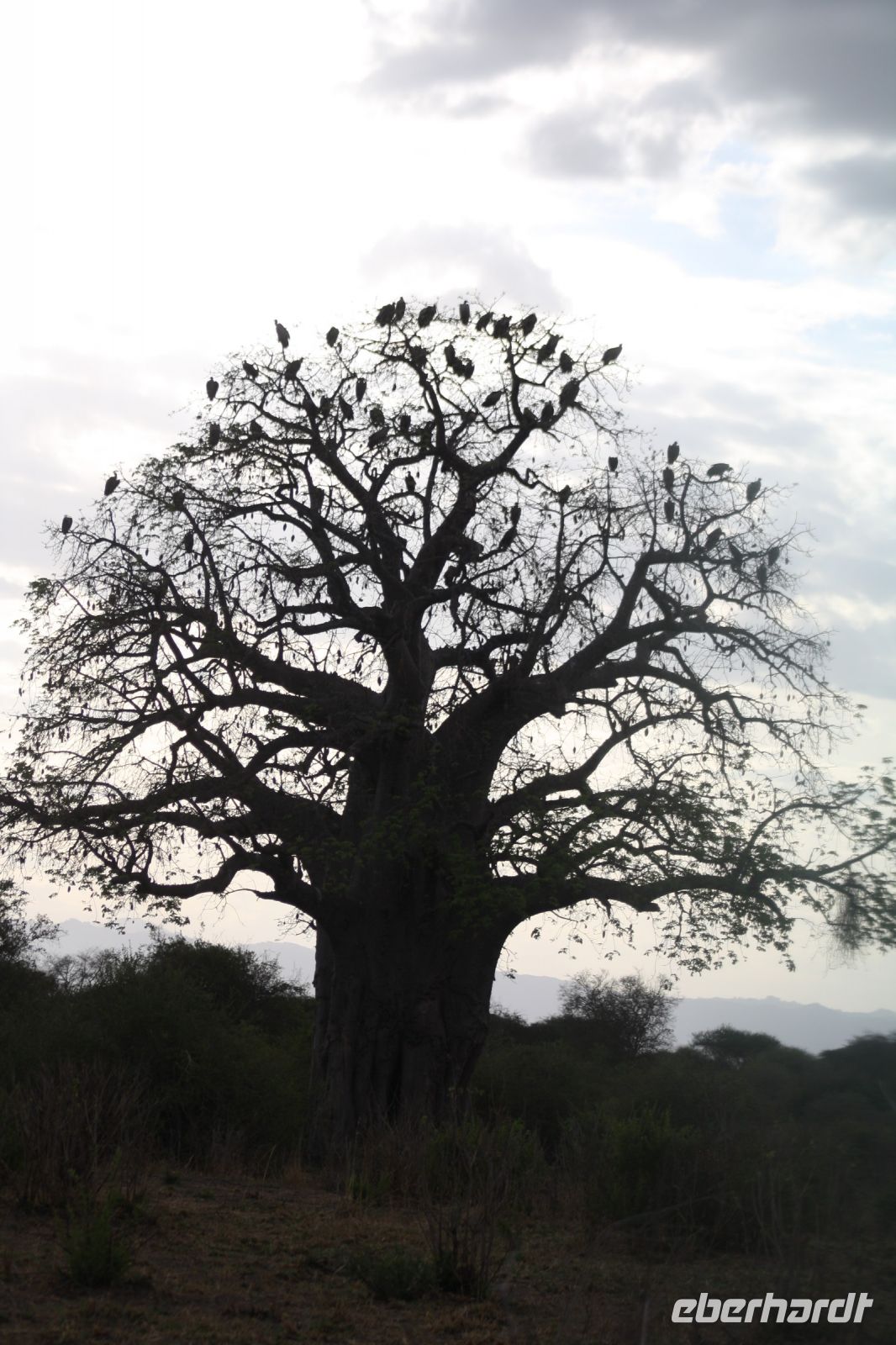 Heute heißt es leider Abschied von unserer liebgewonnene Rivertrees Lodge nehmen. Gemeinsam mit Karim machten wir uns auf dem Weg in Richtung Tarangire Nationalpark. Unterwegs konnten wir einen letzten Blick auf Mount Meru erhaschen, der sich diesmal fast wolkenfrei zeigte. Im Anschluss fuhren wir durch die Stadt Arusha und konnten einen ersten Eindruck von einer afrikanischen Stadt gewinnen. Nach der Stadt erreichten wir die Savanne. Hier konnten man bereits einige Dörfer der Masai entdecken. Die Kinder der Masai passen gemeinsam mit dem Vater auf das Vieh auf. Die Mütter sind für das Essen, das Wasser und auch für das Feuer in den Hütten zuständig. Zudem konnten wir unterwegs Geier mit einem toten Esel erblicken. Um die Mittagszeit erreichten wir das Eingangsgate zum Tarangire Nationalpark. Nach einer schnellen Anmeldung konnte unsere Pirschfahrt beginnen. Zuerst kreuzten Impalas unseren Weg, wo nur die Männer Hörner besitzen. Kurz darauf empfang uns ein Affenblütenbaum, der eigentlich nur nachts blüht, für uns eine Ausnahme machte. Nach kurzer Zeit erreichen wir das Wasserloch, wo sich Zebras, Gnus, Impalas und Warzenschweine begnügten. In kurzer Zeit konnten wir Elanantilopen, Gnus, ein schwarzer Hornrabe und riesige Büffelherde entdecken. Wir waren bereits hin und weg, als wir die Nachricht über einen Leoparden im Baum erhielten. Zum Glück waren wir in der Nähe und konnten uns einen Einblick machen. Leider versteckte sich der Leopard geschickt vor uns, sodass wir nur die Umrisse erahnen konnten. Trotzdem fuhren wir glücklich in Richtung Aussichtspunkt, wo wir eine große Elefantenherde mit Kindern erhaschen konnten. Unsere Mittagspause absolvierten an einen schönen Aussichtspunkt. Gemeinsam mit ein paar Pavianen teilten wir unser Essen und genossen den wunderbaren Ausblick. Nach unserer Mittagspause führten wir unsere Pirsch fort. Im Anschluss konnten wir unzählige Elefanten und Zebras erblicken. Am Fluss konnten wir Geiern bei ihrer Mittagspause zugucken, wo sie eine Giraffe als Mahlzeit verputzten. Des Weiteren erspähten wir Papageien, einen Rotschnabel und Erdmännchen. Ein weiteres Highlight waren drei weibliche Strauße, die mit ihren 22 Babys spazieren gingen. Auf dem Weg zur Lodge liefen uns noch blaue Gabelröcke, Elefant, Dikdik und Warzenschweine über den Weg. Unser Zeltcamp war schön am Rand des Nationalparks gelegen und wir konnten bei dem schönen Sonnenuntergang vom Restaurant aus genießen.