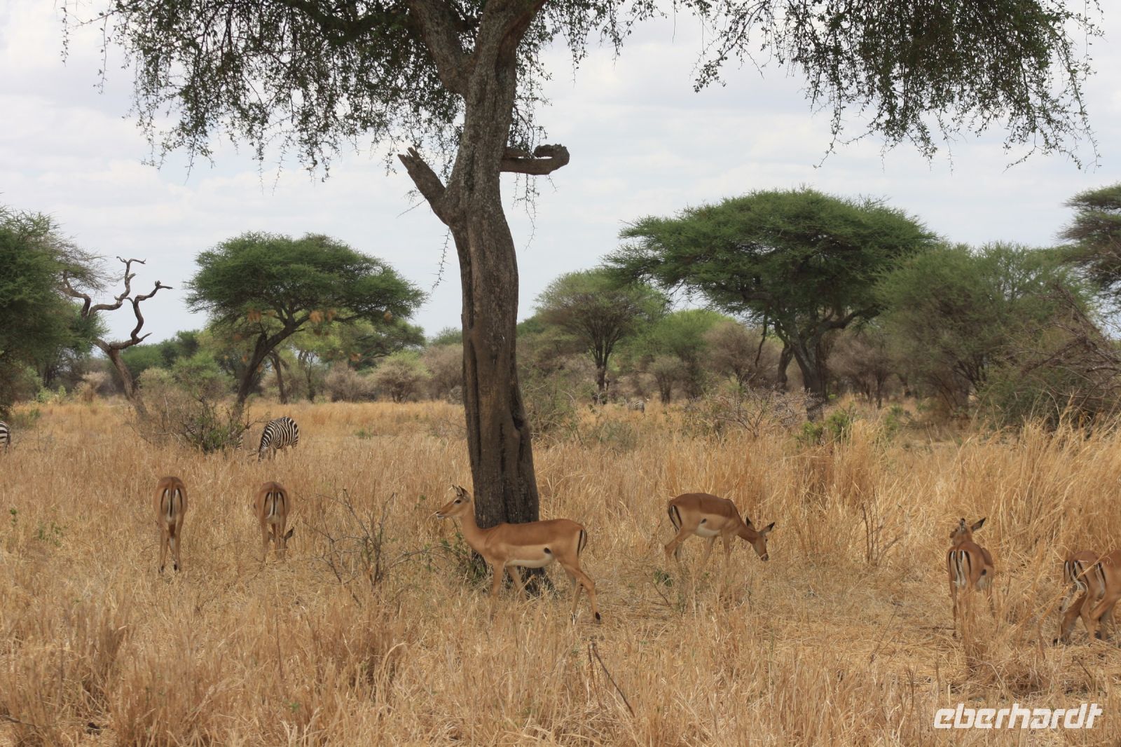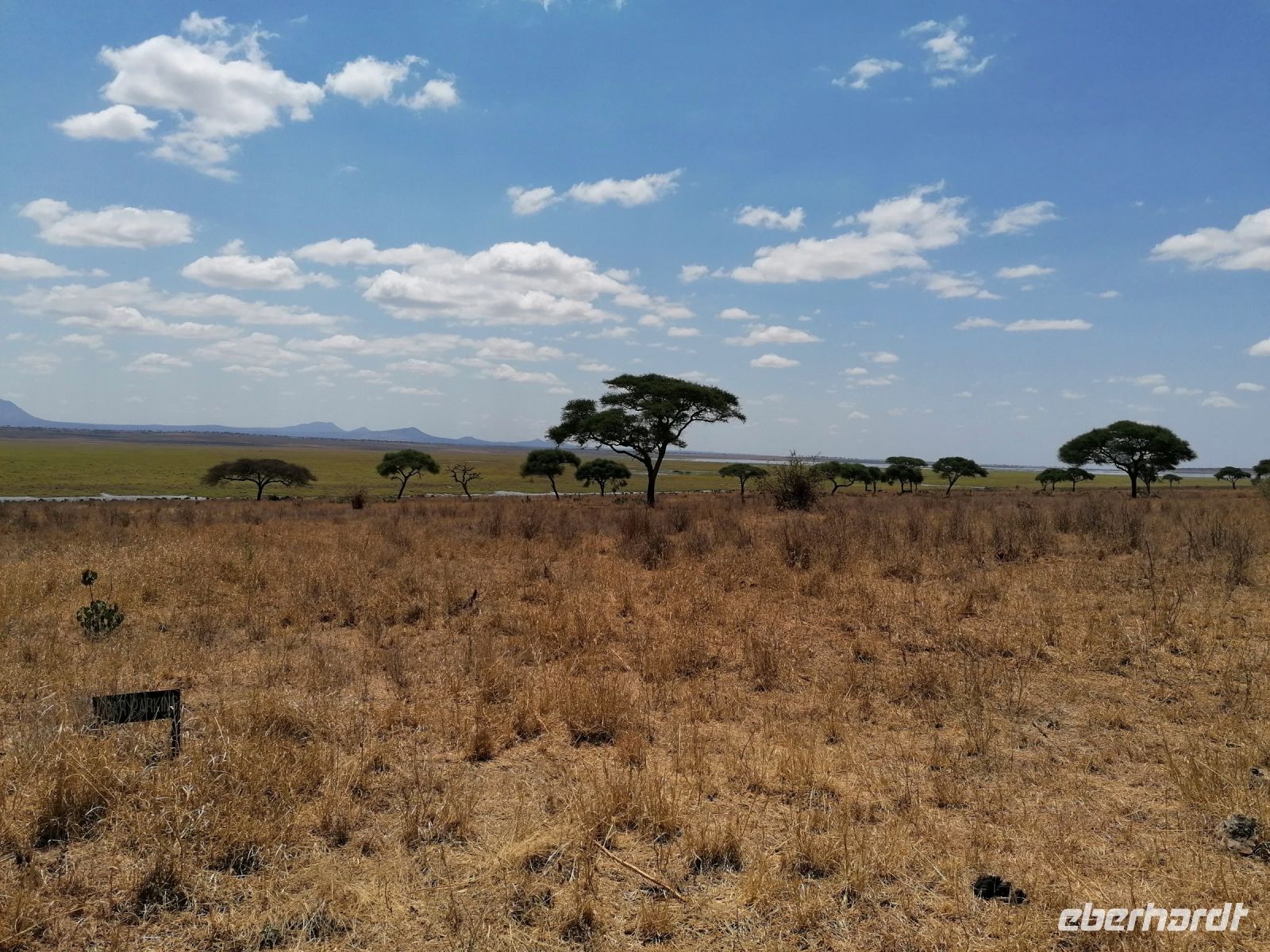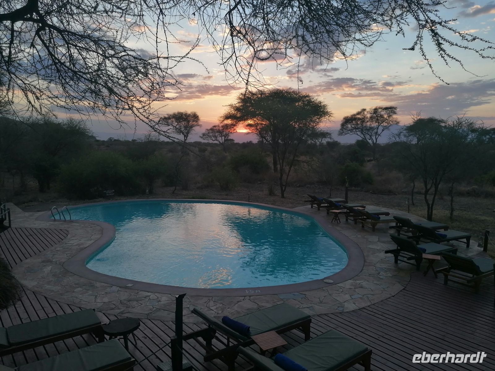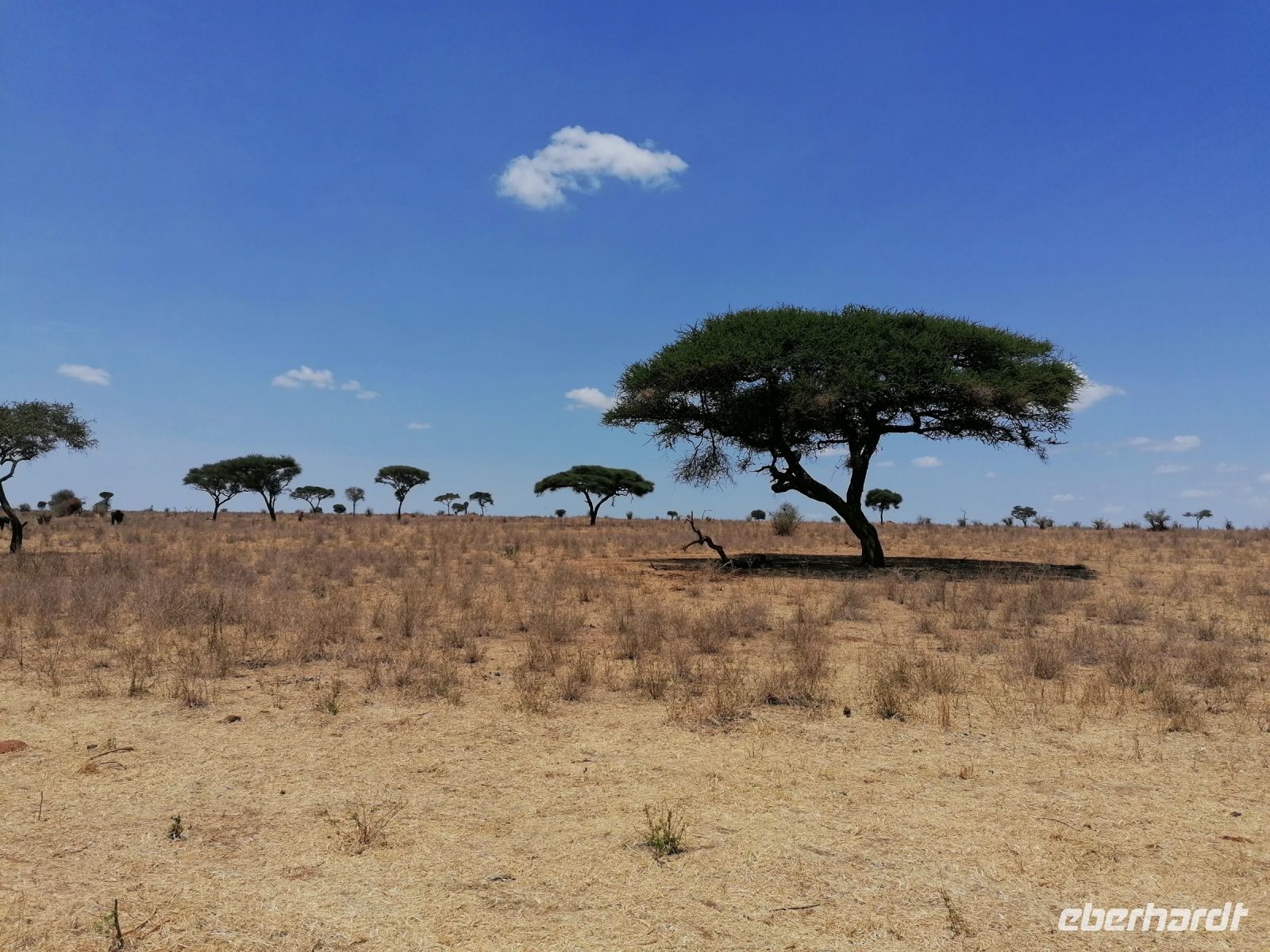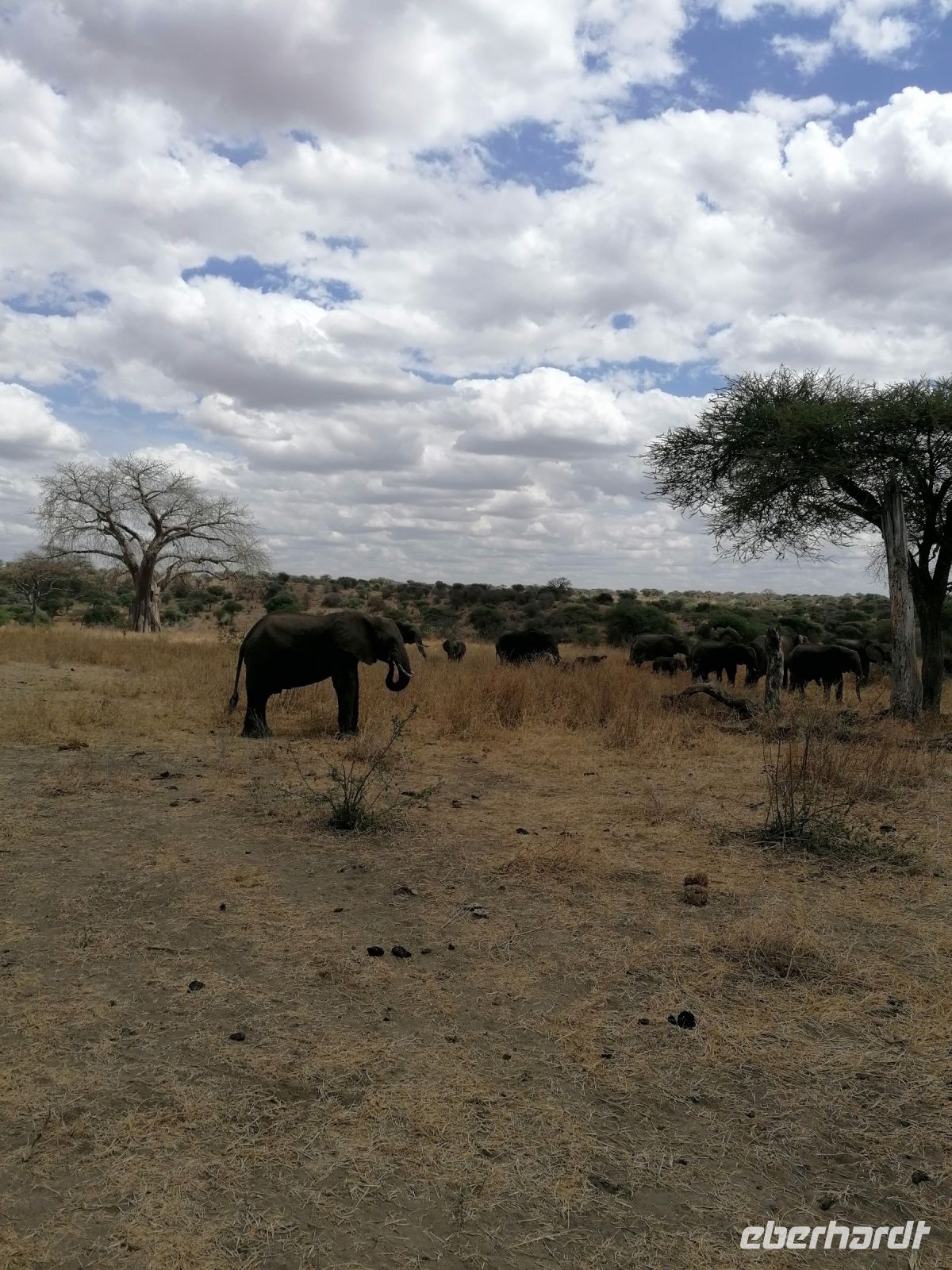 Heute heißt es leider Abschied von unserer liebgewonnene Rivertrees Lodge nehmen. Gemeinsam mit Karim machten wir uns auf dem Weg in Richtung Tarangire Nationalpark. Unterwegs konnten wir einen letzten Blick auf Mount Meru erhaschen, der sich diesmal fast wolkenfrei zeigte. Im Anschluss fuhren wir durch die Stadt Arusha und konnten einen ersten Eindruck von einer afrikanischen Stadt gewinnen. Nach der Stadt erreichten wir die Savanne. Hier konnten man bereits einige Dörfer der Masai entdecken. Die Kinder der Masai passen gemeinsam mit dem Vater auf das Vieh auf. Die Mütter sind für das Essen, das Wasser und auch für das Feuer in den Hütten zuständig. Zudem konnten wir unterwegs Geier mit einem toten Esel erblicken. Um die Mittagszeit erreichten wir das Eingangsgate zum Tarangire Nationalpark. Nach einer schnellen Anmeldung konnte unsere Pirschfahrt beginnen. Zuerst kreuzten Impalas unseren Weg, wo nur die Männer Hörner besitzen. Kurz darauf empfang uns ein Affenblütenbaum, der eigentlich nur nachts blüht, für uns eine Ausnahme machte. Nach kurzer Zeit erreichen wir das Wasserloch, wo sich Zebras, Gnus, Impalas und Warzenschweine begnügten. In kurzer Zeit konnten wir Elanantilopen, Gnus, ein schwarzer Hornrabe und riesige Büffelherde entdecken. Wir waren bereits hin und weg, als wir die Nachricht über einen Leoparden im Baum erhielten. Zum Glück waren wir in der Nähe und konnten uns einen Einblick machen. Leider versteckte sich der Leopard geschickt vor uns, sodass wir nur die Umrisse erahnen konnten. Trotzdem fuhren wir glücklich in Richtung Aussichtspunkt, wo wir eine große Elefantenherde mit Kindern erhaschen konnten. Unsere Mittagspause absolvierten an einen schönen Aussichtspunkt. Gemeinsam mit ein paar Pavianen teilten wir unser Essen und genossen den wunderbaren Ausblick. Nach unserer Mittagspause führten wir unsere Pirsch fort. Im Anschluss konnten wir unzählige Elefanten und Zebras erblicken. Am Fluss konnten wir Geiern bei ihrer Mittagspause zugucken, wo sie eine Giraffe als Mahlzeit verputzten. Des Weiteren erspähten wir Papageien, einen Rotschnabel und Erdmännchen. Ein weiteres Highlight waren drei weibliche Strauße, die mit ihren 22 Babys spazieren gingen. Auf dem Weg zur Lodge liefen uns noch blaue Gabelröcke, Elefant, Dikdik und Warzenschweine über den Weg. Unser Zeltcamp war schön am Rand des Nationalparks gelegen und wir konnten bei dem schönen Sonnenuntergang vom Restaurant aus genießen.