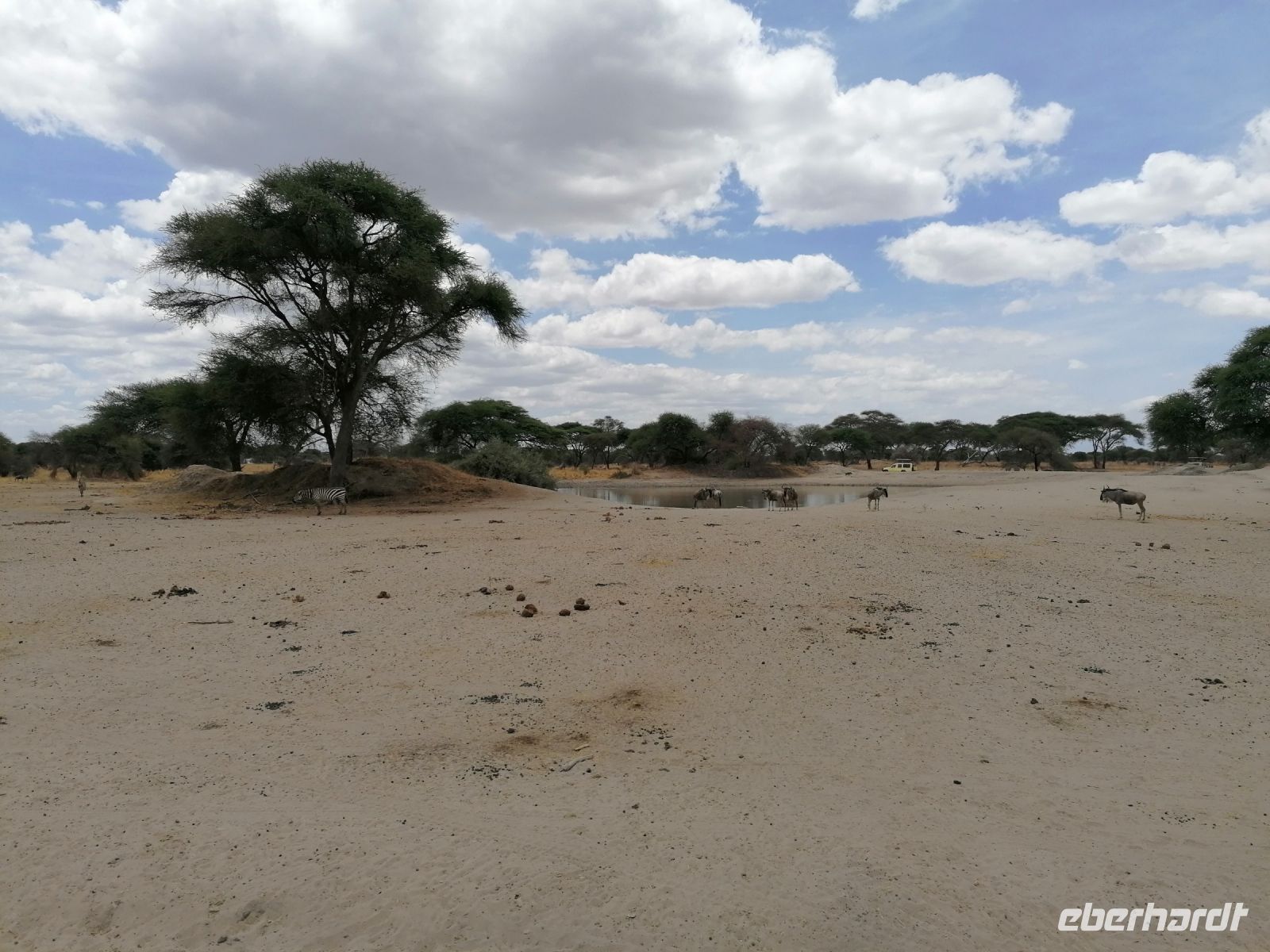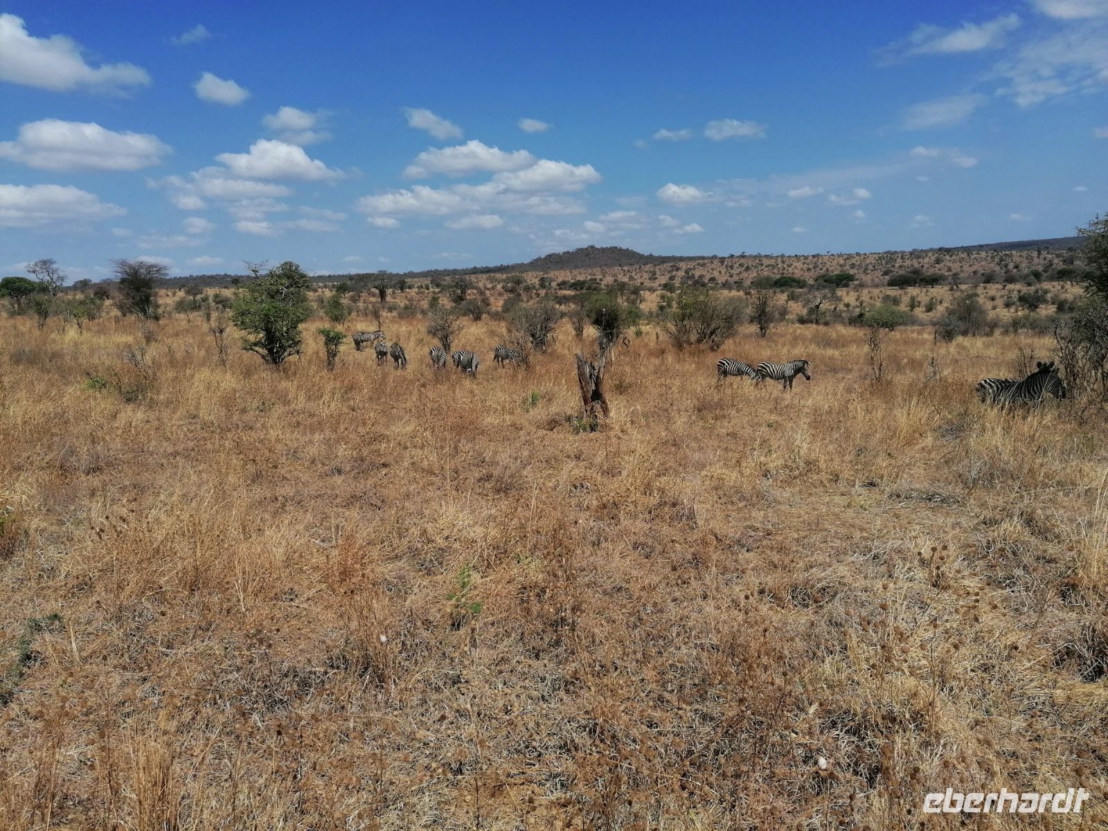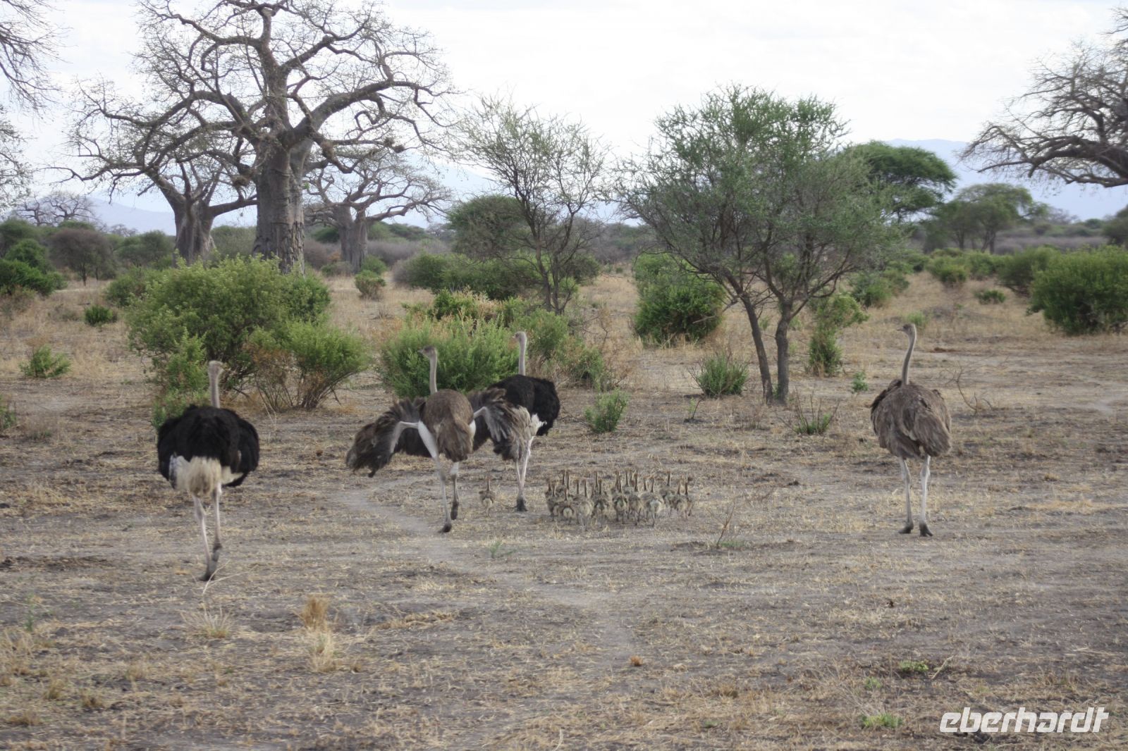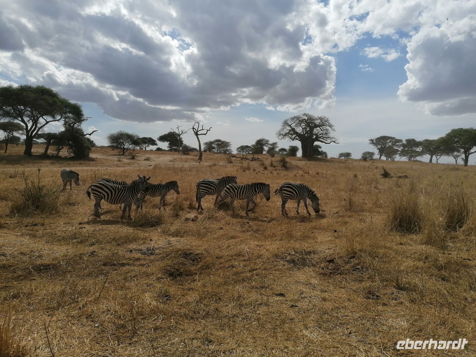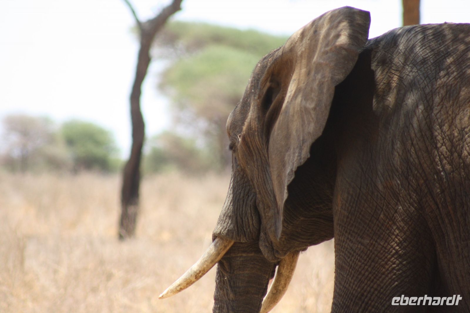 Heute heißt es leider Abschied von unserer liebgewonnene Rivertrees Lodge nehmen. Gemeinsam mit Karim machten wir uns auf dem Weg in Richtung Tarangire Nationalpark. Unterwegs konnten wir einen letzten Blick auf Mount Meru erhaschen, der sich diesmal fast wolkenfrei zeigte. Im Anschluss fuhren wir durch die Stadt Arusha und konnten einen ersten Eindruck von einer afrikanischen Stadt gewinnen. Nach der Stadt erreichten wir die Savanne. Hier konnten man bereits einige Dörfer der Masai entdecken. Die Kinder der Masai passen gemeinsam mit dem Vater auf das Vieh auf. Die Mütter sind für das Essen, das Wasser und auch für das Feuer in den Hütten zuständig. Zudem konnten wir unterwegs Geier mit einem toten Esel erblicken. Um die Mittagszeit erreichten wir das Eingangsgate zum Tarangire Nationalpark. Nach einer schnellen Anmeldung konnte unsere Pirschfahrt beginnen. Zuerst kreuzten Impalas unseren Weg, wo nur die Männer Hörner besitzen. Kurz darauf empfang uns ein Affenblütenbaum, der eigentlich nur nachts blüht, für uns eine Ausnahme machte. Nach kurzer Zeit erreichen wir das Wasserloch, wo sich Zebras, Gnus, Impalas und Warzenschweine begnügten. In kurzer Zeit konnten wir Elanantilopen, Gnus, ein schwarzer Hornrabe und riesige Büffelherde entdecken. Wir waren bereits hin und weg, als wir die Nachricht über einen Leoparden im Baum erhielten. Zum Glück waren wir in der Nähe und konnten uns einen Einblick machen. Leider versteckte sich der Leopard geschickt vor uns, sodass wir nur die Umrisse erahnen konnten. Trotzdem fuhren wir glücklich in Richtung Aussichtspunkt, wo wir eine große Elefantenherde mit Kindern erhaschen konnten. Unsere Mittagspause absolvierten an einen schönen Aussichtspunkt. Gemeinsam mit ein paar Pavianen teilten wir unser Essen und genossen den wunderbaren Ausblick. Nach unserer Mittagspause führten wir unsere Pirsch fort. Im Anschluss konnten wir unzählige Elefanten und Zebras erblicken. Am Fluss konnten wir Geiern bei ihrer Mittagspause zugucken, wo sie eine Giraffe als Mahlzeit verputzten. Des Weiteren erspähten wir Papageien, einen Rotschnabel und Erdmännchen. Ein weiteres Highlight waren drei weibliche Strauße, die mit ihren 22 Babys spazieren gingen. Auf dem Weg zur Lodge liefen uns noch blaue Gabelröcke, Elefant, Dikdik und Warzenschweine über den Weg. Unser Zeltcamp war schön am Rand des Nationalparks gelegen und wir konnten bei dem schönen Sonnenuntergang vom Restaurant aus genießen.