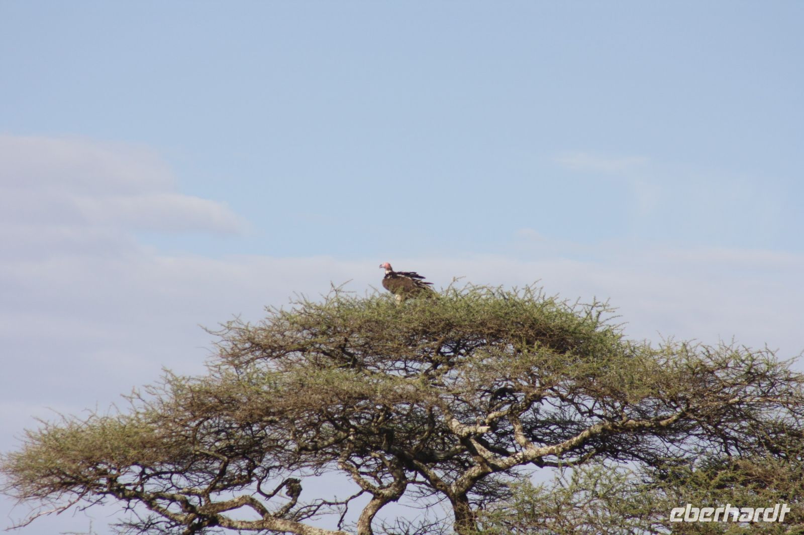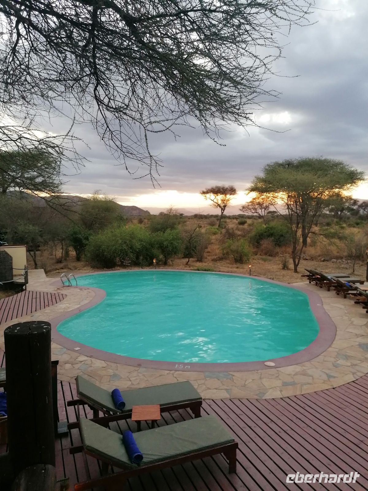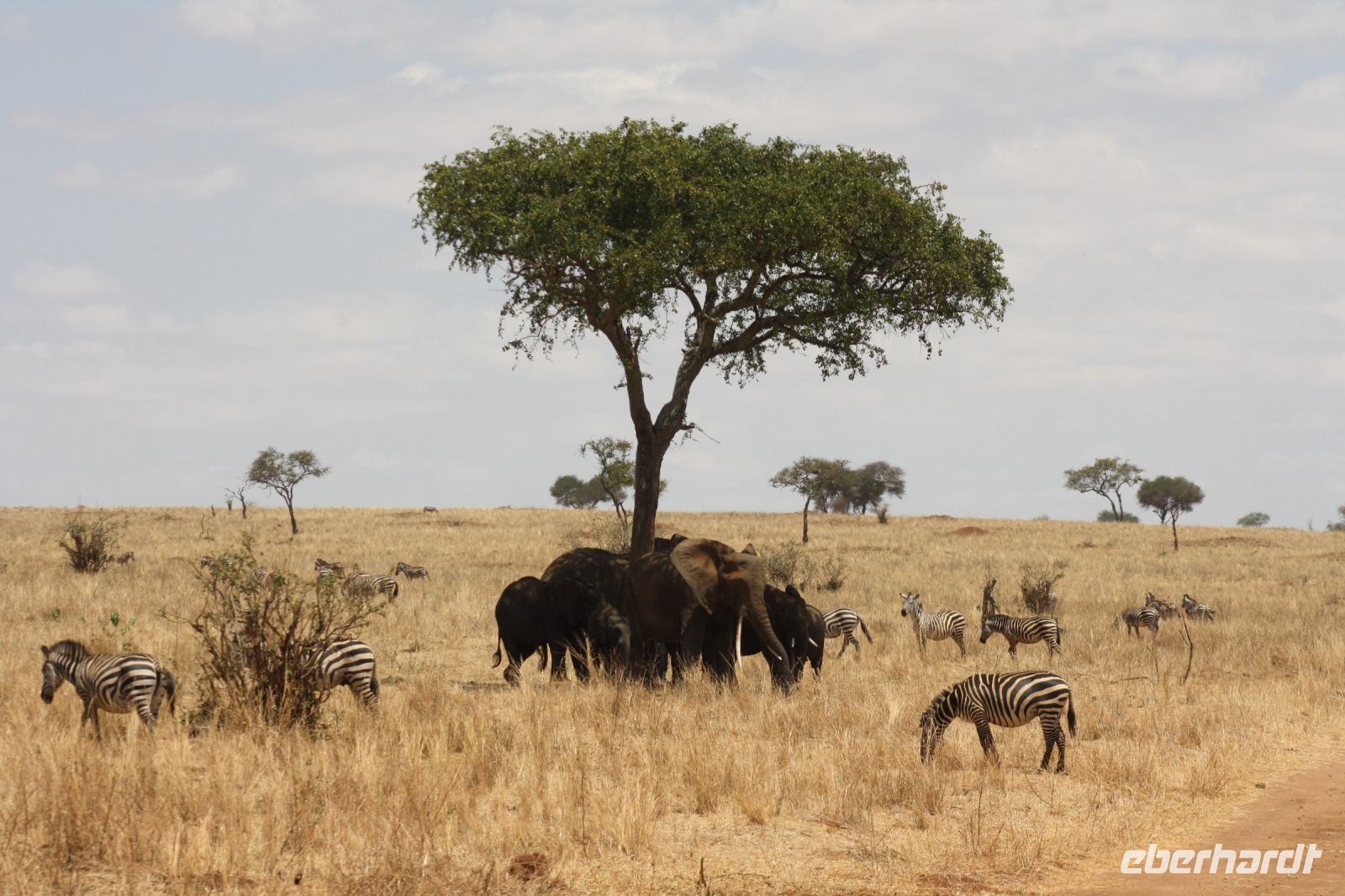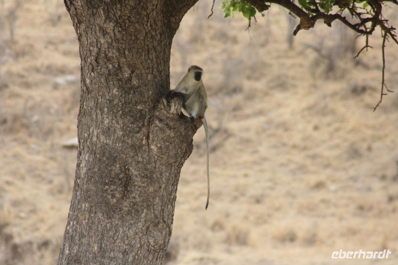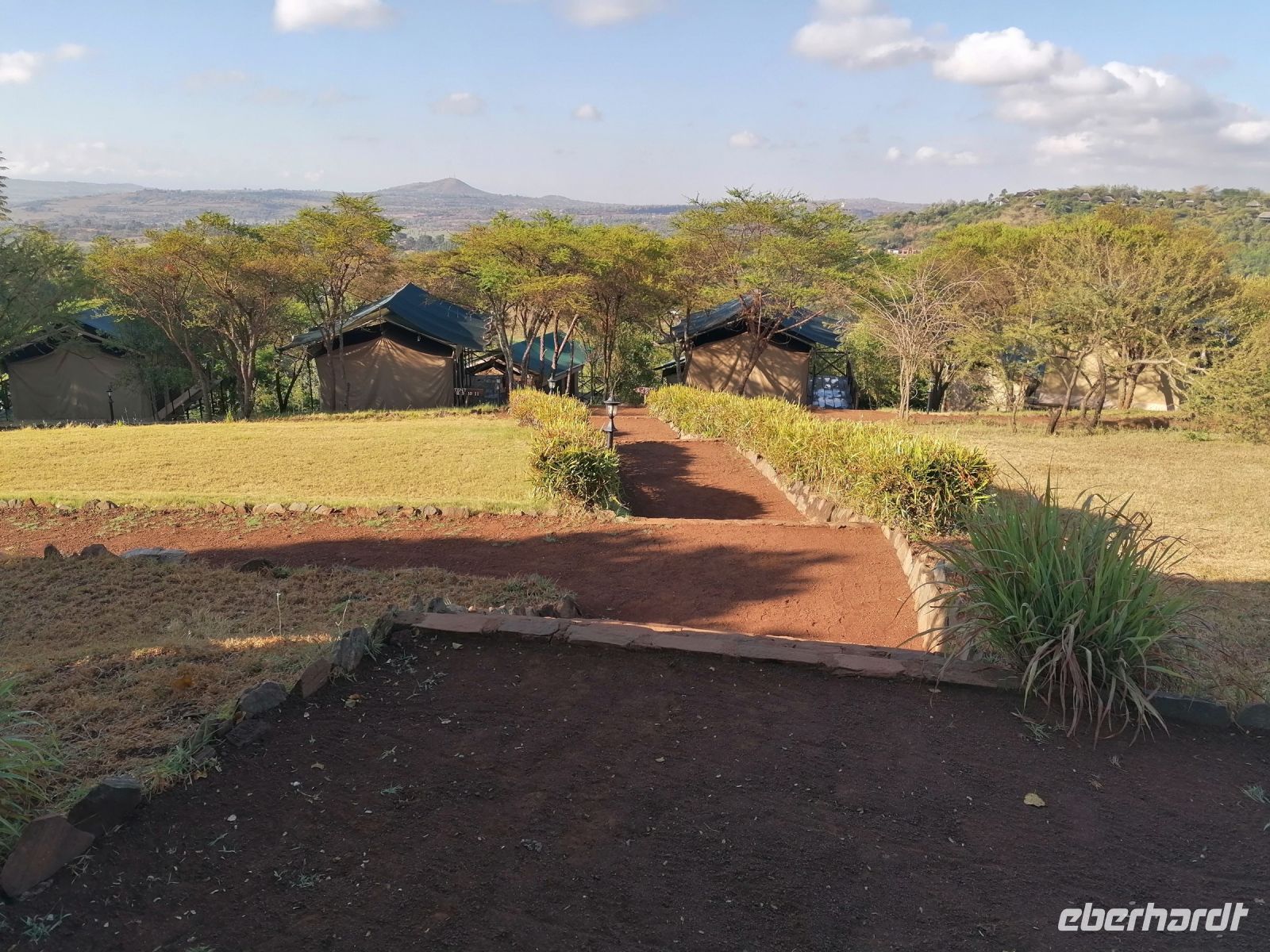 Heute heißt es leider Abschied von unserer liebgewonnene Rivertrees Lodge nehmen. Gemeinsam mit Karim machten wir uns auf dem Weg in Richtung Tarangire Nationalpark. Unterwegs konnten wir einen letzten Blick auf Mount Meru erhaschen, der sich diesmal fast wolkenfrei zeigte. Im Anschluss fuhren wir durch die Stadt Arusha und konnten einen ersten Eindruck von einer afrikanischen Stadt gewinnen. Nach der Stadt erreichten wir die Savanne. Hier konnten man bereits einige Dörfer der Masai entdecken. Die Kinder der Masai passen gemeinsam mit dem Vater auf das Vieh auf. Die Mütter sind für das Essen, das Wasser und auch für das Feuer in den Hütten zuständig. Zudem konnten wir unterwegs Geier mit einem toten Esel erblicken. Um die Mittagszeit erreichten wir das Eingangsgate zum Tarangire Nationalpark. Nach einer schnellen Anmeldung konnte unsere Pirschfahrt beginnen. Zuerst kreuzten Impalas unseren Weg, wo nur die Männer Hörner besitzen. Kurz darauf empfang uns ein Affenblütenbaum, der eigentlich nur nachts blüht, für uns eine Ausnahme machte. Nach kurzer Zeit erreichen wir das Wasserloch, wo sich Zebras, Gnus, Impalas und Warzenschweine begnügten. In kurzer Zeit konnten wir Elanantilopen, Gnus, ein schwarzer Hornrabe und riesige Büffelherde entdecken. Wir waren bereits hin und weg, als wir die Nachricht über einen Leoparden im Baum erhielten. Zum Glück waren wir in der Nähe und konnten uns einen Einblick machen. Leider versteckte sich der Leopard geschickt vor uns, sodass wir nur die Umrisse erahnen konnten. Trotzdem fuhren wir glücklich in Richtung Aussichtspunkt, wo wir eine große Elefantenherde mit Kindern erhaschen konnten. Unsere Mittagspause absolvierten an einen schönen Aussichtspunkt. Gemeinsam mit ein paar Pavianen teilten wir unser Essen und genossen den wunderbaren Ausblick. Nach unserer Mittagspause führten wir unsere Pirsch fort. Im Anschluss konnten wir unzählige Elefanten und Zebras erblicken. Am Fluss konnten wir Geiern bei ihrer Mittagspause zugucken, wo sie eine Giraffe als Mahlzeit verputzten. Des Weiteren erspähten wir Papageien, einen Rotschnabel und Erdmännchen. Ein weiteres Highlight waren drei weibliche Strauße, die mit ihren 22 Babys spazieren gingen. Auf dem Weg zur Lodge liefen uns noch blaue Gabelröcke, Elefant, Dikdik und Warzenschweine über den Weg. Unser Zeltcamp war schön am Rand des Nationalparks gelegen und wir konnten bei dem schönen Sonnenuntergang vom Restaurant aus genießen.