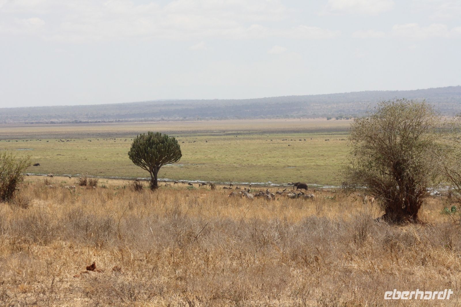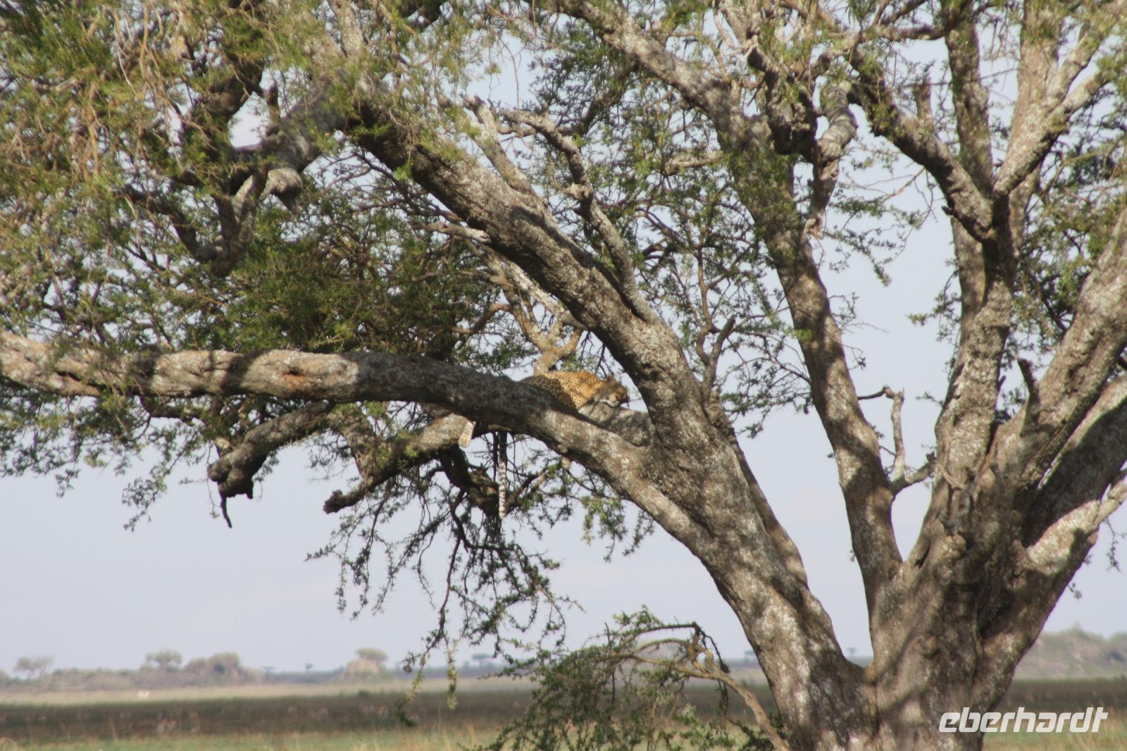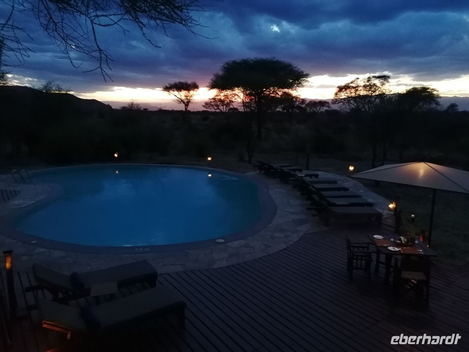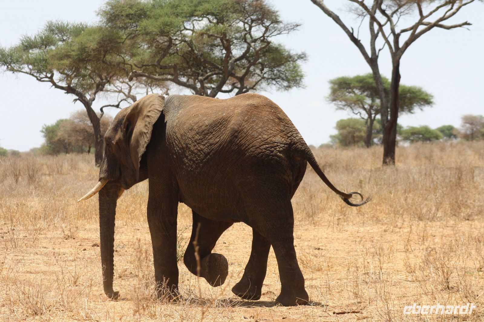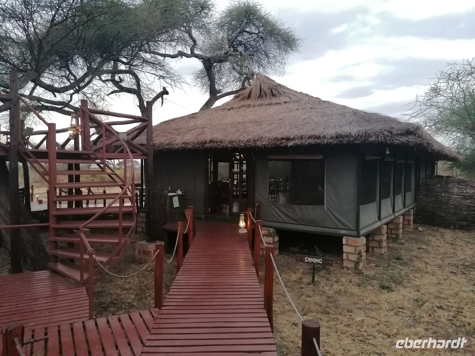 Heute heißt es leider Abschied von unserer liebgewonnene Rivertrees Lodge nehmen. Gemeinsam mit Karim machten wir uns auf dem Weg in Richtung Tarangire Nationalpark. Unterwegs konnten wir einen letzten Blick auf Mount Meru erhaschen, der sich diesmal fast wolkenfrei zeigte. Im Anschluss fuhren wir durch die Stadt Arusha und konnten einen ersten Eindruck von einer afrikanischen Stadt gewinnen. Nach der Stadt erreichten wir die Savanne. Hier konnten man bereits einige Dörfer der Masai entdecken. Die Kinder der Masai passen gemeinsam mit dem Vater auf das Vieh auf. Die Mütter sind für das Essen, das Wasser und auch für das Feuer in den Hütten zuständig. Zudem konnten wir unterwegs Geier mit einem toten Esel erblicken. Um die Mittagszeit erreichten wir das Eingangsgate zum Tarangire Nationalpark. Nach einer schnellen Anmeldung konnte unsere Pirschfahrt beginnen. Zuerst kreuzten Impalas unseren Weg, wo nur die Männer Hörner besitzen. Kurz darauf empfang uns ein Affenblütenbaum, der eigentlich nur nachts blüht, für uns eine Ausnahme machte. Nach kurzer Zeit erreichen wir das Wasserloch, wo sich Zebras, Gnus, Impalas und Warzenschweine begnügten. In kurzer Zeit konnten wir Elanantilopen, Gnus, ein schwarzer Hornrabe und riesige Büffelherde entdecken. Wir waren bereits hin und weg, als wir die Nachricht über einen Leoparden im Baum erhielten. Zum Glück waren wir in der Nähe und konnten uns einen Einblick machen. Leider versteckte sich der Leopard geschickt vor uns, sodass wir nur die Umrisse erahnen konnten. Trotzdem fuhren wir glücklich in Richtung Aussichtspunkt, wo wir eine große Elefantenherde mit Kindern erhaschen konnten. Unsere Mittagspause absolvierten an einen schönen Aussichtspunkt. Gemeinsam mit ein paar Pavianen teilten wir unser Essen und genossen den wunderbaren Ausblick. Nach unserer Mittagspause führten wir unsere Pirsch fort. Im Anschluss konnten wir unzählige Elefanten und Zebras erblicken. Am Fluss konnten wir Geiern bei ihrer Mittagspause zugucken, wo sie eine Giraffe als Mahlzeit verputzten. Des Weiteren erspähten wir Papageien, einen Rotschnabel und Erdmännchen. Ein weiteres Highlight waren drei weibliche Strauße, die mit ihren 22 Babys spazieren gingen. Auf dem Weg zur Lodge liefen uns noch blaue Gabelröcke, Elefant, Dikdik und Warzenschweine über den Weg. Unser Zeltcamp war schön am Rand des Nationalparks gelegen und wir konnten bei dem schönen Sonnenuntergang vom Restaurant aus genießen.