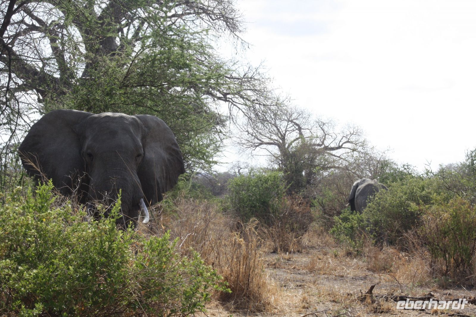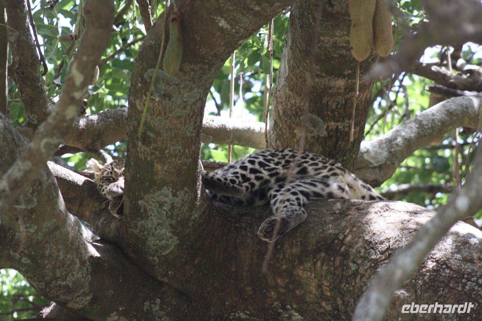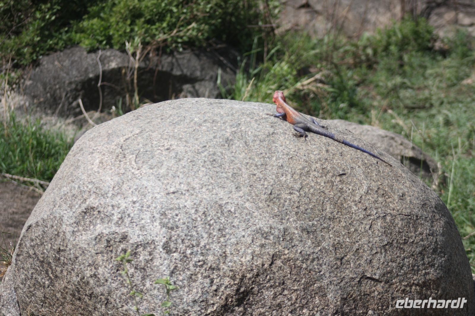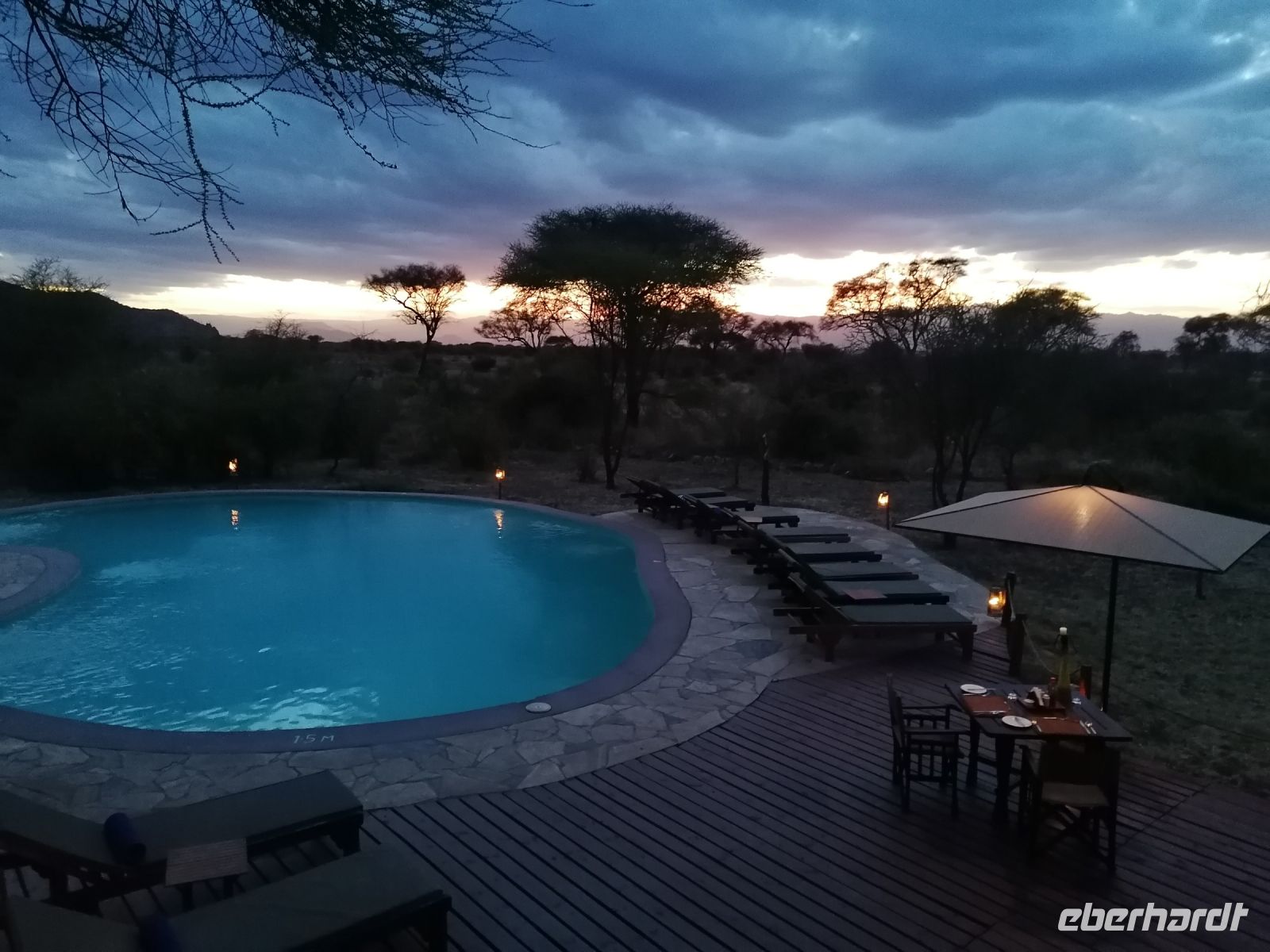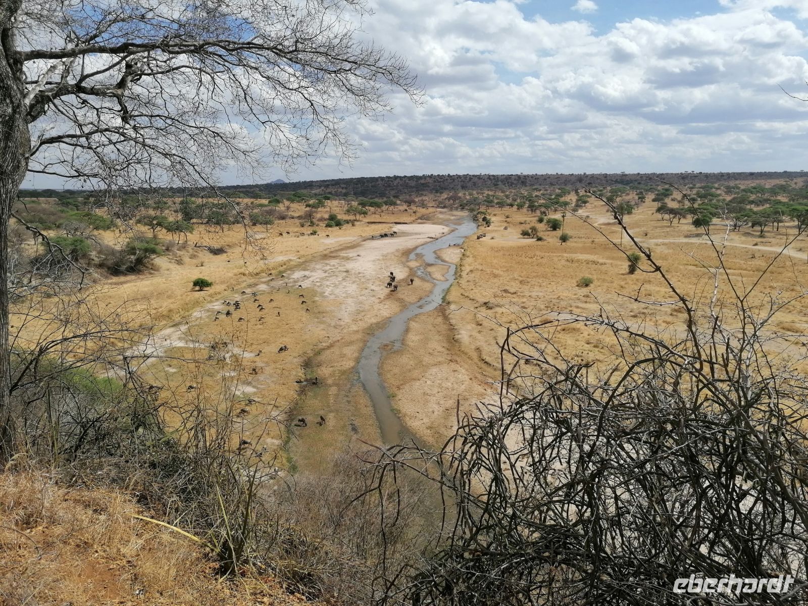 Heute heißt es leider Abschied von unserer liebgewonnene Rivertrees Lodge nehmen. Gemeinsam mit Karim machten wir uns auf dem Weg in Richtung Tarangire Nationalpark. Unterwegs konnten wir einen letzten Blick auf Mount Meru erhaschen, der sich diesmal fast wolkenfrei zeigte. Im Anschluss fuhren wir durch die Stadt Arusha und konnten einen ersten Eindruck von einer afrikanischen Stadt gewinnen. Nach der Stadt erreichten wir die Savanne. Hier konnten man bereits einige Dörfer der Masai entdecken. Die Kinder der Masai passen gemeinsam mit dem Vater auf das Vieh auf. Die Mütter sind für das Essen, das Wasser und auch für das Feuer in den Hütten zuständig. Zudem konnten wir unterwegs Geier mit einem toten Esel erblicken. Um die Mittagszeit erreichten wir das Eingangsgate zum Tarangire Nationalpark. Nach einer schnellen Anmeldung konnte unsere Pirschfahrt beginnen. Zuerst kreuzten Impalas unseren Weg, wo nur die Männer Hörner besitzen. Kurz darauf empfang uns ein Affenblütenbaum, der eigentlich nur nachts blüht, für uns eine Ausnahme machte. Nach kurzer Zeit erreichen wir das Wasserloch, wo sich Zebras, Gnus, Impalas und Warzenschweine begnügten. In kurzer Zeit konnten wir Elanantilopen, Gnus, ein schwarzer Hornrabe und riesige Büffelherde entdecken. Wir waren bereits hin und weg, als wir die Nachricht über einen Leoparden im Baum erhielten. Zum Glück waren wir in der Nähe und konnten uns einen Einblick machen. Leider versteckte sich der Leopard geschickt vor uns, sodass wir nur die Umrisse erahnen konnten. Trotzdem fuhren wir glücklich in Richtung Aussichtspunkt, wo wir eine große Elefantenherde mit Kindern erhaschen konnten. Unsere Mittagspause absolvierten an einen schönen Aussichtspunkt. Gemeinsam mit ein paar Pavianen teilten wir unser Essen und genossen den wunderbaren Ausblick. Nach unserer Mittagspause führten wir unsere Pirsch fort. Im Anschluss konnten wir unzählige Elefanten und Zebras erblicken. Am Fluss konnten wir Geiern bei ihrer Mittagspause zugucken, wo sie eine Giraffe als Mahlzeit verputzten. Des Weiteren erspähten wir Papageien, einen Rotschnabel und Erdmännchen. Ein weiteres Highlight waren drei weibliche Strauße, die mit ihren 22 Babys spazieren gingen. Auf dem Weg zur Lodge liefen uns noch blaue Gabelröcke, Elefant, Dikdik und Warzenschweine über den Weg. Unser Zeltcamp war schön am Rand des Nationalparks gelegen und wir konnten bei dem schönen Sonnenuntergang vom Restaurant aus genießen.