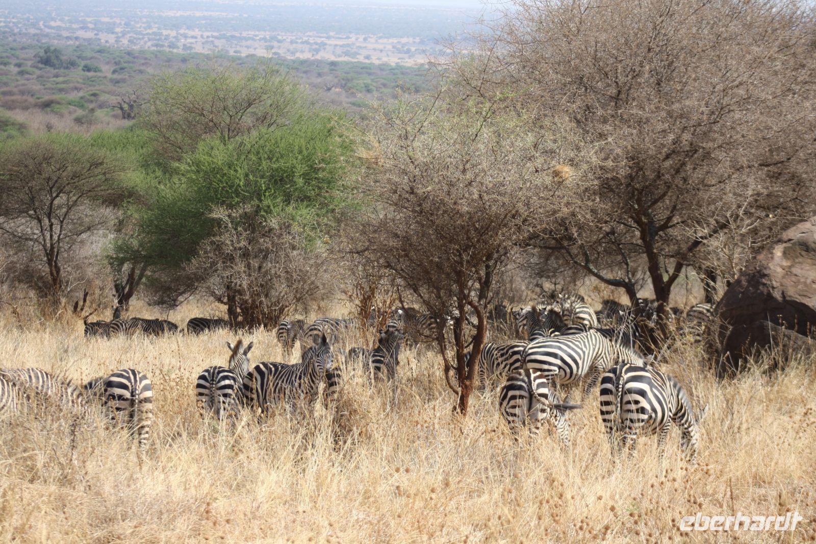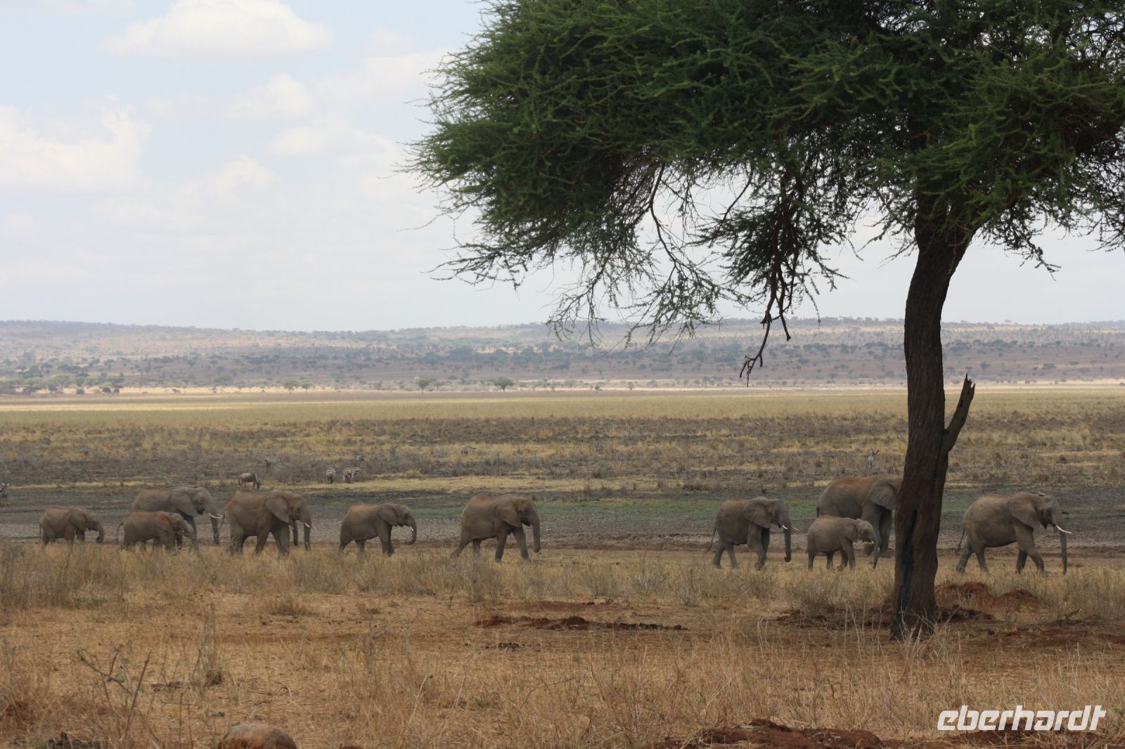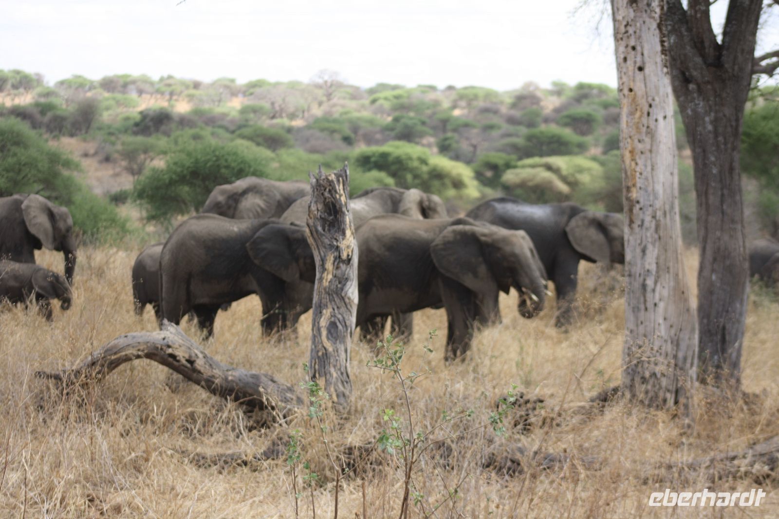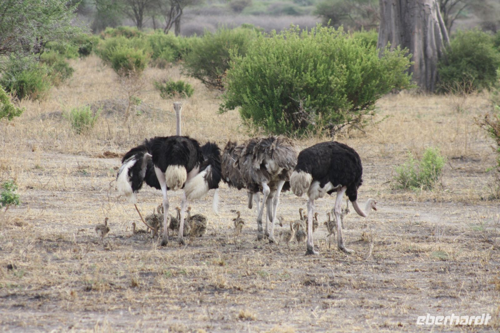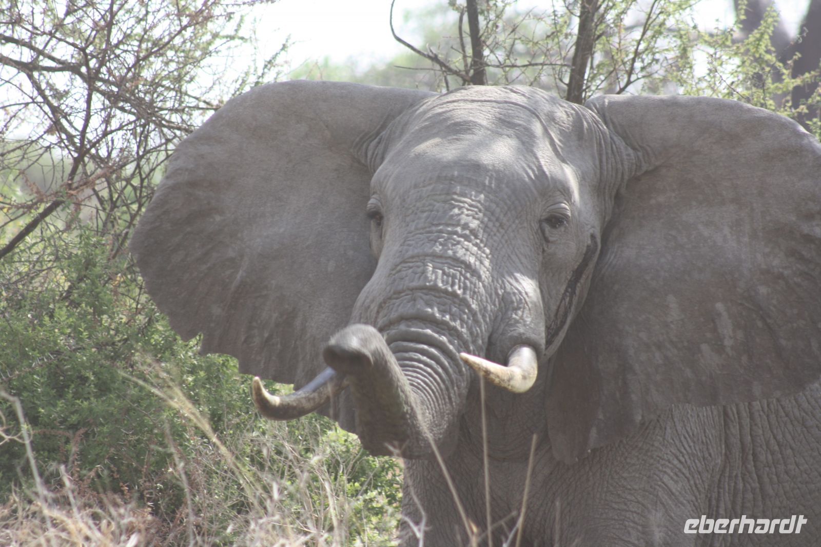 Heute heißt es leider Abschied von unserer liebgewonnene Rivertrees Lodge nehmen. Gemeinsam mit Karim machten wir uns auf dem Weg in Richtung Tarangire Nationalpark. Unterwegs konnten wir einen letzten Blick auf Mount Meru erhaschen, der sich diesmal fast wolkenfrei zeigte. Im Anschluss fuhren wir durch die Stadt Arusha und konnten einen ersten Eindruck von einer afrikanischen Stadt gewinnen. Nach der Stadt erreichten wir die Savanne. Hier konnten man bereits einige Dörfer der Masai entdecken. Die Kinder der Masai passen gemeinsam mit dem Vater auf das Vieh auf. Die Mütter sind für das Essen, das Wasser und auch für das Feuer in den Hütten zuständig. Zudem konnten wir unterwegs Geier mit einem toten Esel erblicken. Um die Mittagszeit erreichten wir das Eingangsgate zum Tarangire Nationalpark. Nach einer schnellen Anmeldung konnte unsere Pirschfahrt beginnen. Zuerst kreuzten Impalas unseren Weg, wo nur die Männer Hörner besitzen. Kurz darauf empfang uns ein Affenblütenbaum, der eigentlich nur nachts blüht, für uns eine Ausnahme machte. Nach kurzer Zeit erreichen wir das Wasserloch, wo sich Zebras, Gnus, Impalas und Warzenschweine begnügten. In kurzer Zeit konnten wir Elanantilopen, Gnus, ein schwarzer Hornrabe und riesige Büffelherde entdecken. Wir waren bereits hin und weg, als wir die Nachricht über einen Leoparden im Baum erhielten. Zum Glück waren wir in der Nähe und konnten uns einen Einblick machen. Leider versteckte sich der Leopard geschickt vor uns, sodass wir nur die Umrisse erahnen konnten. Trotzdem fuhren wir glücklich in Richtung Aussichtspunkt, wo wir eine große Elefantenherde mit Kindern erhaschen konnten. Unsere Mittagspause absolvierten an einen schönen Aussichtspunkt. Gemeinsam mit ein paar Pavianen teilten wir unser Essen und genossen den wunderbaren Ausblick. Nach unserer Mittagspause führten wir unsere Pirsch fort. Im Anschluss konnten wir unzählige Elefanten und Zebras erblicken. Am Fluss konnten wir Geiern bei ihrer Mittagspause zugucken, wo sie eine Giraffe als Mahlzeit verputzten. Des Weiteren erspähten wir Papageien, einen Rotschnabel und Erdmännchen. Ein weiteres Highlight waren drei weibliche Strauße, die mit ihren 22 Babys spazieren gingen. Auf dem Weg zur Lodge liefen uns noch blaue Gabelröcke, Elefant, Dikdik und Warzenschweine über den Weg. Unser Zeltcamp war schön am Rand des Nationalparks gelegen und wir konnten bei dem schönen Sonnenuntergang vom Restaurant aus genießen.