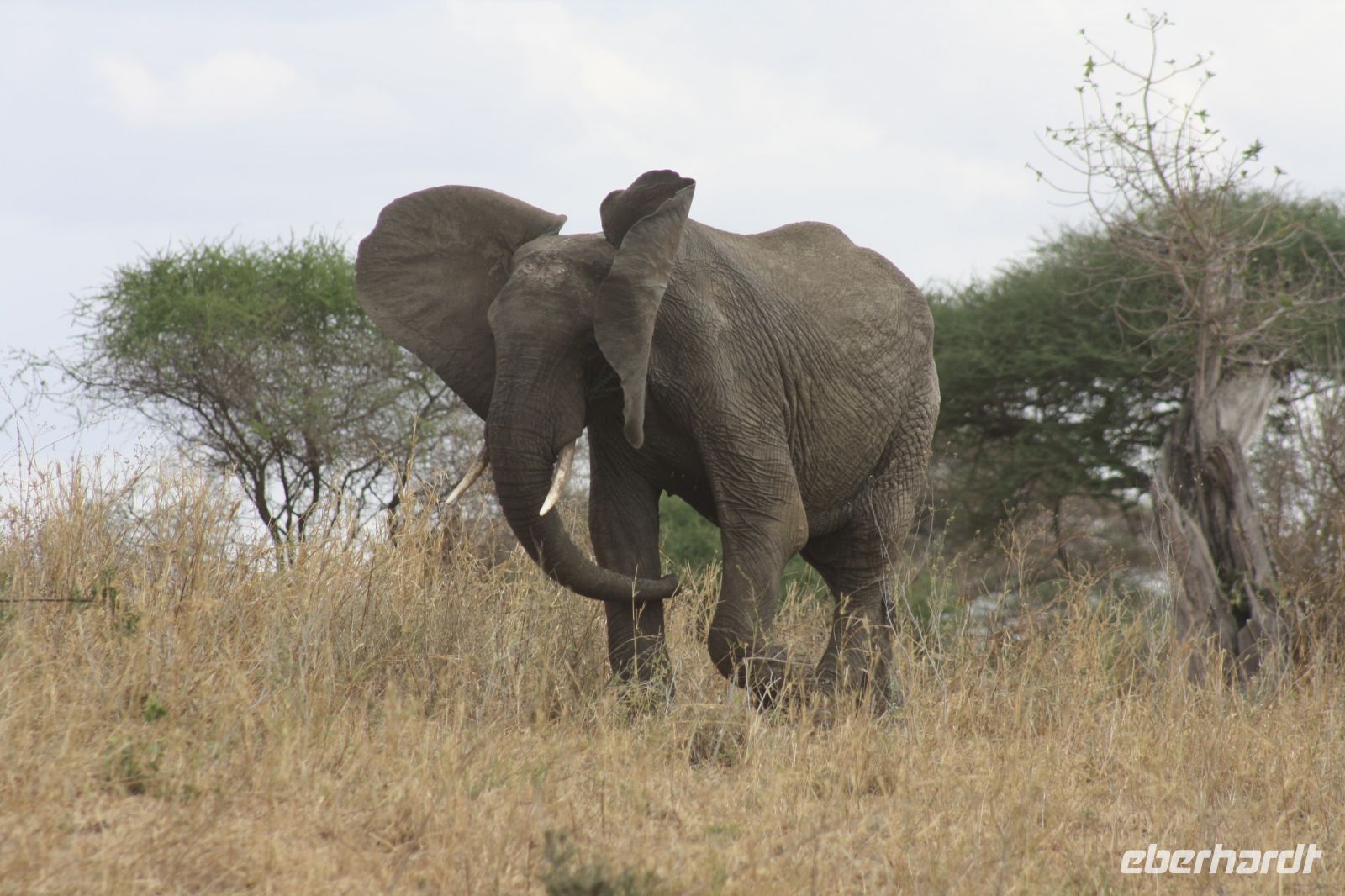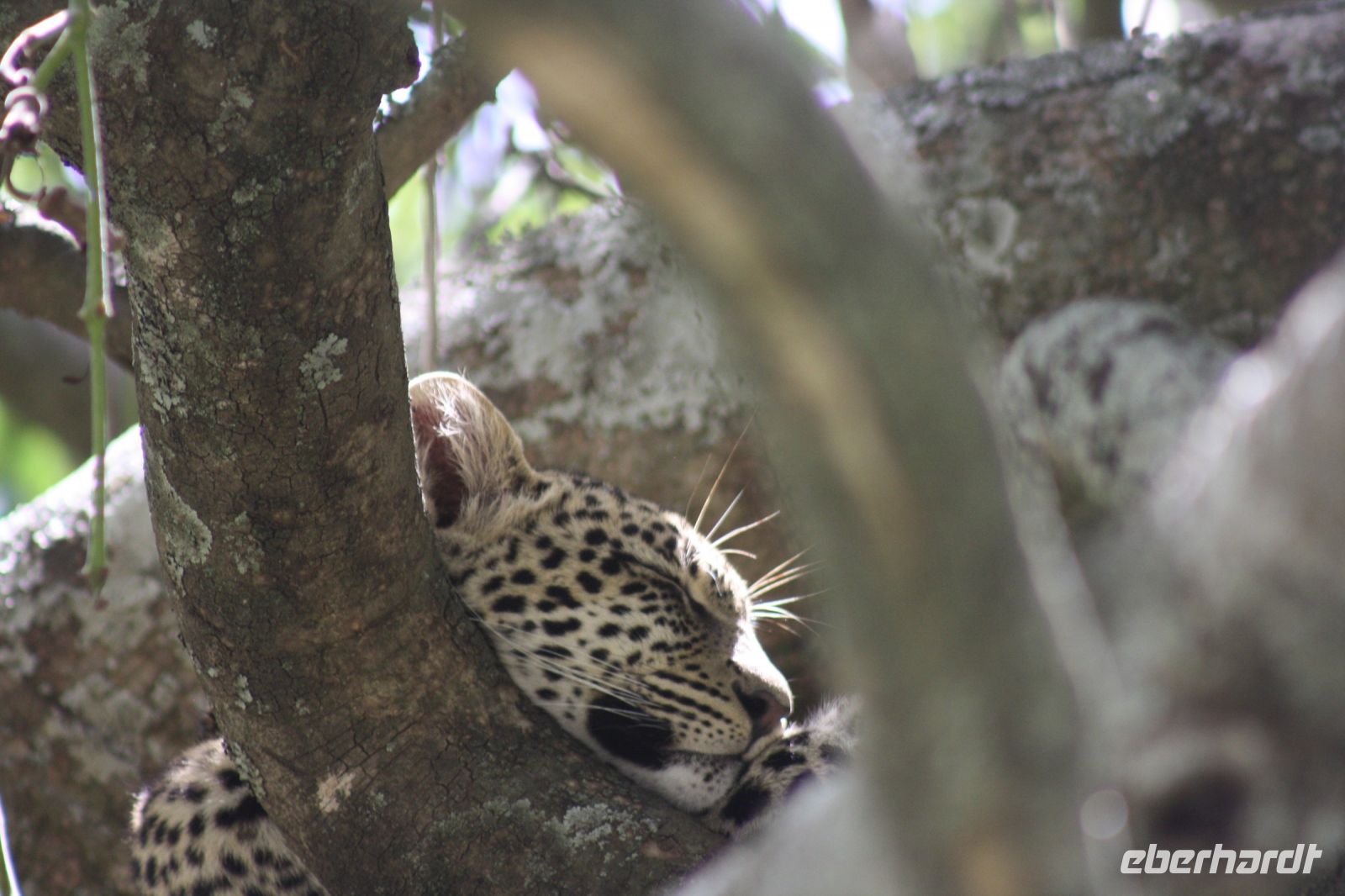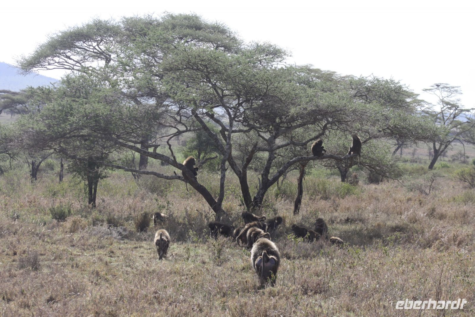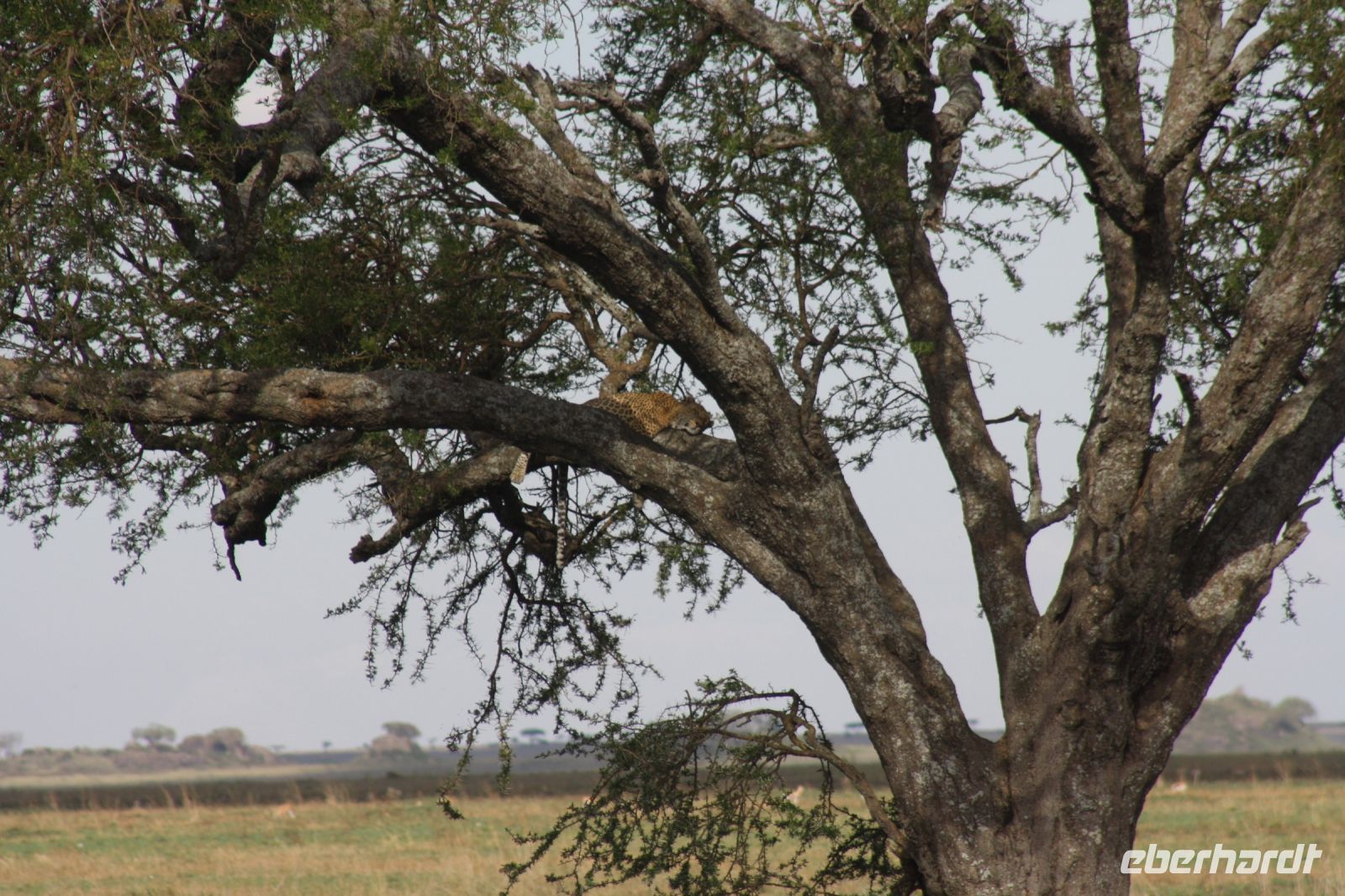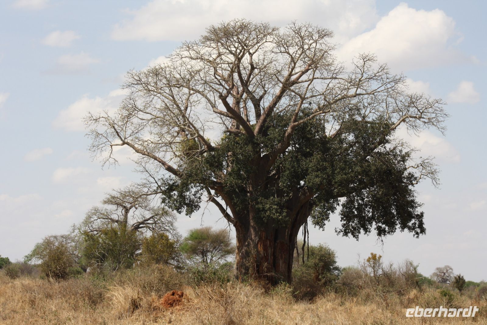 Heute heißt es leider Abschied von unserer liebgewonnene Rivertrees Lodge nehmen. Gemeinsam mit Karim machten wir uns auf dem Weg in Richtung Tarangire Nationalpark. Unterwegs konnten wir einen letzten Blick auf Mount Meru erhaschen, der sich diesmal fast wolkenfrei zeigte. Im Anschluss fuhren wir durch die Stadt Arusha und konnten einen ersten Eindruck von einer afrikanischen Stadt gewinnen. Nach der Stadt erreichten wir die Savanne. Hier konnten man bereits einige Dörfer der Masai entdecken. Die Kinder der Masai passen gemeinsam mit dem Vater auf das Vieh auf. Die Mütter sind für das Essen, das Wasser und auch für das Feuer in den Hütten zuständig. Zudem konnten wir unterwegs Geier mit einem toten Esel erblicken. Um die Mittagszeit erreichten wir das Eingangsgate zum Tarangire Nationalpark. Nach einer schnellen Anmeldung konnte unsere Pirschfahrt beginnen. Zuerst kreuzten Impalas unseren Weg, wo nur die Männer Hörner besitzen. Kurz darauf empfang uns ein Affenblütenbaum, der eigentlich nur nachts blüht, für uns eine Ausnahme machte. Nach kurzer Zeit erreichen wir das Wasserloch, wo sich Zebras, Gnus, Impalas und Warzenschweine begnügten. In kurzer Zeit konnten wir Elanantilopen, Gnus, ein schwarzer Hornrabe und riesige Büffelherde entdecken. Wir waren bereits hin und weg, als wir die Nachricht über einen Leoparden im Baum erhielten. Zum Glück waren wir in der Nähe und konnten uns einen Einblick machen. Leider versteckte sich der Leopard geschickt vor uns, sodass wir nur die Umrisse erahnen konnten. Trotzdem fuhren wir glücklich in Richtung Aussichtspunkt, wo wir eine große Elefantenherde mit Kindern erhaschen konnten. Unsere Mittagspause absolvierten an einen schönen Aussichtspunkt. Gemeinsam mit ein paar Pavianen teilten wir unser Essen und genossen den wunderbaren Ausblick. Nach unserer Mittagspause führten wir unsere Pirsch fort. Im Anschluss konnten wir unzählige Elefanten und Zebras erblicken. Am Fluss konnten wir Geiern bei ihrer Mittagspause zugucken, wo sie eine Giraffe als Mahlzeit verputzten. Des Weiteren erspähten wir Papageien, einen Rotschnabel und Erdmännchen. Ein weiteres Highlight waren drei weibliche Strauße, die mit ihren 22 Babys spazieren gingen. Auf dem Weg zur Lodge liefen uns noch blaue Gabelröcke, Elefant, Dikdik und Warzenschweine über den Weg. Unser Zeltcamp war schön am Rand des Nationalparks gelegen und wir konnten bei dem schönen Sonnenuntergang vom Restaurant aus genießen.