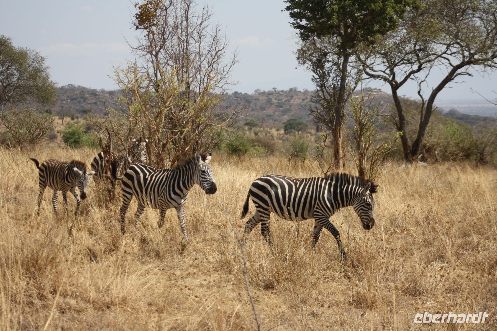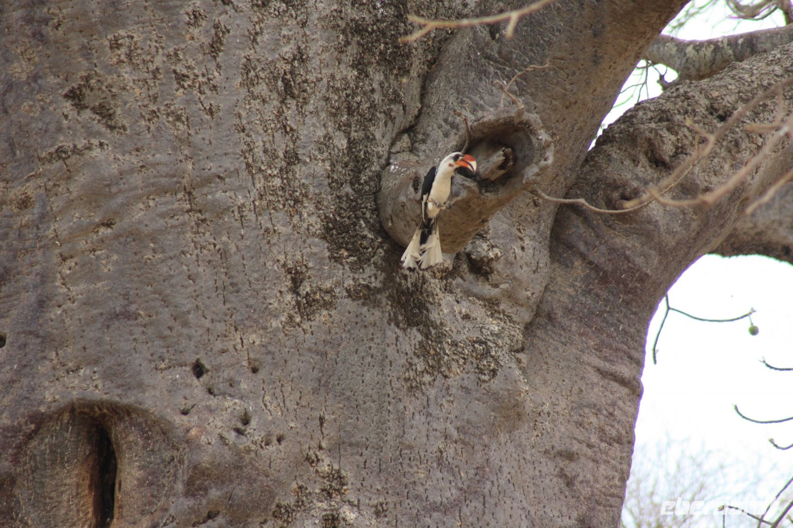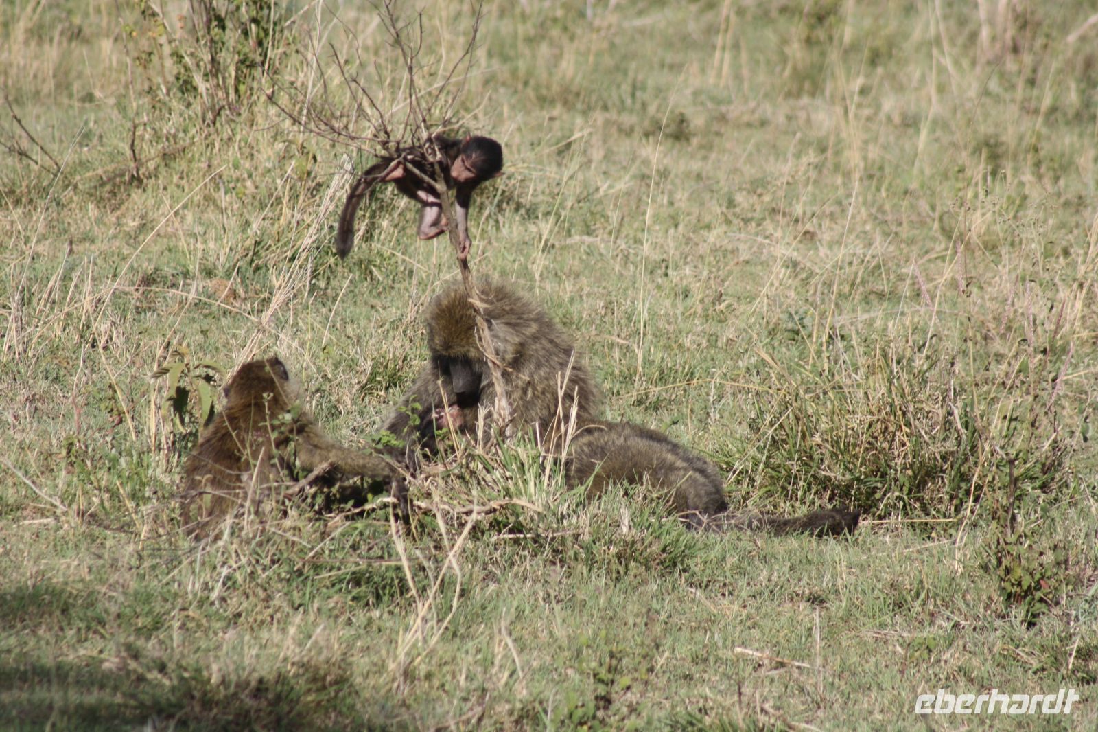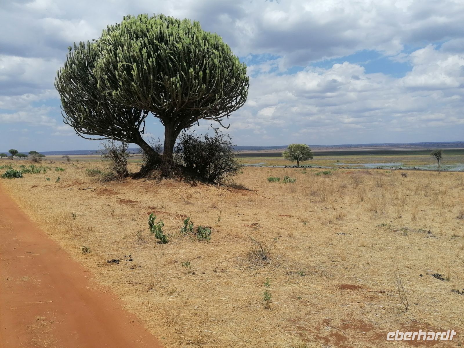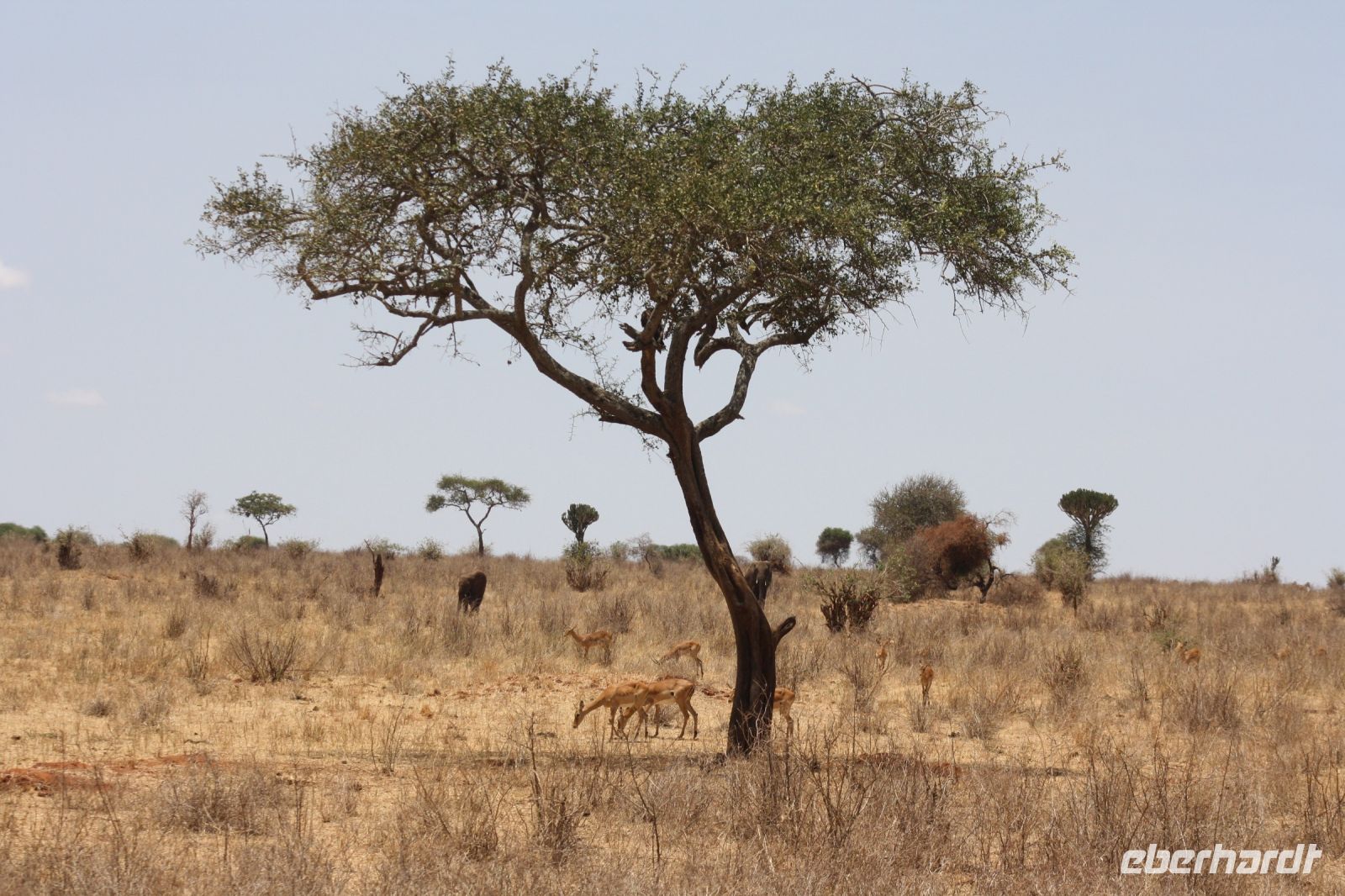 Heute heißt es leider Abschied von unserer liebgewonnene Rivertrees Lodge nehmen. Gemeinsam mit Karim machten wir uns auf dem Weg in Richtung Tarangire Nationalpark. Unterwegs konnten wir einen letzten Blick auf Mount Meru erhaschen, der sich diesmal fast wolkenfrei zeigte. Im Anschluss fuhren wir durch die Stadt Arusha und konnten einen ersten Eindruck von einer afrikanischen Stadt gewinnen. Nach der Stadt erreichten wir die Savanne. Hier konnten man bereits einige Dörfer der Masai entdecken. Die Kinder der Masai passen gemeinsam mit dem Vater auf das Vieh auf. Die Mütter sind für das Essen, das Wasser und auch für das Feuer in den Hütten zuständig. Zudem konnten wir unterwegs Geier mit einem toten Esel erblicken. Um die Mittagszeit erreichten wir das Eingangsgate zum Tarangire Nationalpark. Nach einer schnellen Anmeldung konnte unsere Pirschfahrt beginnen. Zuerst kreuzten Impalas unseren Weg, wo nur die Männer Hörner besitzen. Kurz darauf empfang uns ein Affenblütenbaum, der eigentlich nur nachts blüht, für uns eine Ausnahme machte. Nach kurzer Zeit erreichen wir das Wasserloch, wo sich Zebras, Gnus, Impalas und Warzenschweine begnügten. In kurzer Zeit konnten wir Elanantilopen, Gnus, ein schwarzer Hornrabe und riesige Büffelherde entdecken. Wir waren bereits hin und weg, als wir die Nachricht über einen Leoparden im Baum erhielten. Zum Glück waren wir in der Nähe und konnten uns einen Einblick machen. Leider versteckte sich der Leopard geschickt vor uns, sodass wir nur die Umrisse erahnen konnten. Trotzdem fuhren wir glücklich in Richtung Aussichtspunkt, wo wir eine große Elefantenherde mit Kindern erhaschen konnten. Unsere Mittagspause absolvierten an einen schönen Aussichtspunkt. Gemeinsam mit ein paar Pavianen teilten wir unser Essen und genossen den wunderbaren Ausblick. Nach unserer Mittagspause führten wir unsere Pirsch fort. Im Anschluss konnten wir unzählige Elefanten und Zebras erblicken. Am Fluss konnten wir Geiern bei ihrer Mittagspause zugucken, wo sie eine Giraffe als Mahlzeit verputzten. Des Weiteren erspähten wir Papageien, einen Rotschnabel und Erdmännchen. Ein weiteres Highlight waren drei weibliche Strauße, die mit ihren 22 Babys spazieren gingen. Auf dem Weg zur Lodge liefen uns noch blaue Gabelröcke, Elefant, Dikdik und Warzenschweine über den Weg. Unser Zeltcamp war schön am Rand des Nationalparks gelegen und wir konnten bei dem schönen Sonnenuntergang vom Restaurant aus genießen.