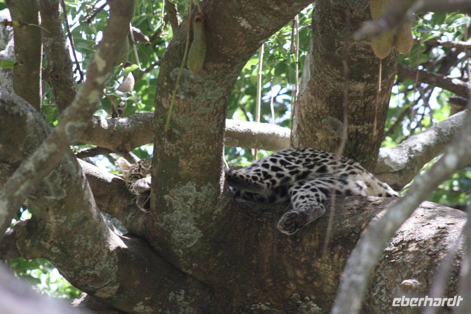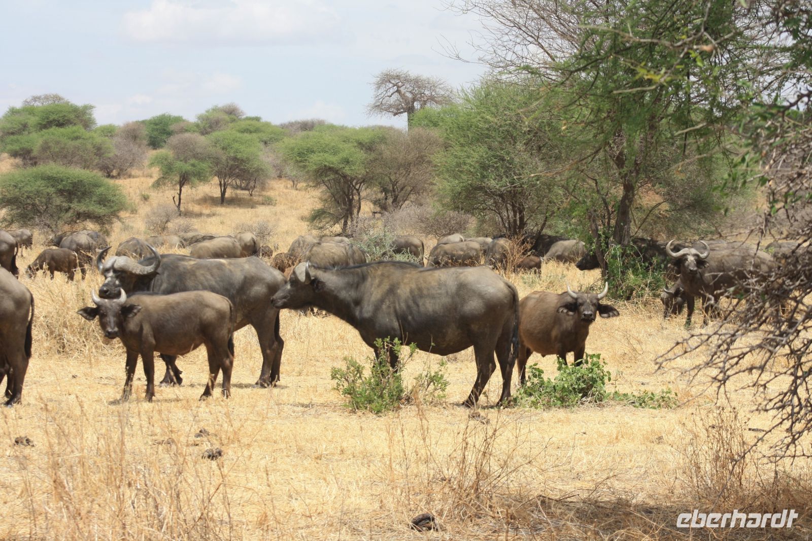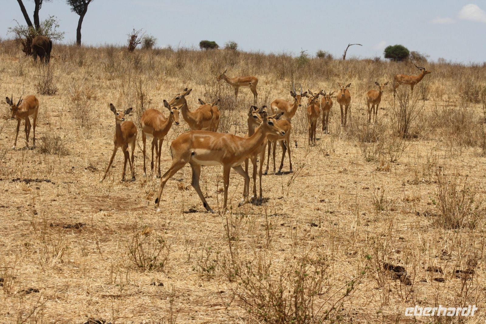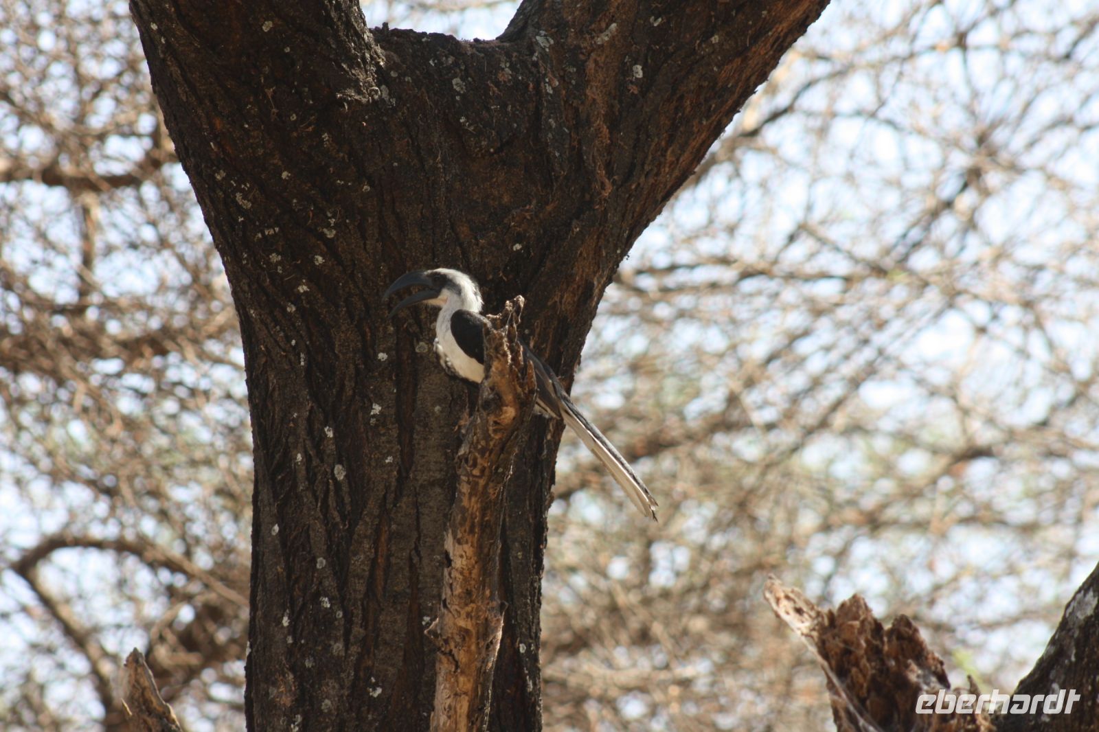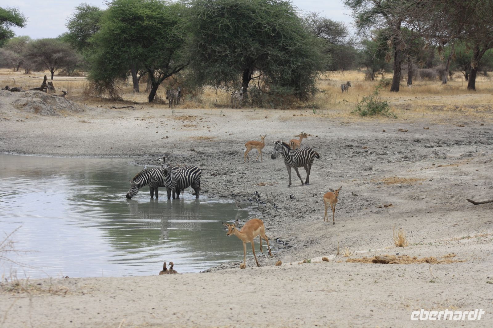 Heute heißt es leider Abschied von unserer liebgewonnene Rivertrees Lodge nehmen. Gemeinsam mit Karim machten wir uns auf dem Weg in Richtung Tarangire Nationalpark. Unterwegs konnten wir einen letzten Blick auf Mount Meru erhaschen, der sich diesmal fast wolkenfrei zeigte. Im Anschluss fuhren wir durch die Stadt Arusha und konnten einen ersten Eindruck von einer afrikanischen Stadt gewinnen. Nach der Stadt erreichten wir die Savanne. Hier konnten man bereits einige Dörfer der Masai entdecken. Die Kinder der Masai passen gemeinsam mit dem Vater auf das Vieh auf. Die Mütter sind für das Essen, das Wasser und auch für das Feuer in den Hütten zuständig. Zudem konnten wir unterwegs Geier mit einem toten Esel erblicken. Um die Mittagszeit erreichten wir das Eingangsgate zum Tarangire Nationalpark. Nach einer schnellen Anmeldung konnte unsere Pirschfahrt beginnen. Zuerst kreuzten Impalas unseren Weg, wo nur die Männer Hörner besitzen. Kurz darauf empfang uns ein Affenblütenbaum, der eigentlich nur nachts blüht, für uns eine Ausnahme machte. Nach kurzer Zeit erreichen wir das Wasserloch, wo sich Zebras, Gnus, Impalas und Warzenschweine begnügten. In kurzer Zeit konnten wir Elanantilopen, Gnus, ein schwarzer Hornrabe und riesige Büffelherde entdecken. Wir waren bereits hin und weg, als wir die Nachricht über einen Leoparden im Baum erhielten. Zum Glück waren wir in der Nähe und konnten uns einen Einblick machen. Leider versteckte sich der Leopard geschickt vor uns, sodass wir nur die Umrisse erahnen konnten. Trotzdem fuhren wir glücklich in Richtung Aussichtspunkt, wo wir eine große Elefantenherde mit Kindern erhaschen konnten. Unsere Mittagspause absolvierten an einen schönen Aussichtspunkt. Gemeinsam mit ein paar Pavianen teilten wir unser Essen und genossen den wunderbaren Ausblick. Nach unserer Mittagspause führten wir unsere Pirsch fort. Im Anschluss konnten wir unzählige Elefanten und Zebras erblicken. Am Fluss konnten wir Geiern bei ihrer Mittagspause zugucken, wo sie eine Giraffe als Mahlzeit verputzten. Des Weiteren erspähten wir Papageien, einen Rotschnabel und Erdmännchen. Ein weiteres Highlight waren drei weibliche Strauße, die mit ihren 22 Babys spazieren gingen. Auf dem Weg zur Lodge liefen uns noch blaue Gabelröcke, Elefant, Dikdik und Warzenschweine über den Weg. Unser Zeltcamp war schön am Rand des Nationalparks gelegen und wir konnten bei dem schönen Sonnenuntergang vom Restaurant aus genießen.