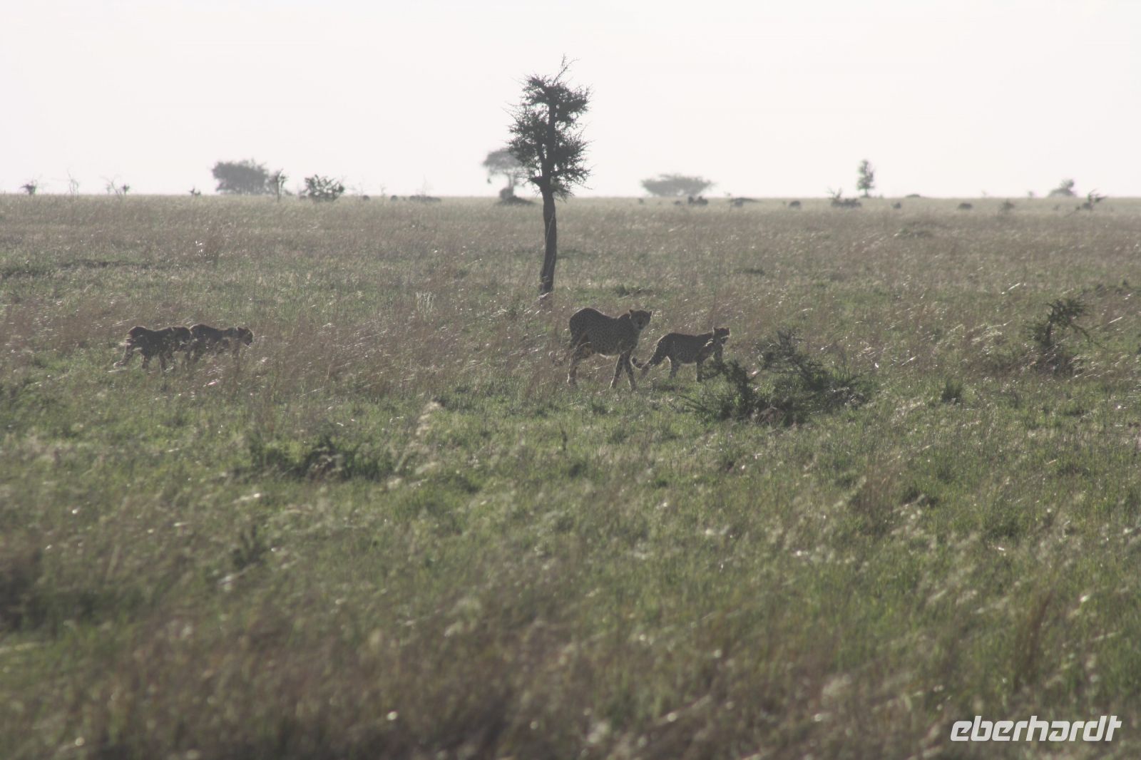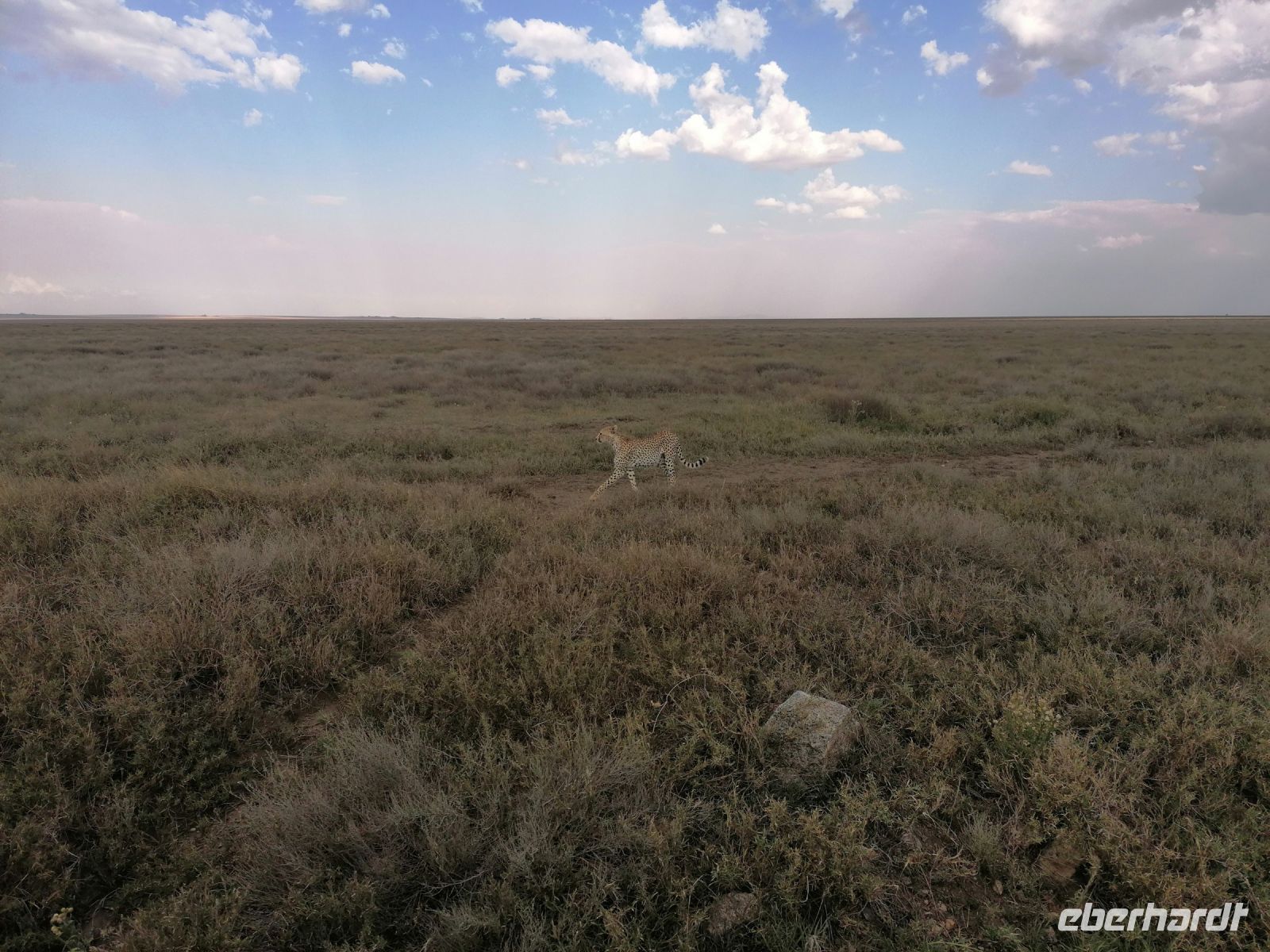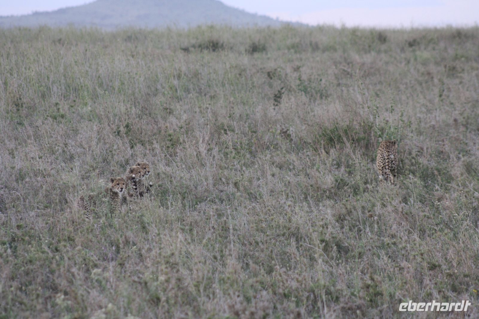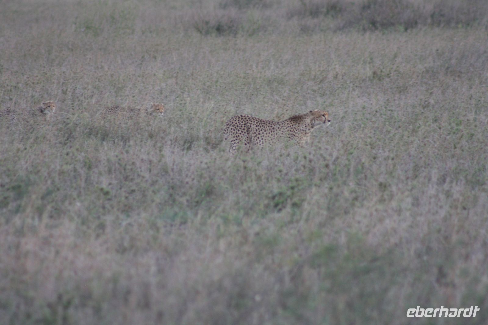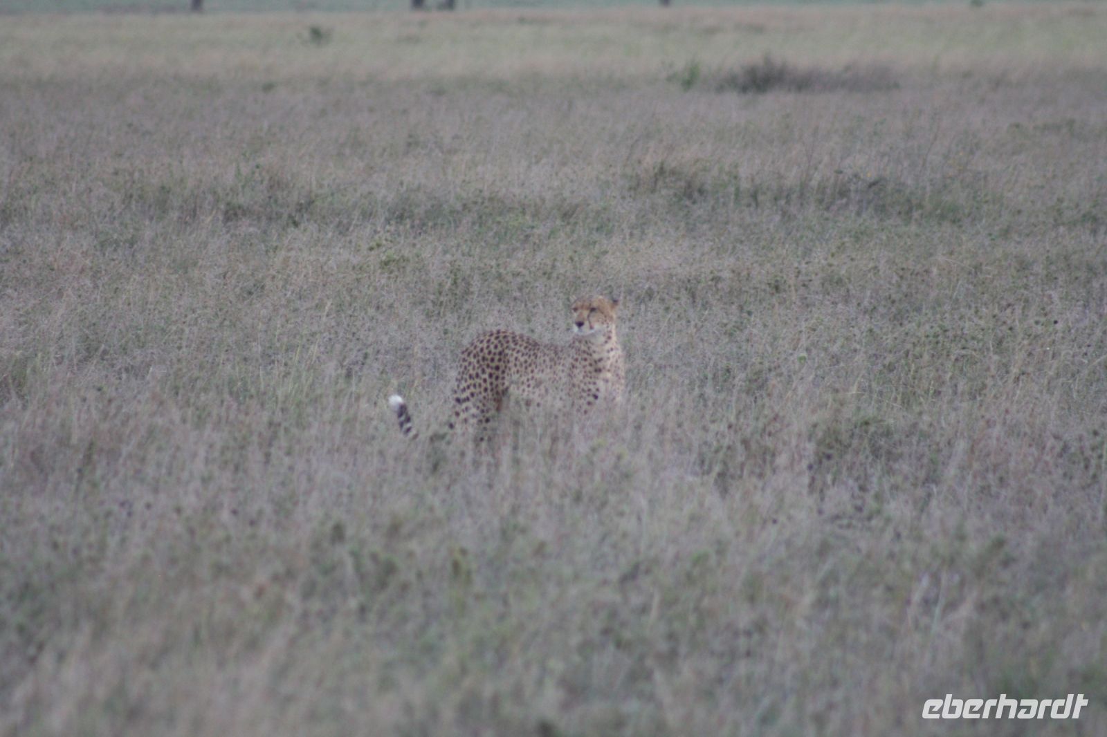 Heute starteten wir etwas früher los als sonst, denn wir wollten nochmal die Serengeti genießen. Am frühen Morgen konnten wir sofort einen Adler vor unsere Linse bekommen. In der Savanne war in der Morgenstunde viel los. Unterwegs trafen wir auf Elanantilope, Paviane mit Kleinkind, Büffel, Perlhühner, Zebras, Warzenschweine, sowie Thomson- und Kuhantilopen. Auch die Vogelwelt zeigte sich in Form eines Rothalsfrankolin, Sekretärs und einem Adler mit einem kleinen Baby im Nest. Plötzlich entdeckten wir einen nachtaktive Serval auf einem Feld. Die Wildkatze, die so groß wie eine Hauskatze ist, ist selten zu beobachten und wir konnten unser Glück kaum fassen. Immer weitere führte uns Karim durch die Serengeti. Unterwegs beobachteten wir einen randalierenden Elefanten, der vermutlich auf der Suche nach einem Weibchen. Nach einer einsamen Hyäne trafen wir auf vier Löwinnen, die mit ihren zwei Babys unter einem Baum spielten und schliefen. Auch einen Leoparden konnten man in der Ferne auf einem Baum erblicken. Unsere Mittagspause verbrachten wir in der Lodge, aßen gemeinsam zu Mittag und entspannten etwas im Zelt. Am Nachmittag machten wir uns auf eine weitere Pirsch. Eine Affenbande empfing uns auf einen Baum und drei Marabous begrüßten uns nur unweit von unserer Lodge. Am Wasserloch lagen drei Nilkrokodile in der Sonne, Giraffen schlenderten durch die Savanne und die Nilpferde spielten im Hippo-Pool. Als weiteren Tageshöhepunkt entdeckten wir eine Geparden Familie. Die Mutter spazierte mit ihren drei Jungen durch die Savanne. Plötzlich rannte die vier Leoparden durch die Autos hindurch und wir waren völlig überrascht von der plötzlichen Geschwindigkeit der Tiere. Trotz einer langen Wartezeit konnten wir wunderschöne Bilder machen und einen schönen Tagesabschluss gewinnen. Zurück in der Lodge stießen wir nochmal mit einem leckeren Kilimanjaro-Bier auf die schöne Reise und die letzte Nacht in der Serengeti an.