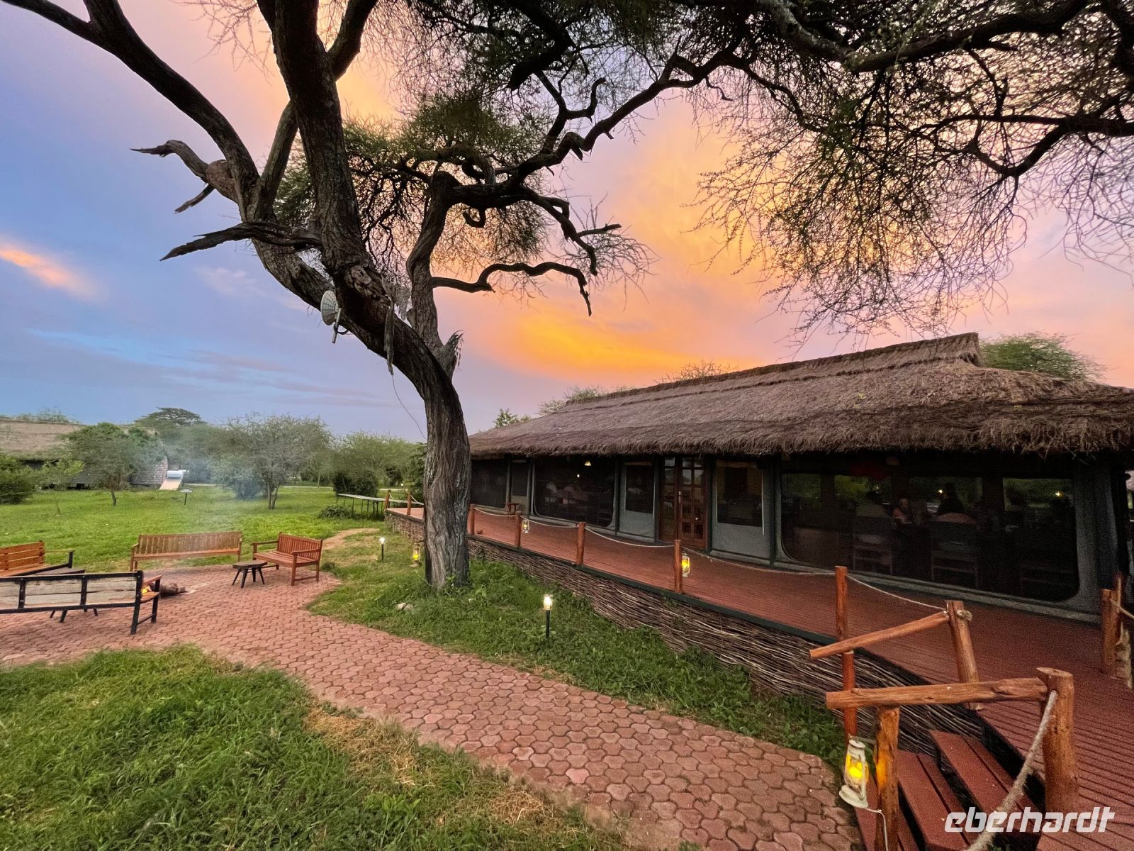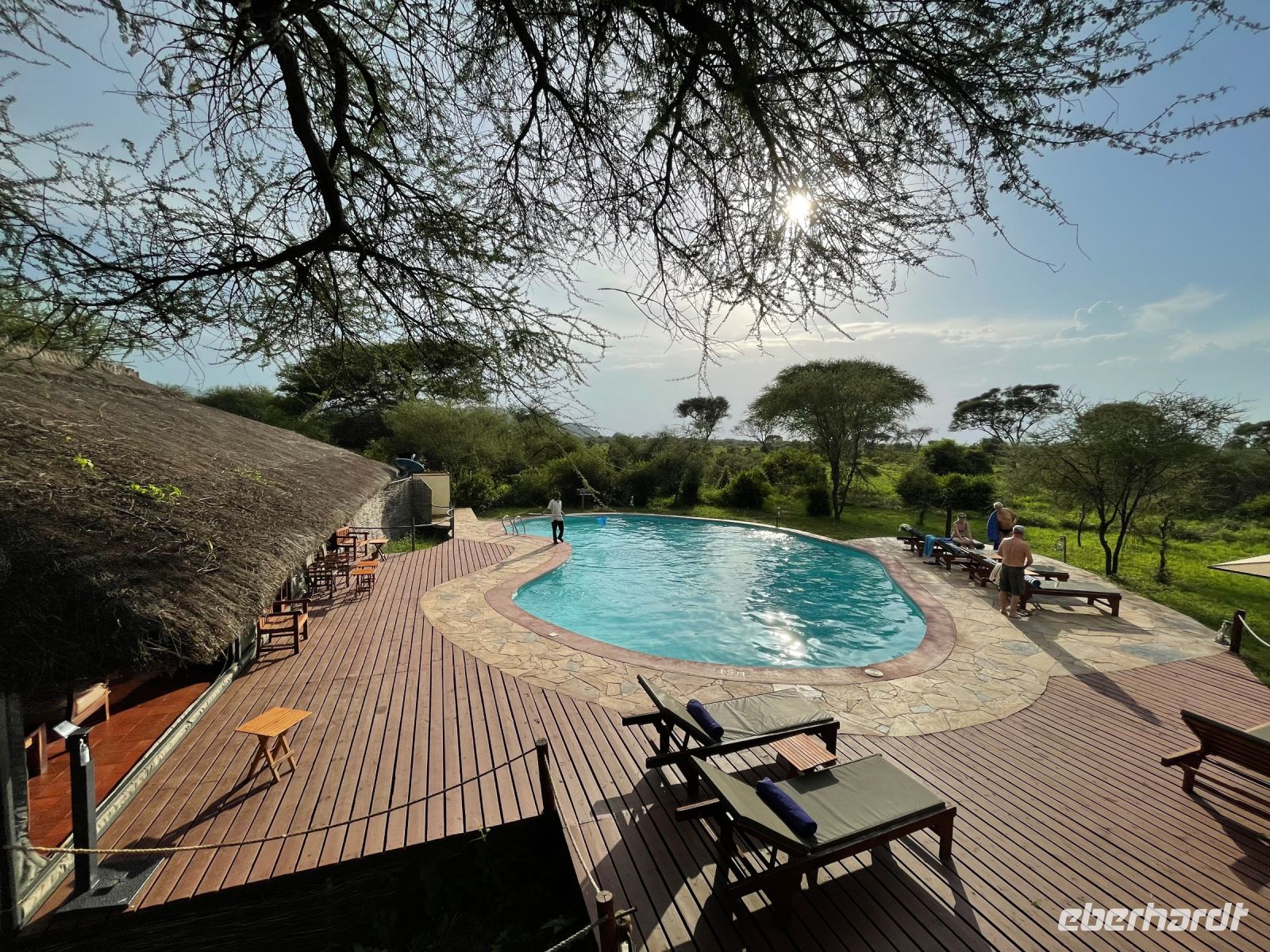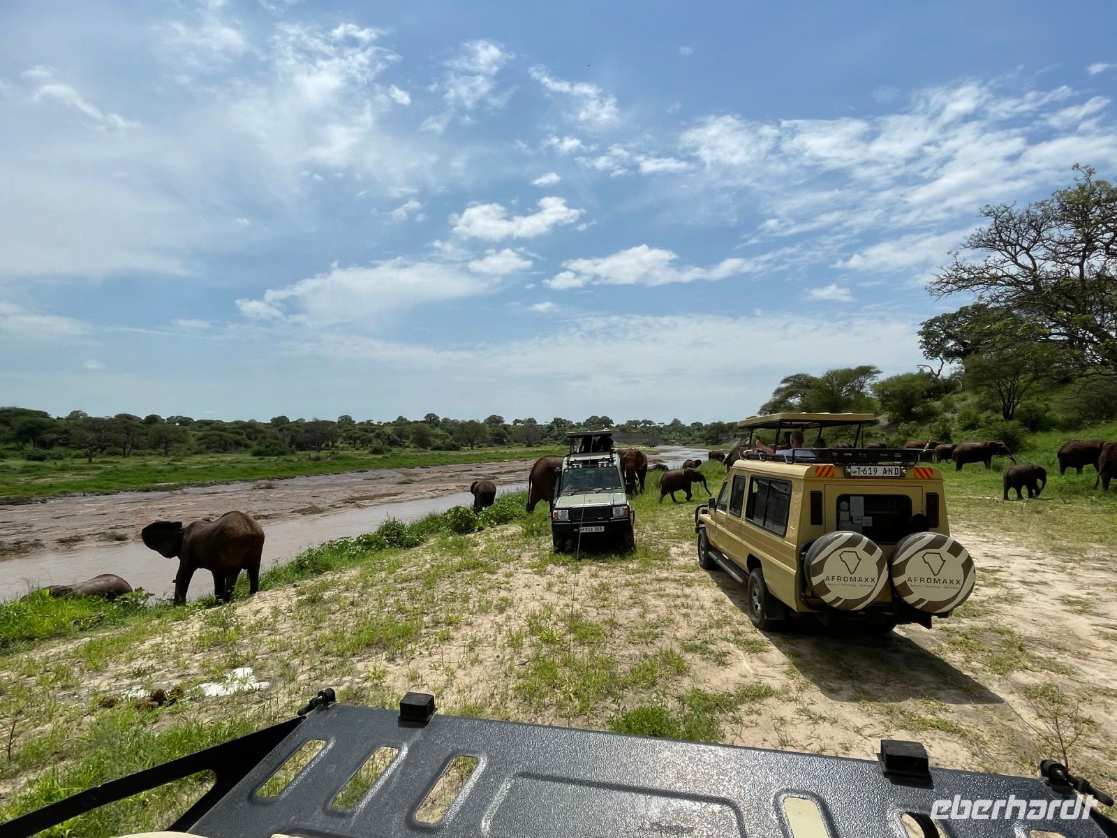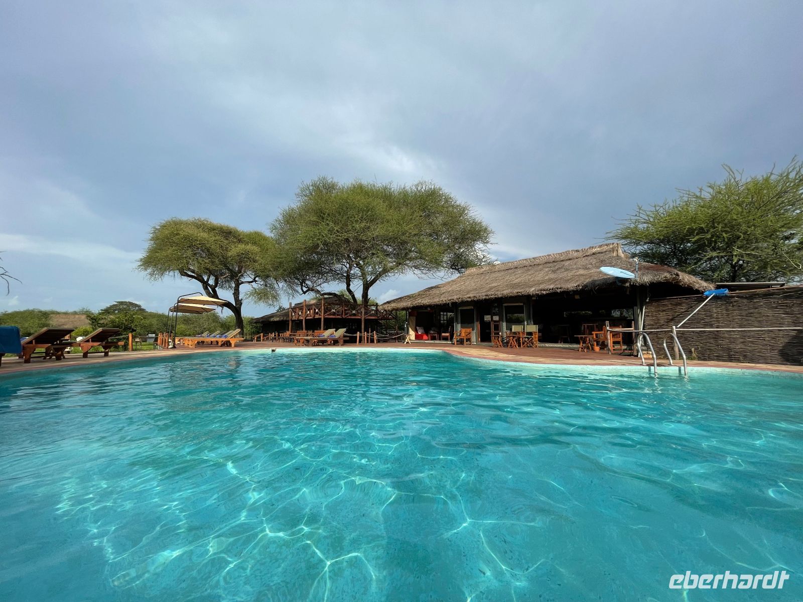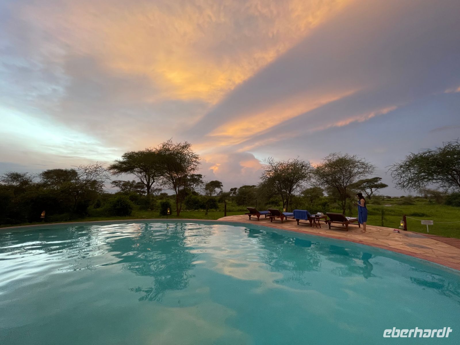 Tag 4, Nationalpark Nummer 2: der Tarangire-Nationalpark im Norden. Gegen Mittag starten wir hier unsere Safari und sehen gleich zu Beginn viele Elefanten und sogar drei Geparden. Wir sind genau zur richtigen Stelle am richtigen Ort und total begeistert. Danach geht es weiter zum Tarangiri Fluss, wo wir nochmals Unmengen an Elefanten entdecken. Gegen 17:00 Uhr erreichen wir unsere Tarangire Lodge und werden freundlich beim Check-In begrüßt. Wir erhalten eine Sicherheitseinweisung für unseren Aufenthalt, da man hier abends/nachts nicht alleine zum Zelt laufen darf, aufgrund der wilden Tiere. Die Lodge ist wunderschön und hat einen Pool. Nach dem Abendessen sitzen wir wieder gemeinsam am Lagerfeuer und schauen die Bilder und Videos der letzten beiden Safaris an.